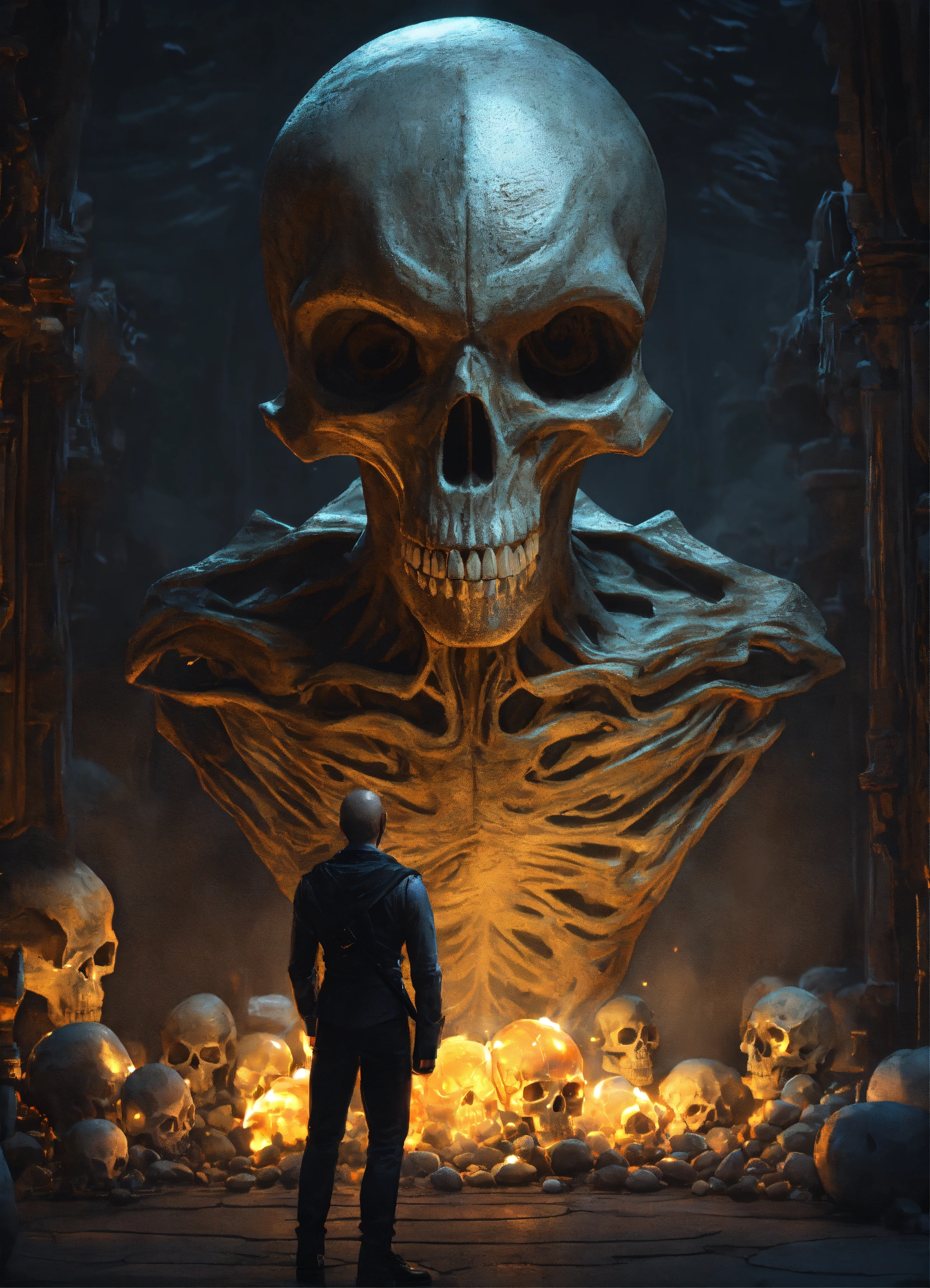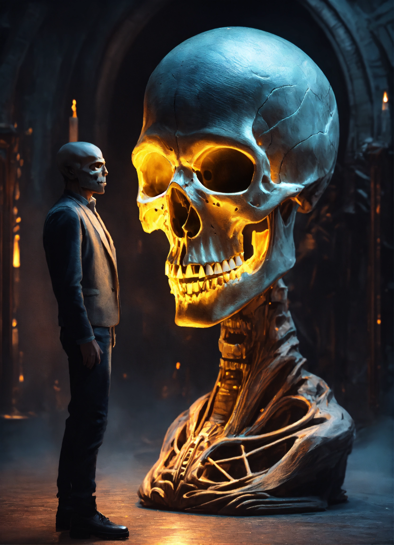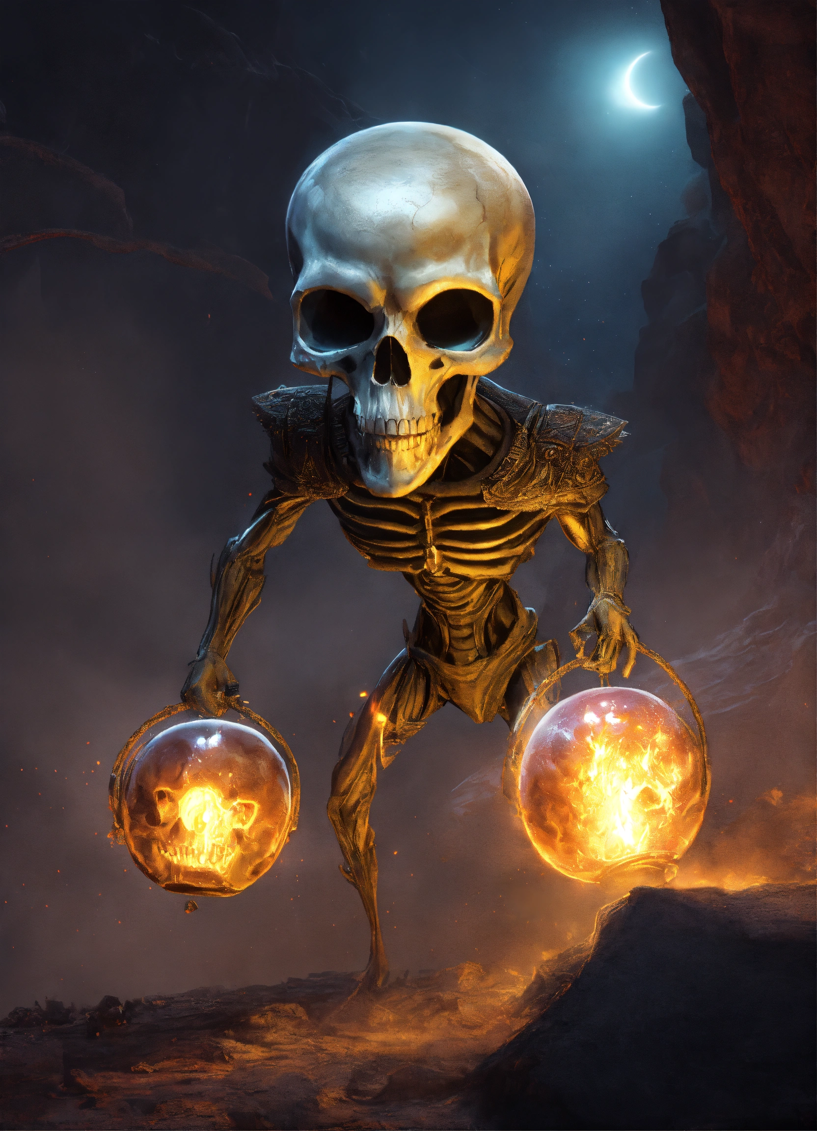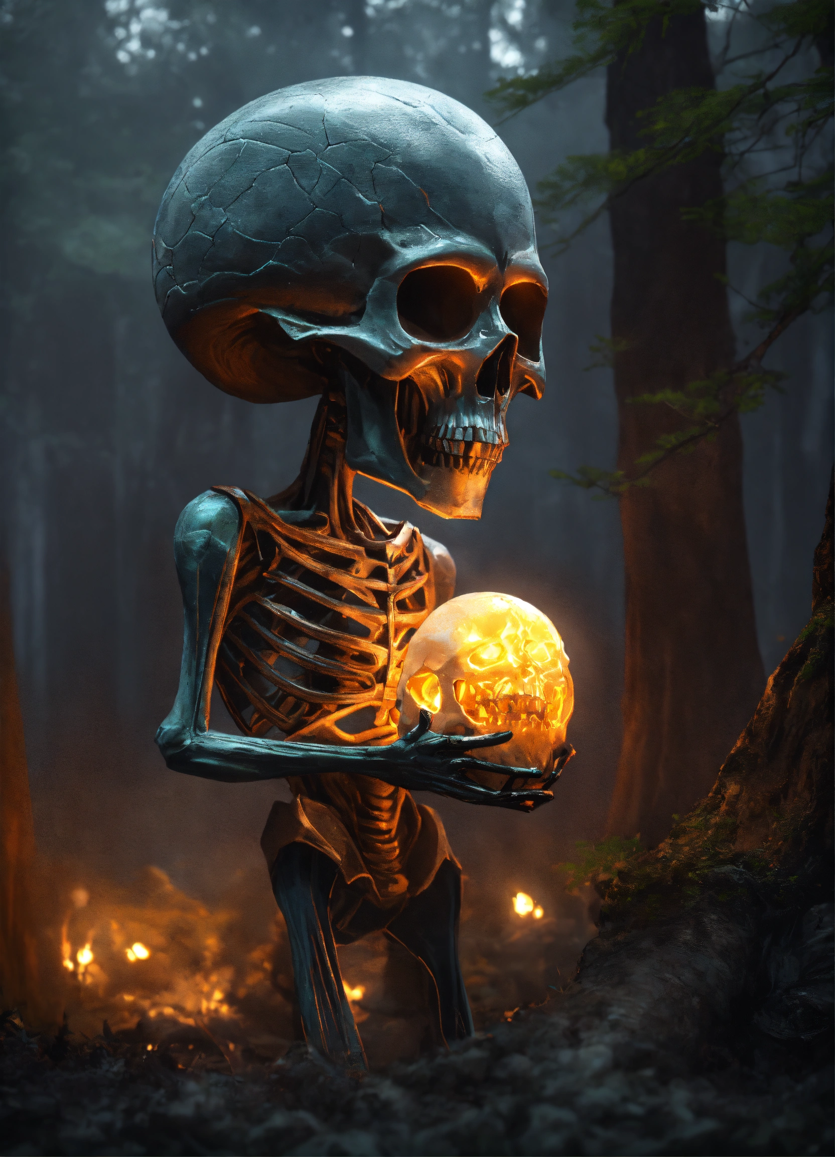 A mean tall grey alien holding a huge carved glowing skull.