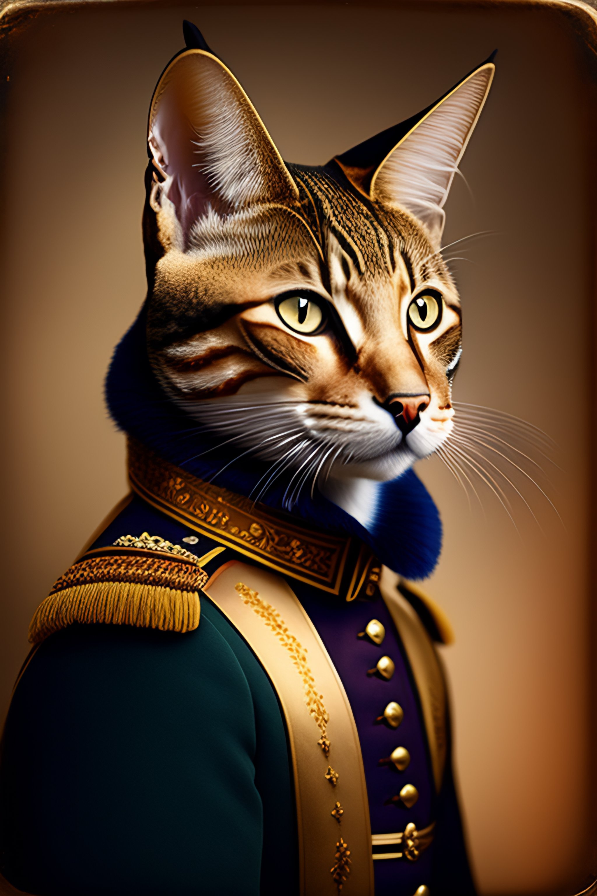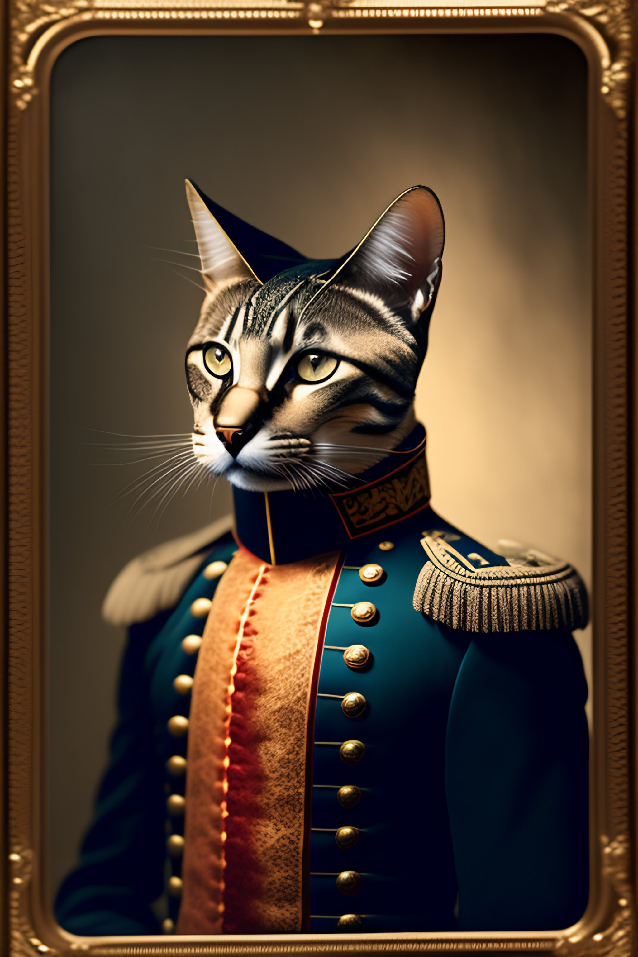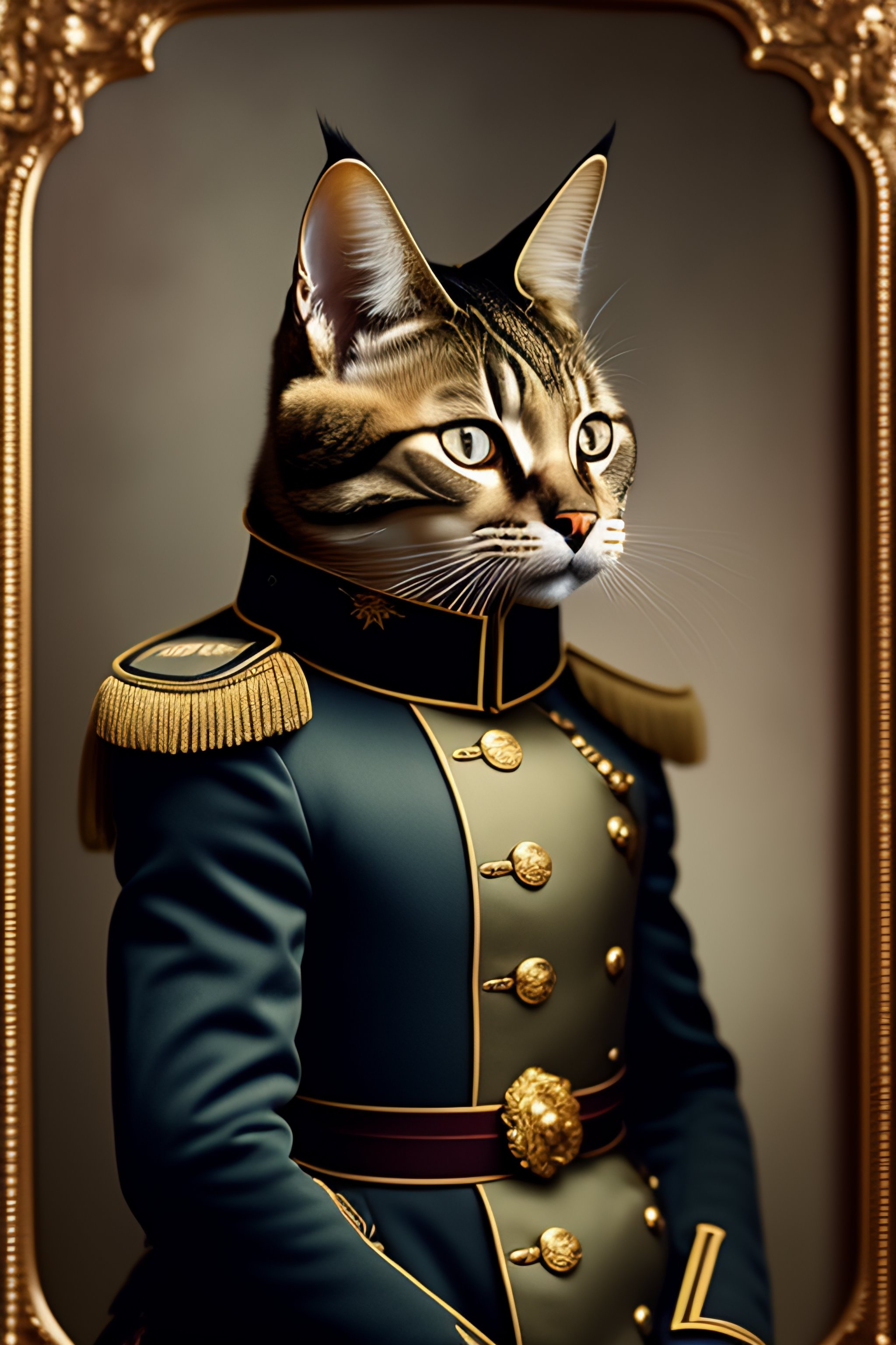 Professional studio photo portrait of anthro anthropomorphic cat head animal person fursona serious wearing elaborate military general uniform clothes degraded medium by louis daguerre daguerreotype tintype