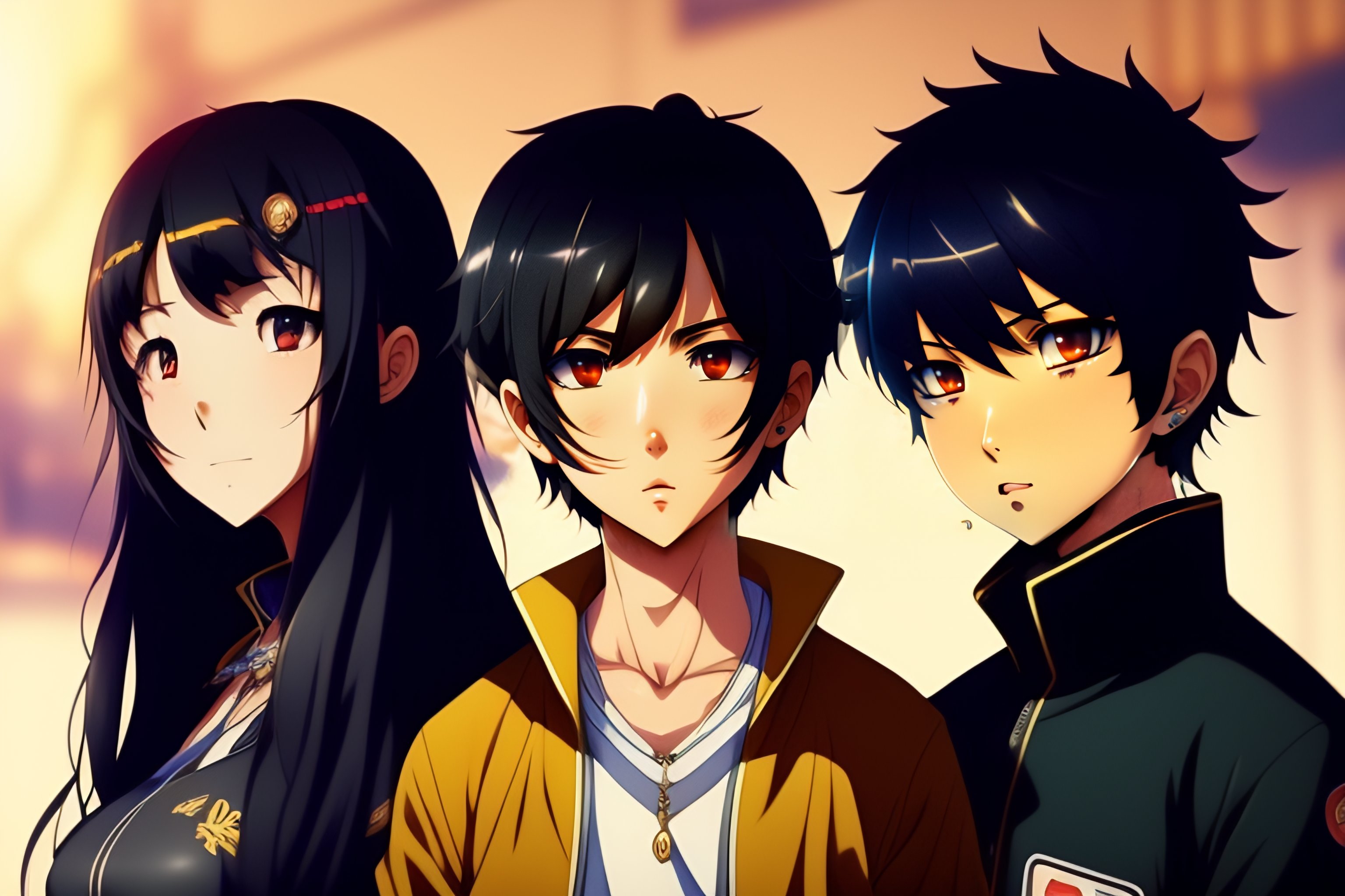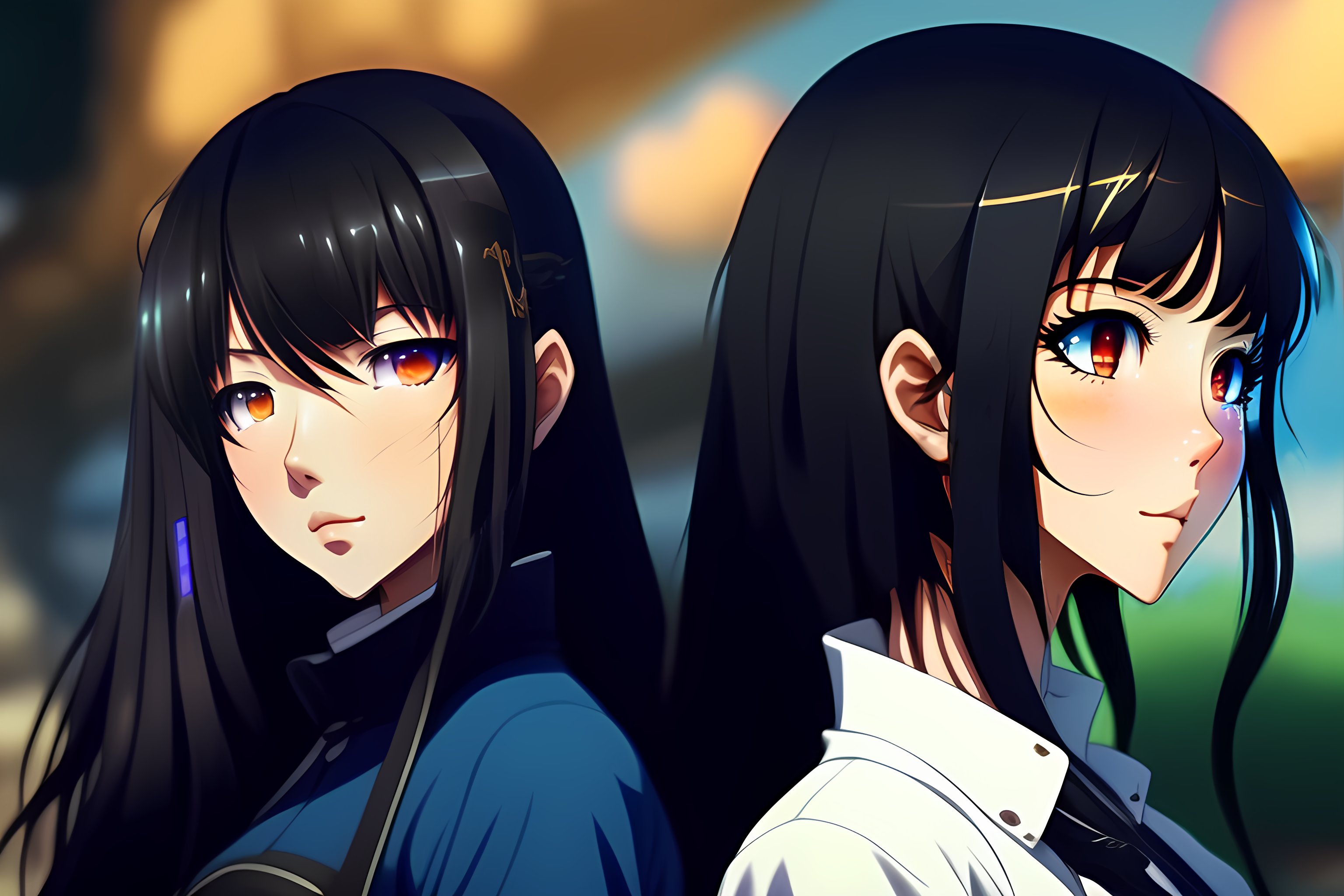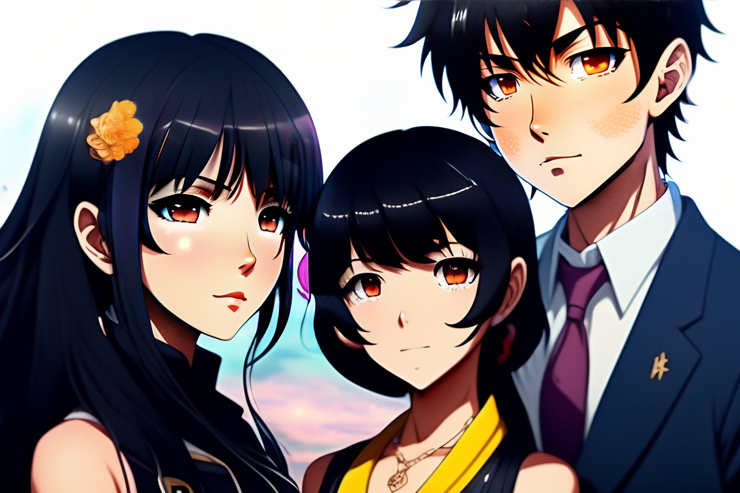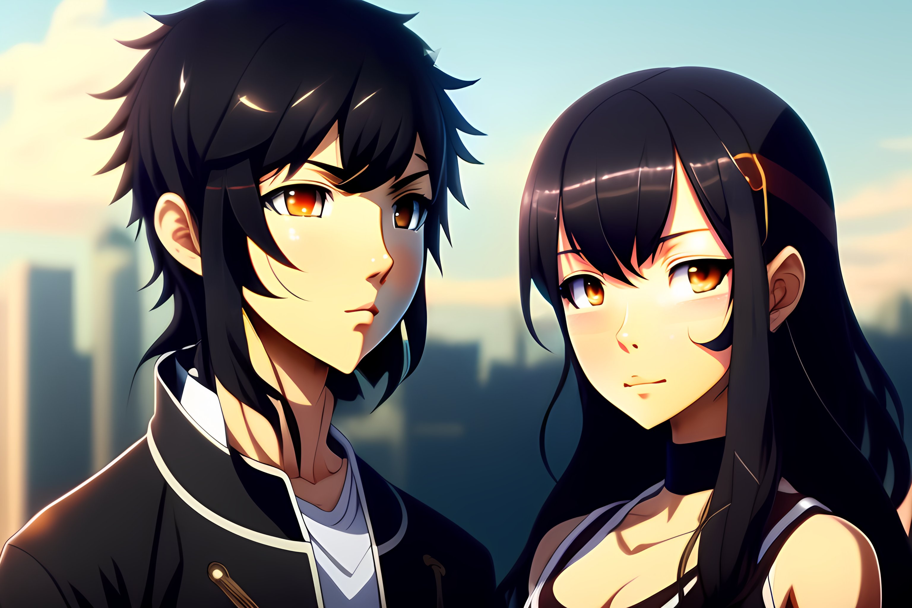 A couple anime, a boy has short black hair and black eyes, a girl has long black brown hair and blue eyes
