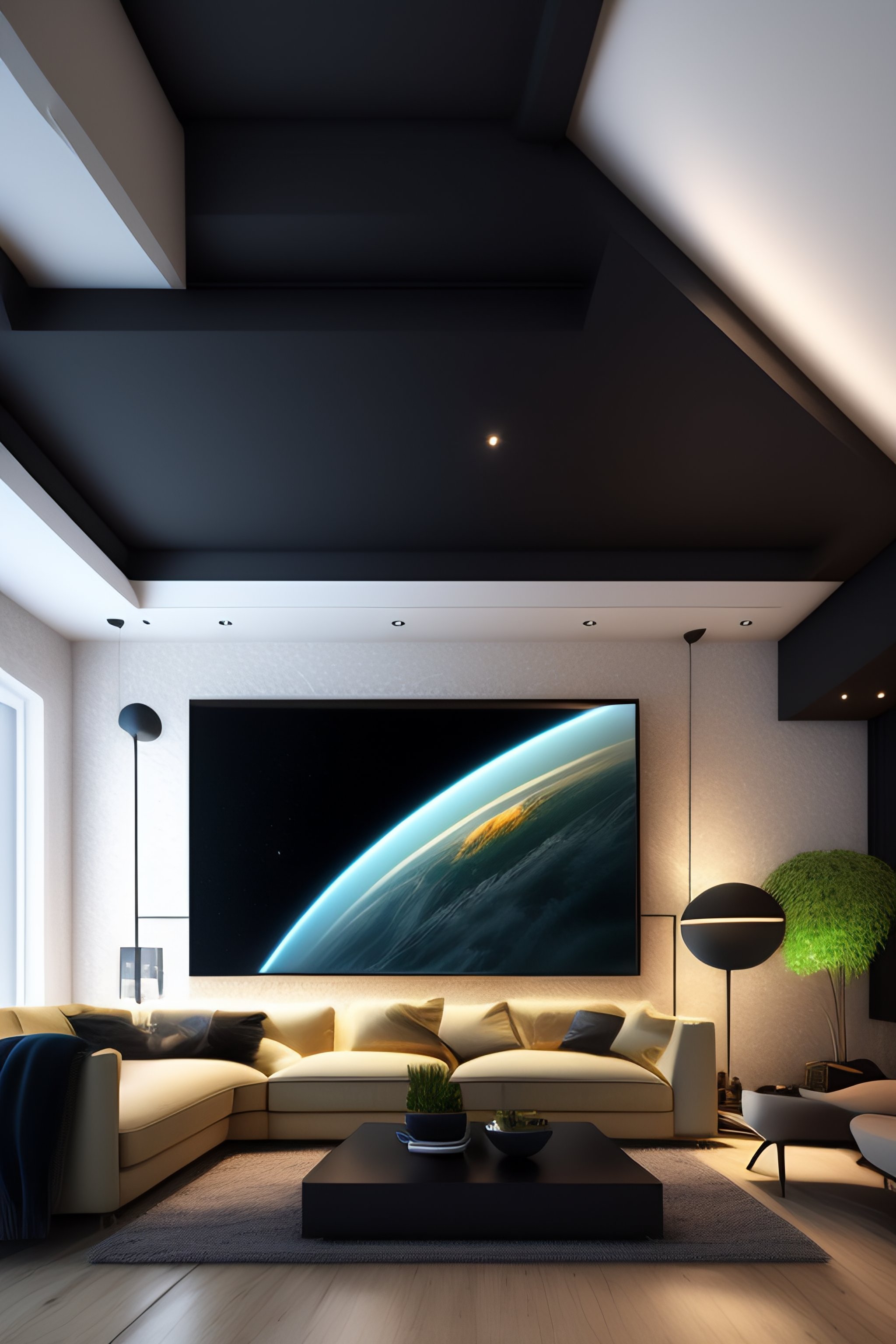 A big screen hanging from the ceiling of a design living room