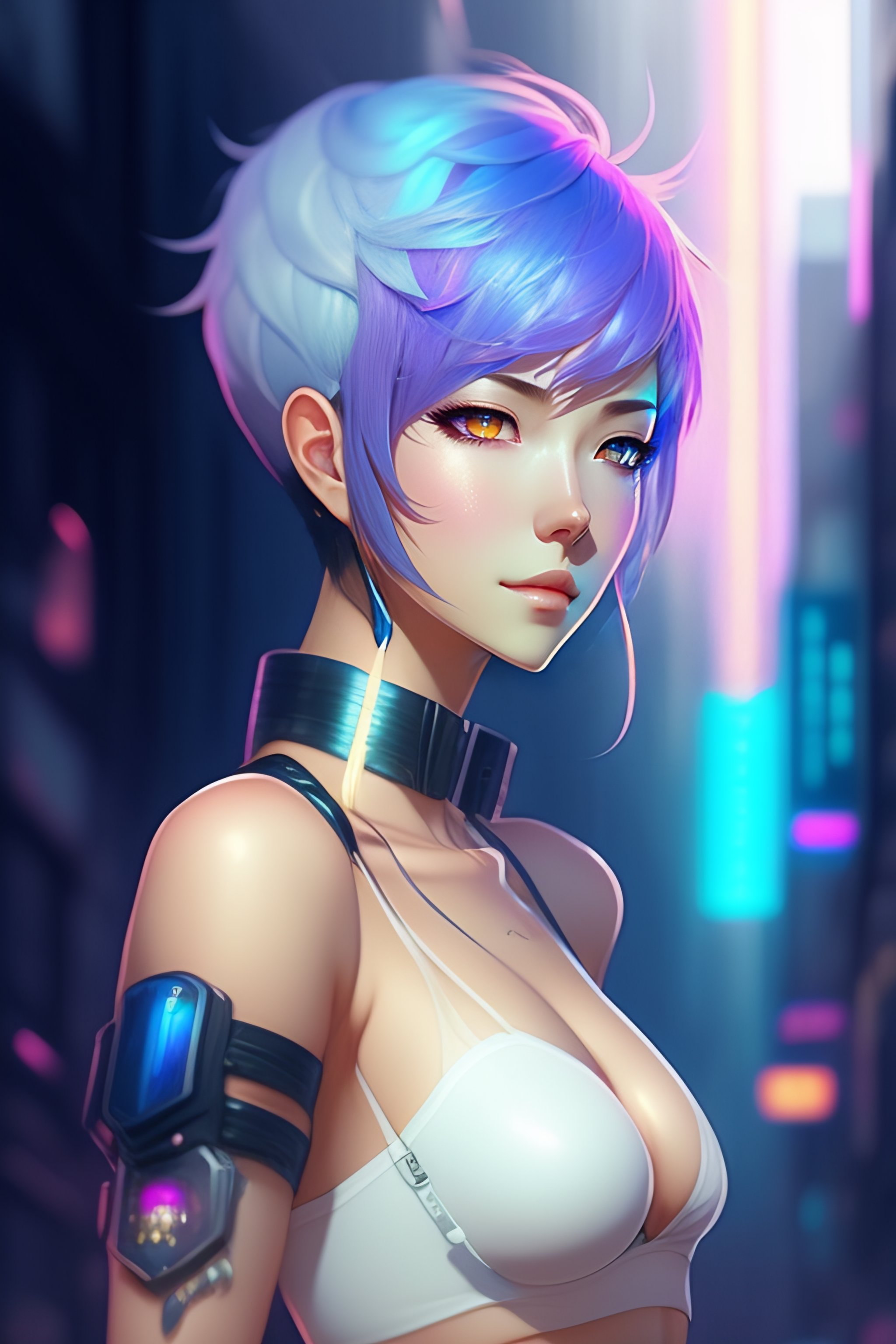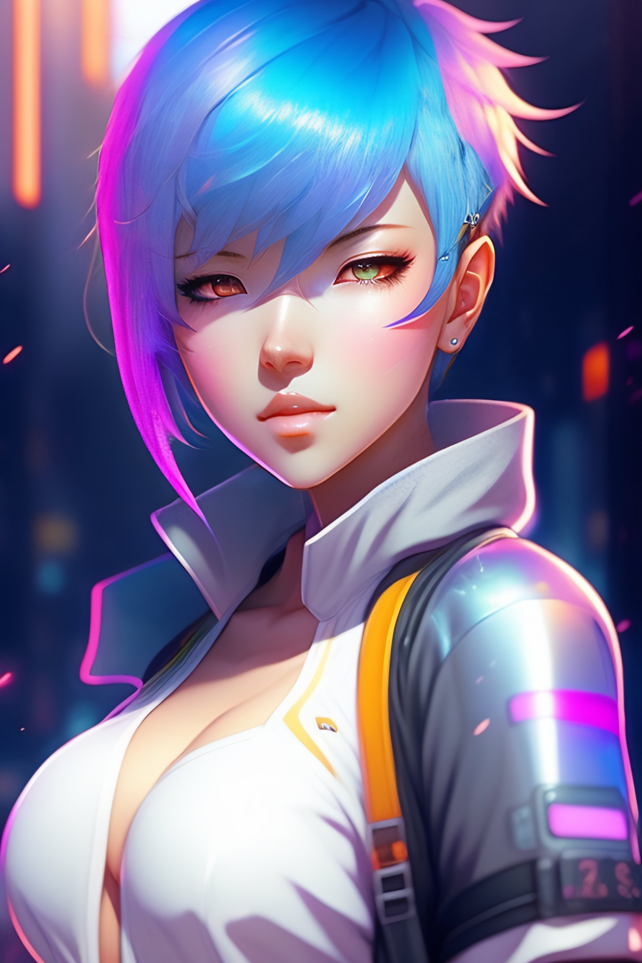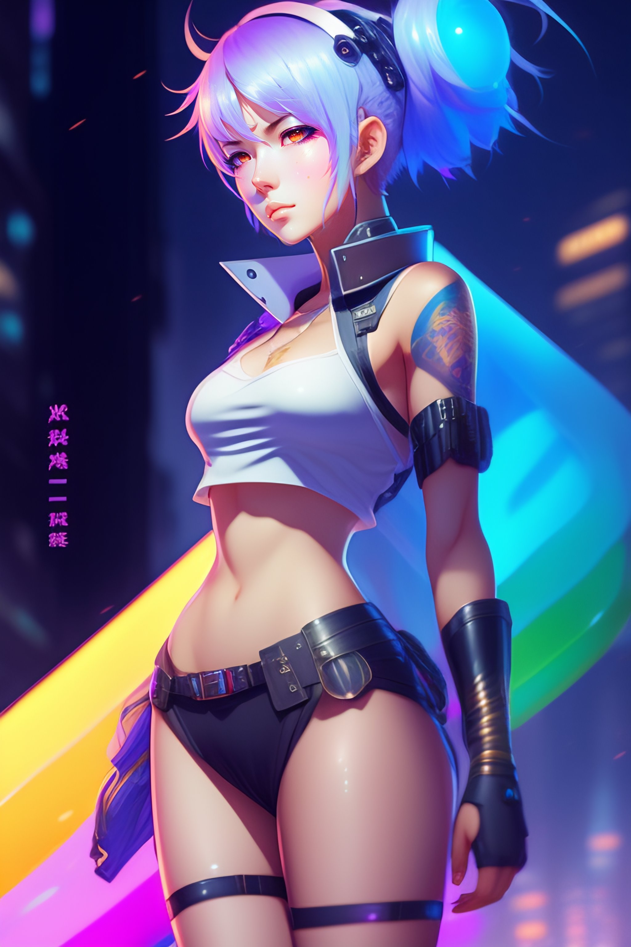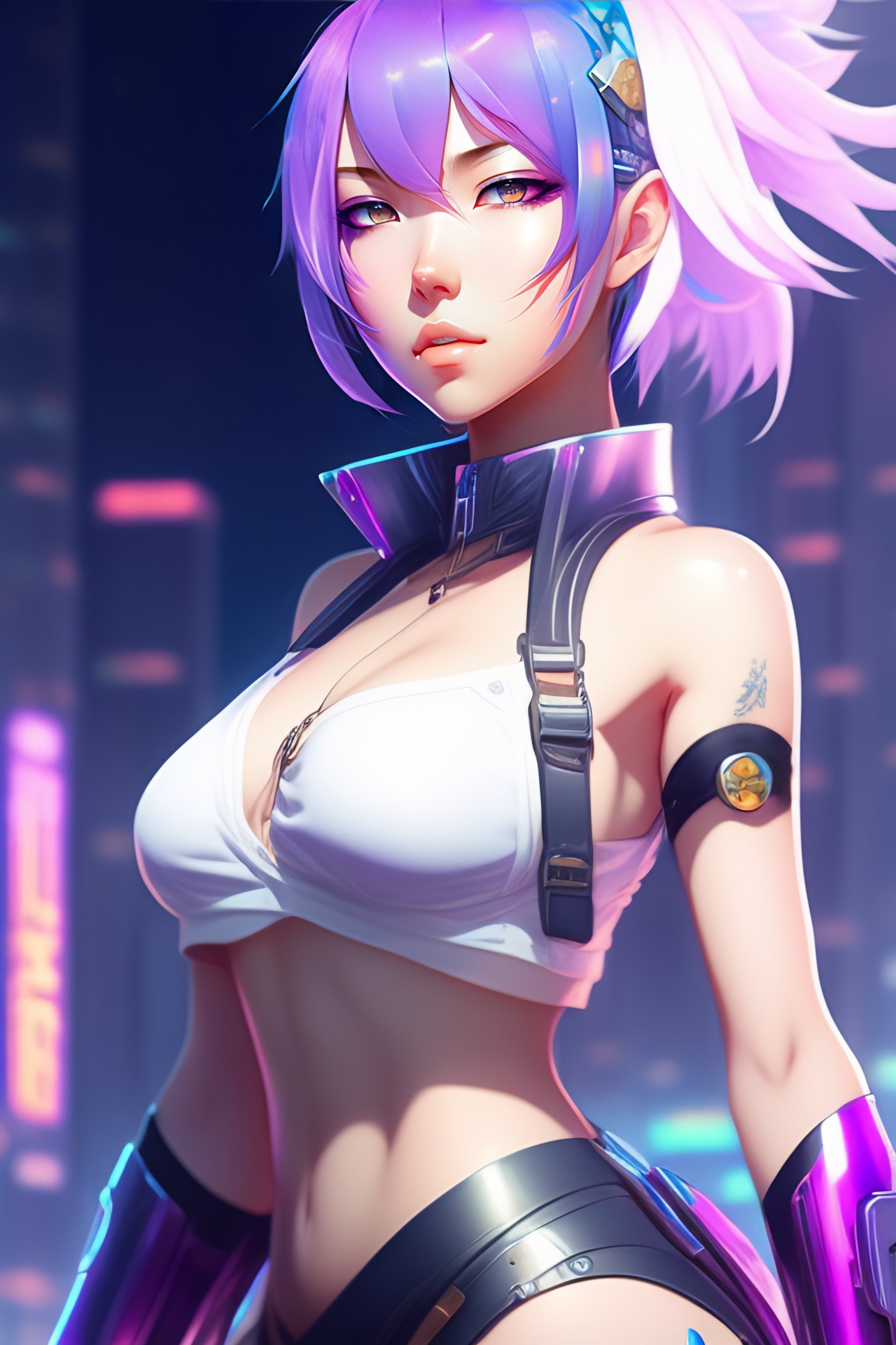 Cyberpunk anime woman with pastel rainbow white blue short hair, full body, skin the sample, very short clothes, light purple eyes, 20s, by makoto shinkai, stanley artgerm lau, wlop, rossdraws