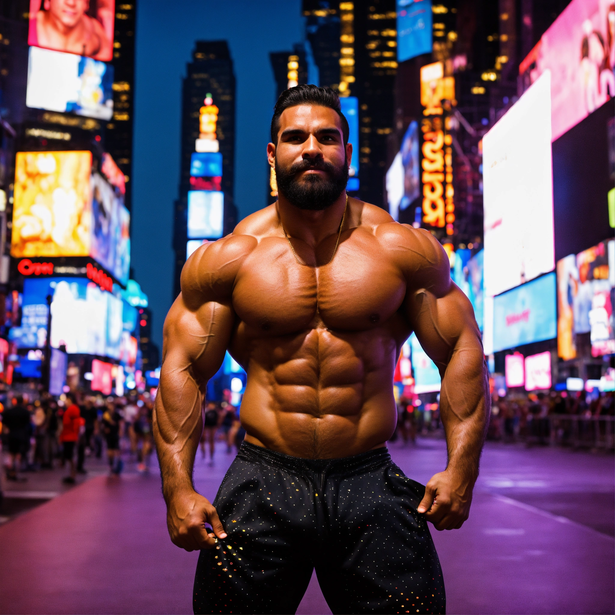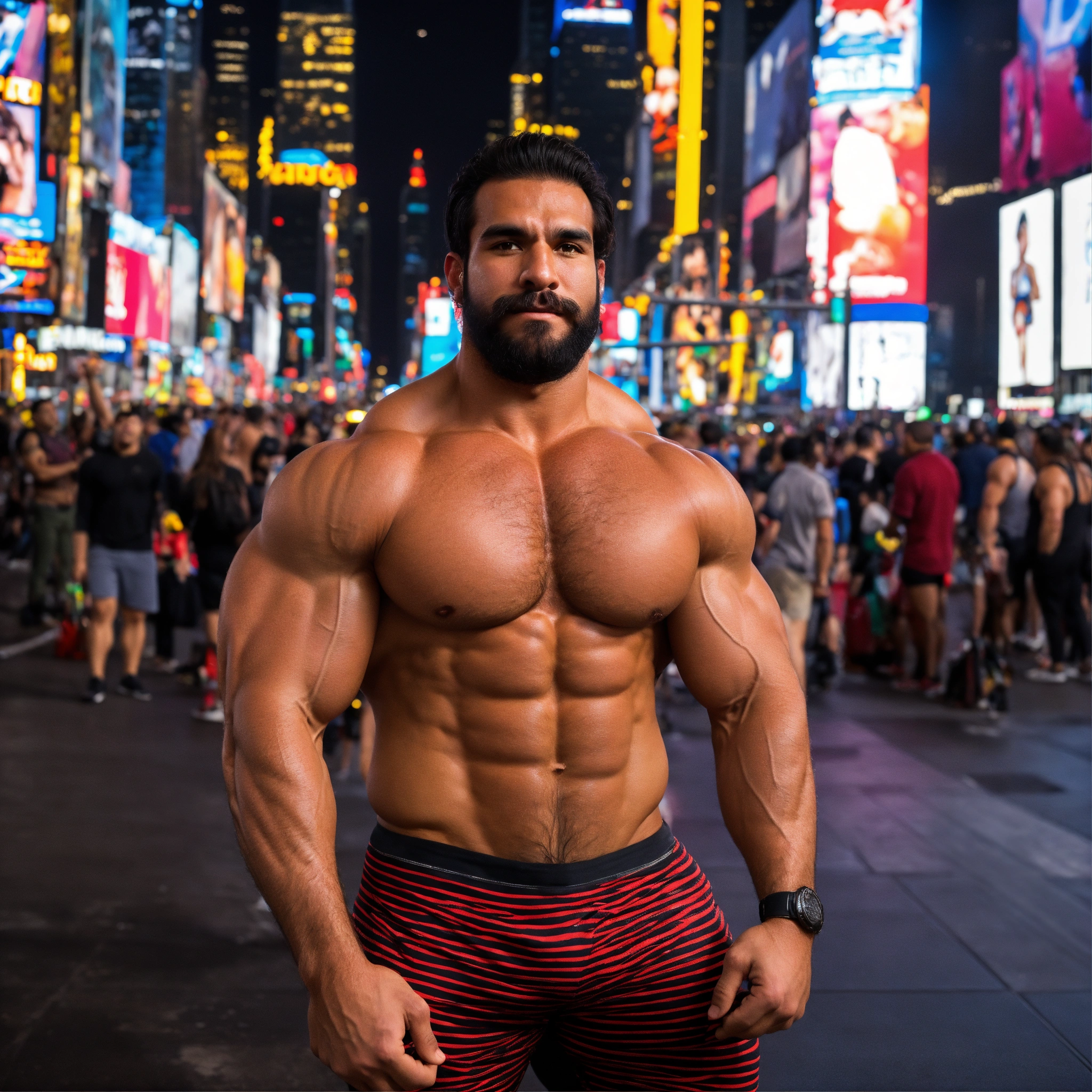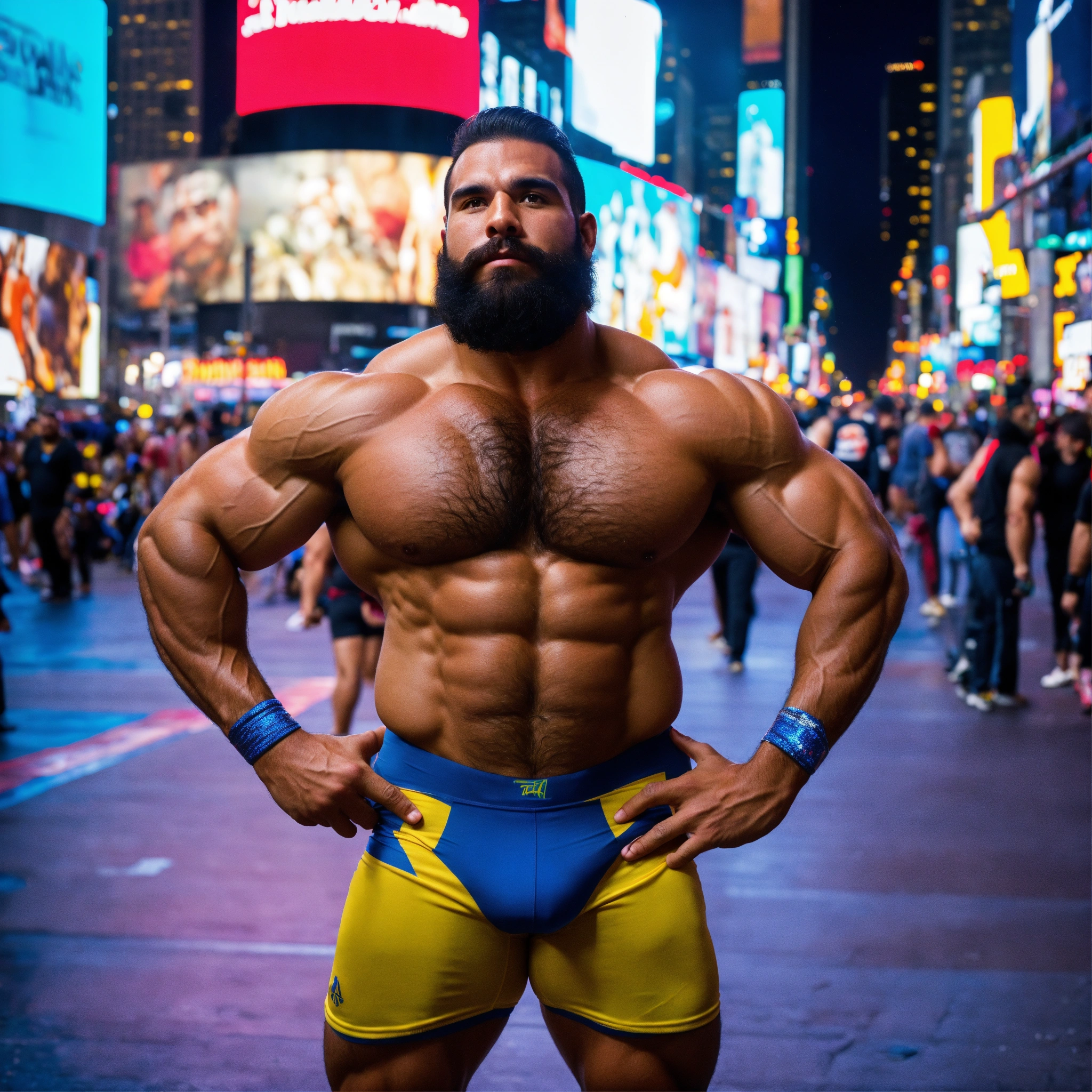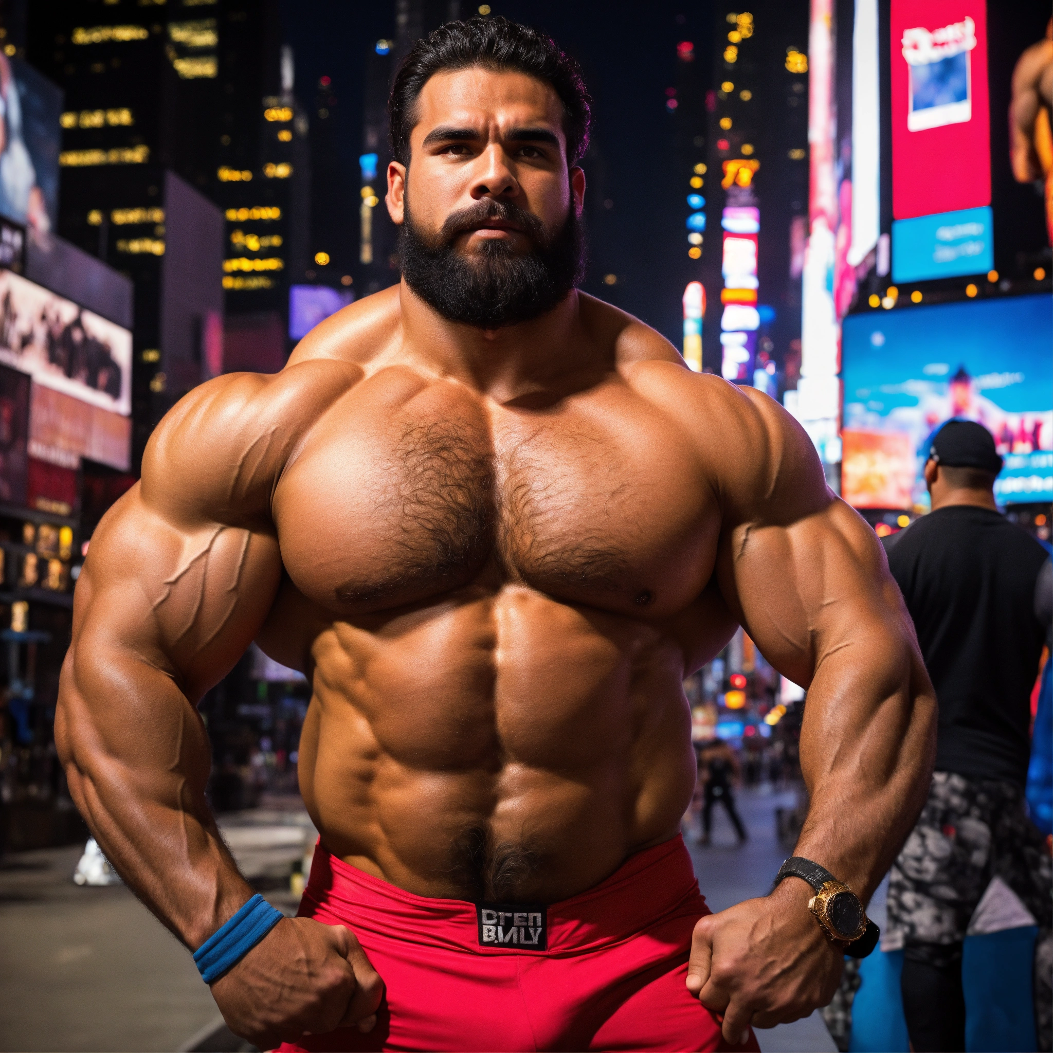 30-year-old hairy colombian man with big muscles, big bodybuilder, body like a wrestler, in times square at night
