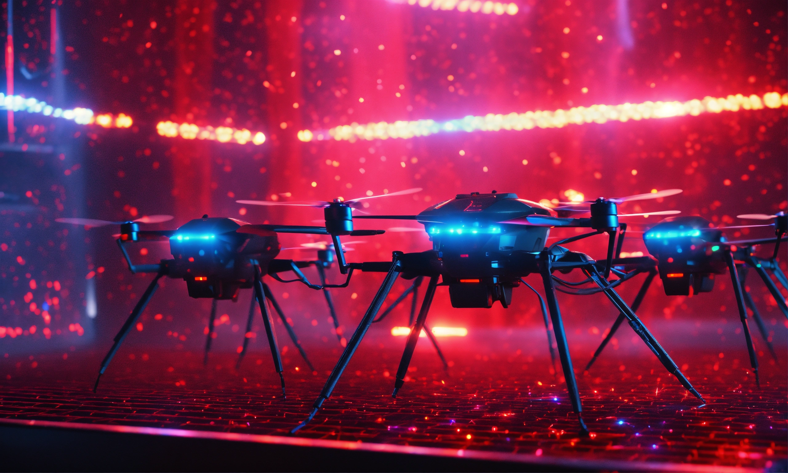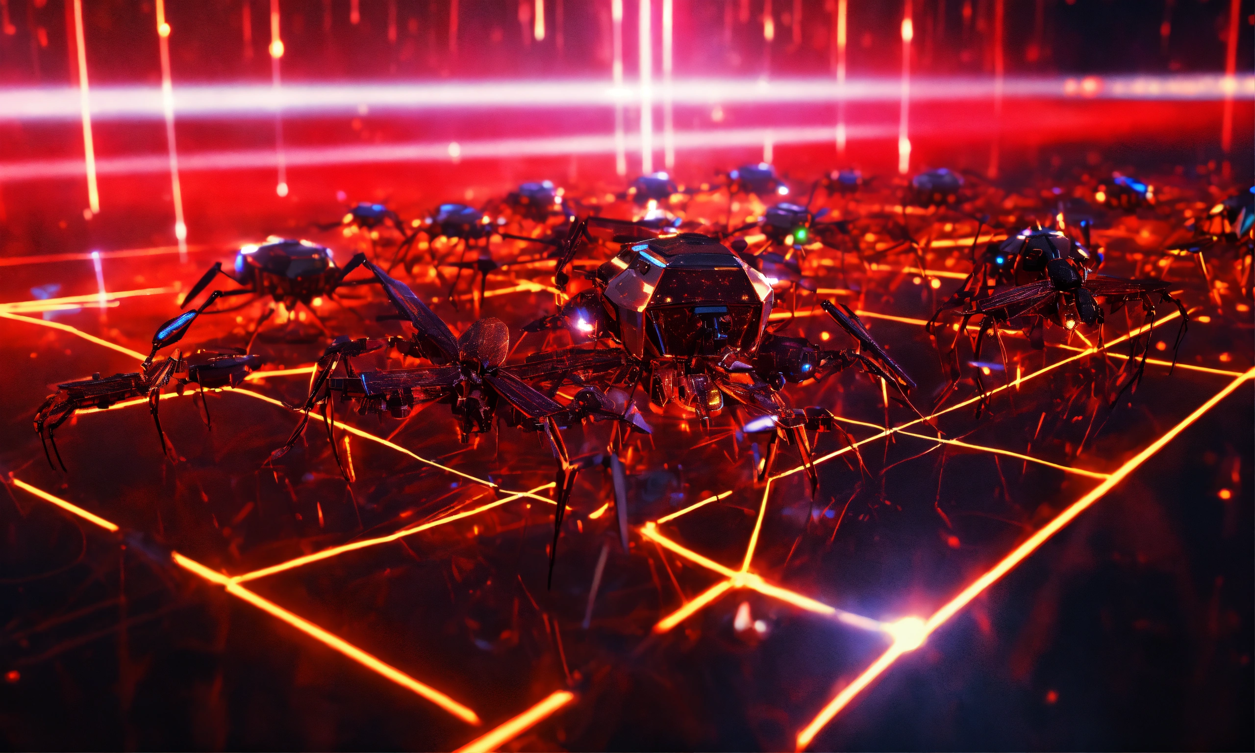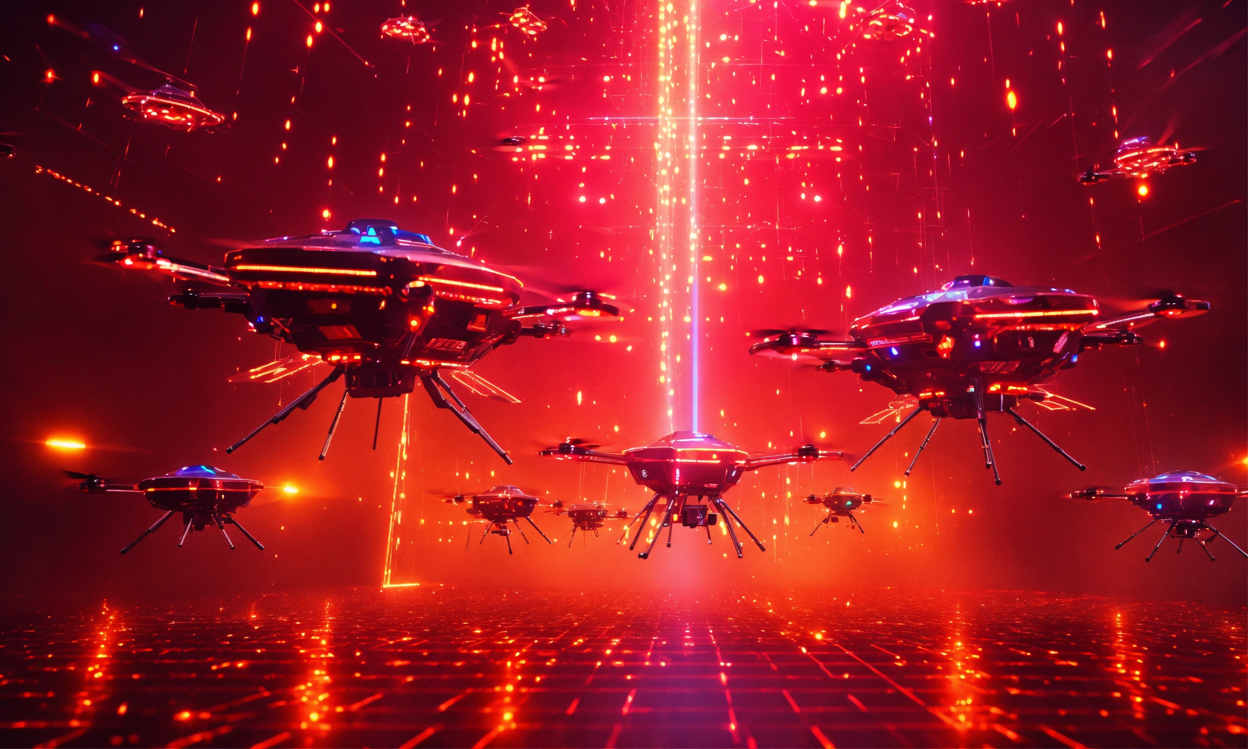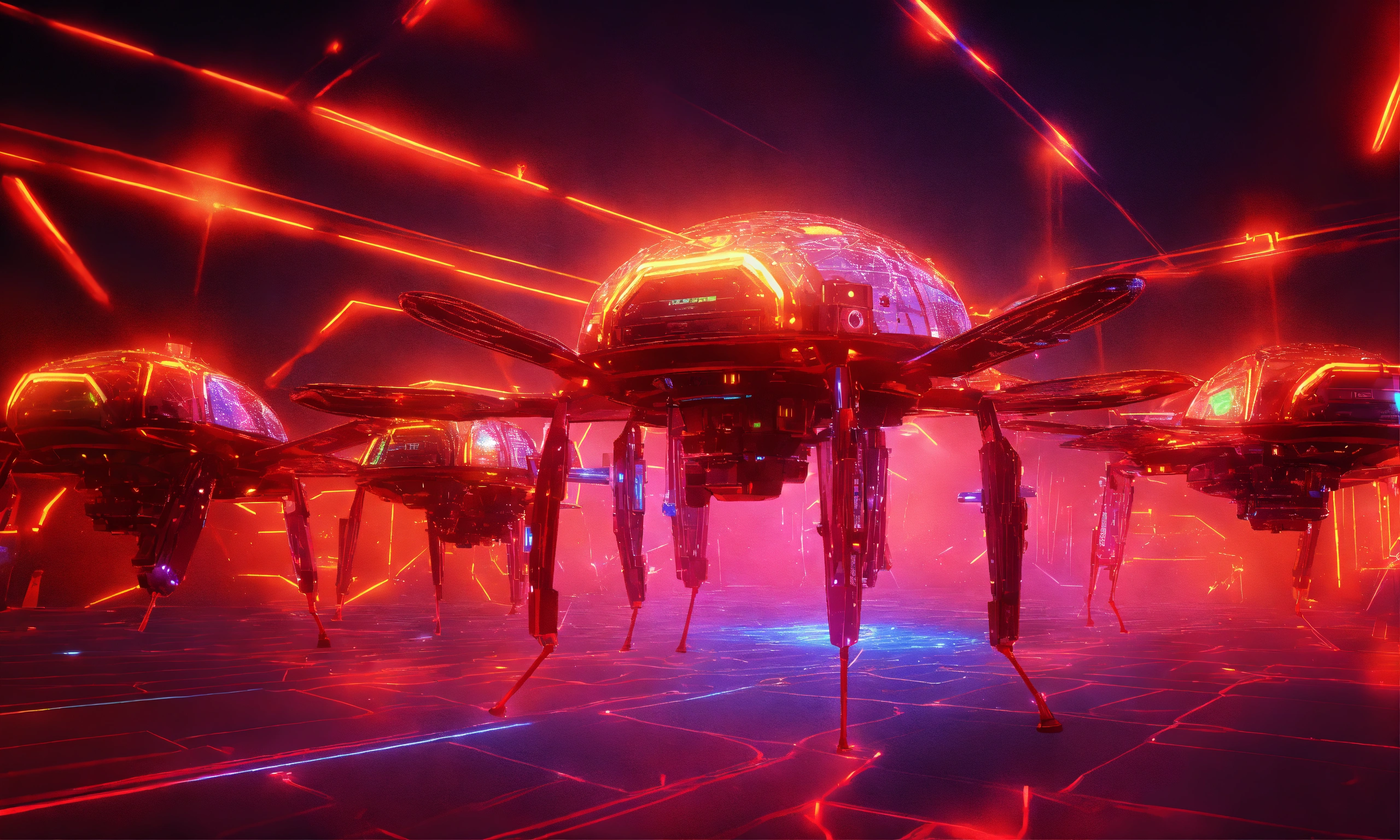 Holographic swarm of flying armored insect drones attack, lasers, digital hologram, matrix, illusion, quantum, red lights, projection, 1010 digits, tron, multitude, armada