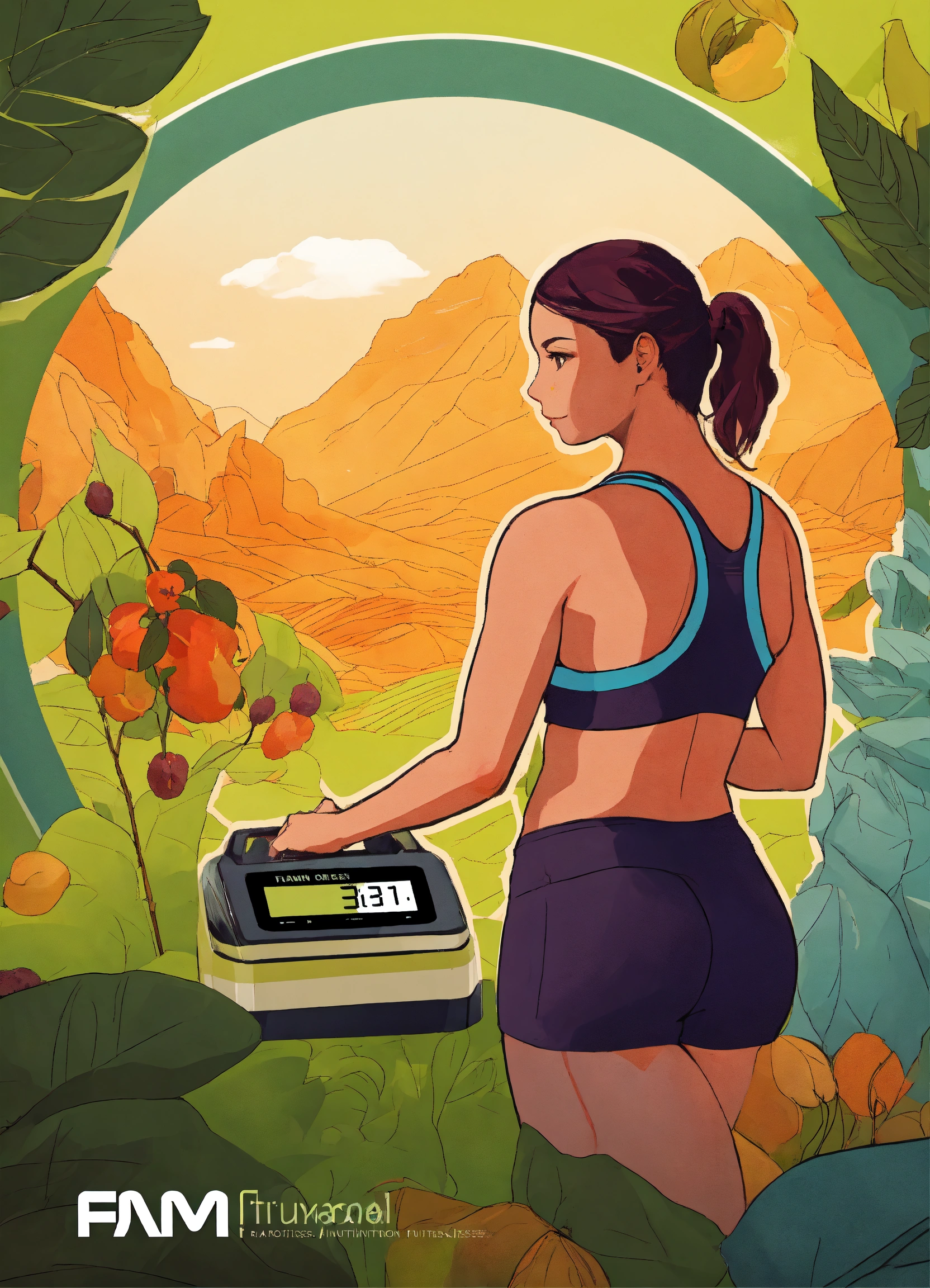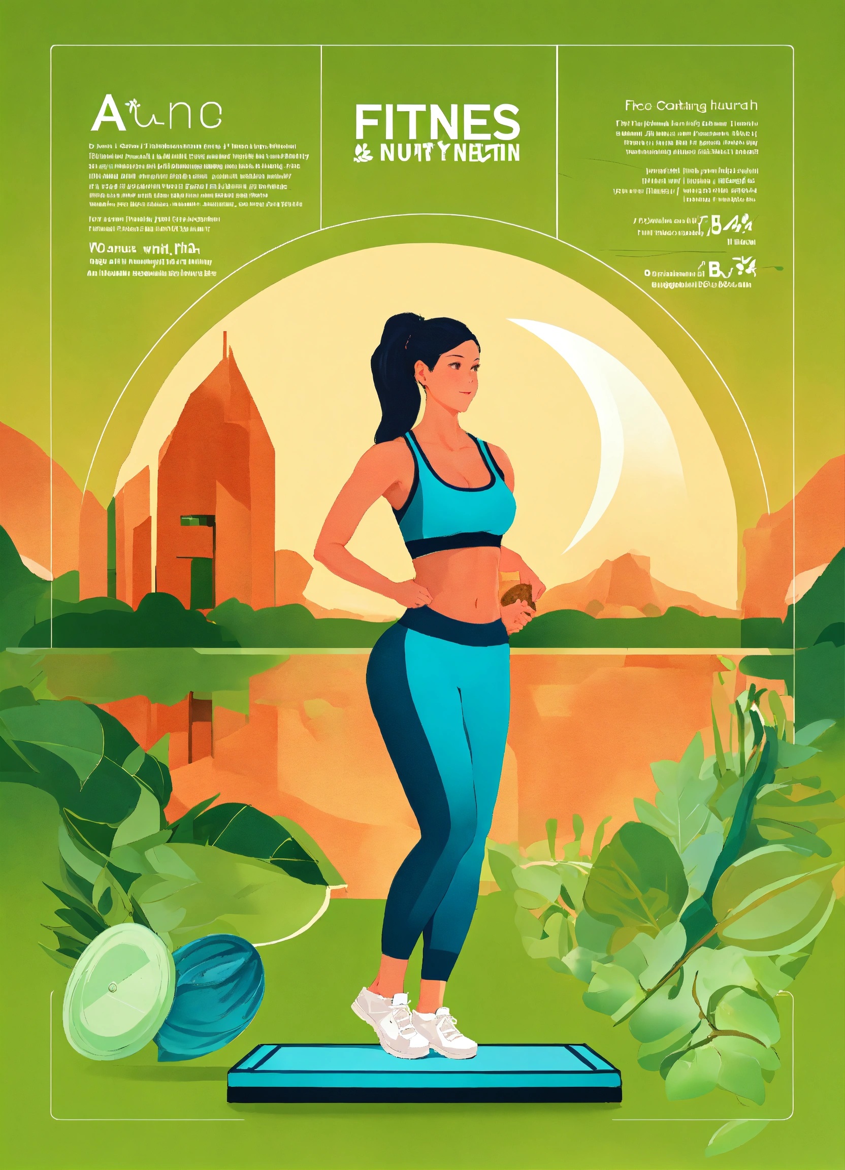A logo, fitness health and nutrition facts, a woman fitness trainer with nature in the background and a fitness/health scale in the foreground, future art