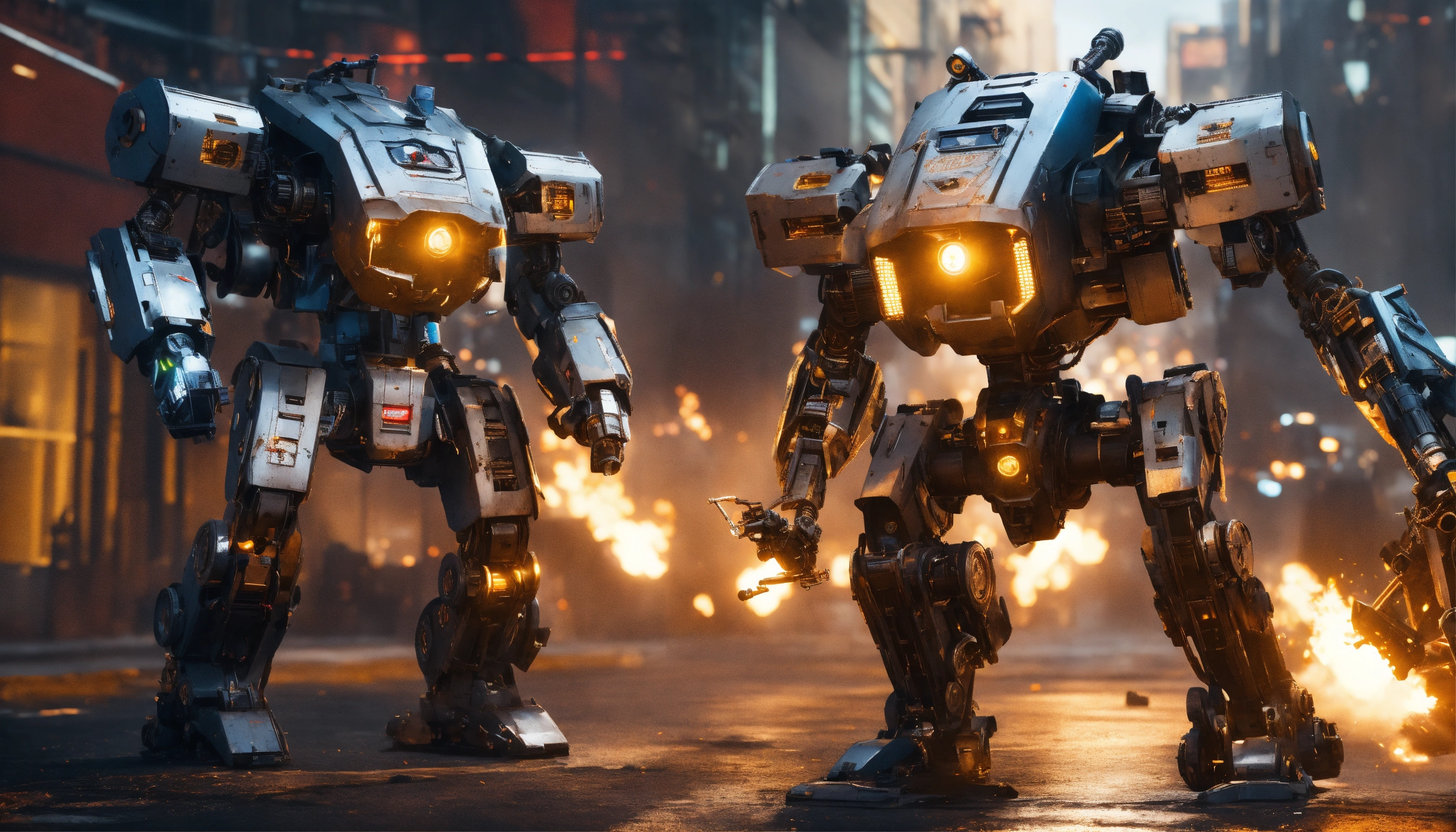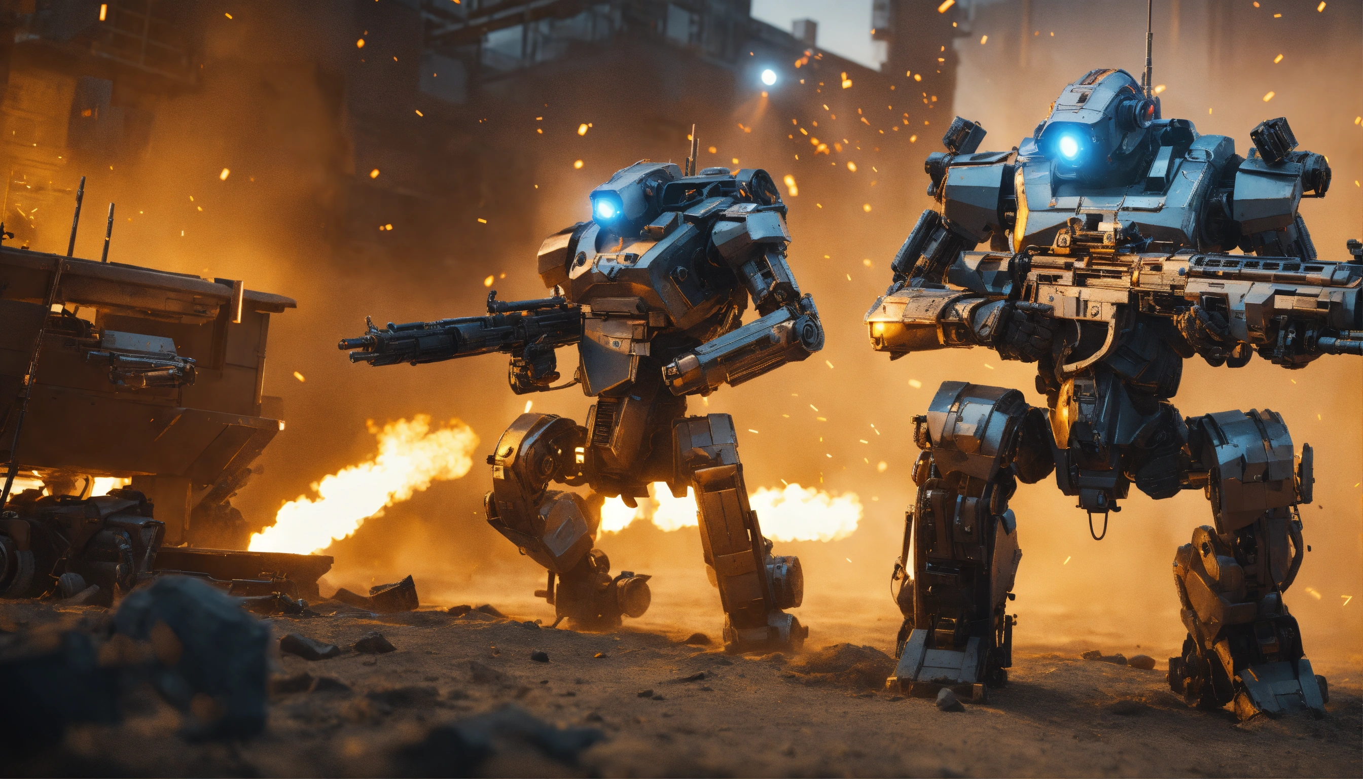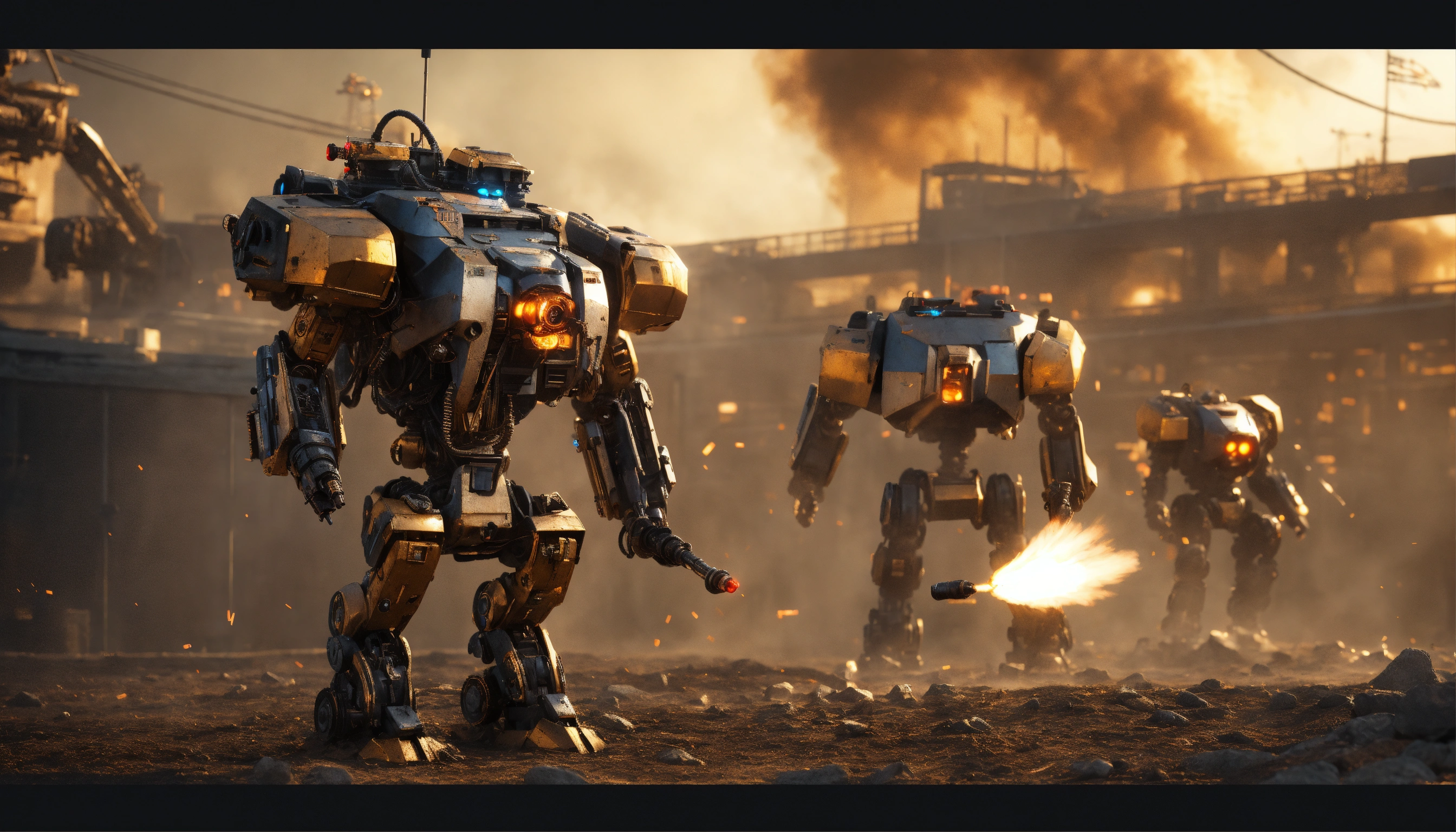 War of robots armed with machine guns, cyborg terminators made of metal. octane render, trending on artstation, highly detailed, lighting, professional, realistic, sharp focus, 4k, 8k, high resolution, candid, personal, –testp, bright lighting, ultra-detailed, bright lighting, photo, high quality photo, cinematic shot, volumetric light, imax