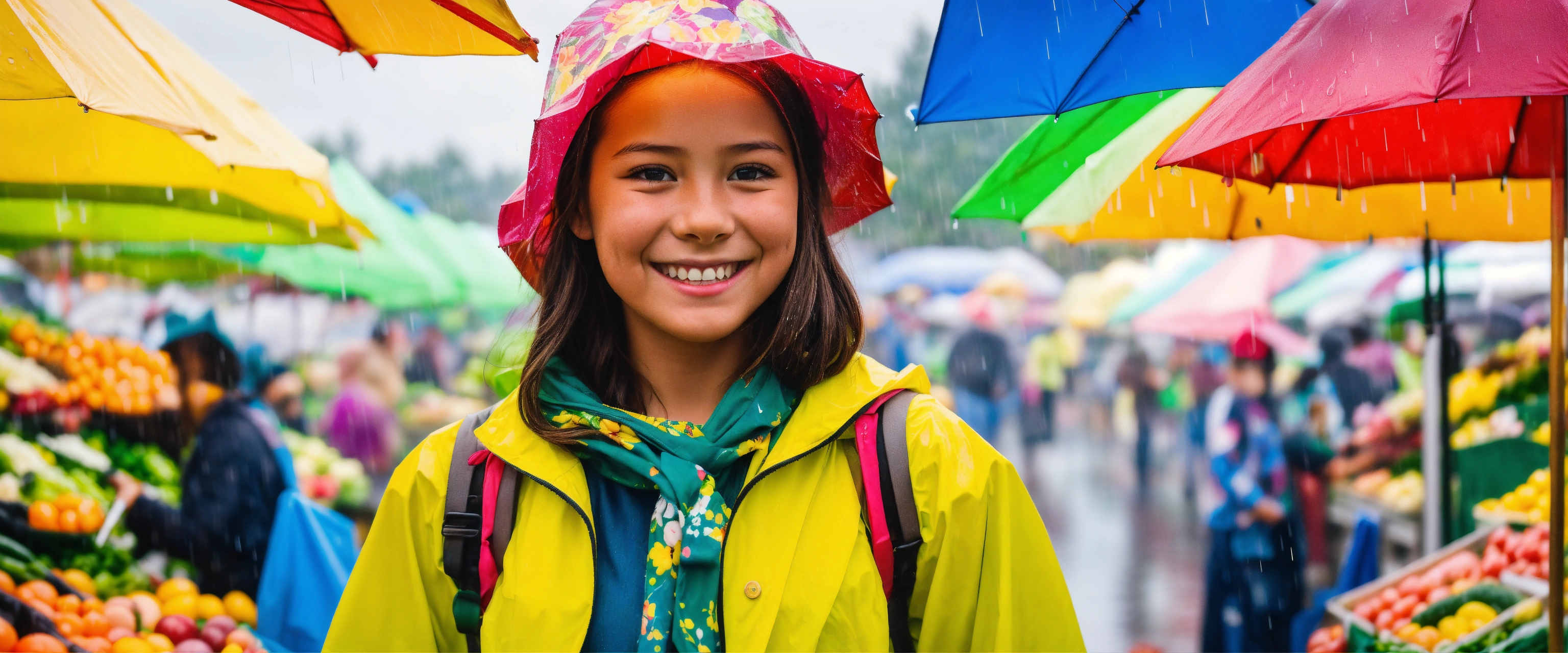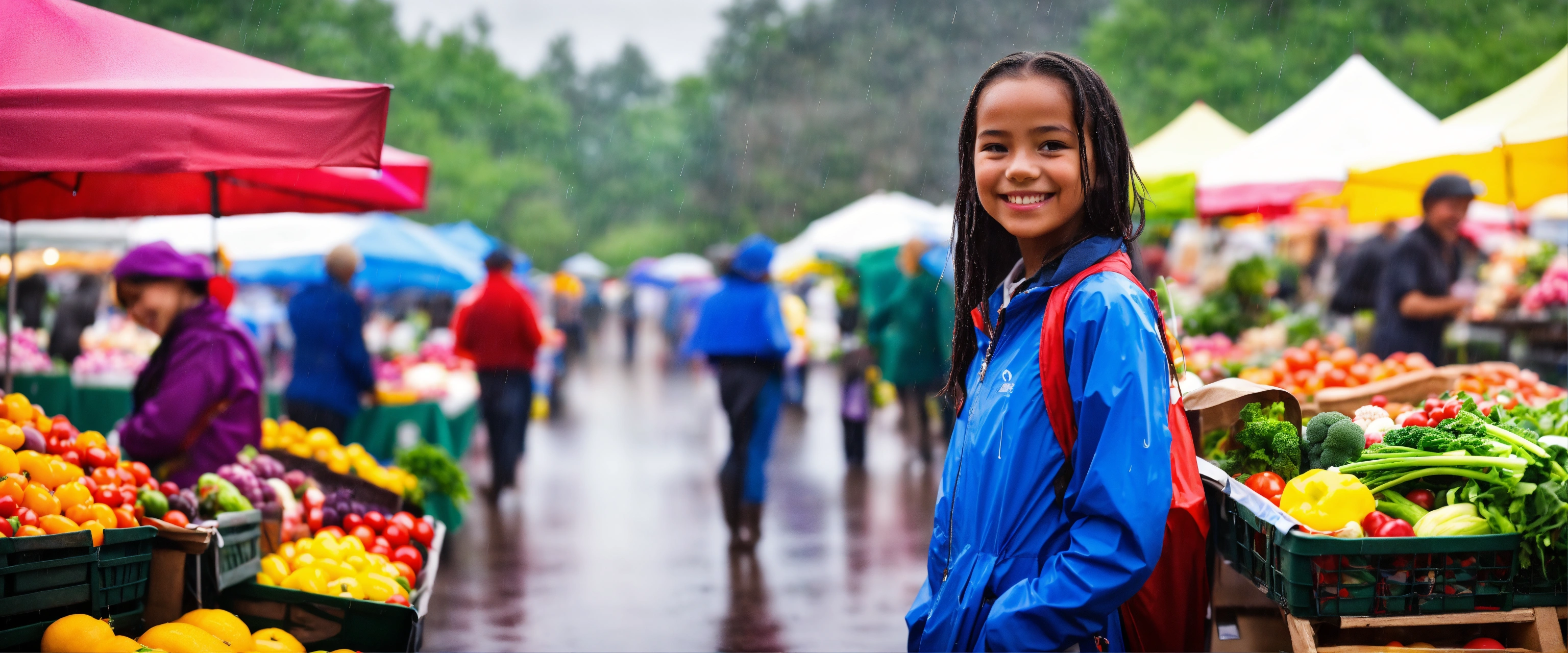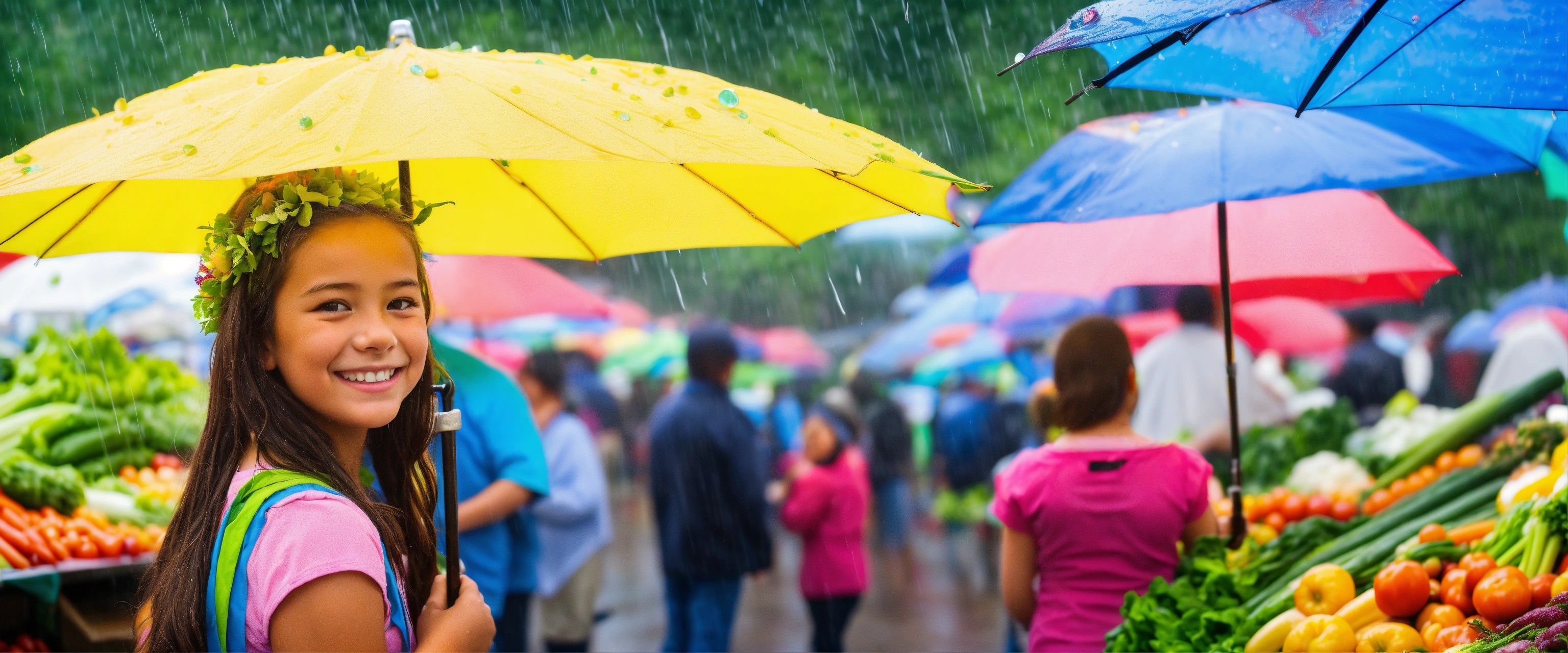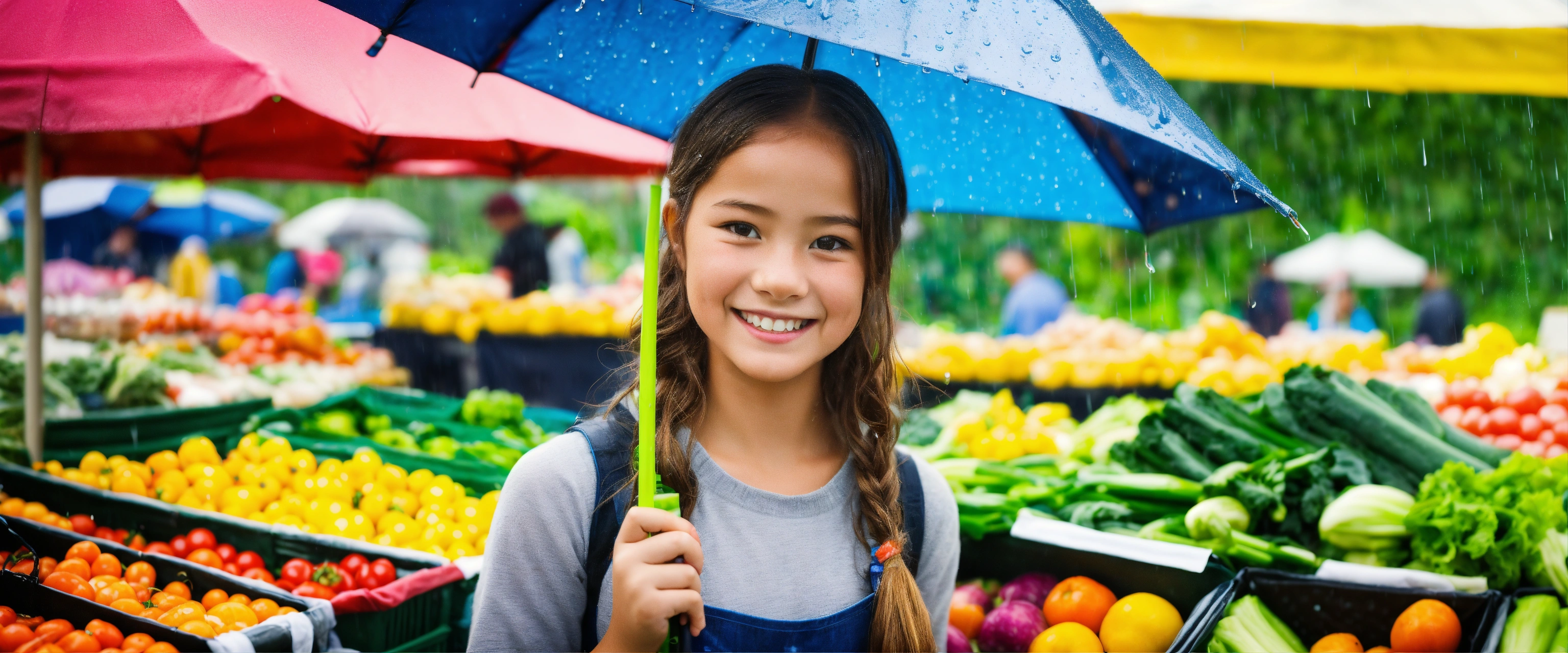 A cute young smiling 12-year-old girl with a brightly colored umbrella at a farmers market in the rain, the weather is gloomy but the girl is happy and brightly dressed, show rain falling, there are farmers' market tents filled with vegetables behind her, the orientation should be landscape for a banner image