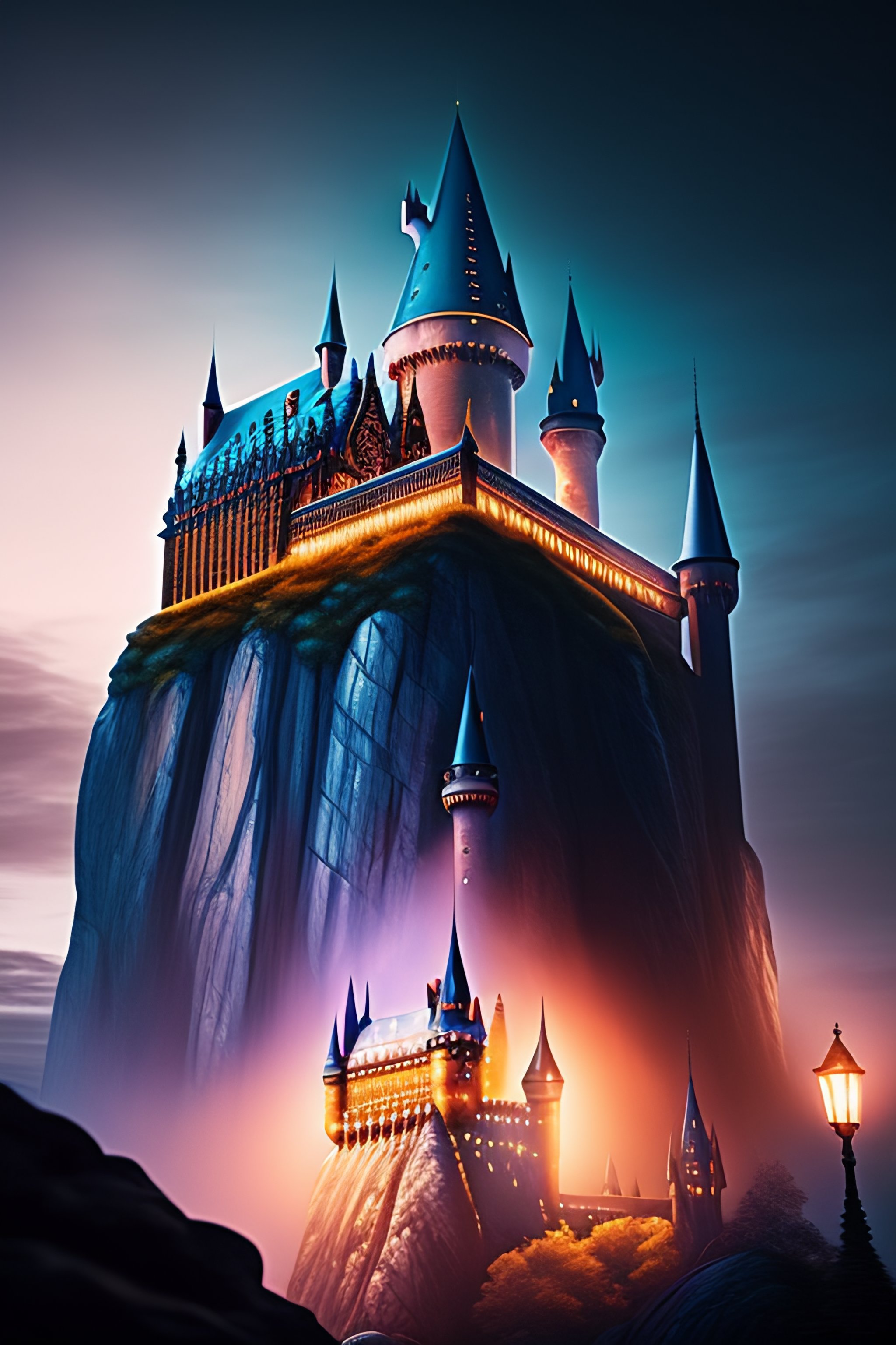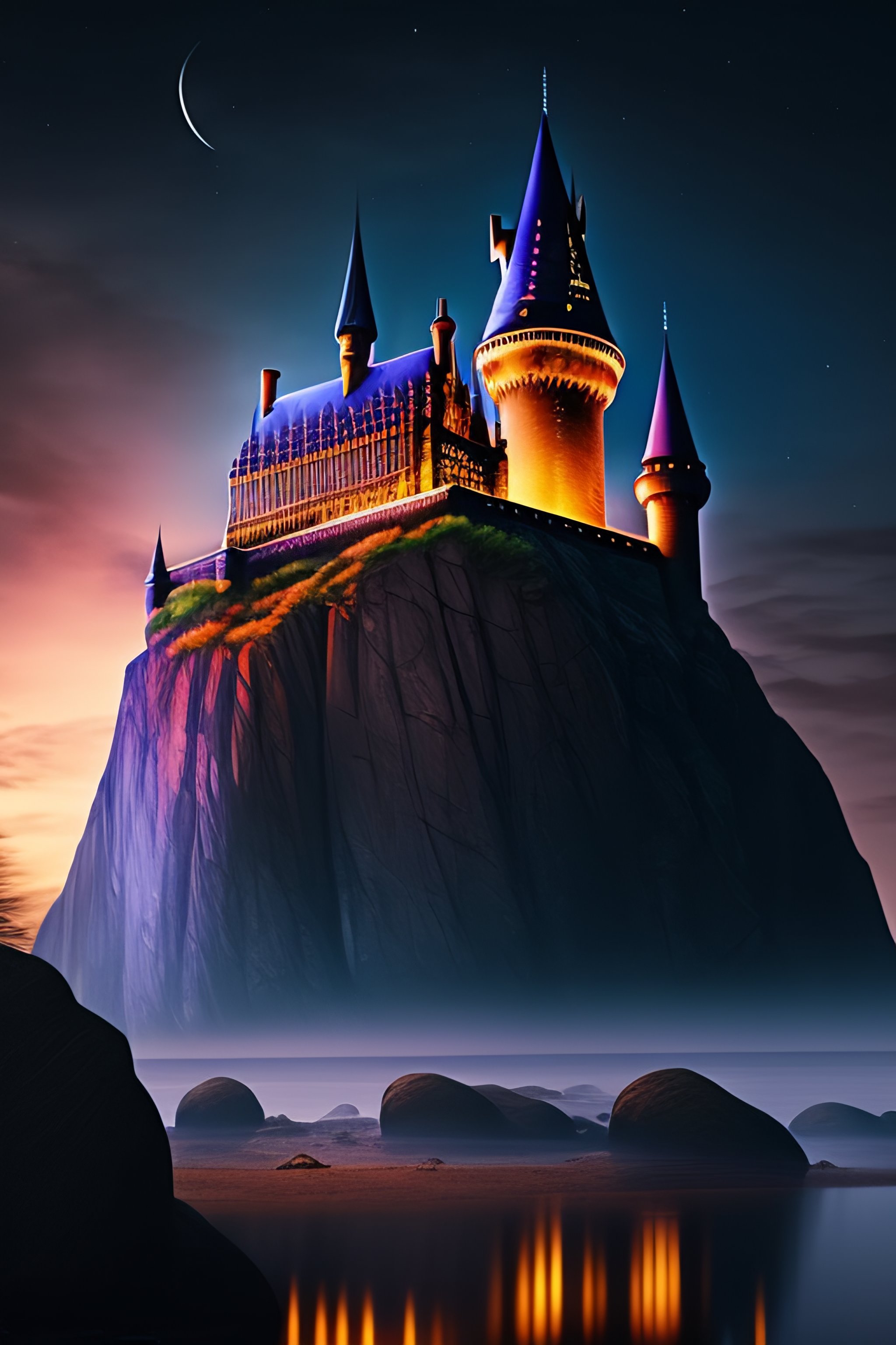 A beautiful picture of hogwarts castle during night, photorealistic, hiper realistic 4k, with wizards flying on the air using a broom.