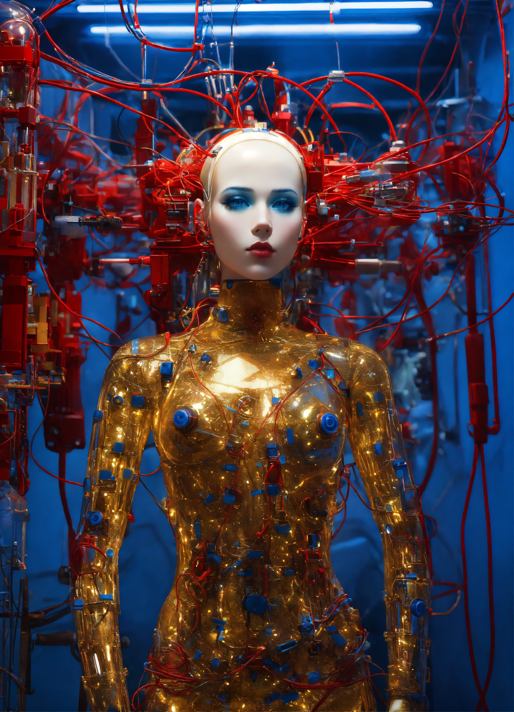 Body portrait photography, in a blue and gold laboratory full of cables and wires and led, standing an attractive transparent white plexiglass body glitter plc robots with red motor head, with ray guns, 80 degree view, art by sergio lopez, natalie shau, james jean and salvador dali