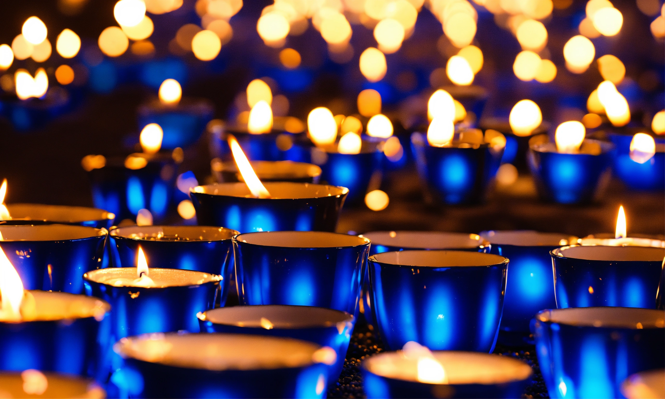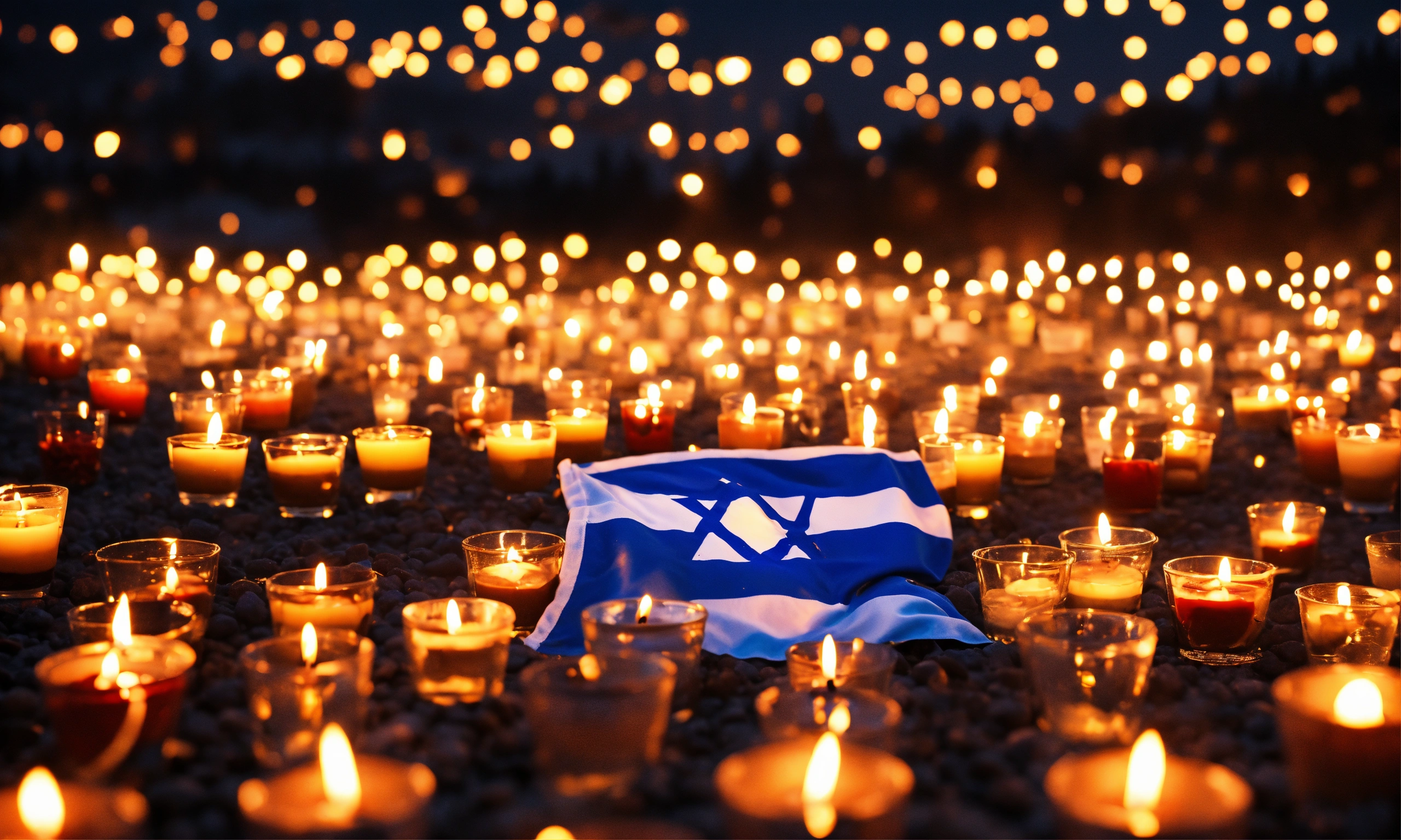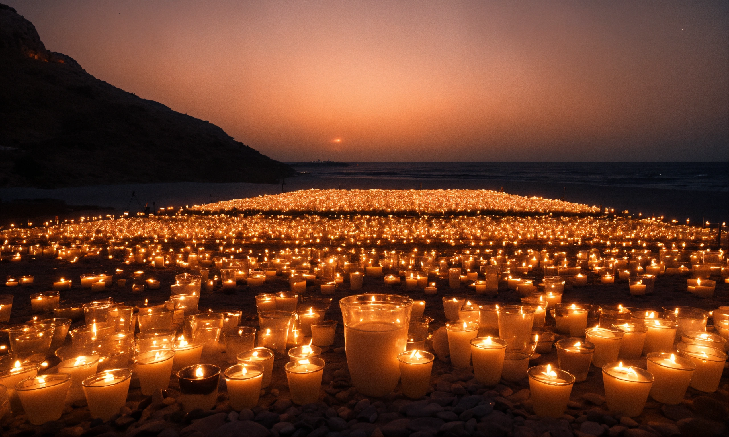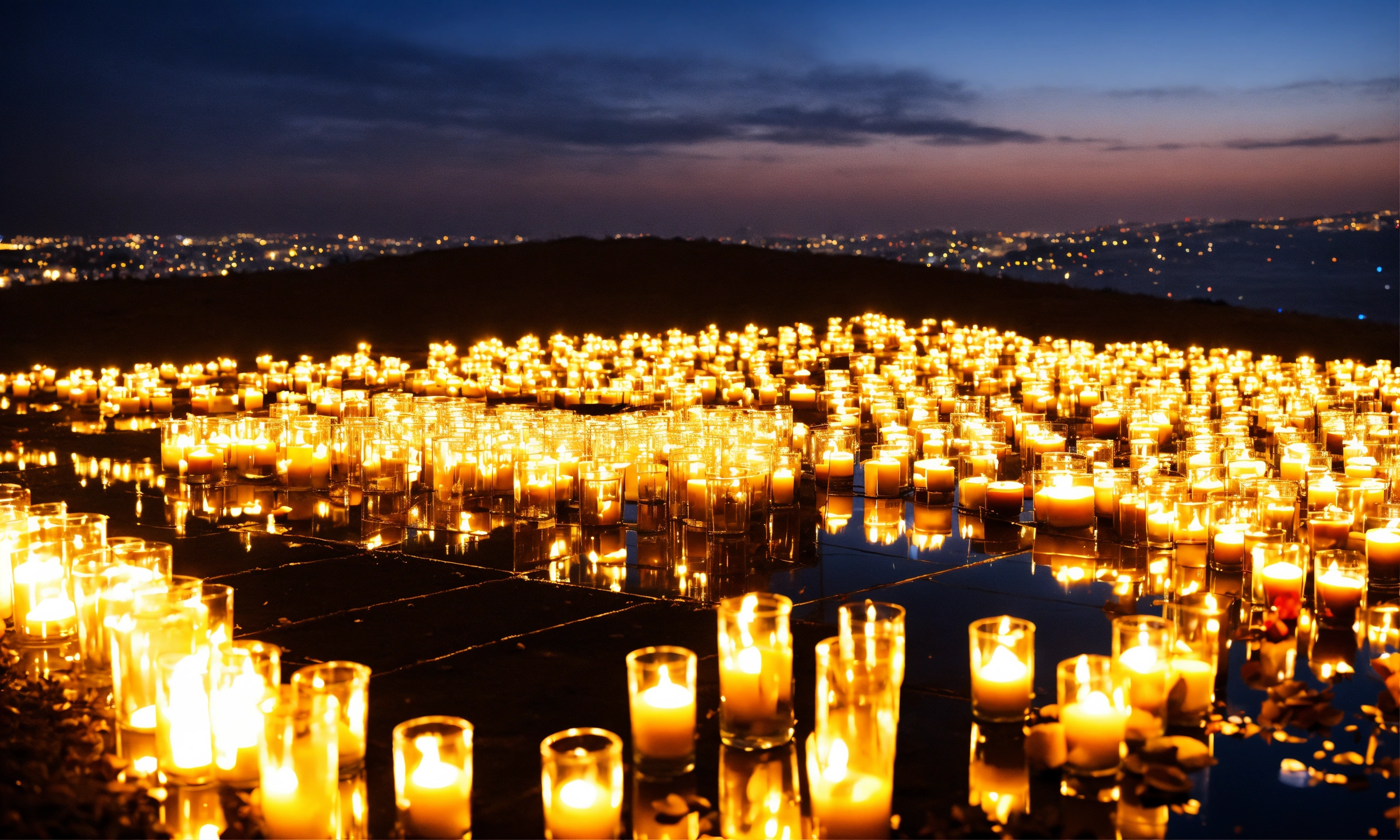 Create for me a realistic 8k image of a night lit by hundreds of candles in glass cups and the israeli flag spread on the ground