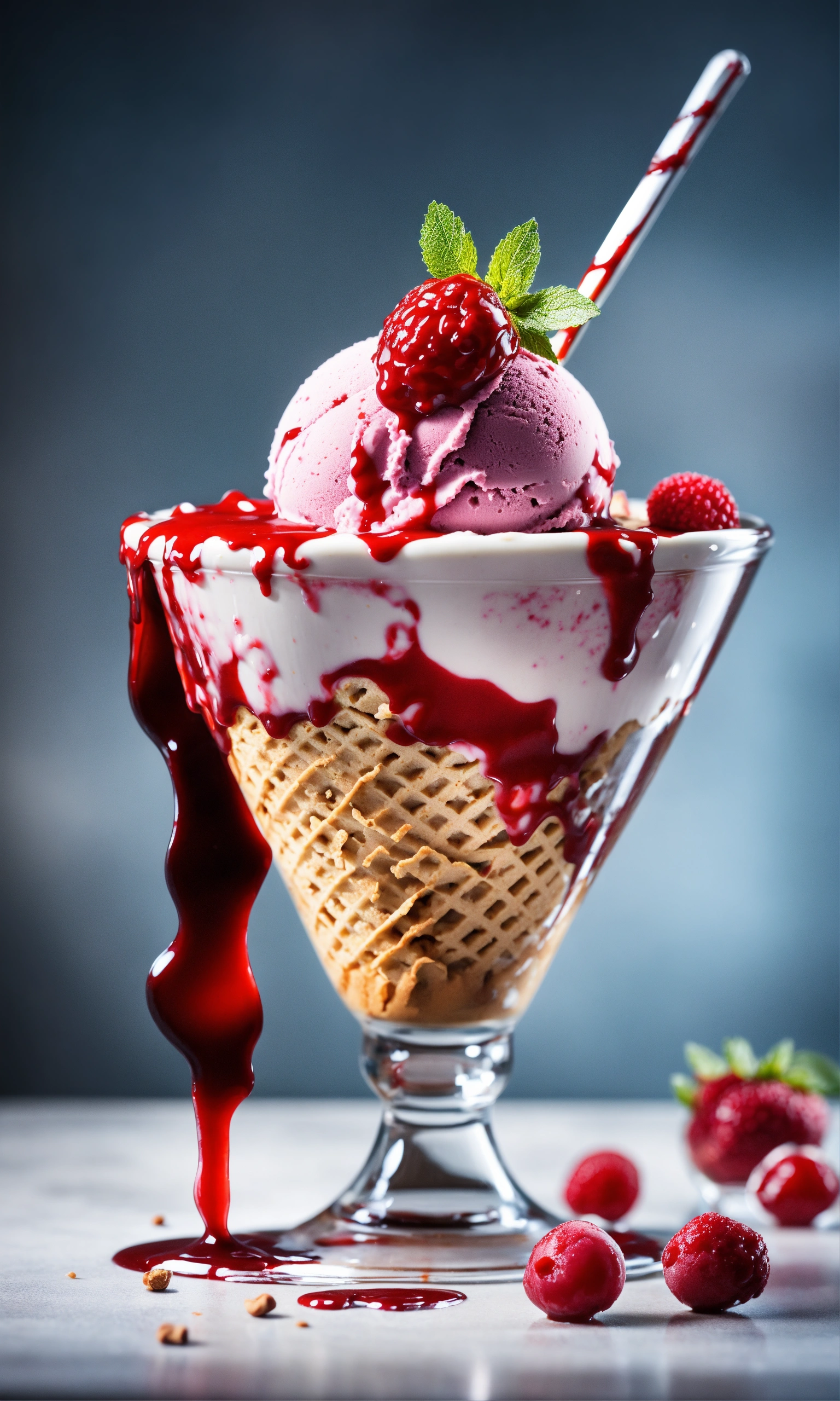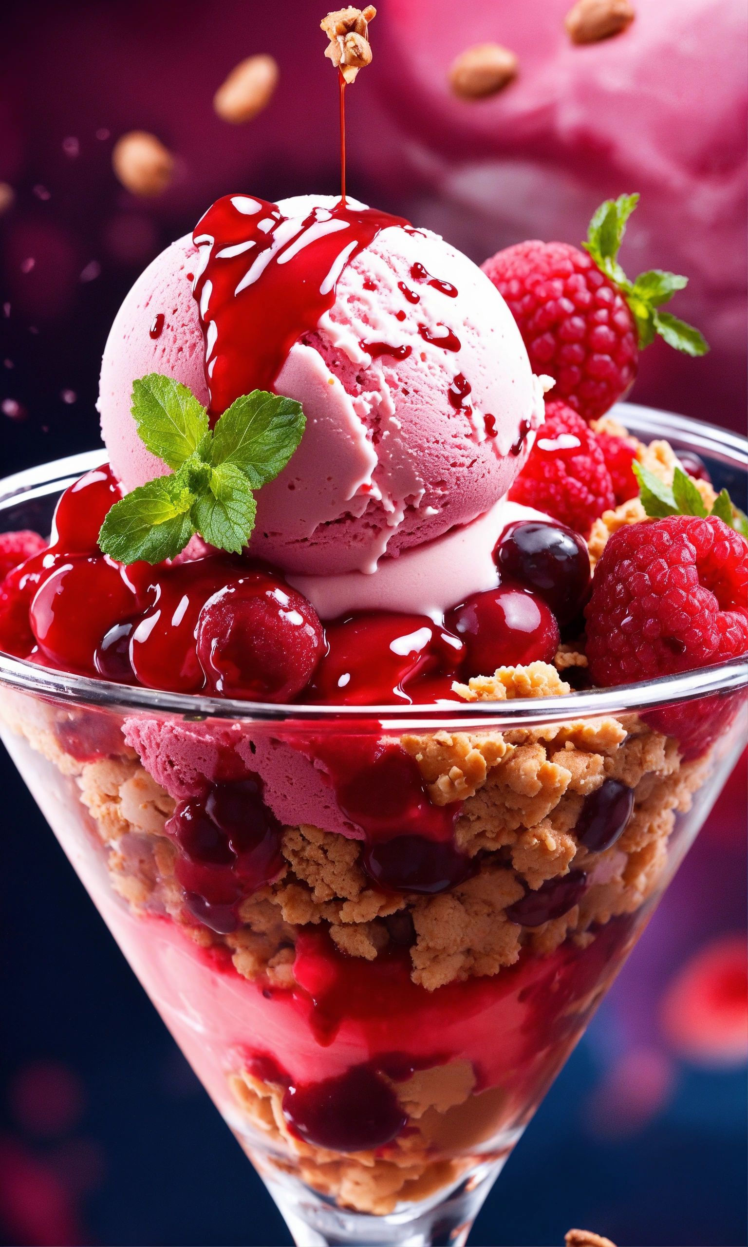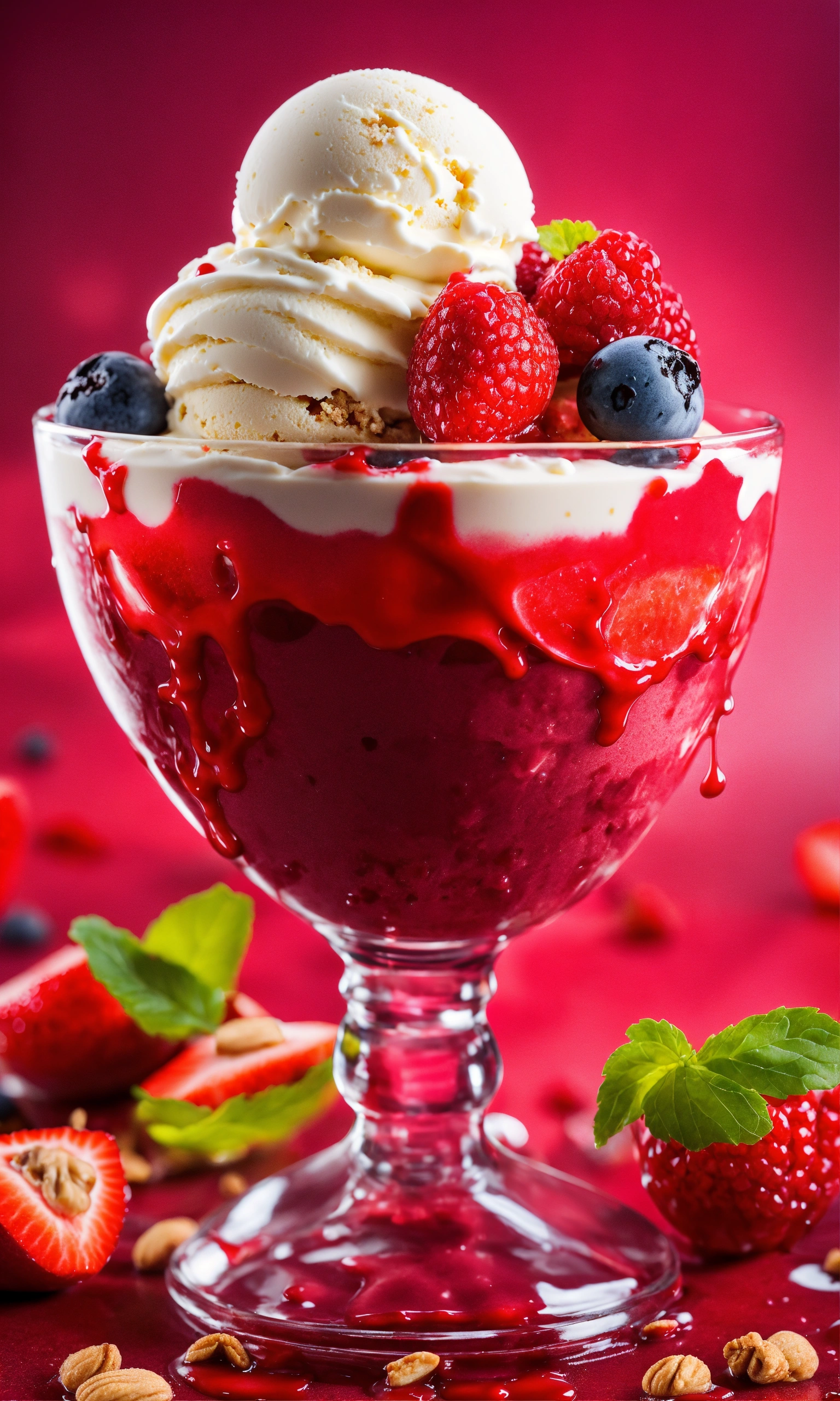 Red fruit ice cream sundae. with spectacular touches of hazelnut pieces and red fruit coulis. creative dynamic composition varies the angle. macro food photography, taken by an expensive, very high-tech camera. eye-catching, nice and captivating. photo product, ideal for poster promotion. 8k, hd quality, ultra realistic, hyper detailed. original idea taken from a different angle.