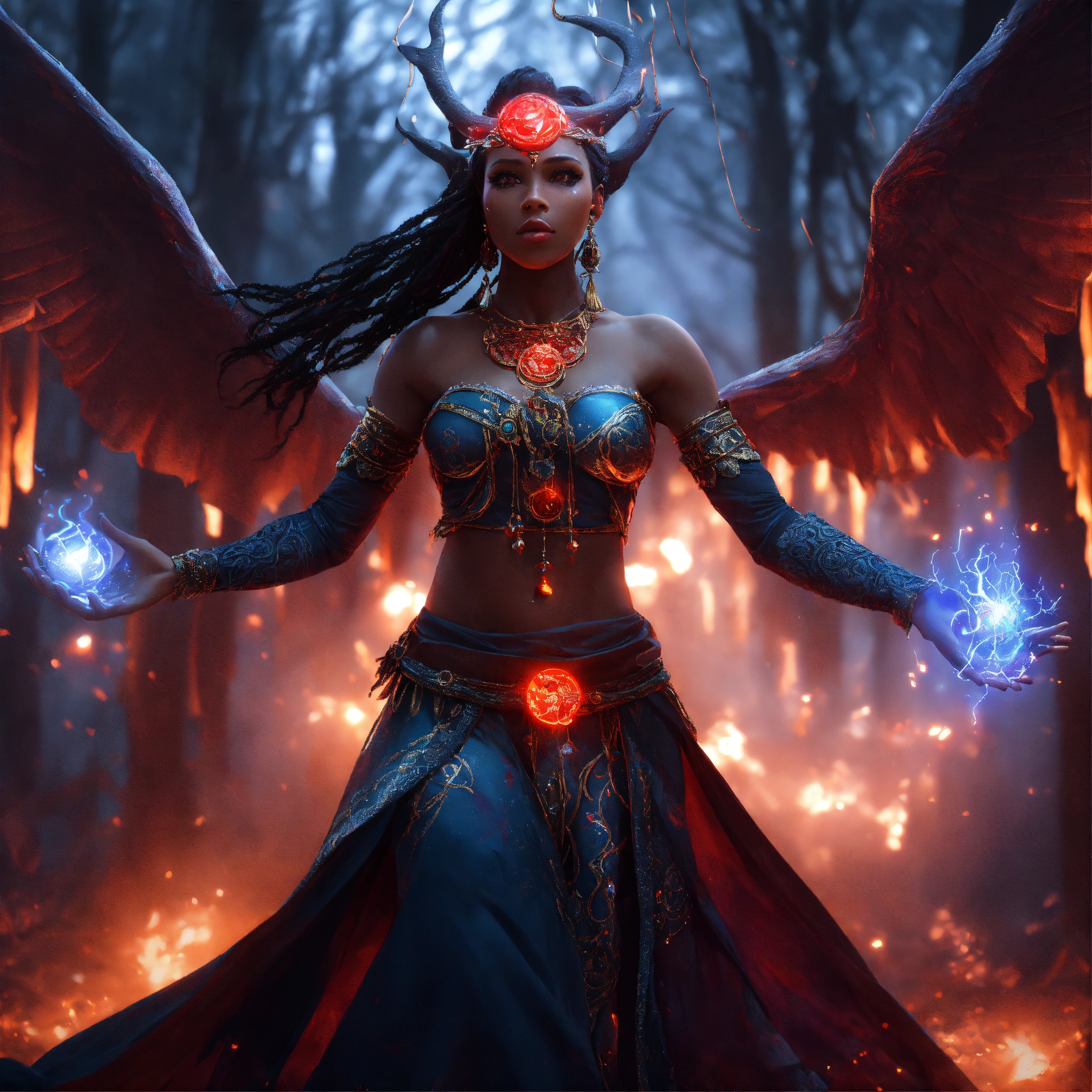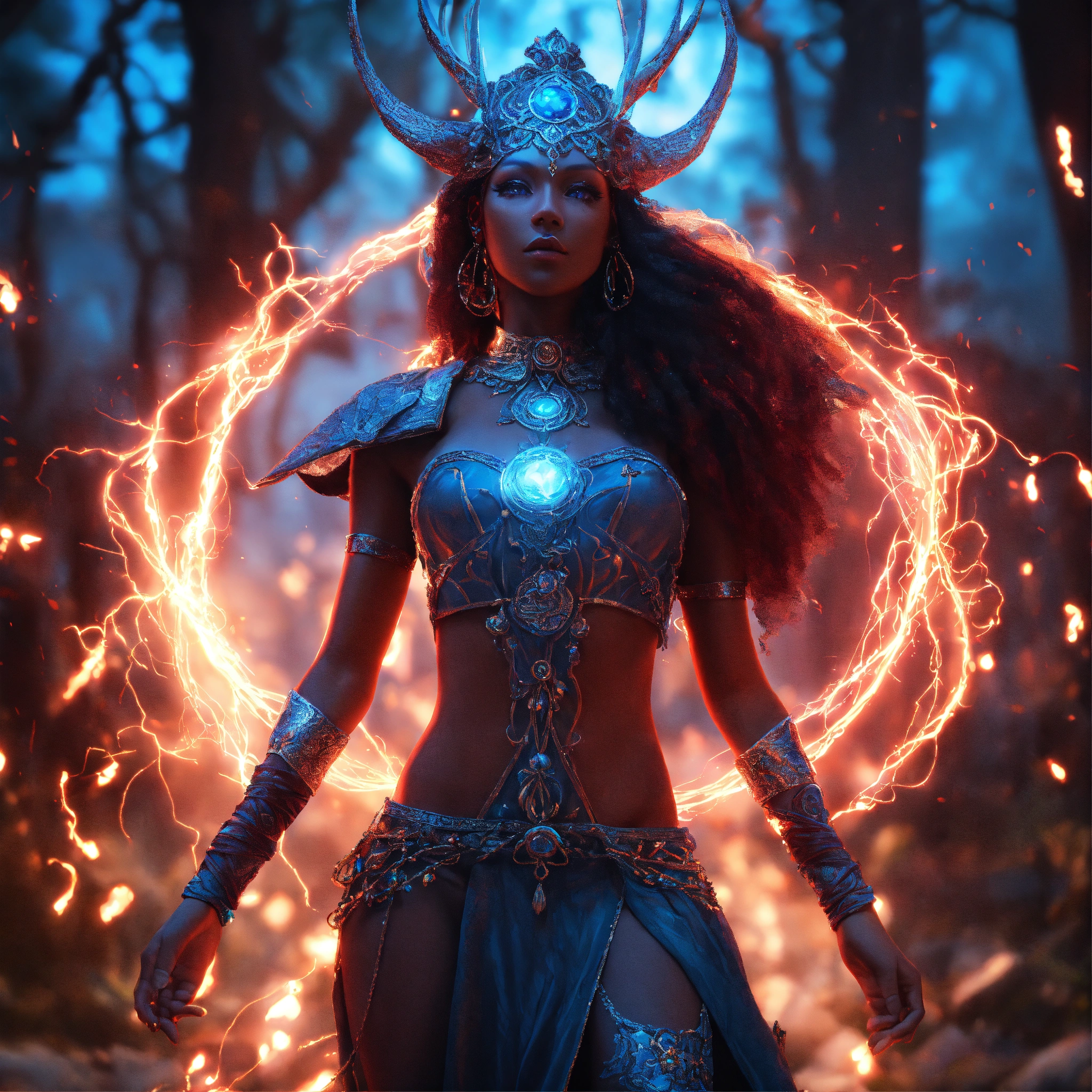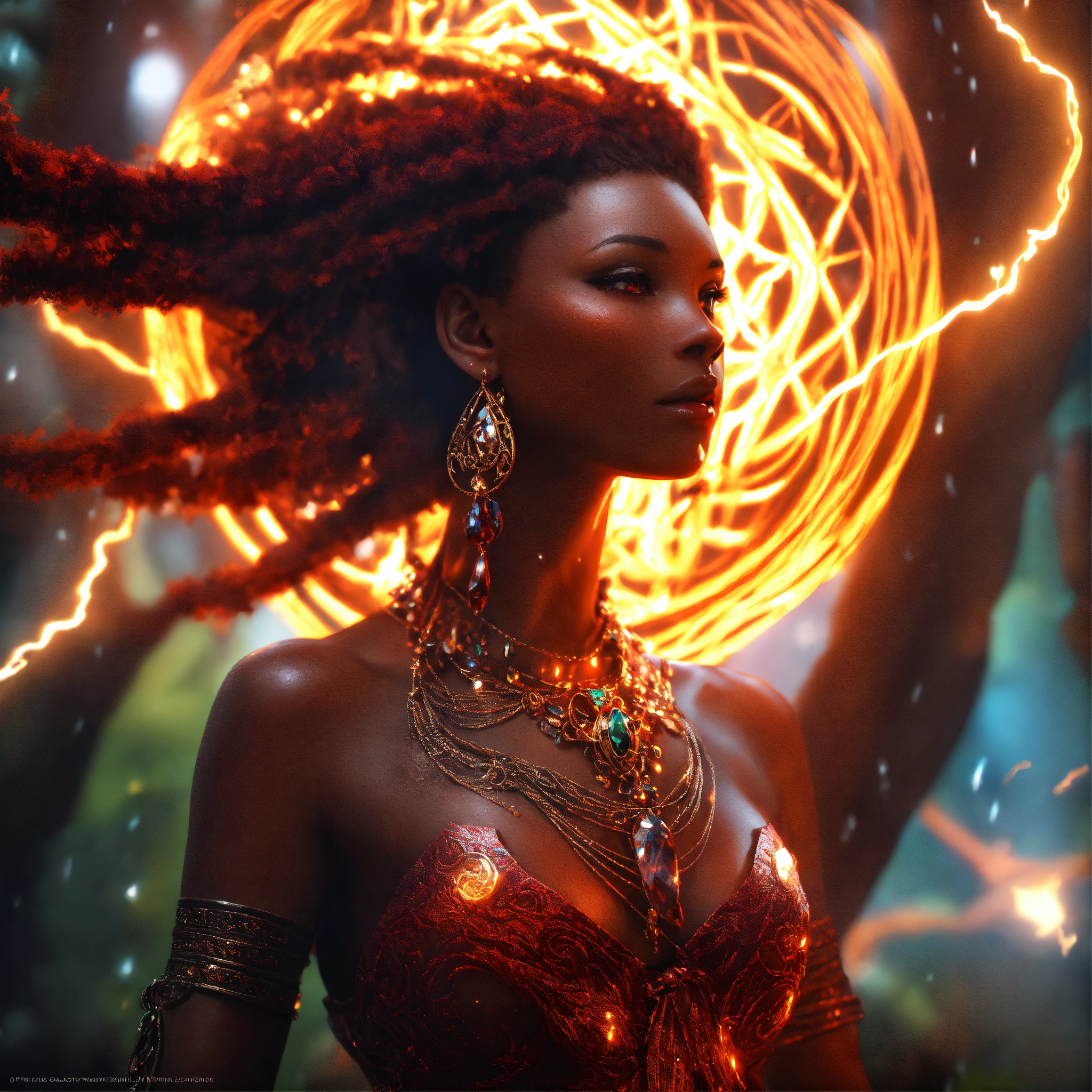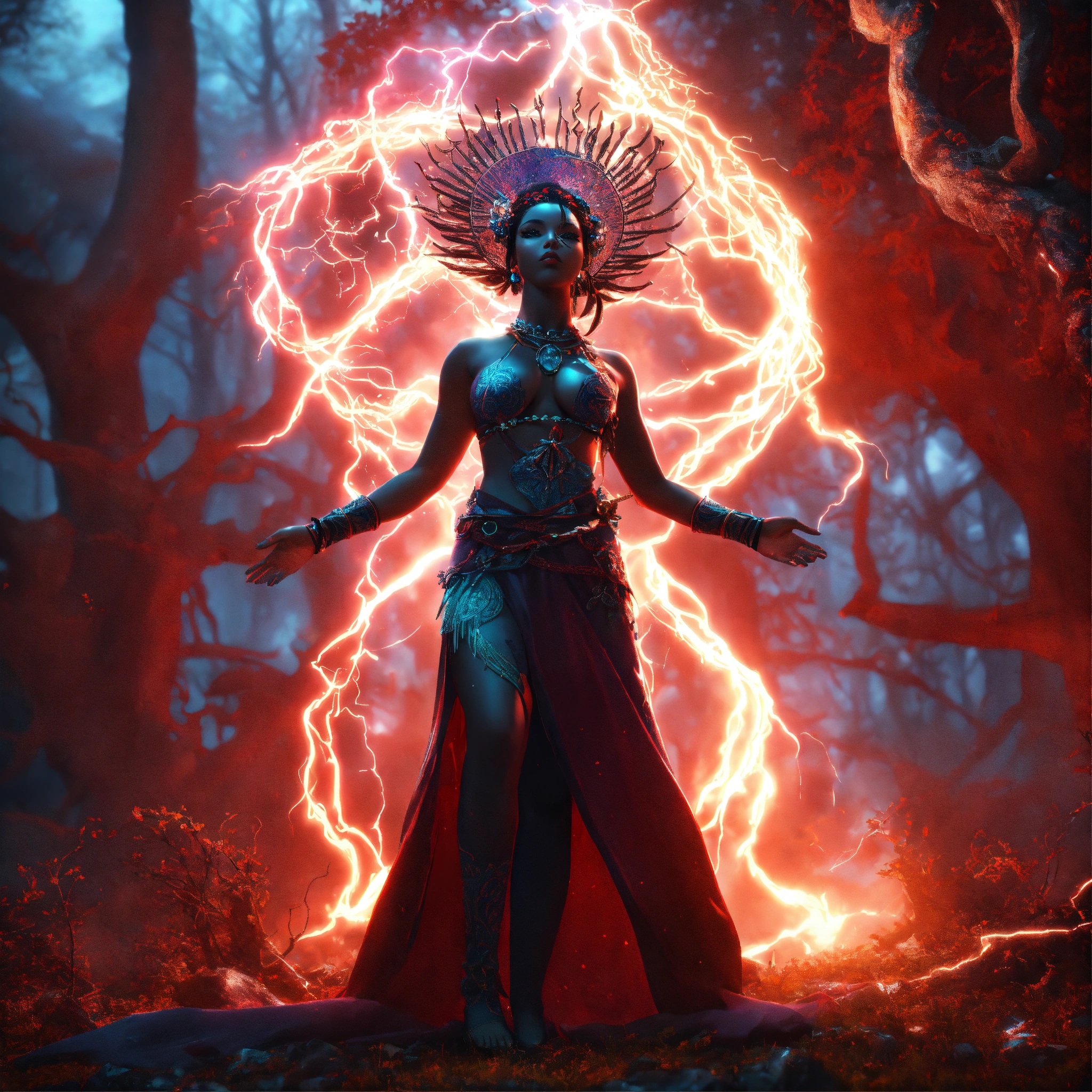 A stunning 3d fullbody shot interpretation of a beautiful deep black-skinned female druid sorceress channeling divine energy, surrounded with piercing crimson-eyed, surrounded with telekinetic lightning spirit aura. fantasy inspired, trending on artstation, cgsociety, stunning fantasy art, photorealistic, cinematic lighting, ornate and luxe, darkness forest full of spirits shadows detailed fantasy background insanely detailed, aesthetic, intricate hoodoo tribal tattoos on the skin. mystic ice manipulation, spectacular
