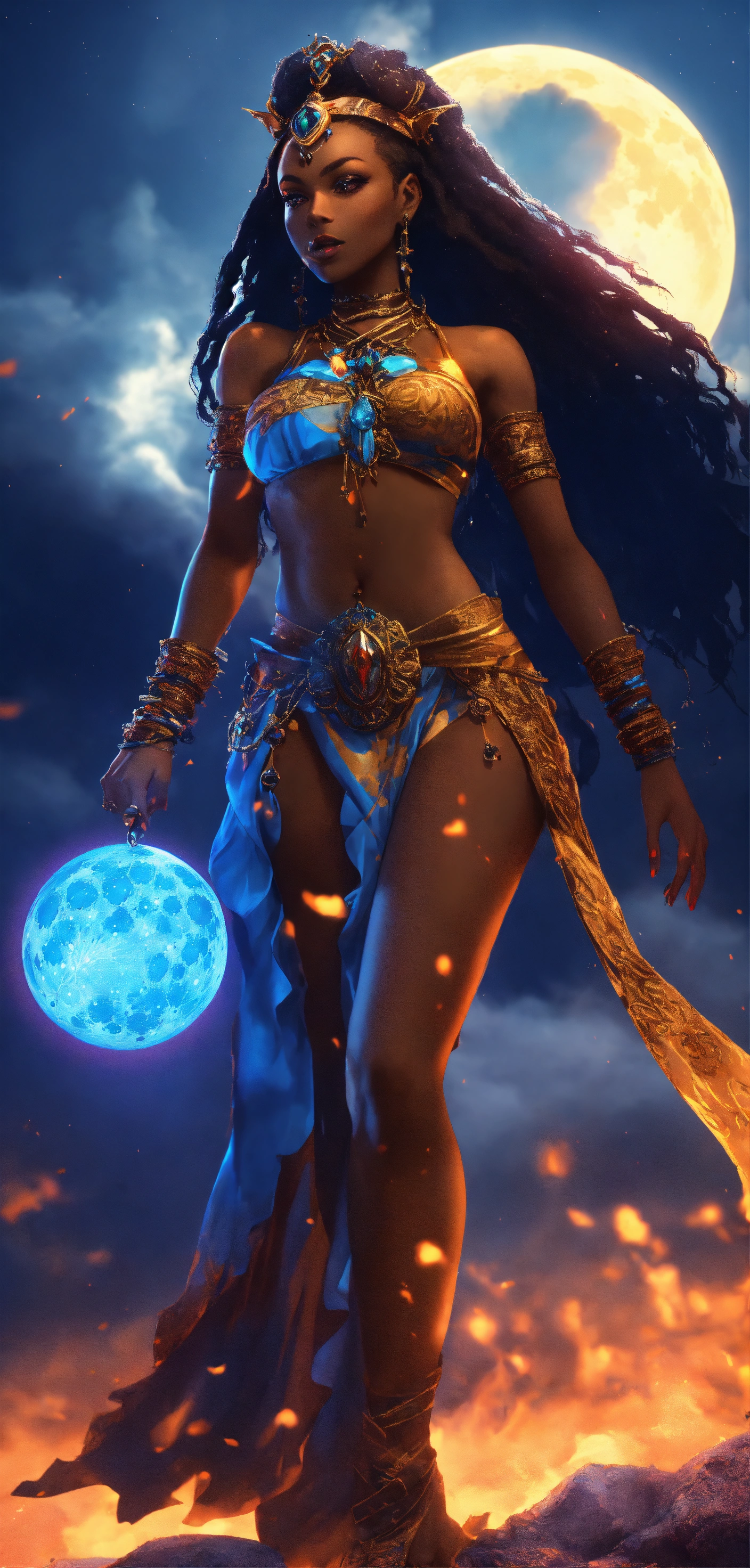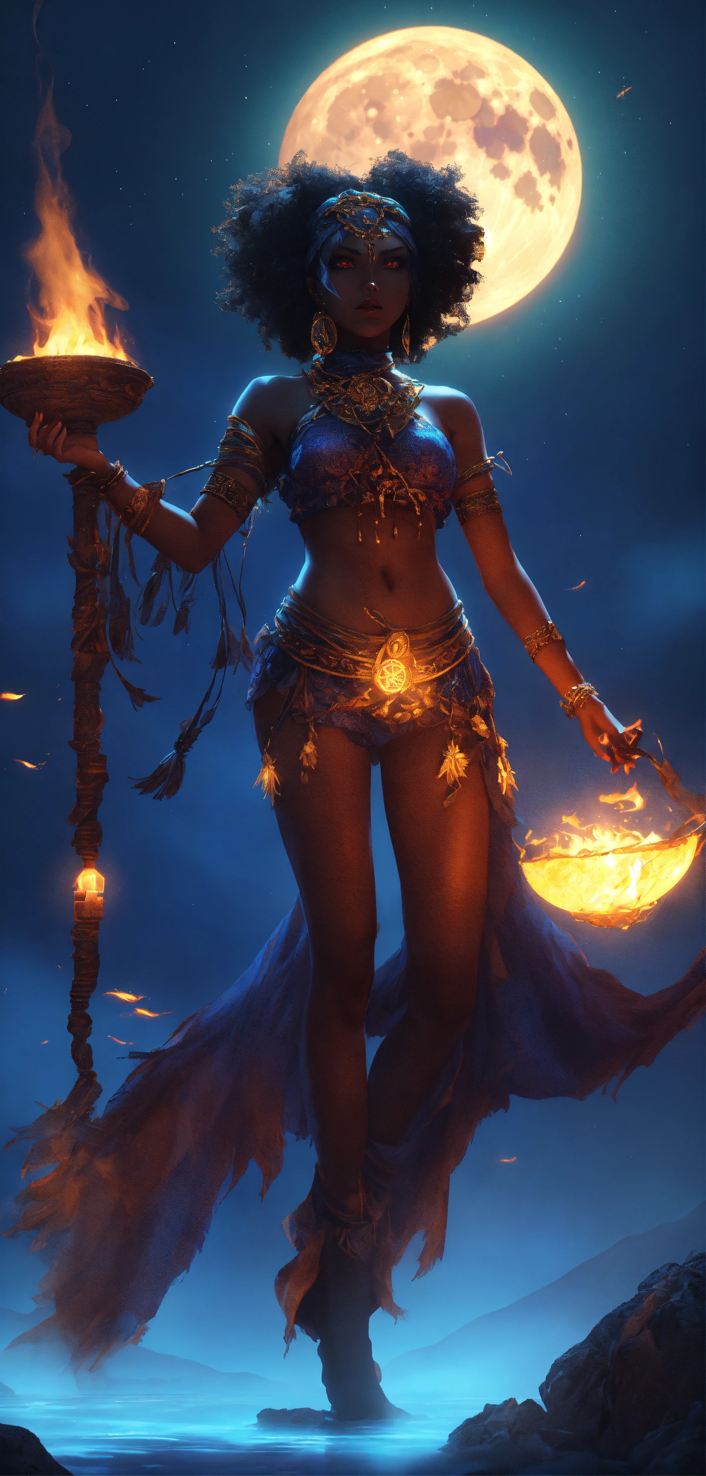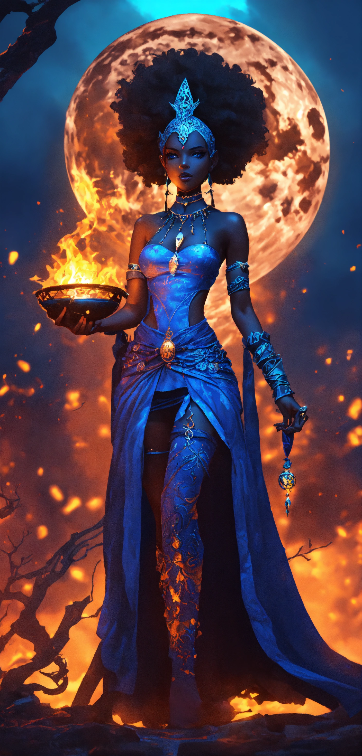 A levitating stunning anime interpretation [full body] of a [levitating] haunted possessed captivating caribean deep black-skinned dark fairy demonic queen of ancient evil voodoo, holding a fire powerful ceremony to conjure a spell, fierce looking, dark blue fog, powerful magik atmosphere [blue glowing moon ]fully detailed background with clouds and scary gobelins intricate, 8k, like gordon cummings, dark magik fantasy, cgsociety. traditional evil shamanism, aesthetic reflecting colors, grading light [blue glowing moon background details], trending on artstation, magically dark atmosphere, 3d anime render. award-winning. like midjourney niji5 style art.