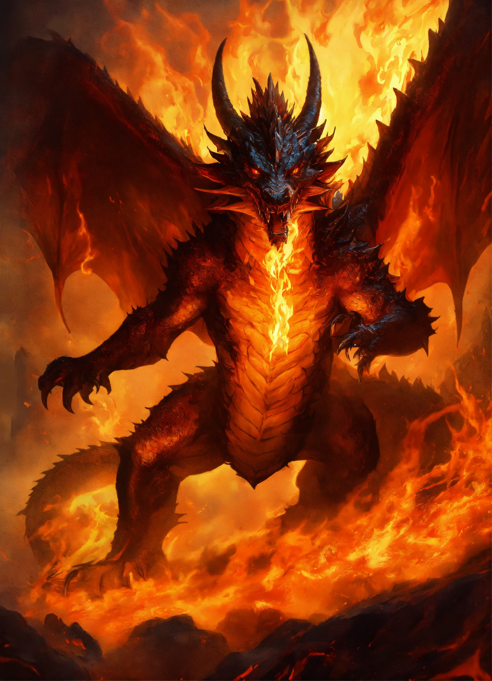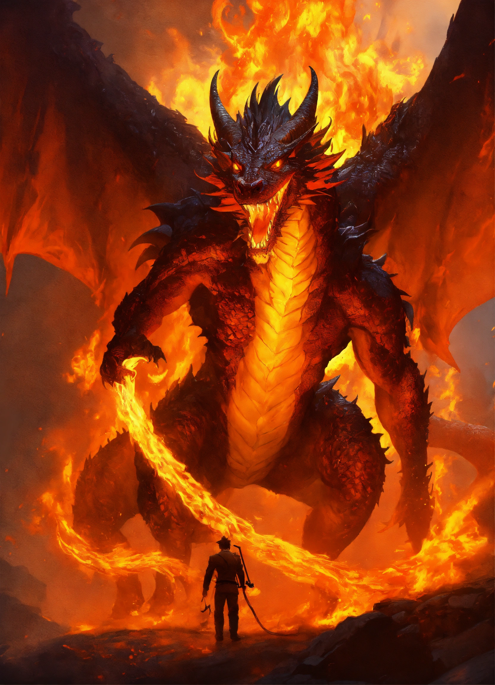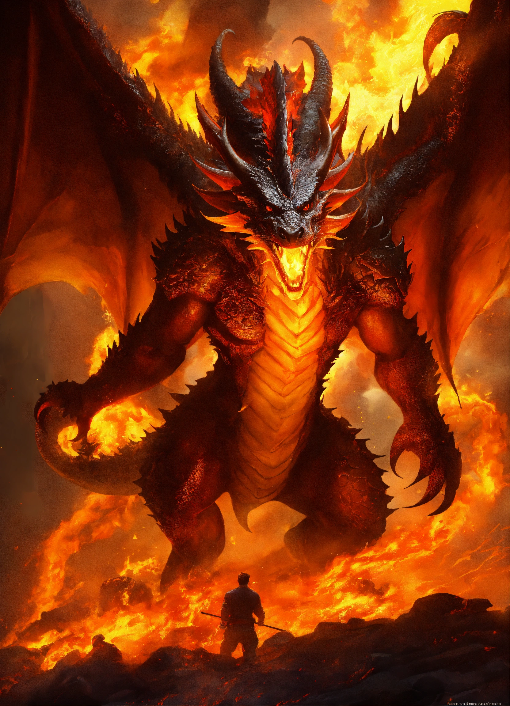 A grotesque, demonic dragon, with matted and twisted fur and eyes glowing with otherworldly fire fighting with a muscular man