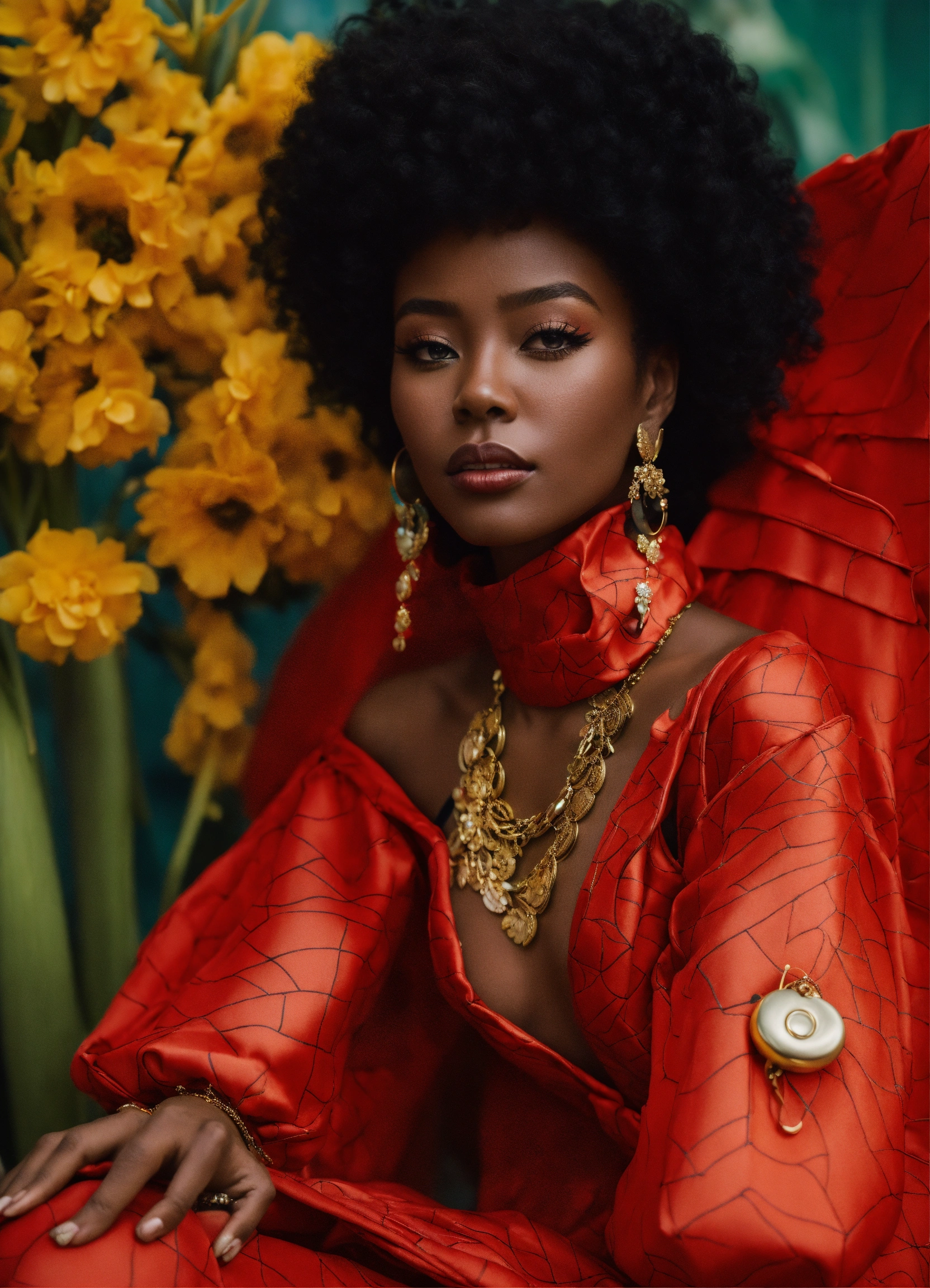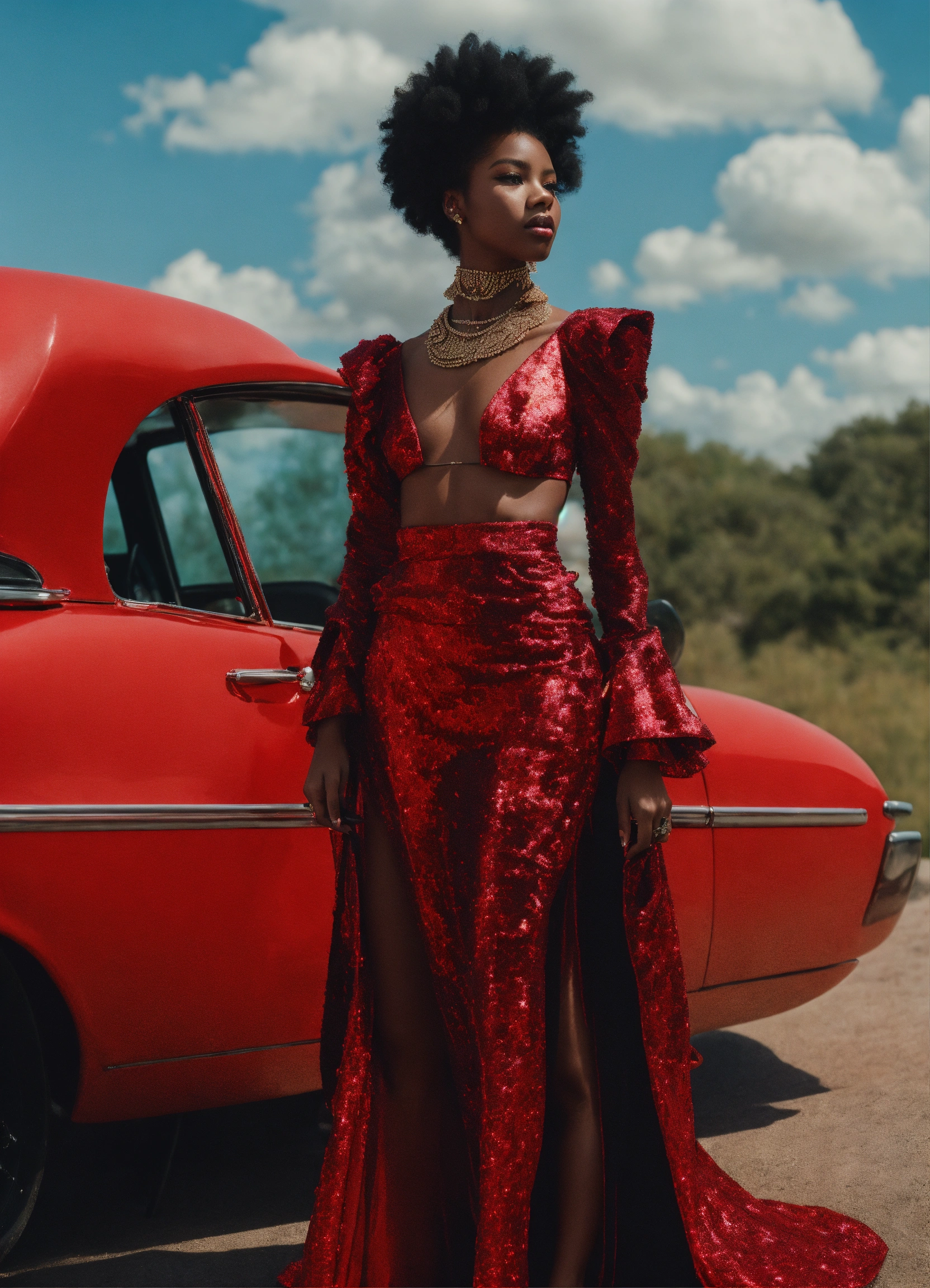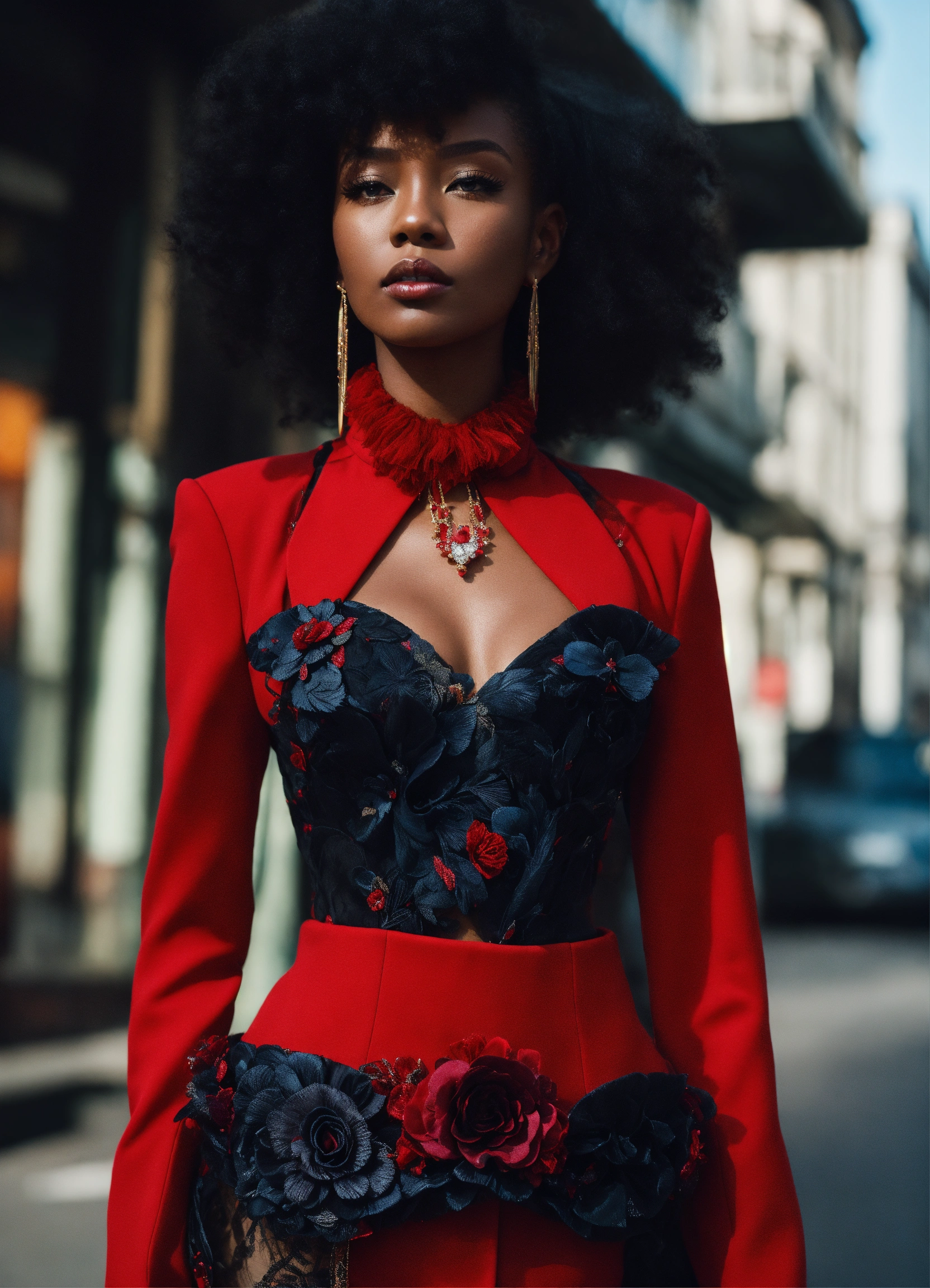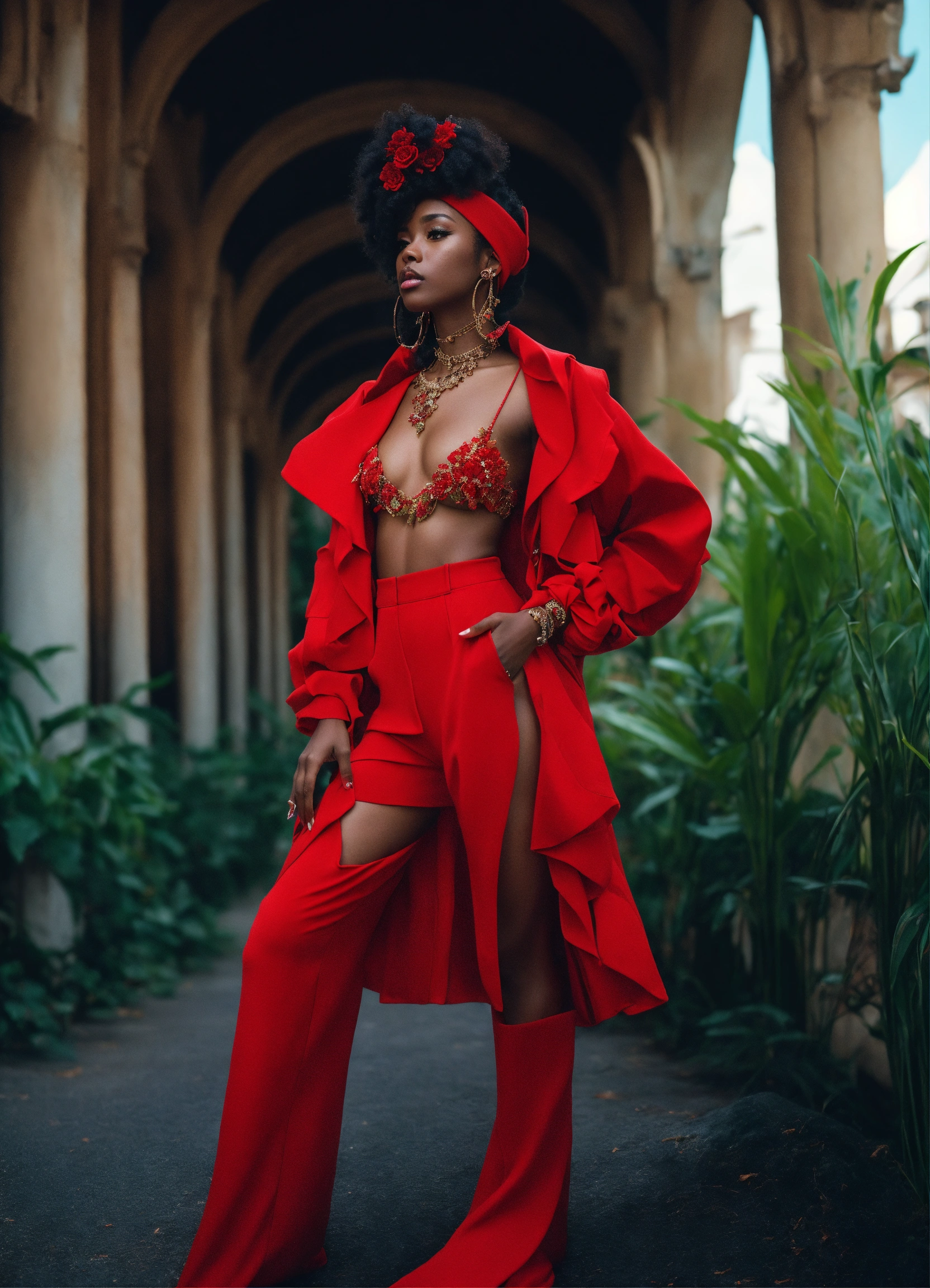 Black woman, size 12, 8k resolution, hyper realistic, day, 35mm film, editorial, high fashion, girl in eco friendly haute couture outfit in the style of anime, surrealism, akira style. details. fine jewelry. eco friendly. red vibe.