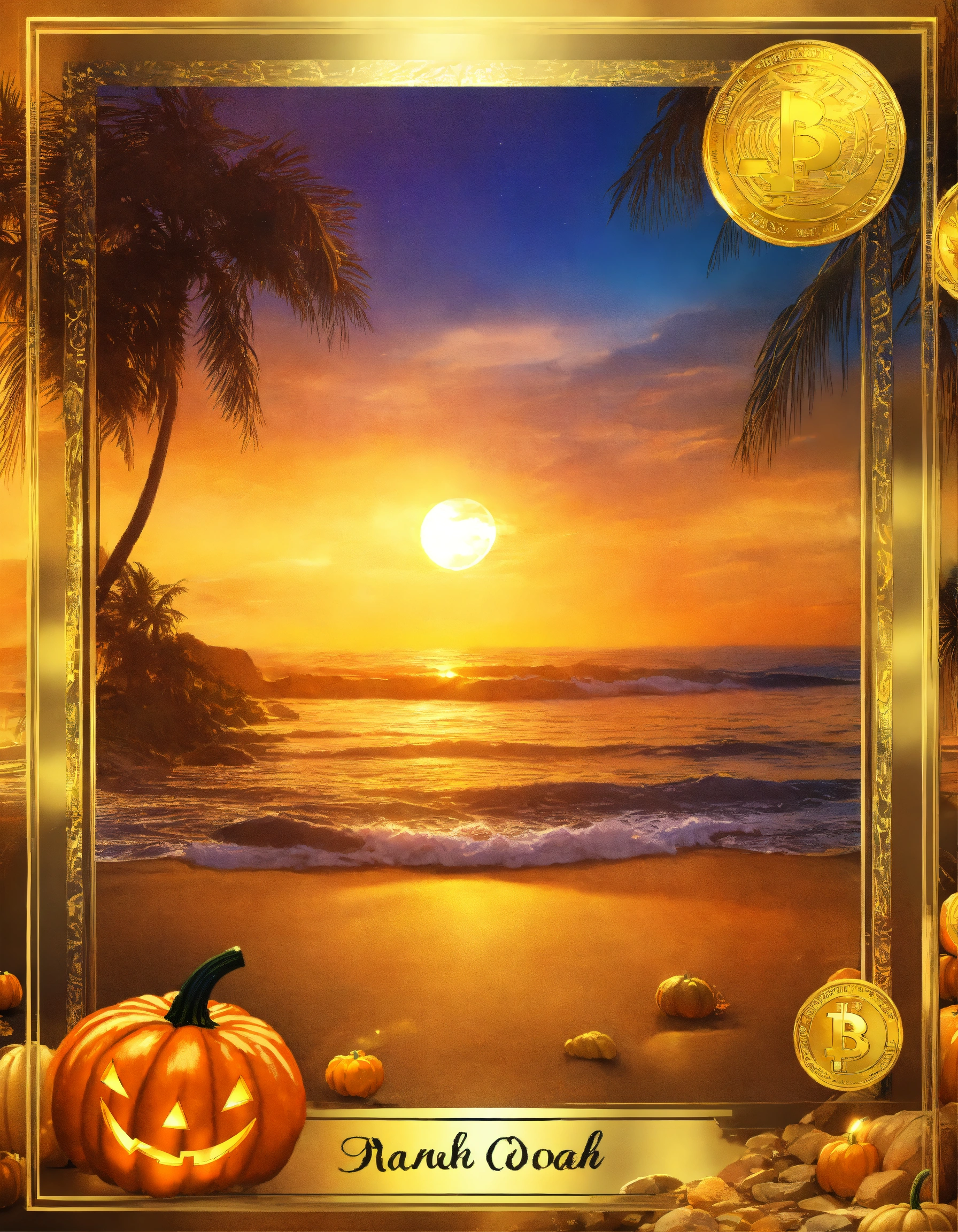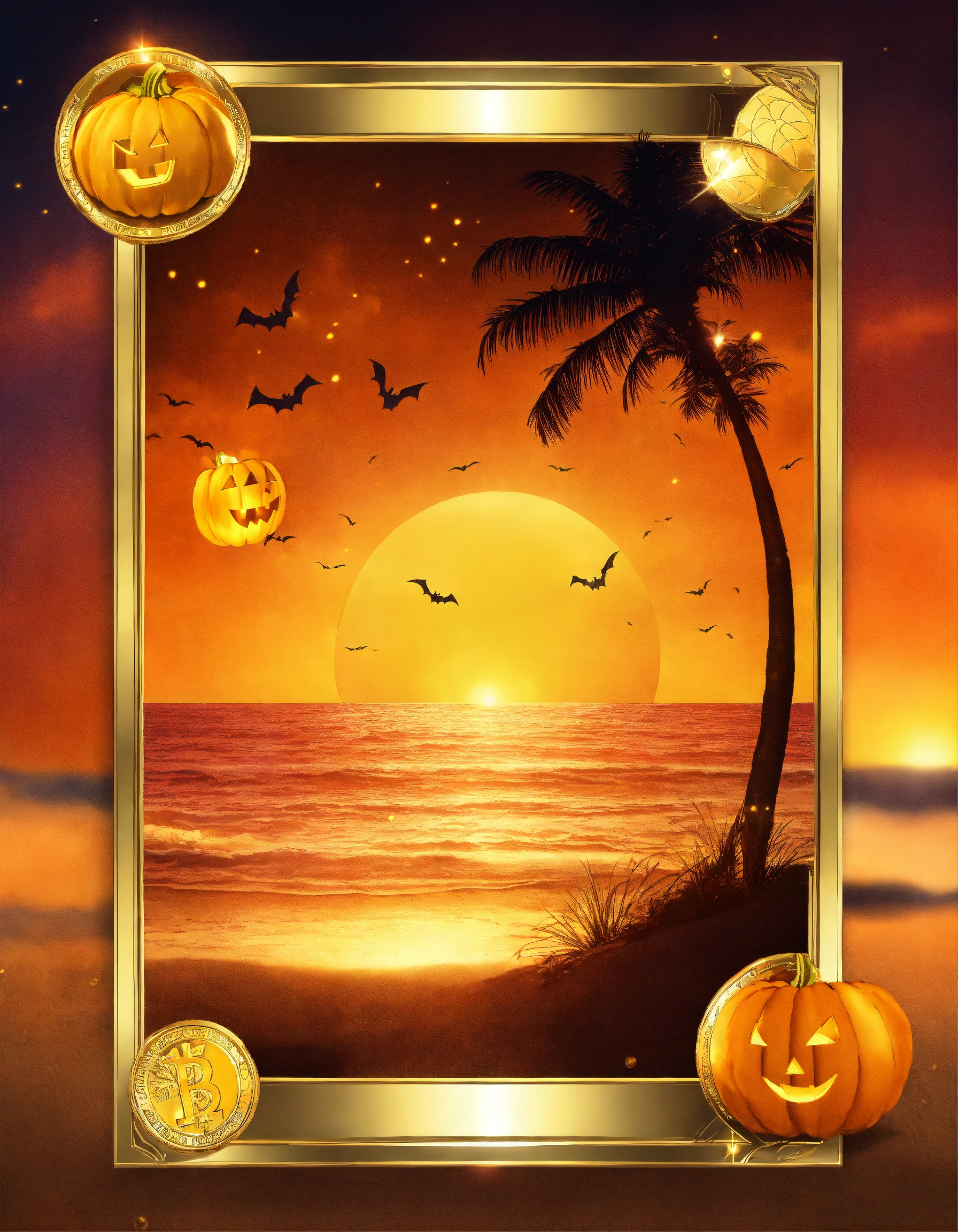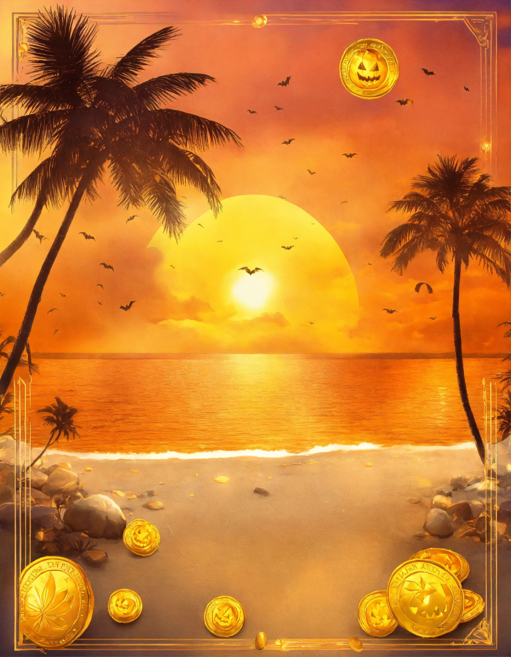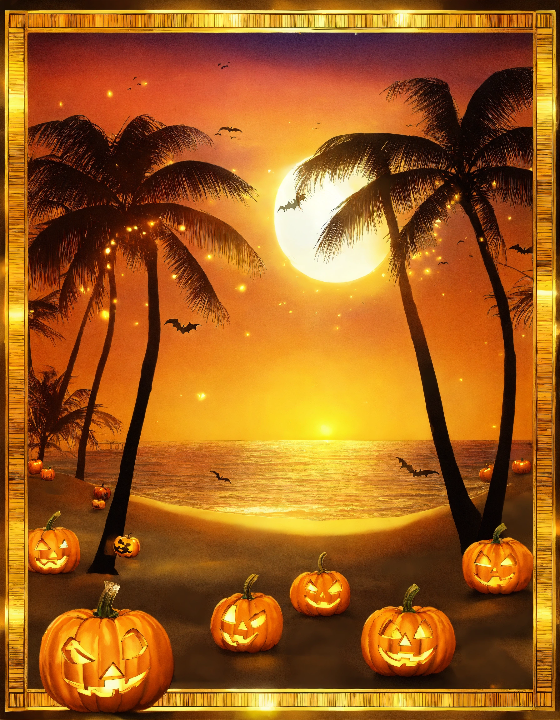 Trading card template - shiny gold look, gemstones gold coins & banknotes background sunset beach, palms, trick or treat, haloween, pumpkin, 4k, high quality resolution
