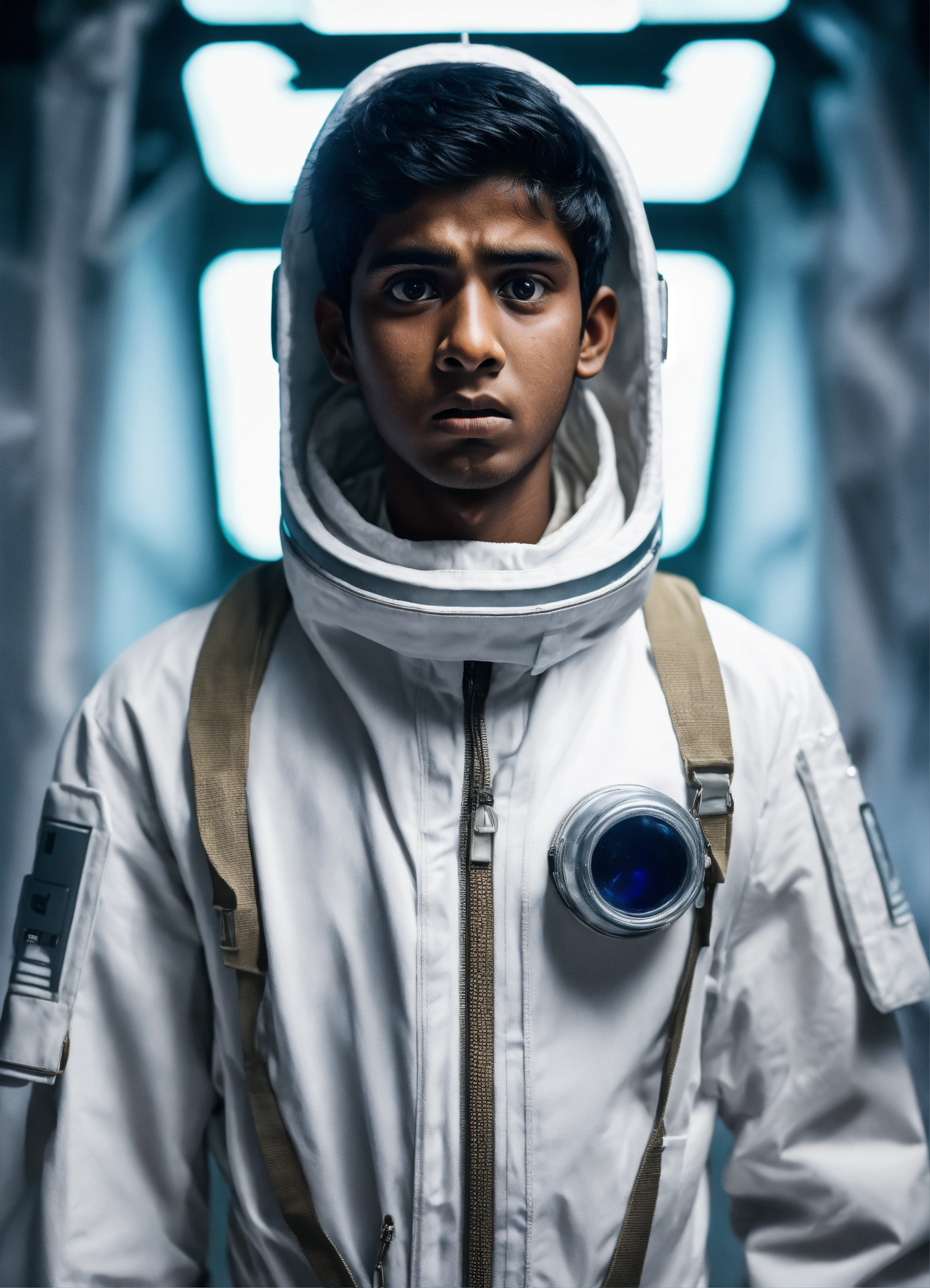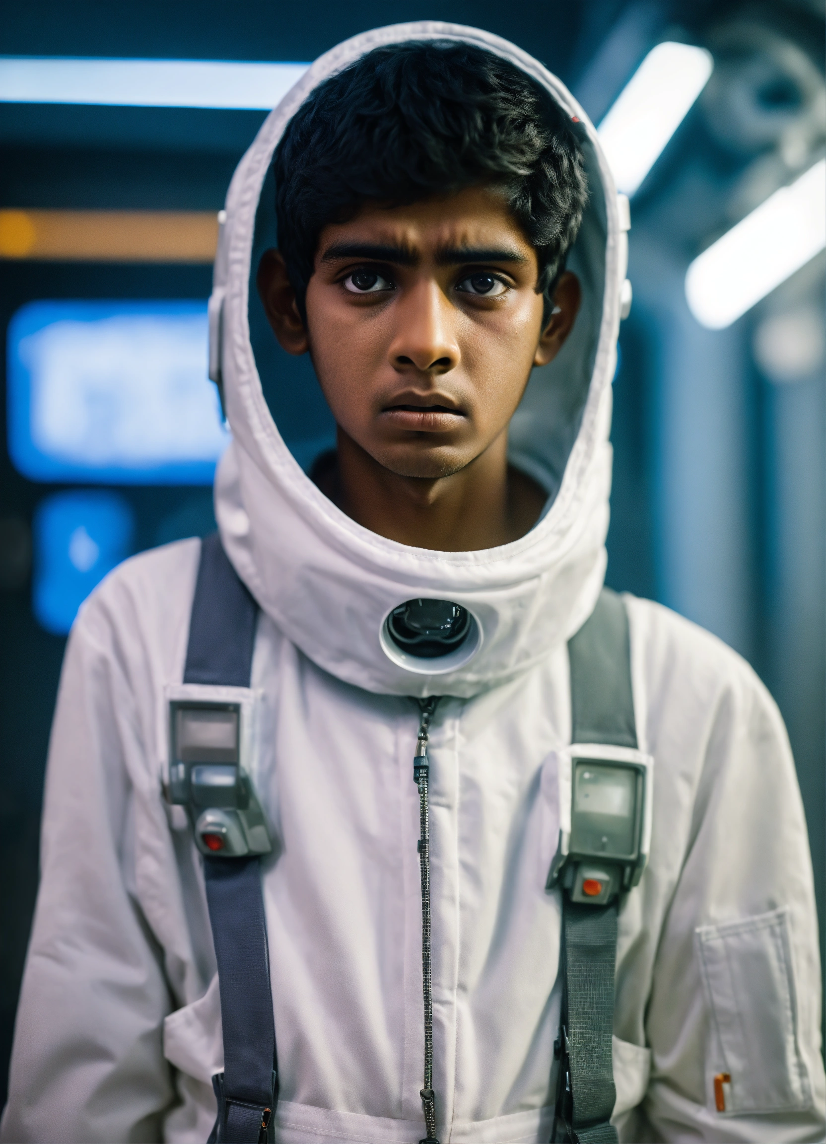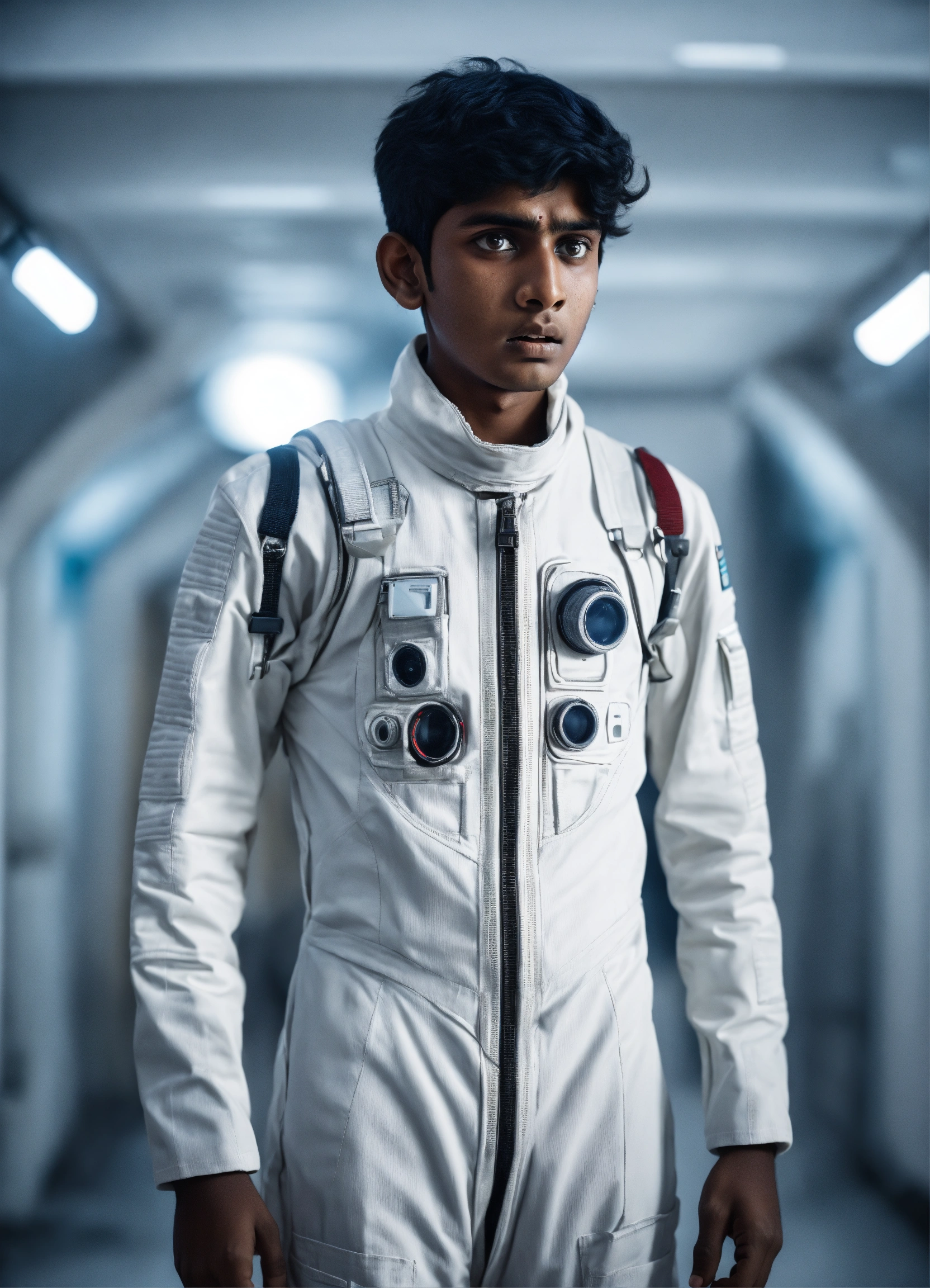 A portrait of a scared 15-years-old indian boy, tall, slim, big nose, very sad expression, terrified face, wearing a white sci-fi thight coverall, in a white sci-fi background, hyperdetailed, hyperrealistic, 8k