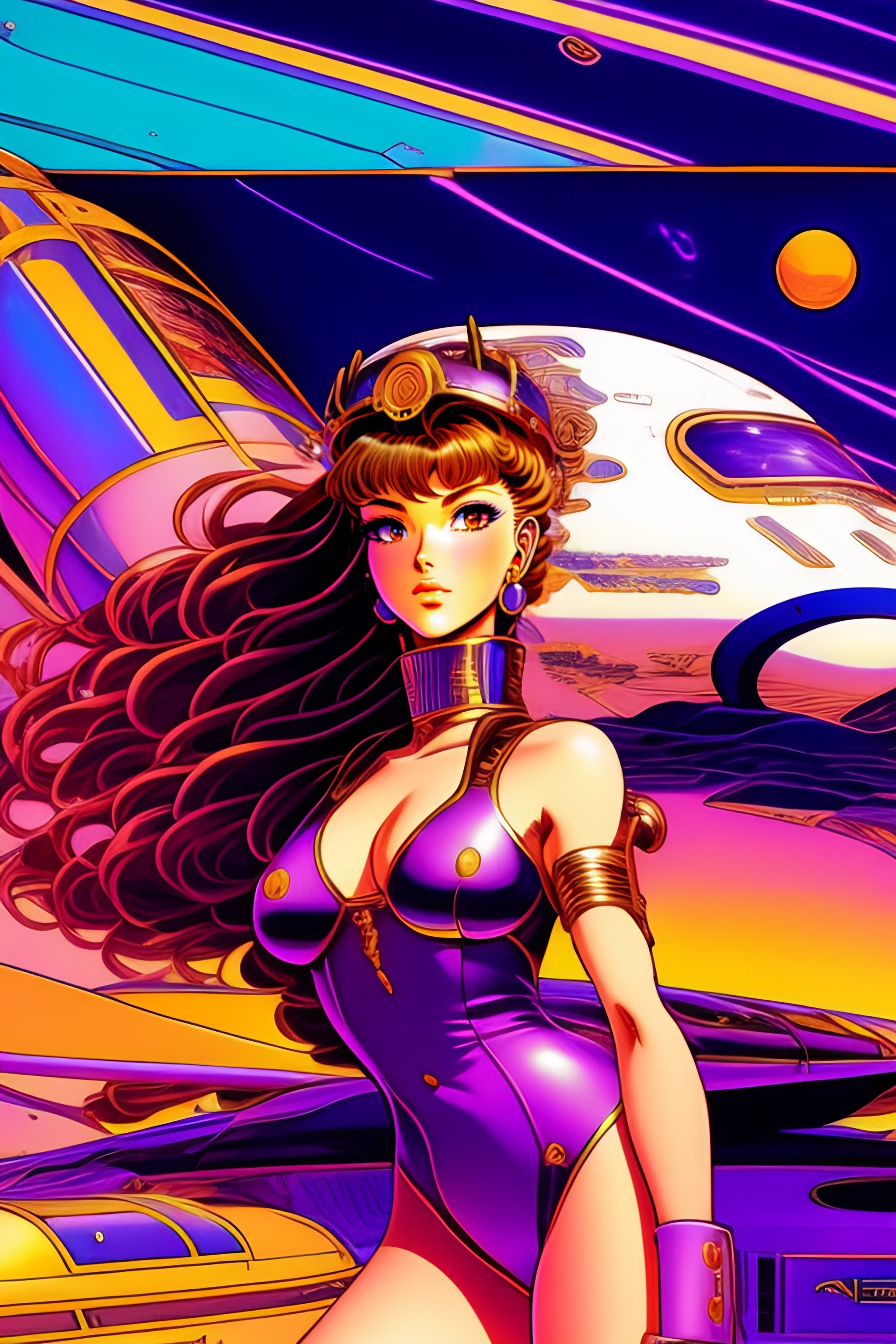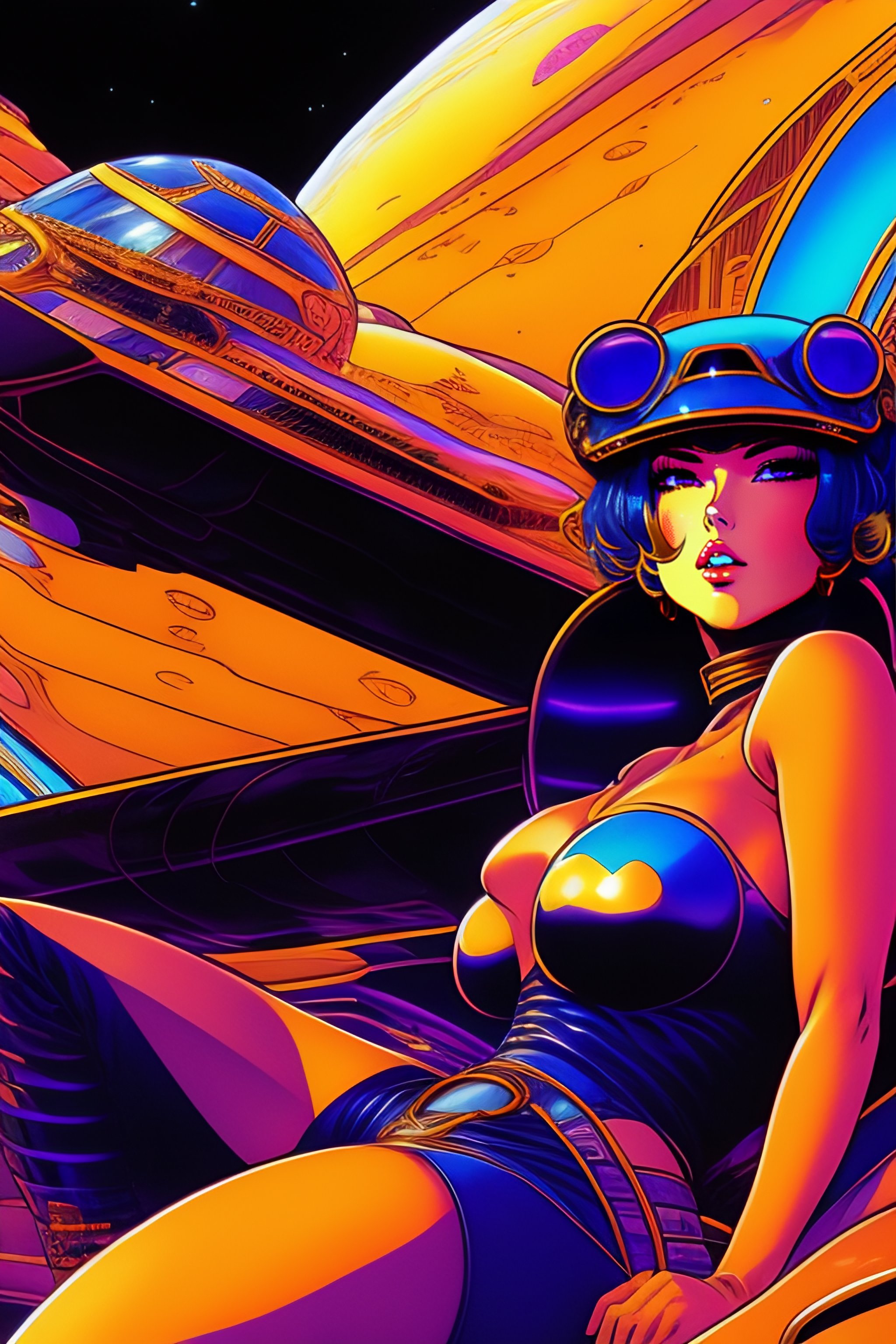 Vintage 90's anime style. cluttered starship interior; woman laying on sand; by hajime sorayama, greg tocchini, virgil finlay, sci-fi, colors, neon lights. line art.