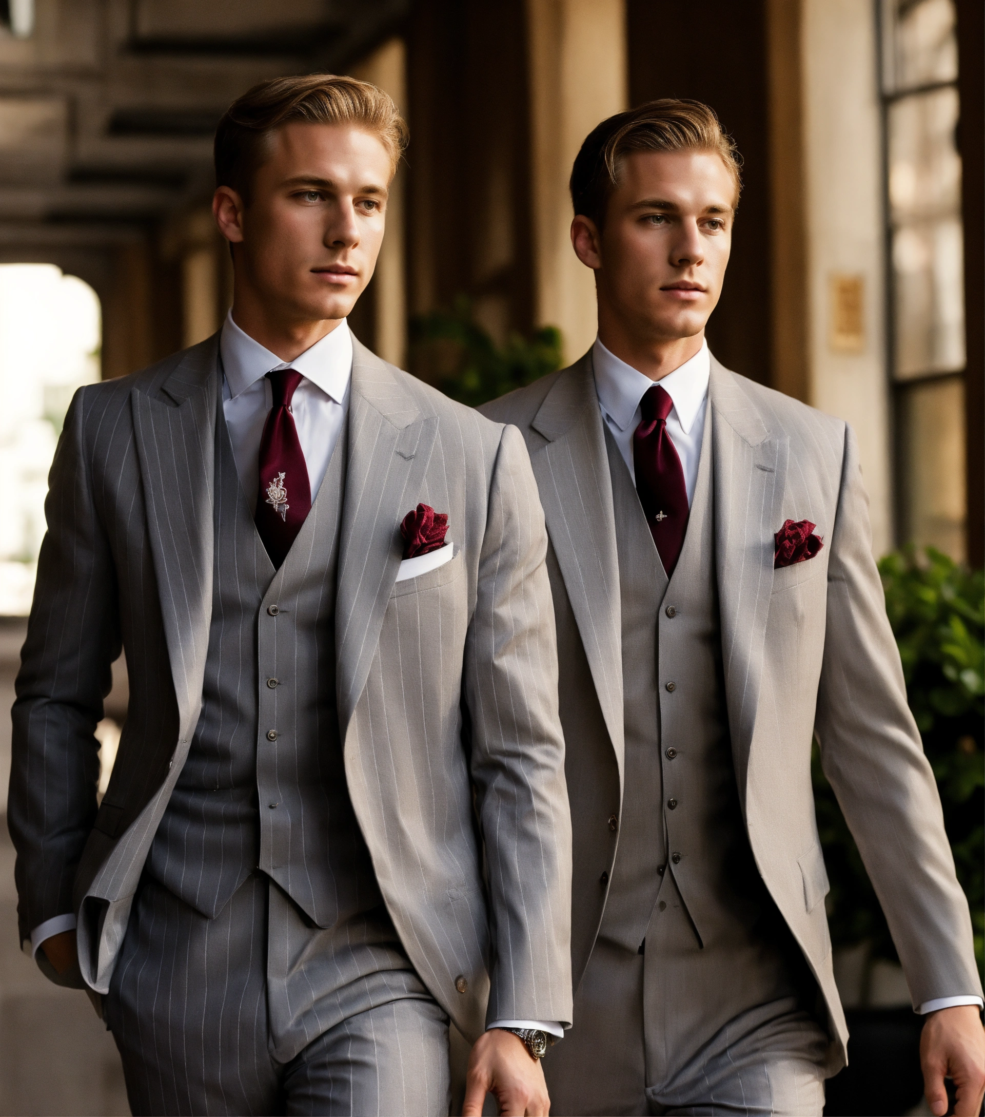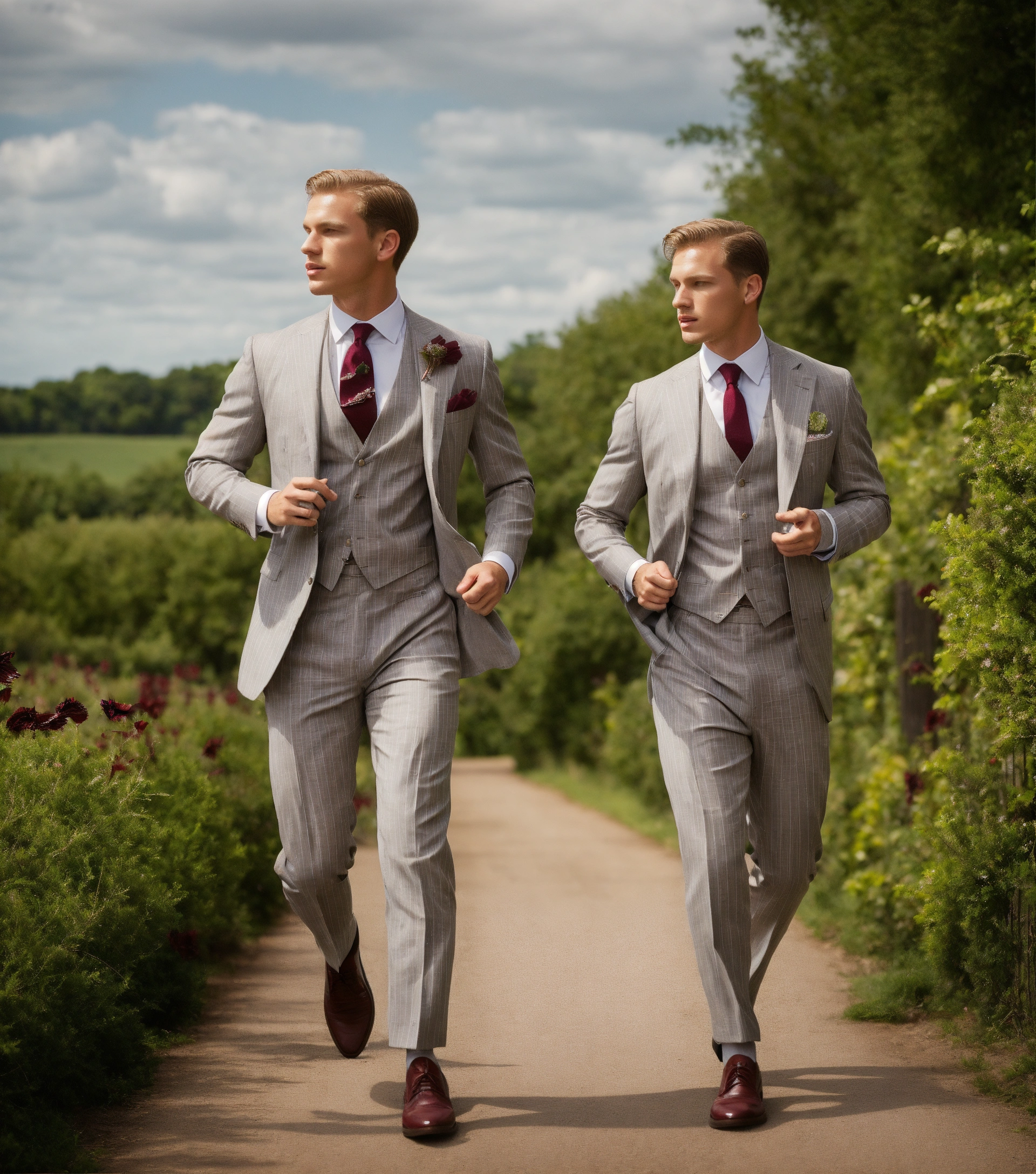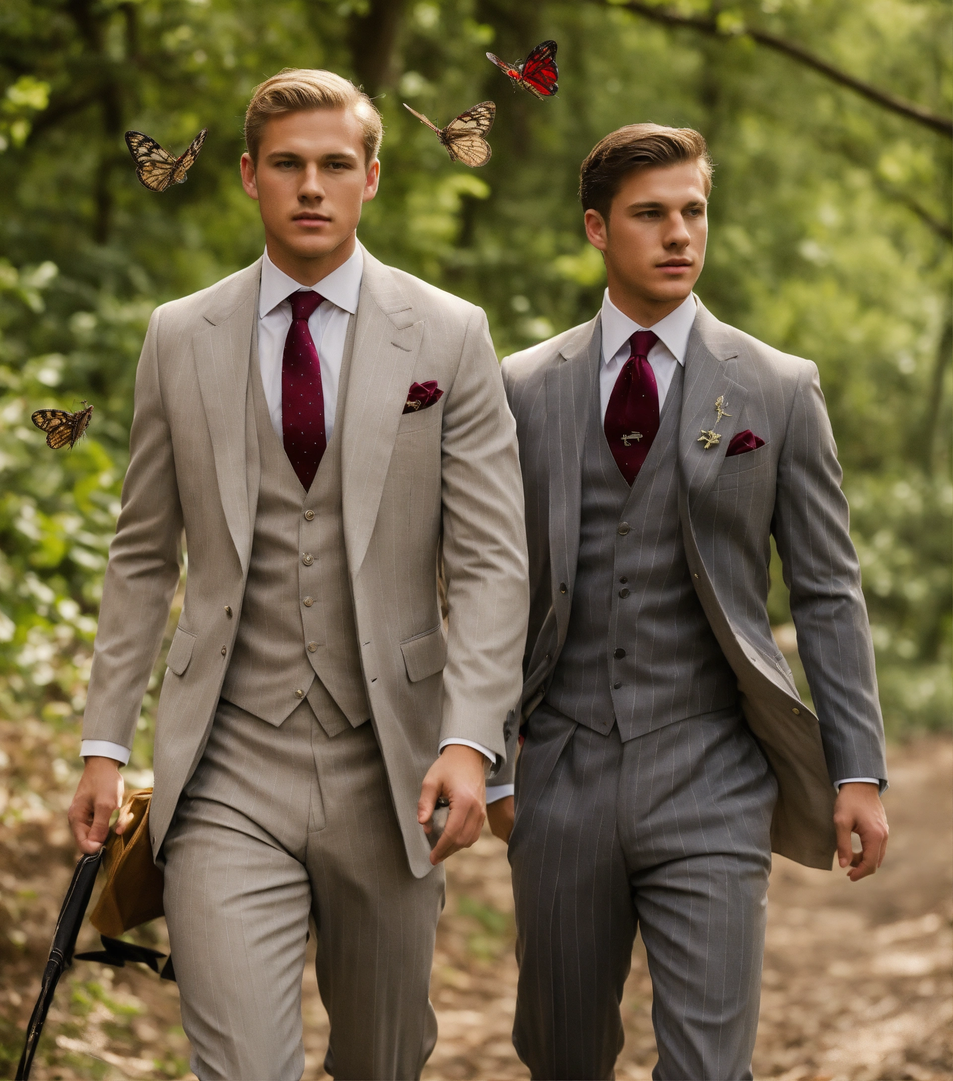 Two young blonde gentlemen in light grey pinstripe vested suit, burgundy club tie, chasing buterflies