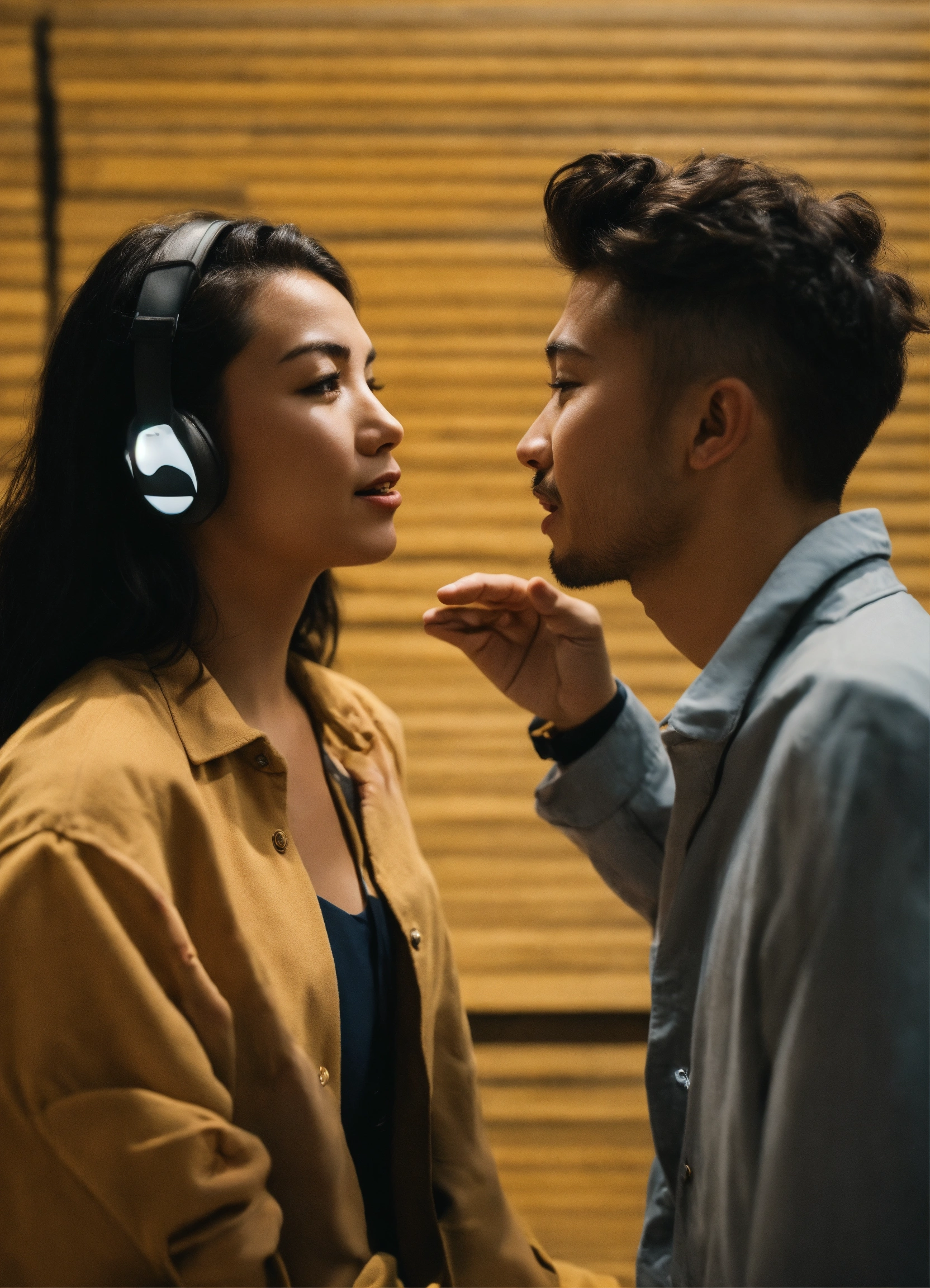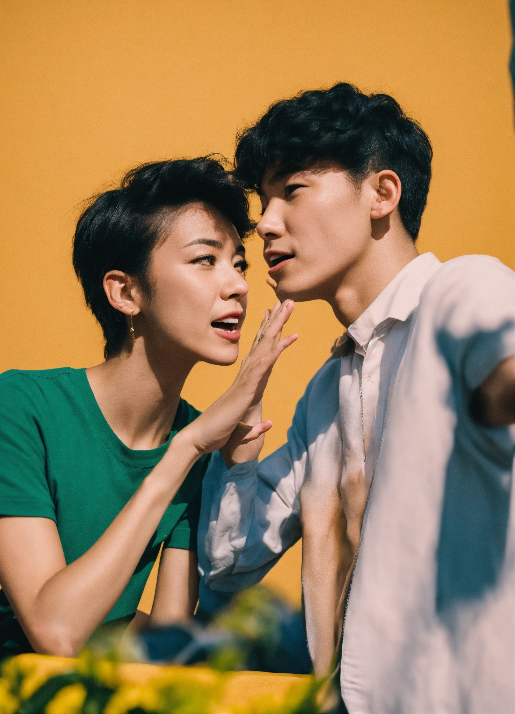 Two people using hand gestures and facial expressions to communicate without words