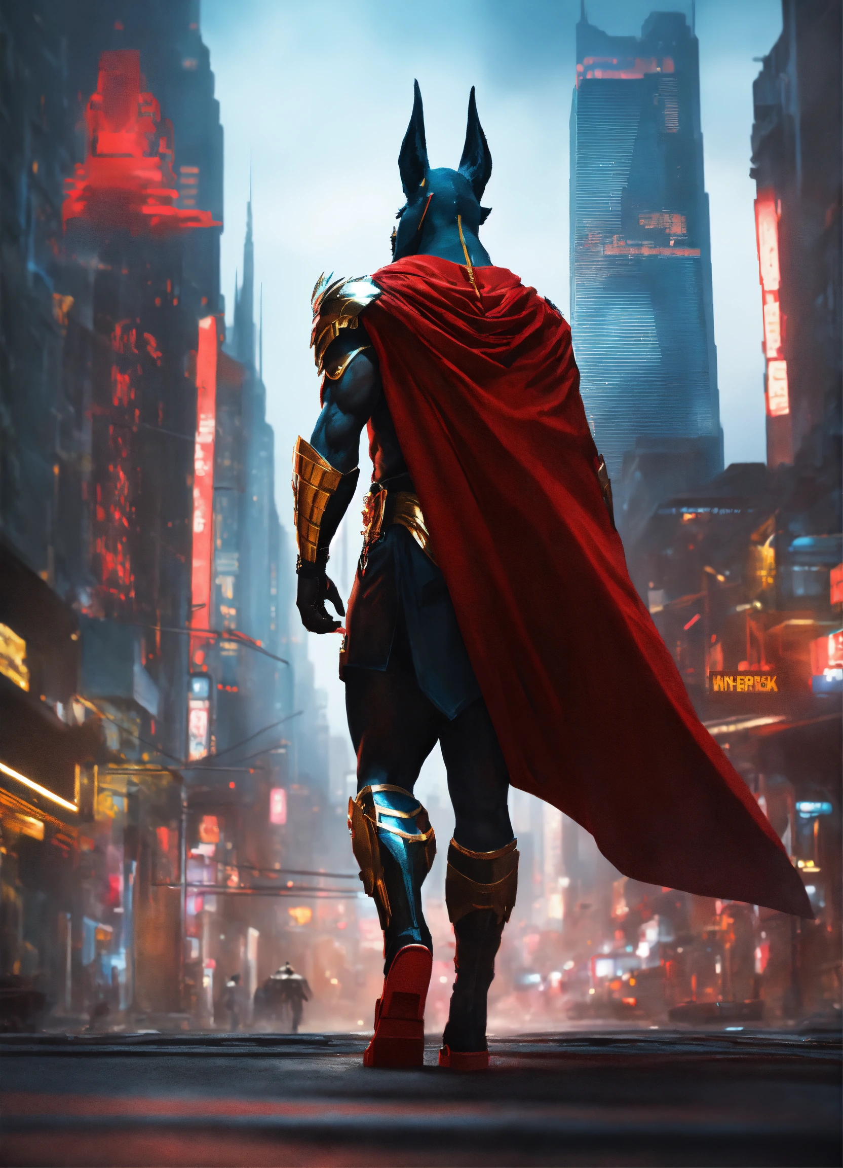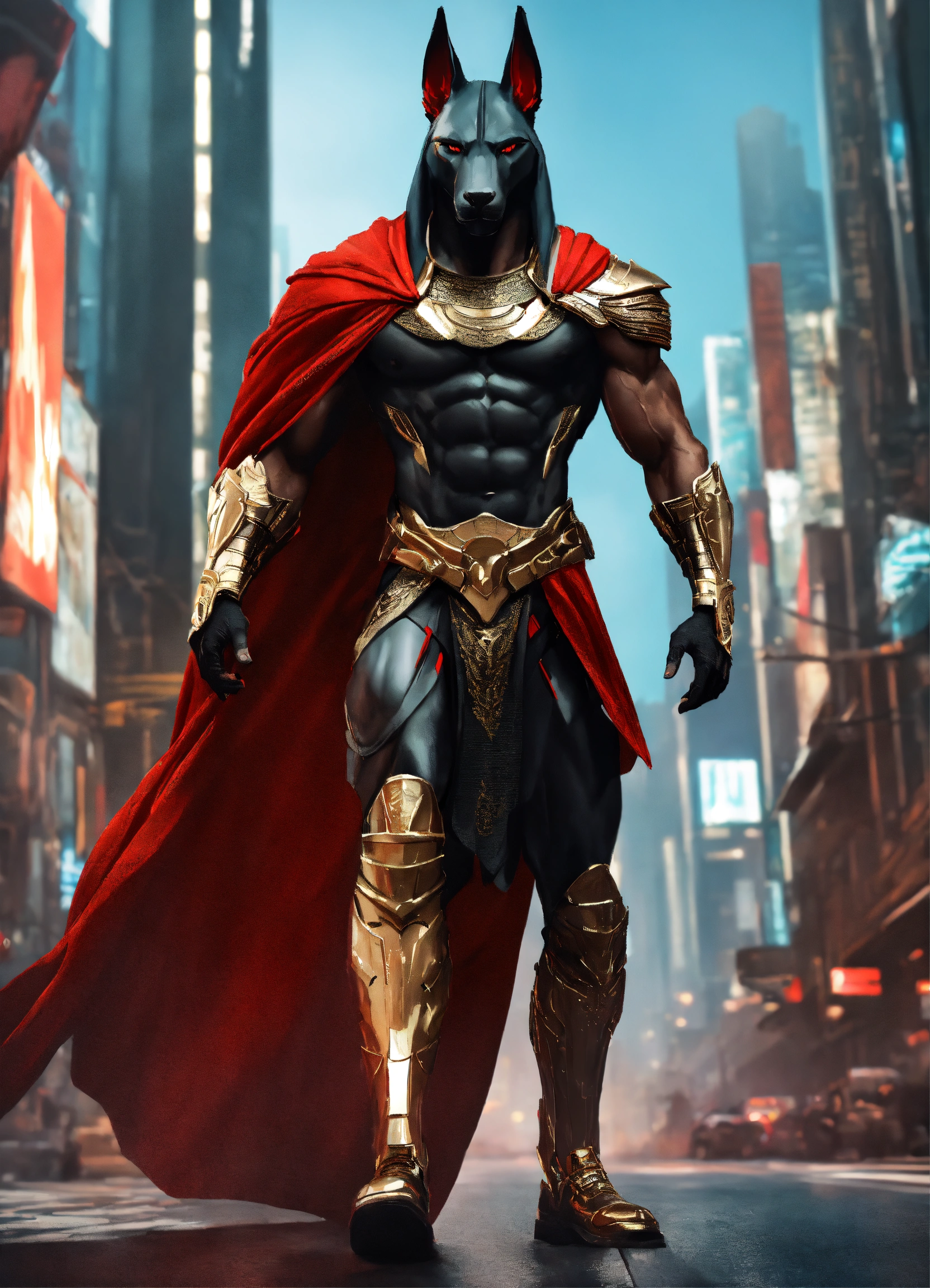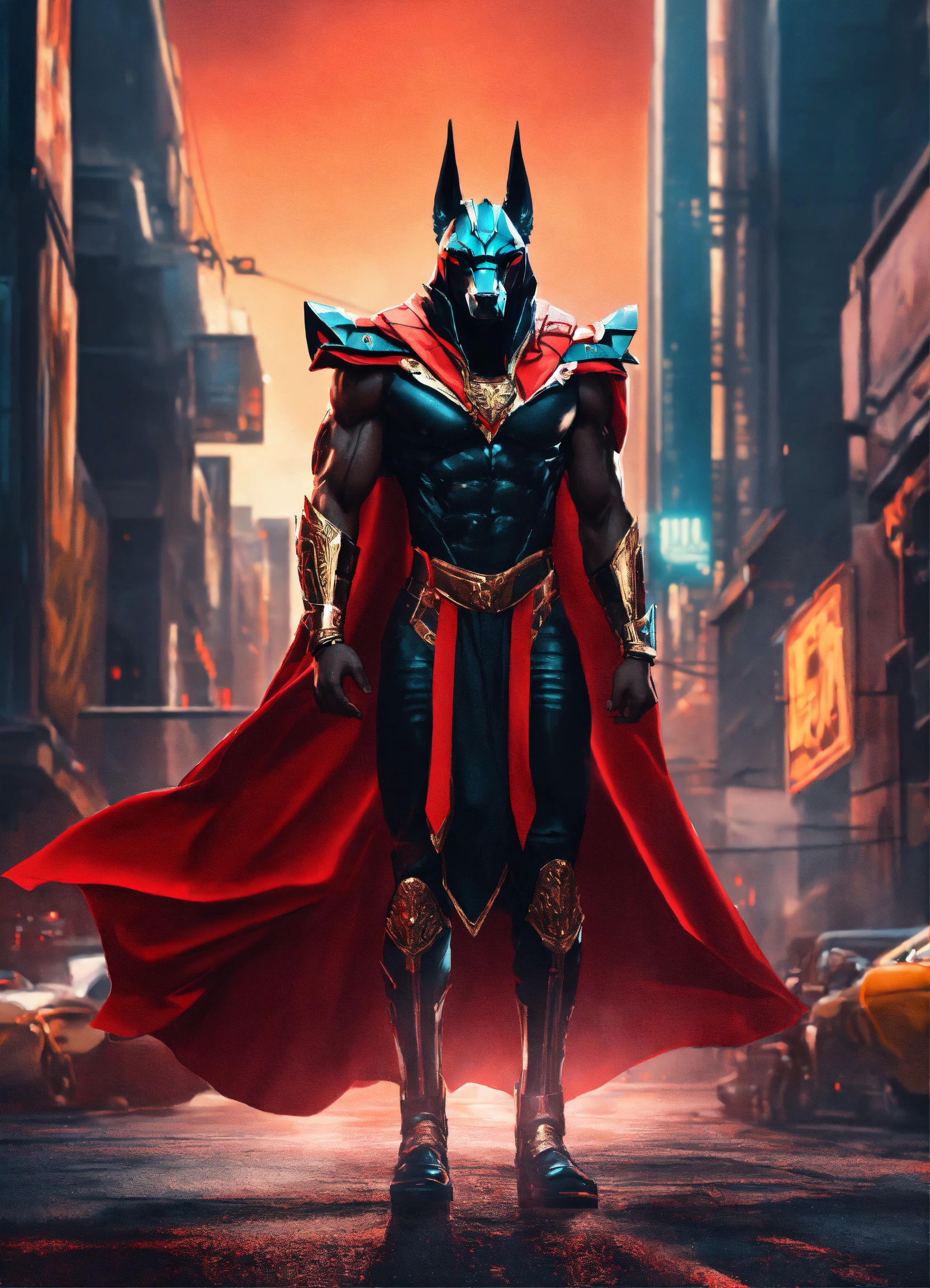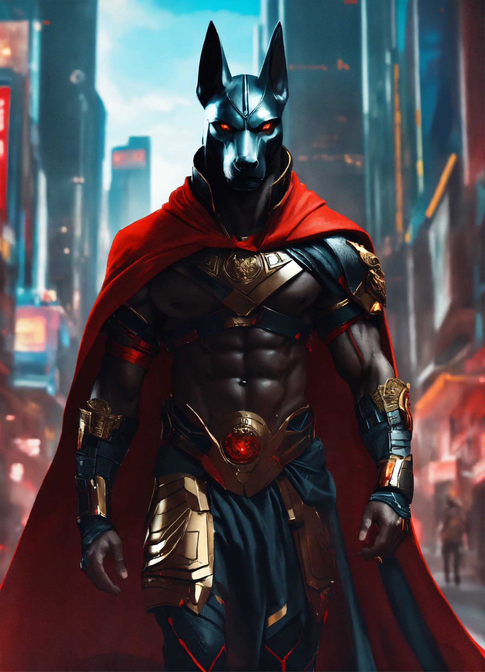 The strong tall muscular black man, the god anubis, muscular, terrifying, wearing black and red armor with a red cape walking in a futuristic cyberpunk city, high detail, realistic photo, high detail, digital painting, cinematic, stunning, hyper-realistic, sharp focus, high resolution 8k, insanely detailed
