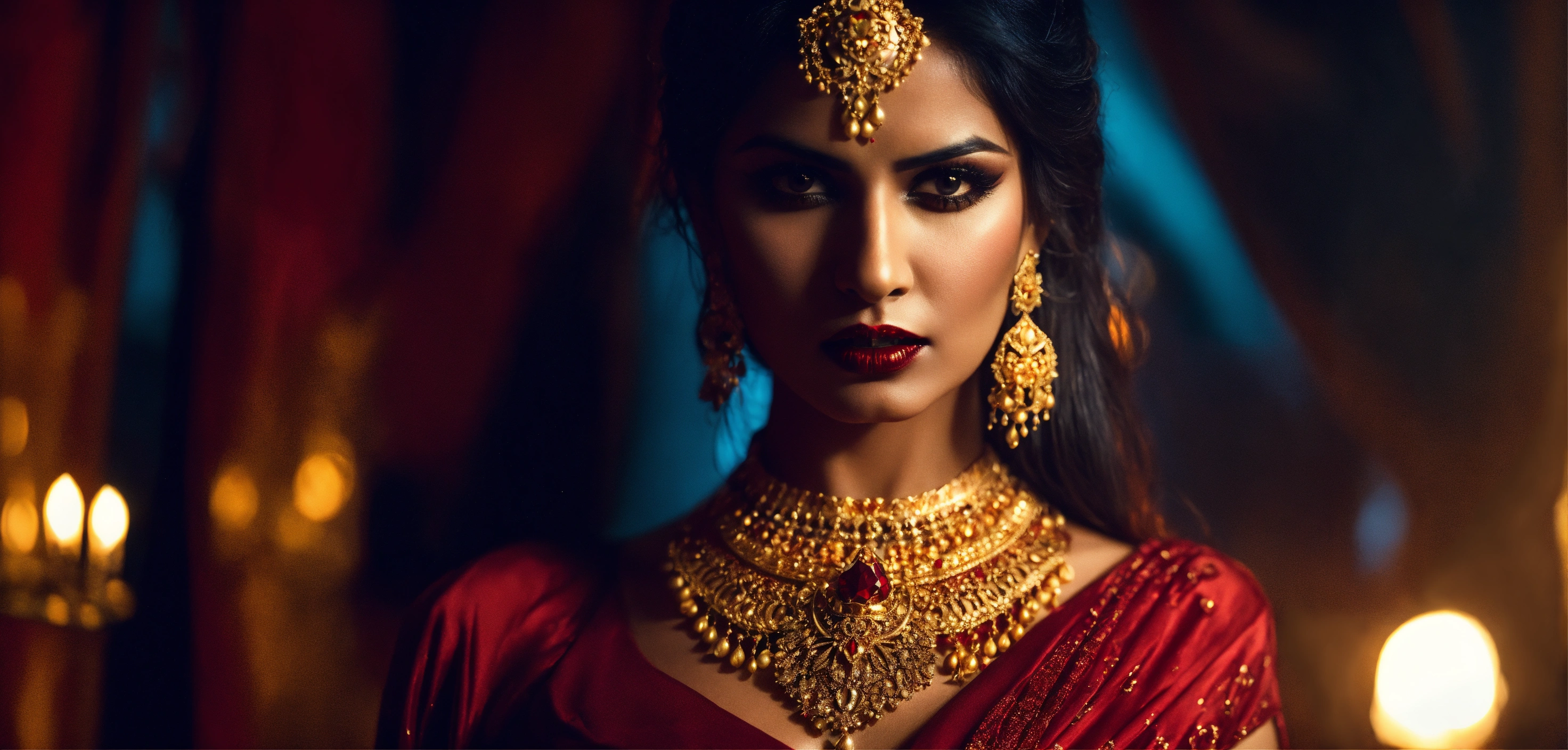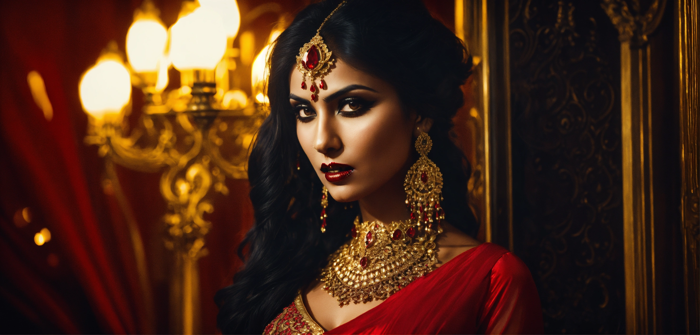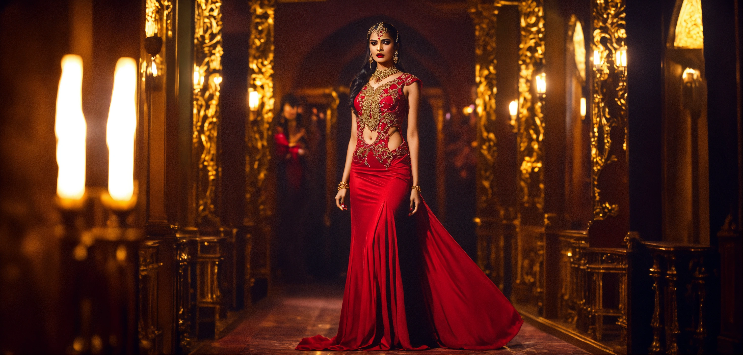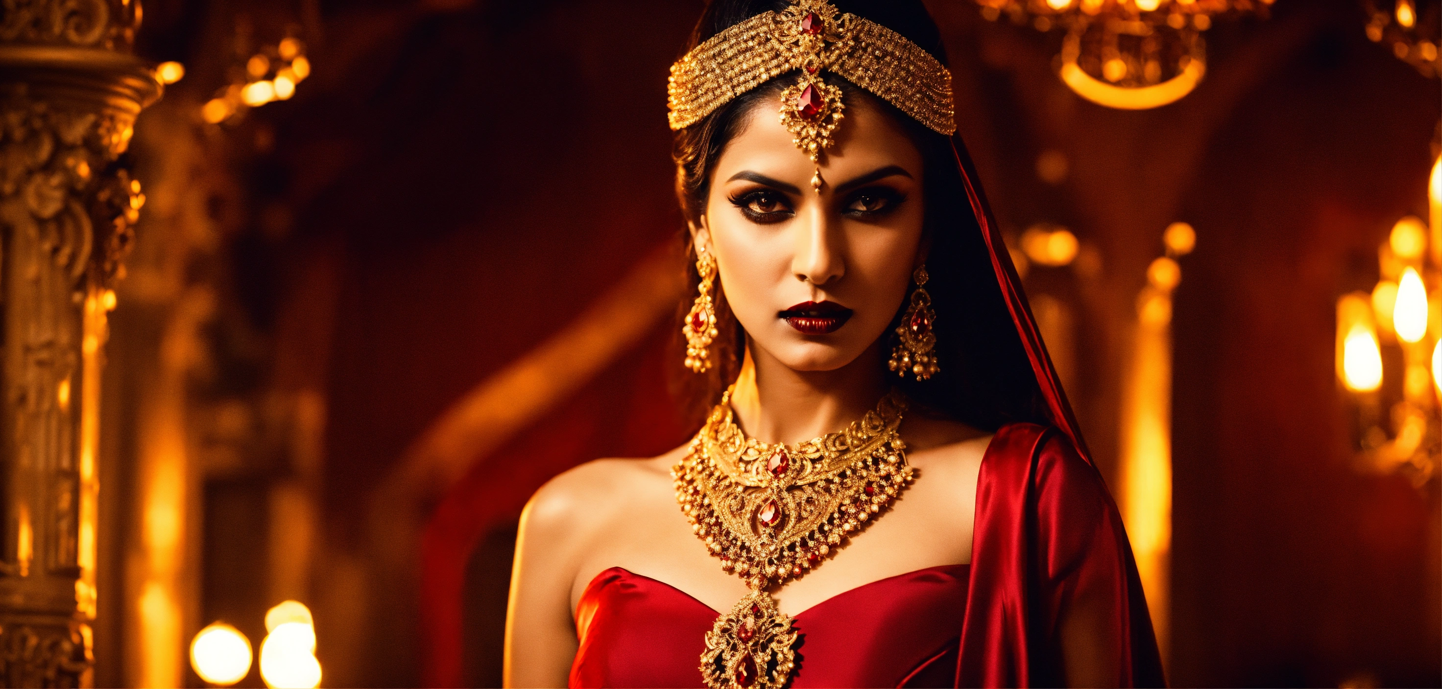 Cinematic look, stunning vampire female indian model, gallant crimson european designer evening dress, arrogant evil looking, golden jewelry, gothic night club, underworld vampire movie style