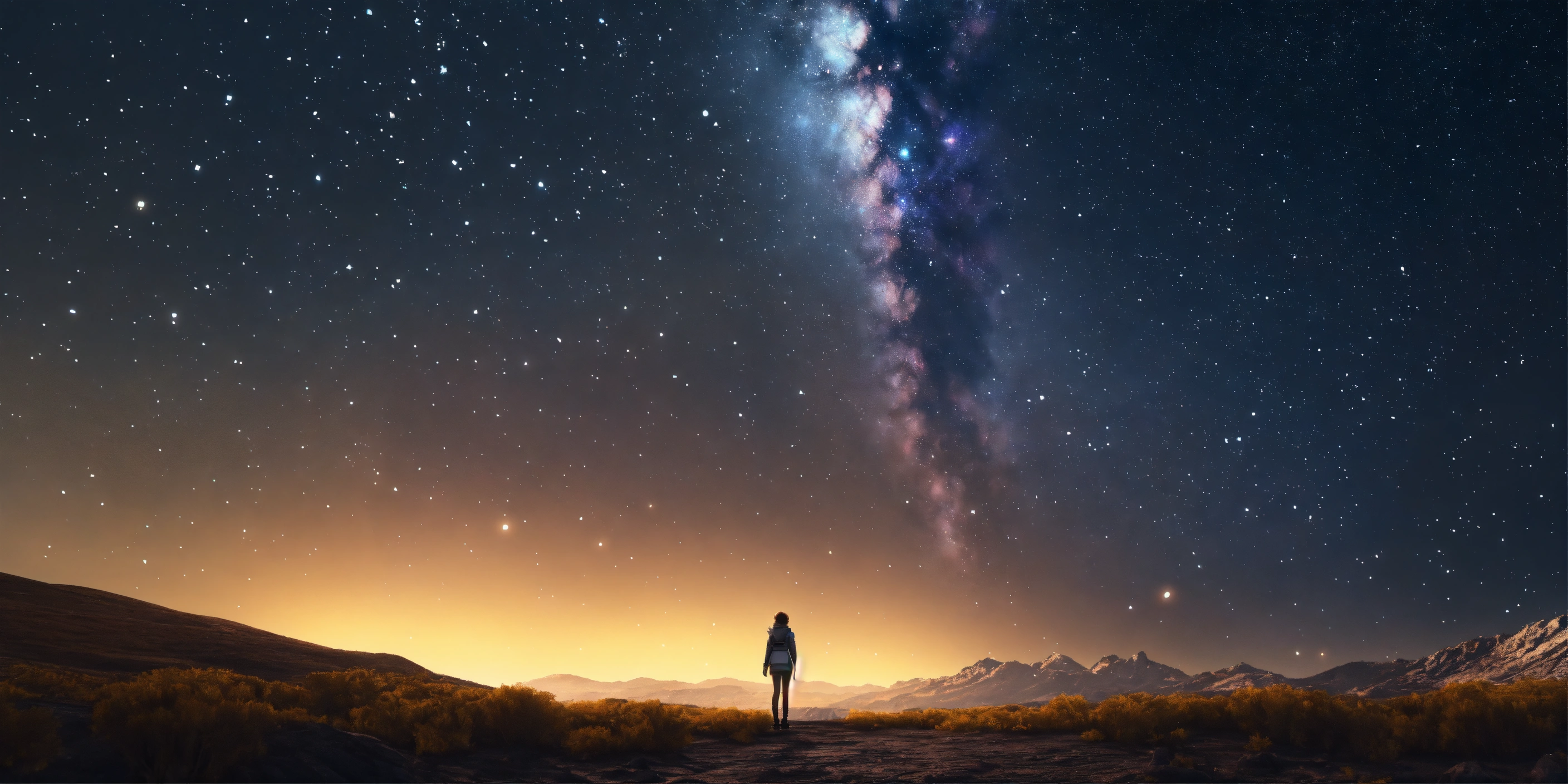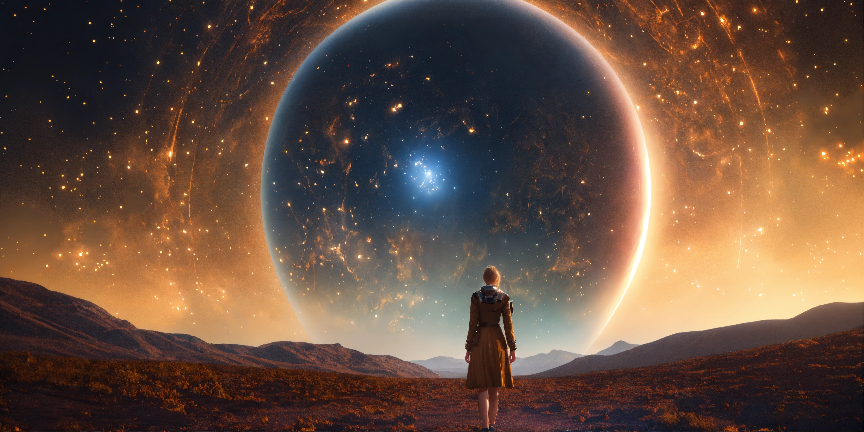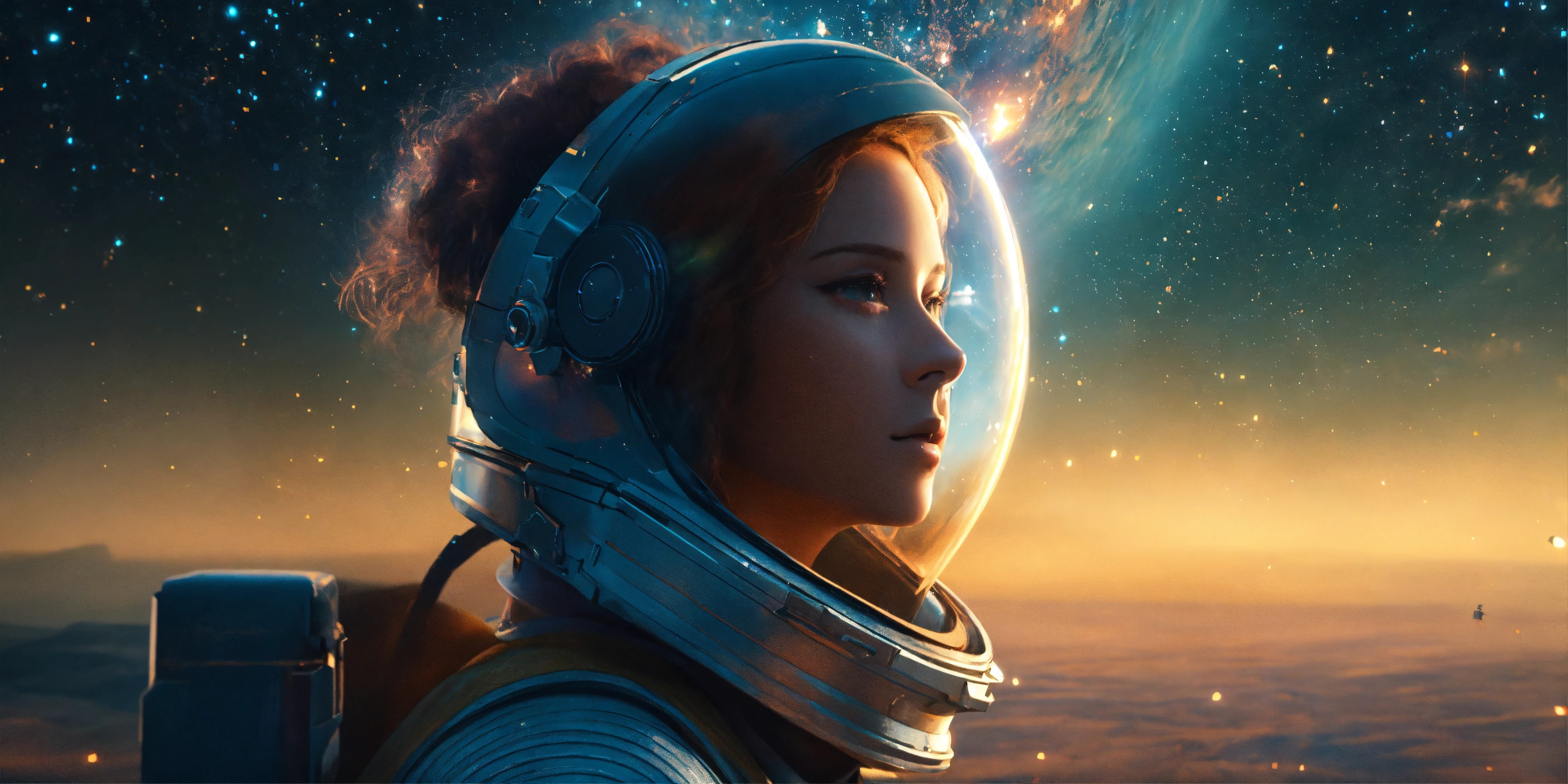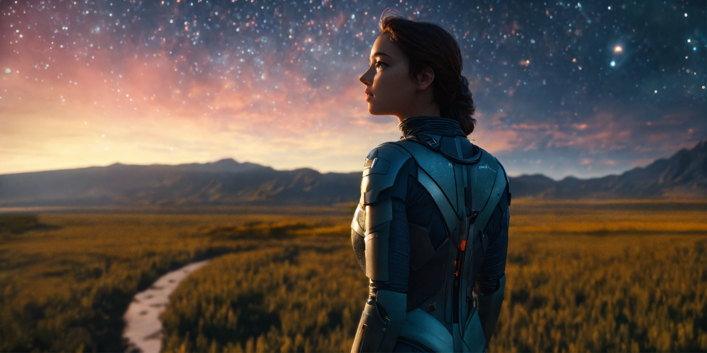 Stargazing through time and into the future, interstellar, poignant, moving, bittersweet, technological advancement, god as human singularity, woman high resolution 4k render, cinematic, atmospheric, vibey, high quality 3d ai art similar to high quality ai art generated by midjourney