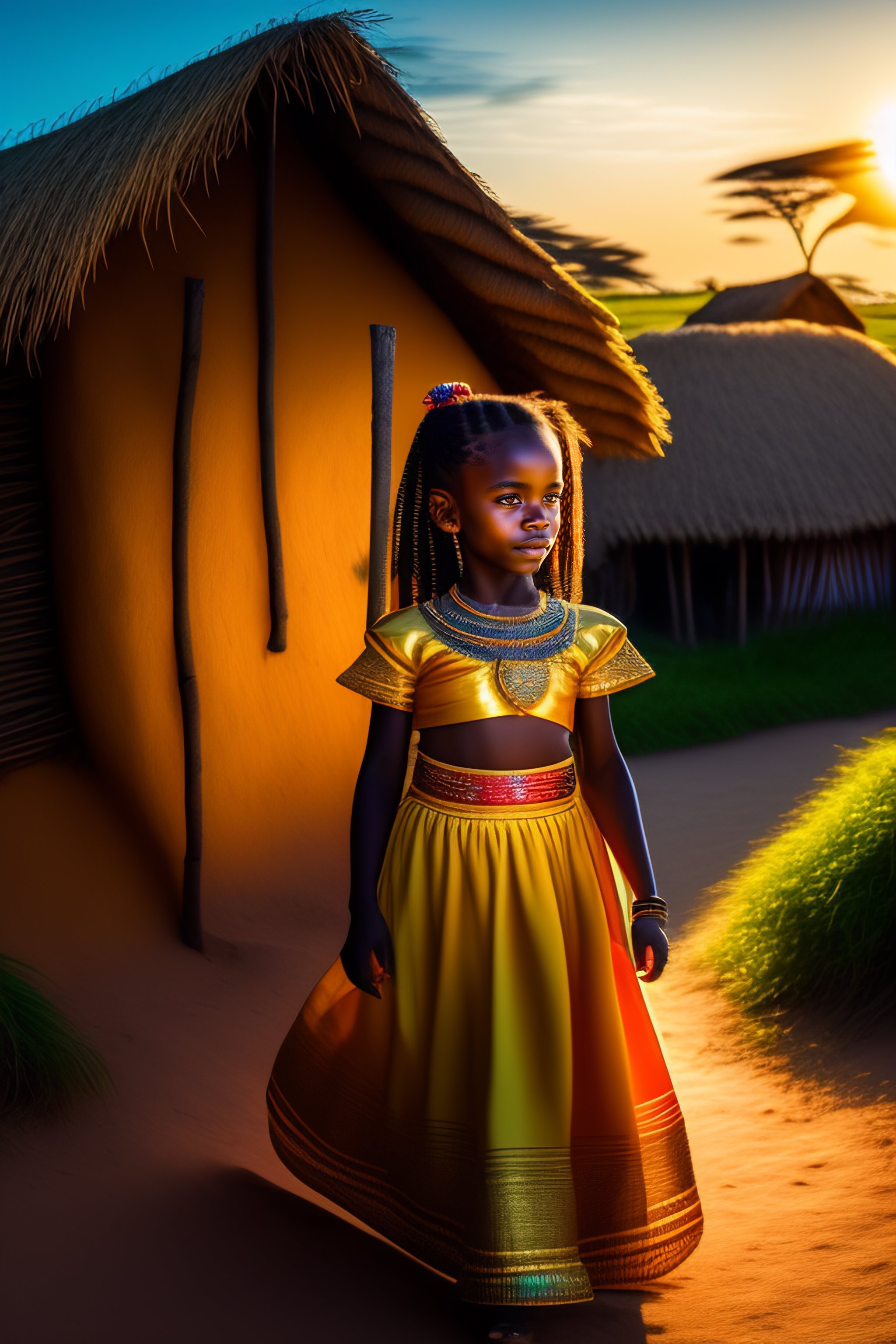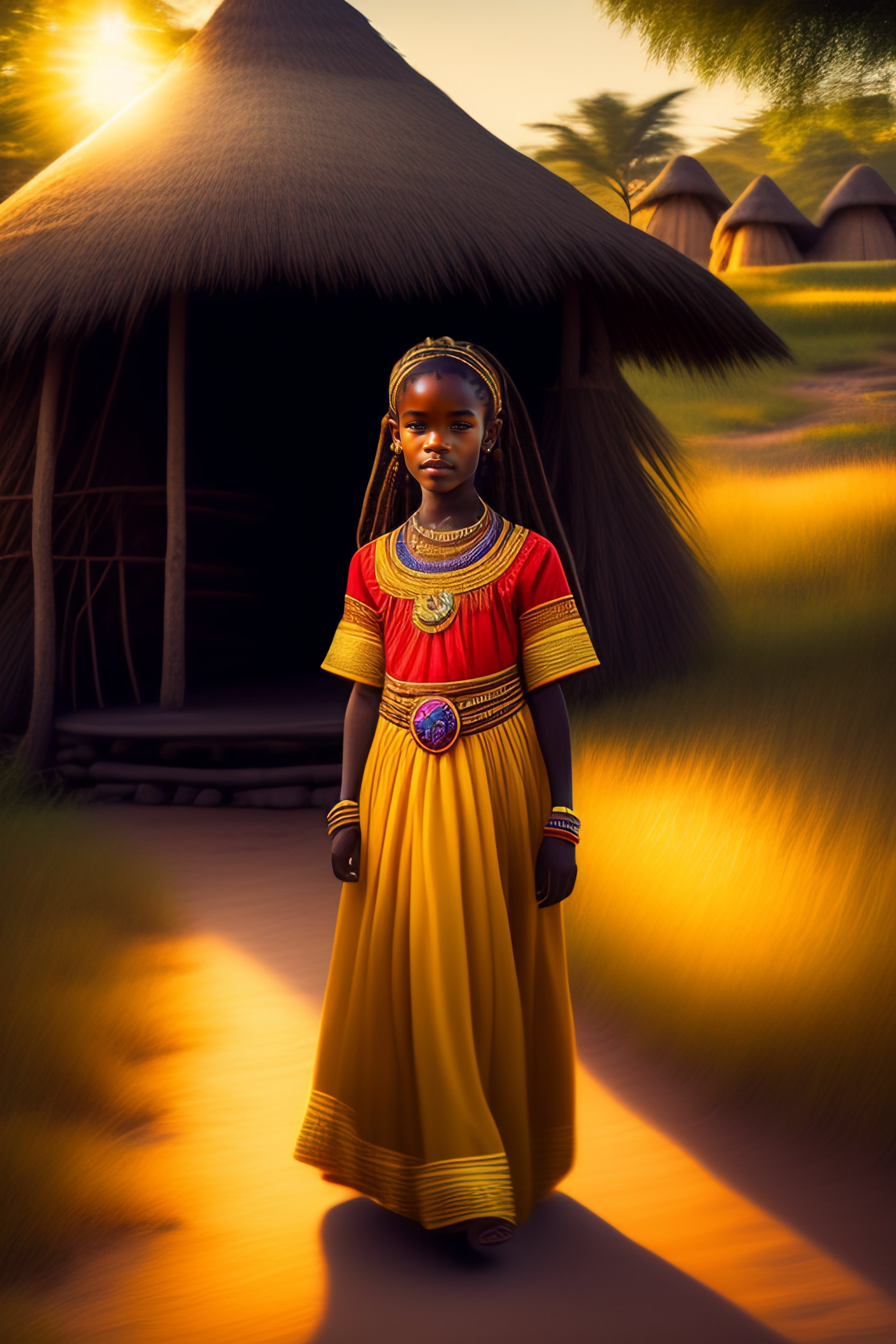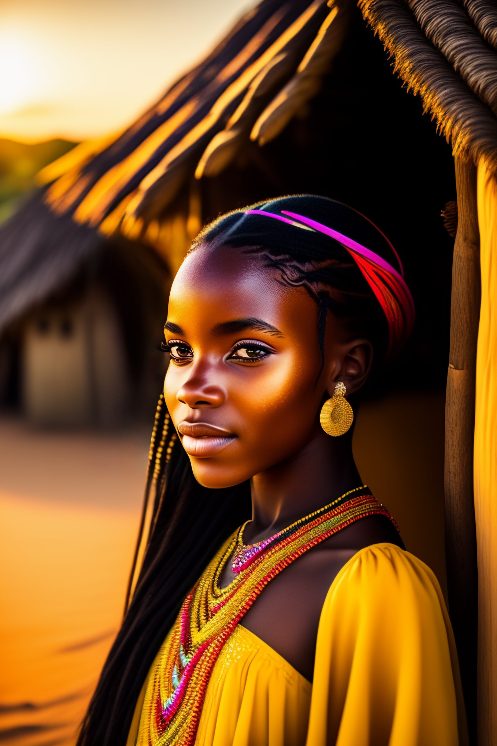 As the sun began to set on the small village, a beautiful african girl emerged from the thatched hut. she wore a flowing dress of bright yellow fabric that caught the light and seemed to glow in the golden evening light. the dress was adorned with intricate beadwork, sparkling and shimmering as she walked. her long, dark hair was braided and decorated with colorful ribbons, and her skin glowed with the warmth of the sun. she moved gracefully, a picture of elegance and beauty, as she made her way towards the center of the village. all eyes were drawn to her, captivated by her charm and radiance. she was a true sight to behold, standing tall and proud in front of the humble hut that was her home.