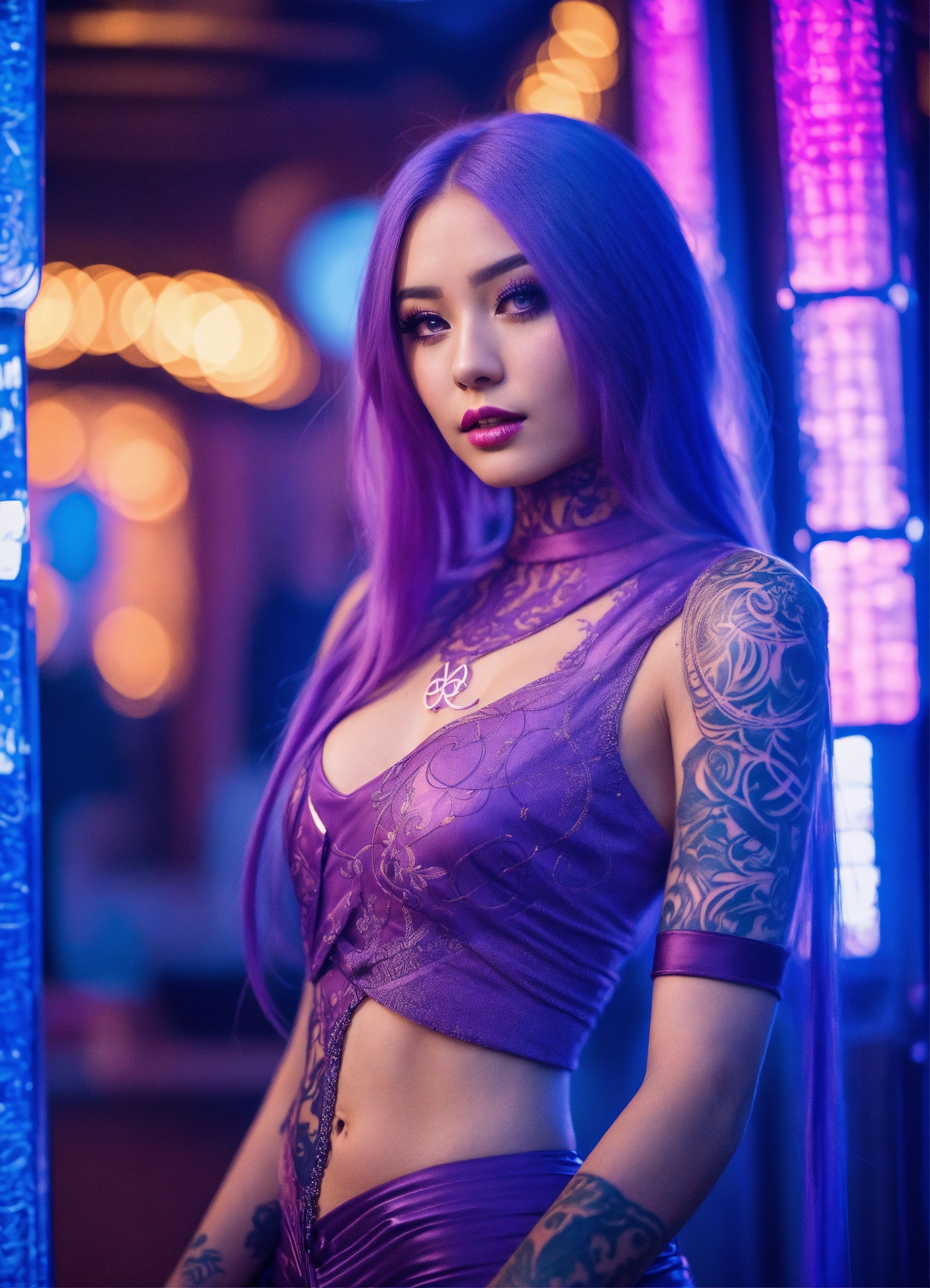 A beautiful long violet hair girl all violet sleek futuristic outfit, with tatoo, short skirt intricate patterns and infinity symbol, details, design, clean makeup, with depth of field, fantastical edgy and regal themed outfit, captured in vivid colors, embodying the essence of fantasy, minimalist, full body