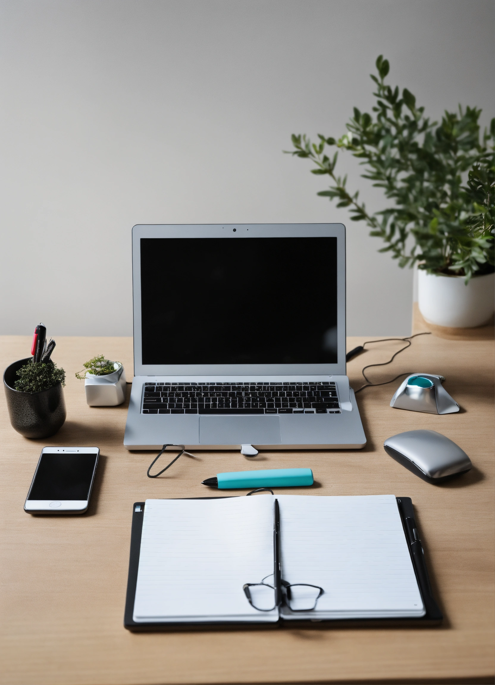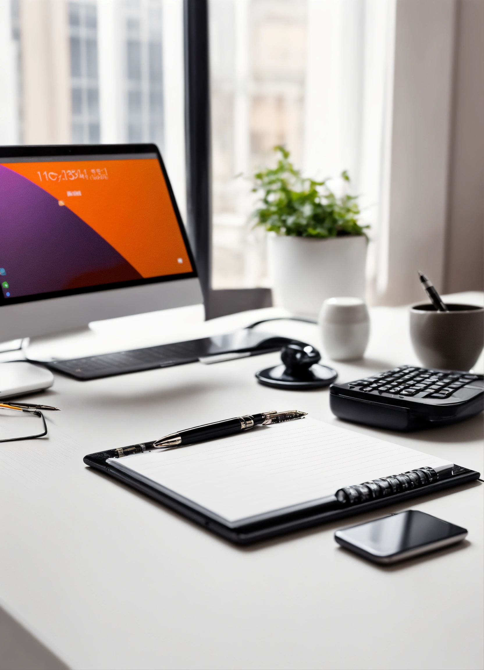 Desktop with computer notepad pen pen phone and similar attributes, horizontal view, minimalist style, on white background