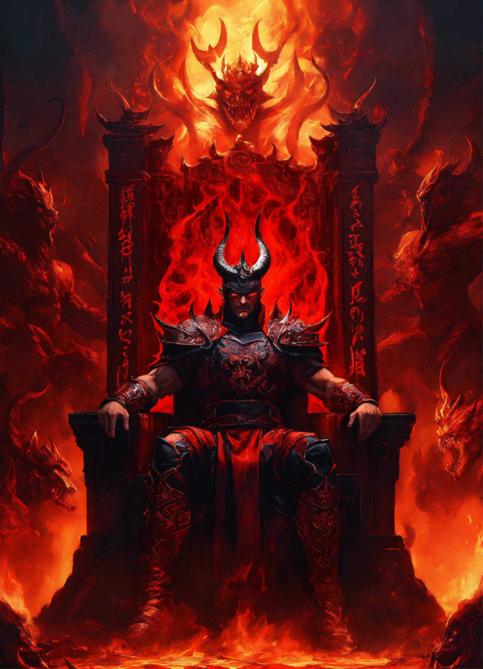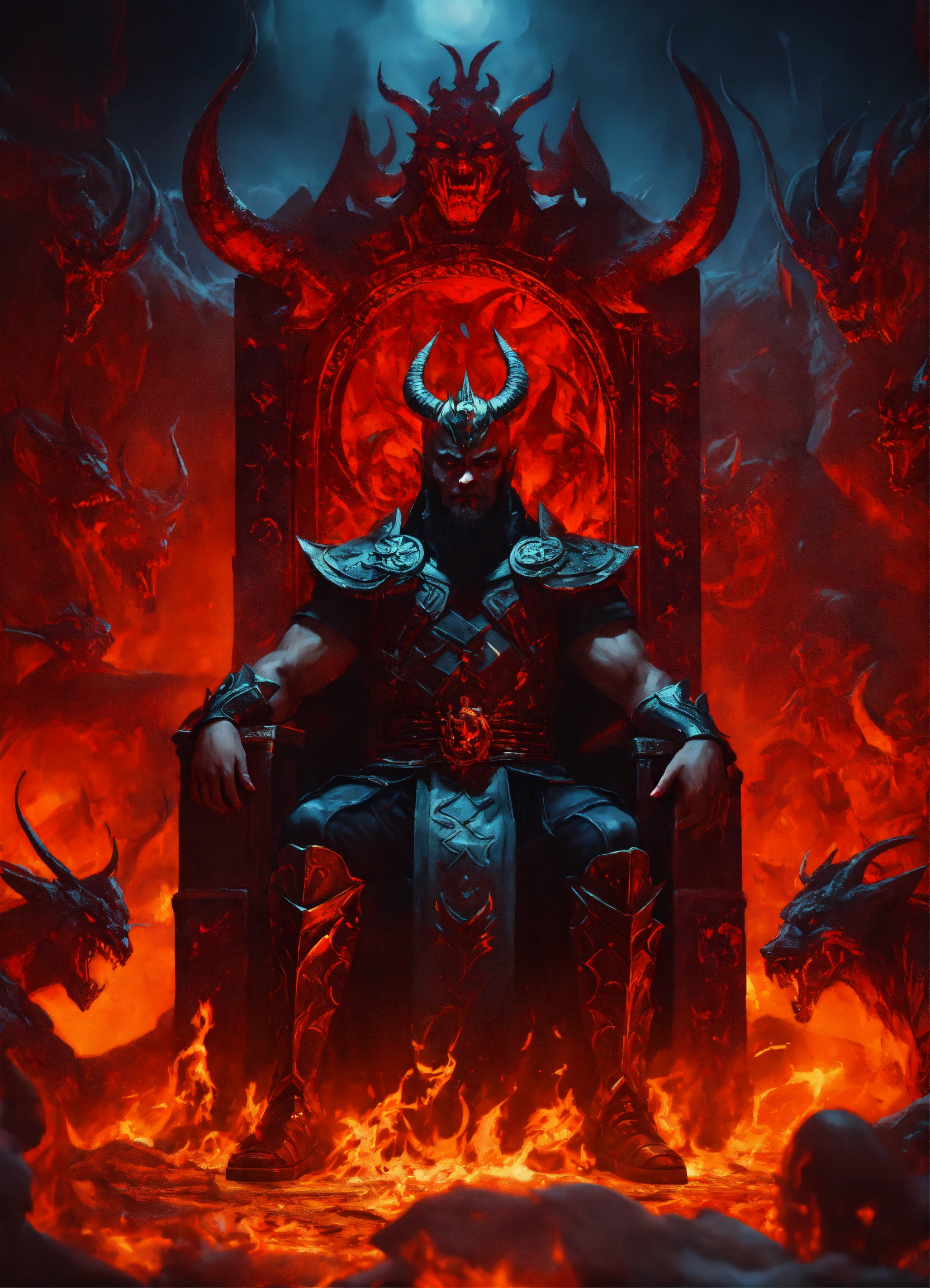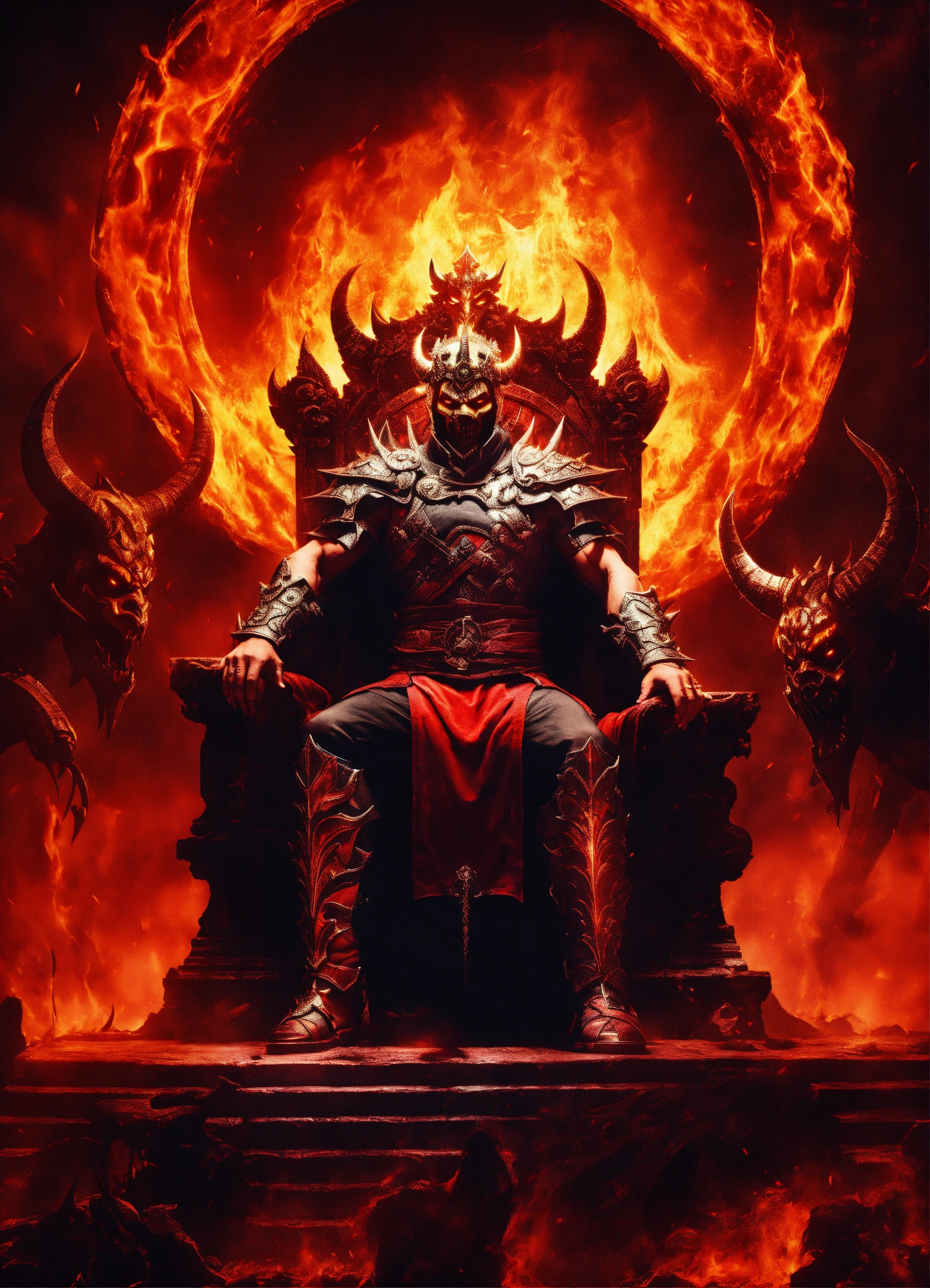 Demon king sitting on a throne in hell, surrounded by 7 demon generals, scary vibes, bright image, mortal kombat theme