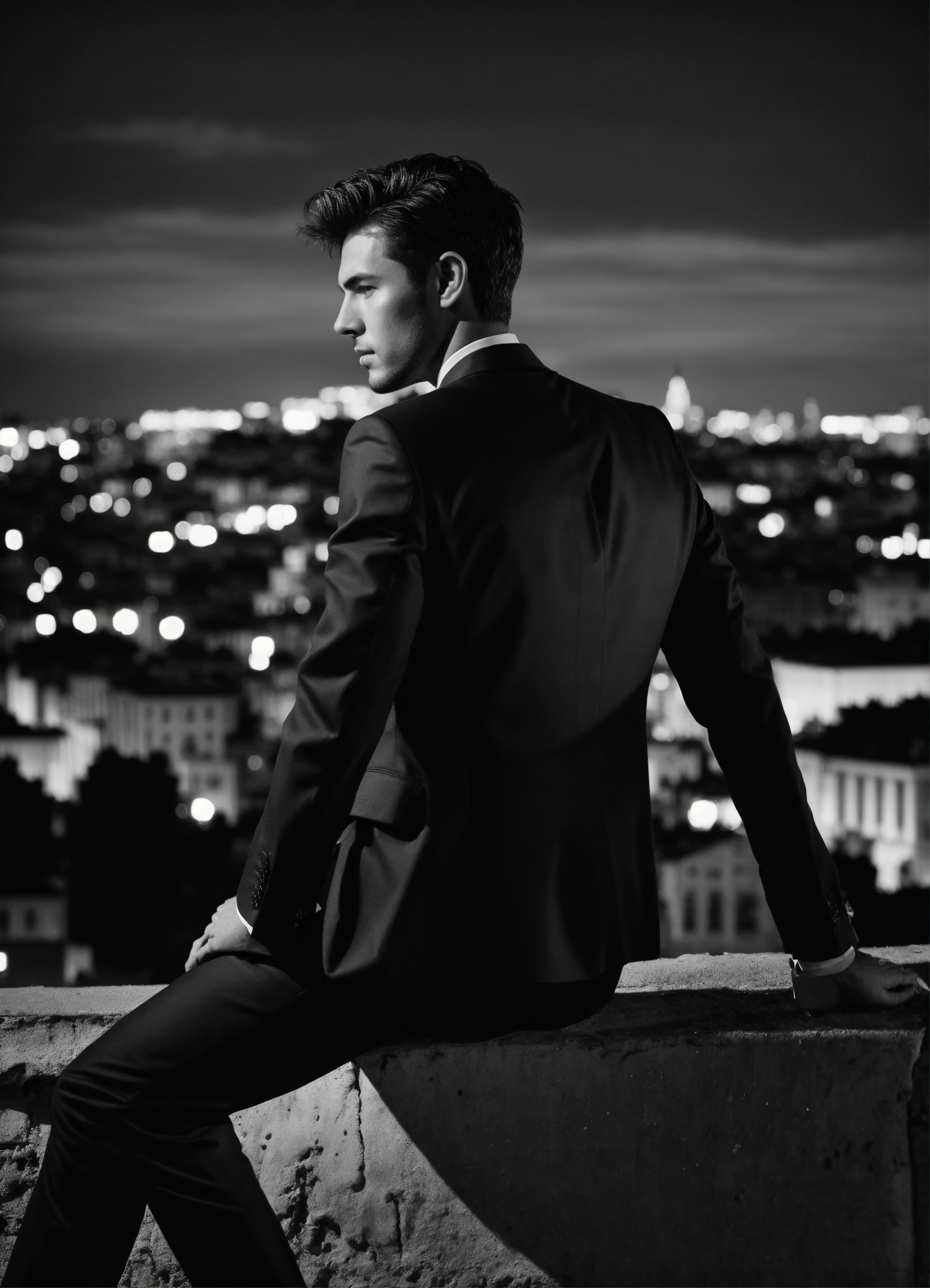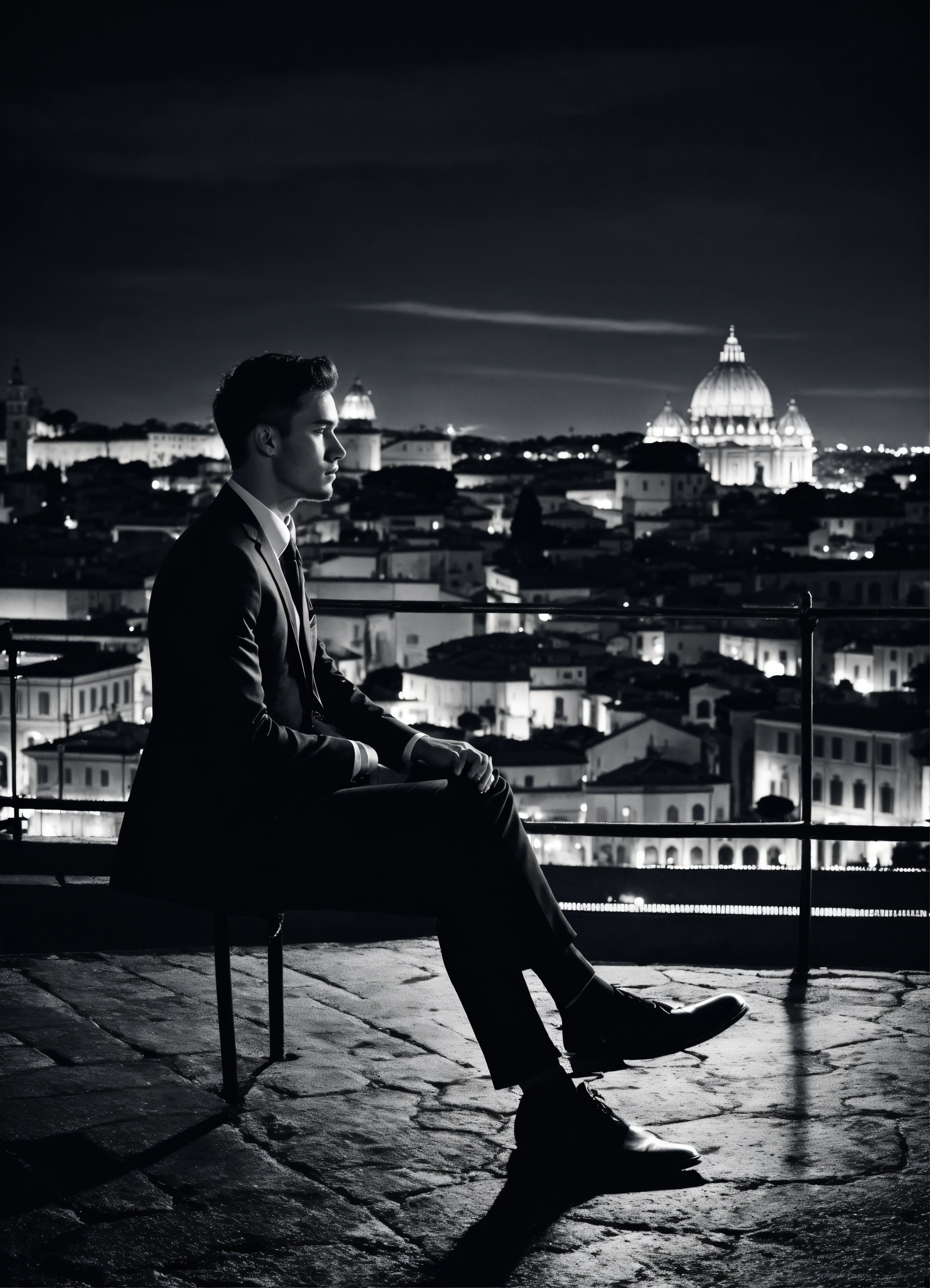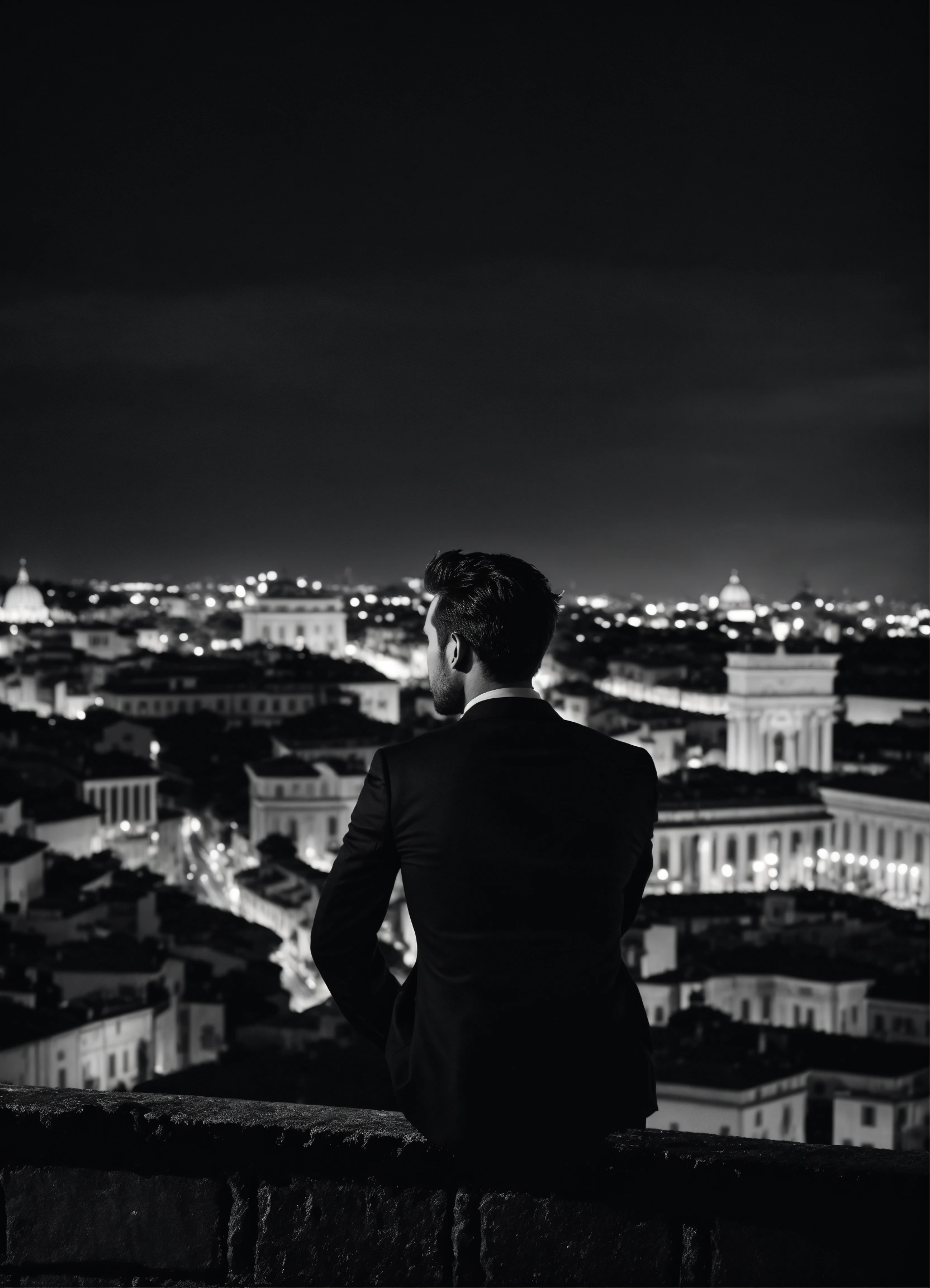 Photo of a model oneman with shortdark hair in passion sitting, head over shoulder looking into camera, in front of the skyline of rome head left looking in the camera in full view at night as background black and white, realistic, portrait, not painted, very detailed faces, skin with pores, 4k, dark suit, skin not smoothed, looking into the camera, dark shirt. rome skyline in full view at night as background