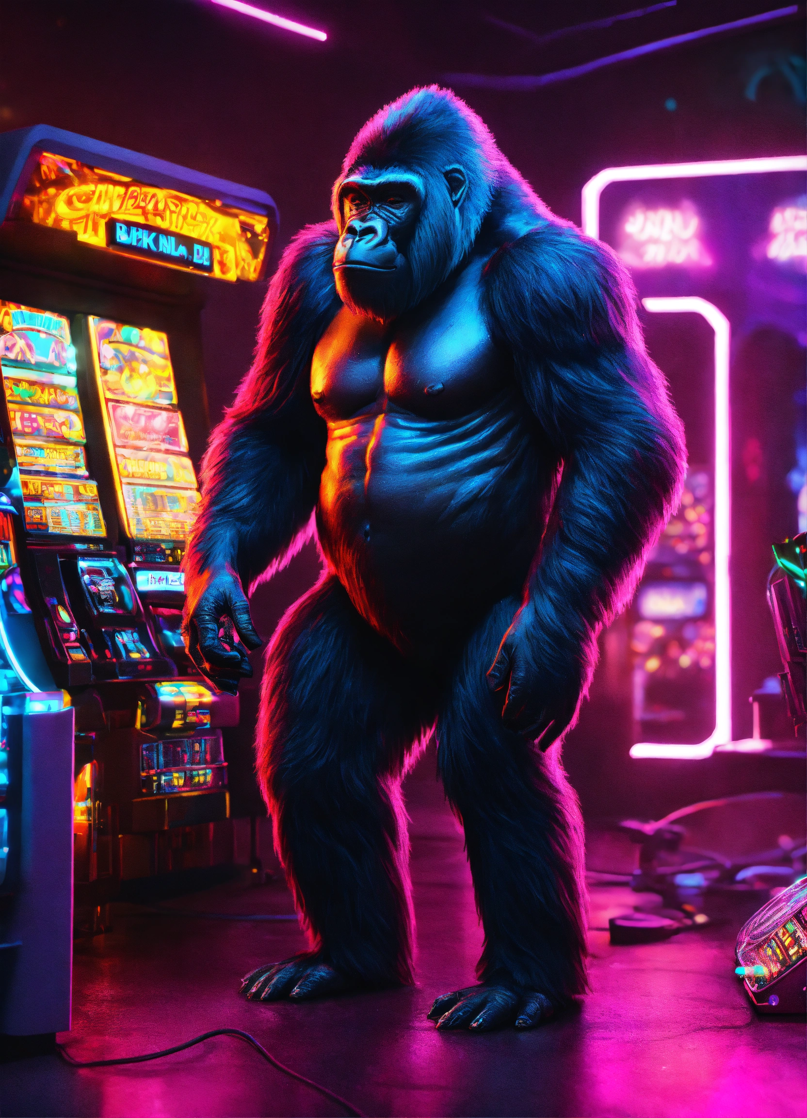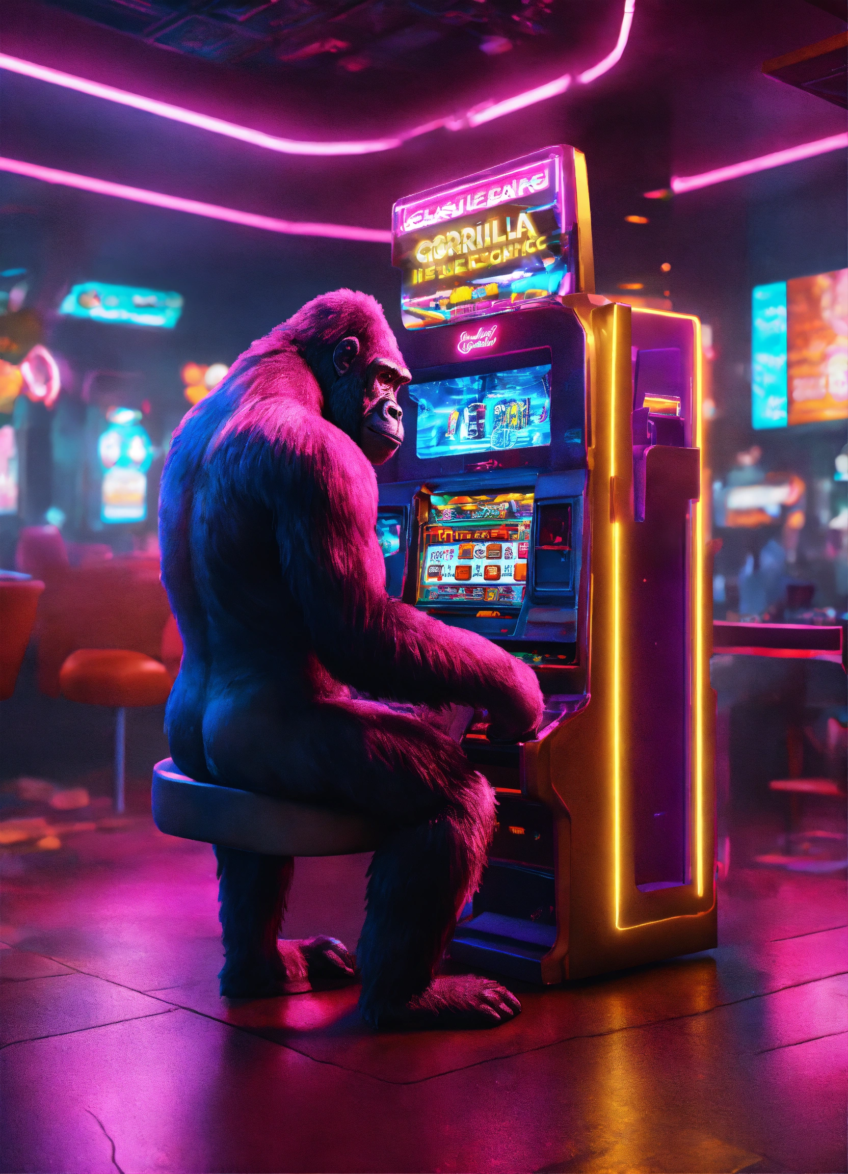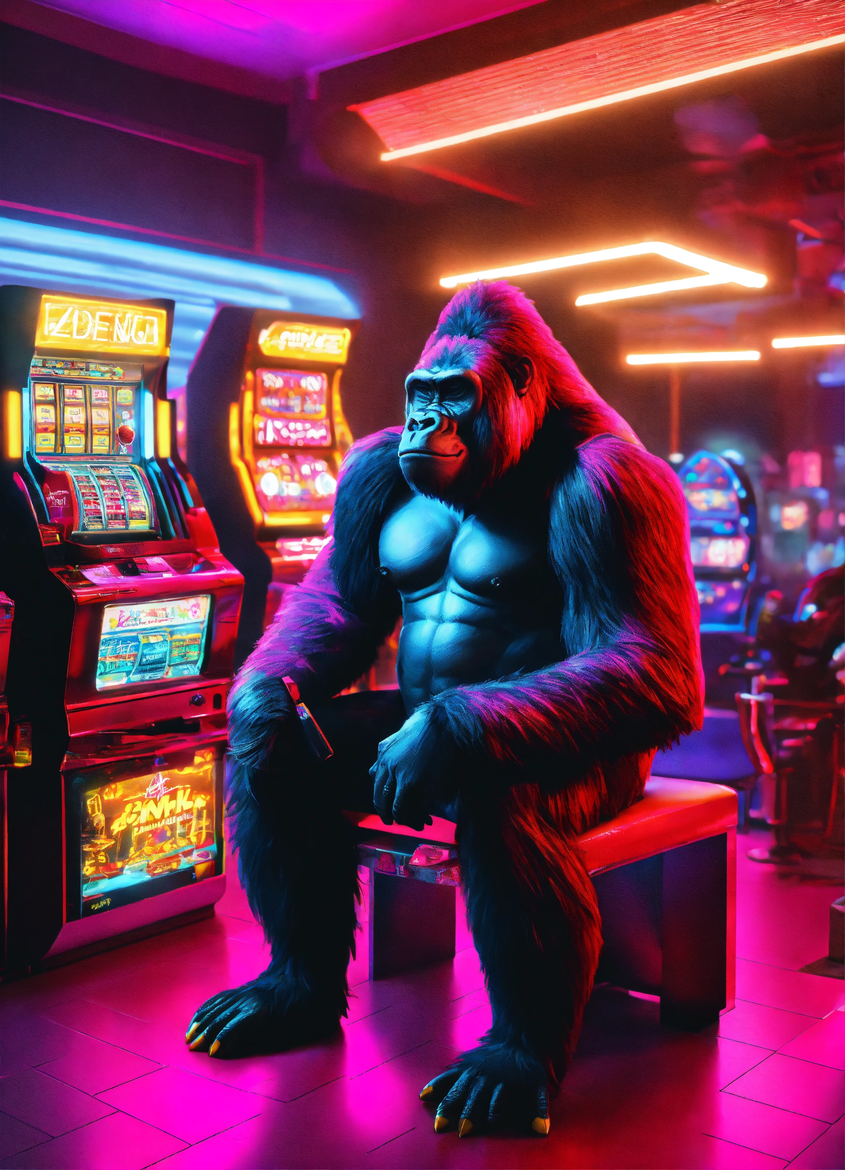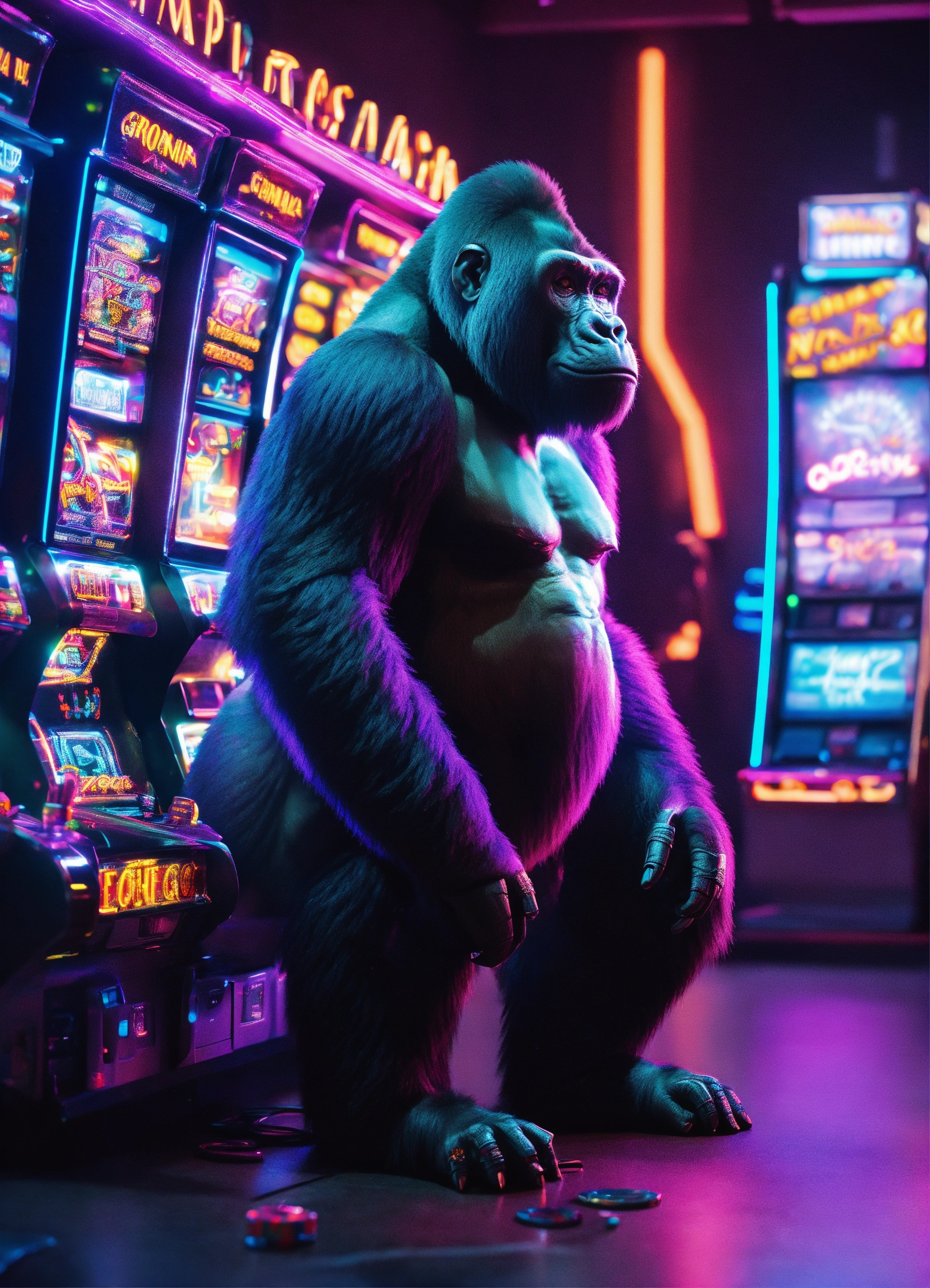 3d realistic gorilla futuristic with slot machine cyberpunk interior location