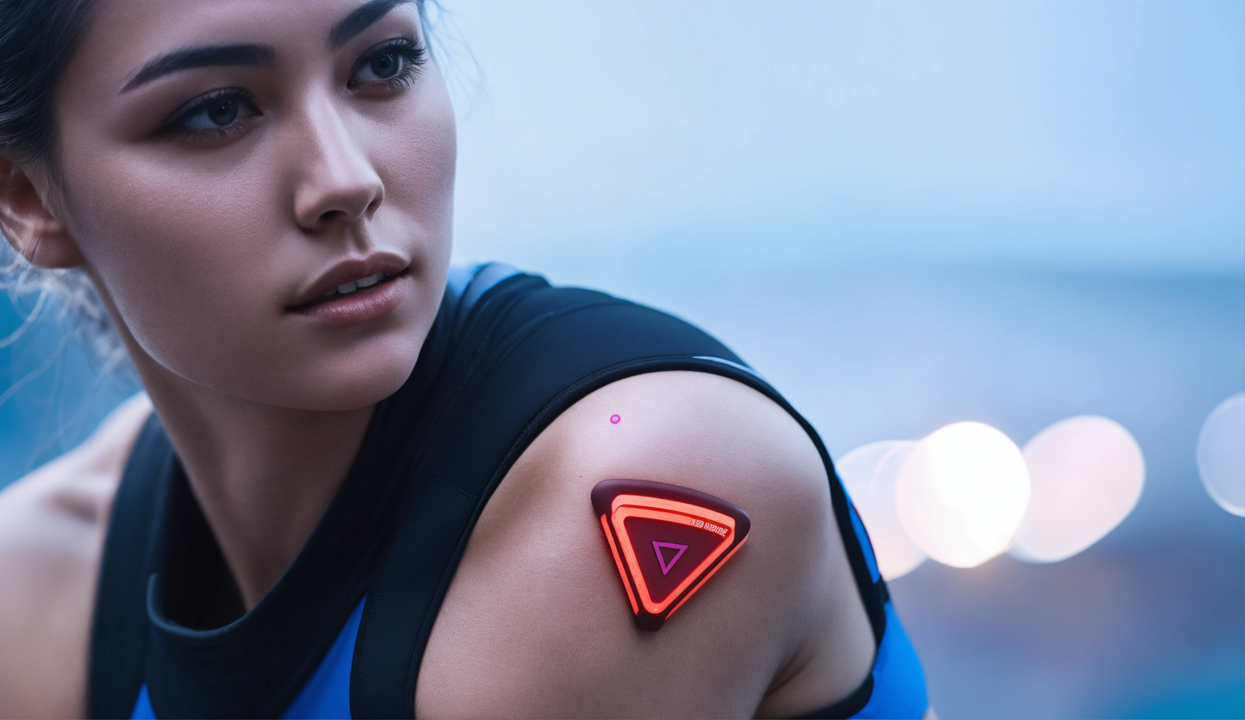 A triangular shaped fitness wearable technology device placed on the skin of the upper arm of a sports model, cinematic lighting advertising shot
