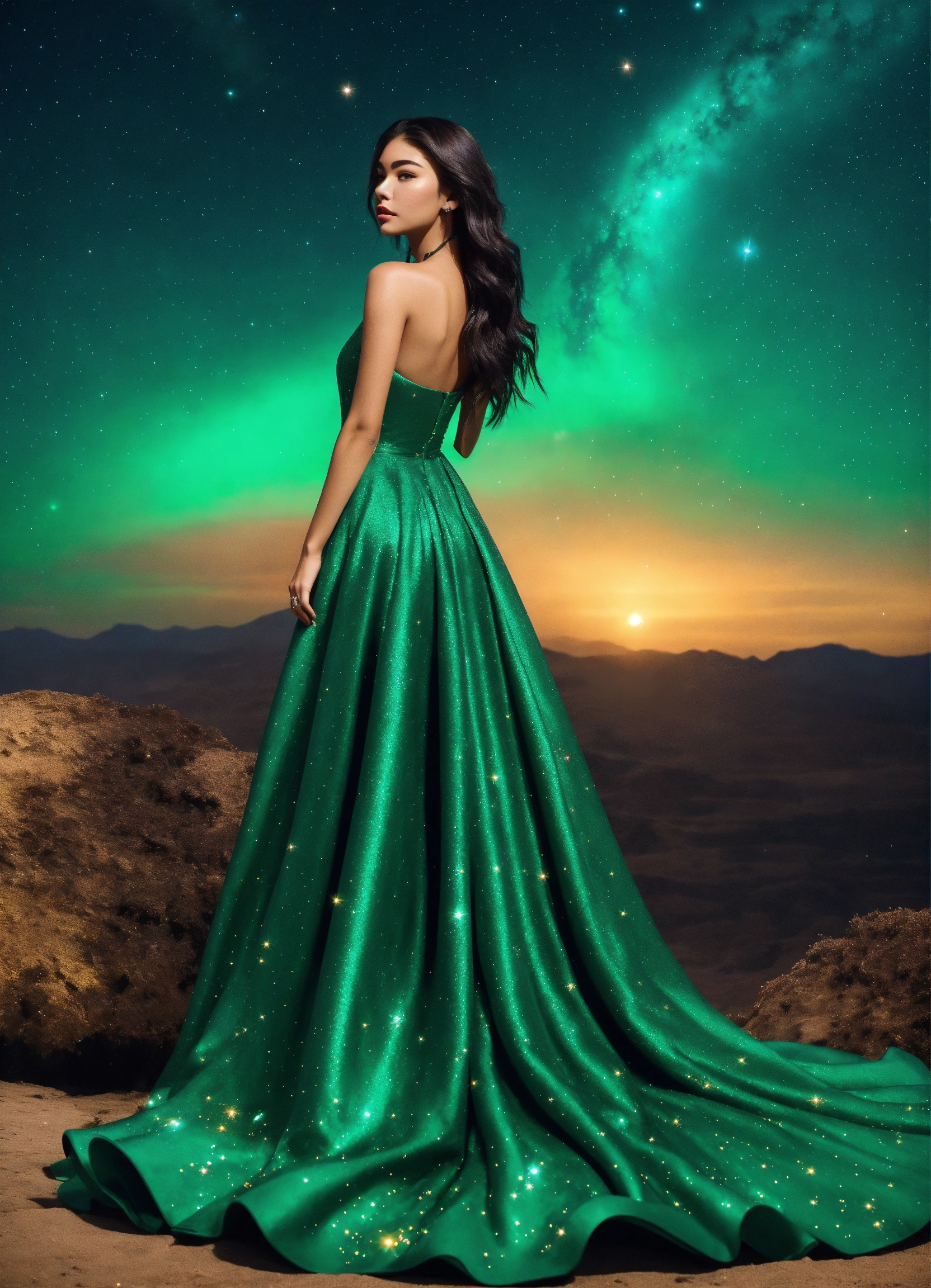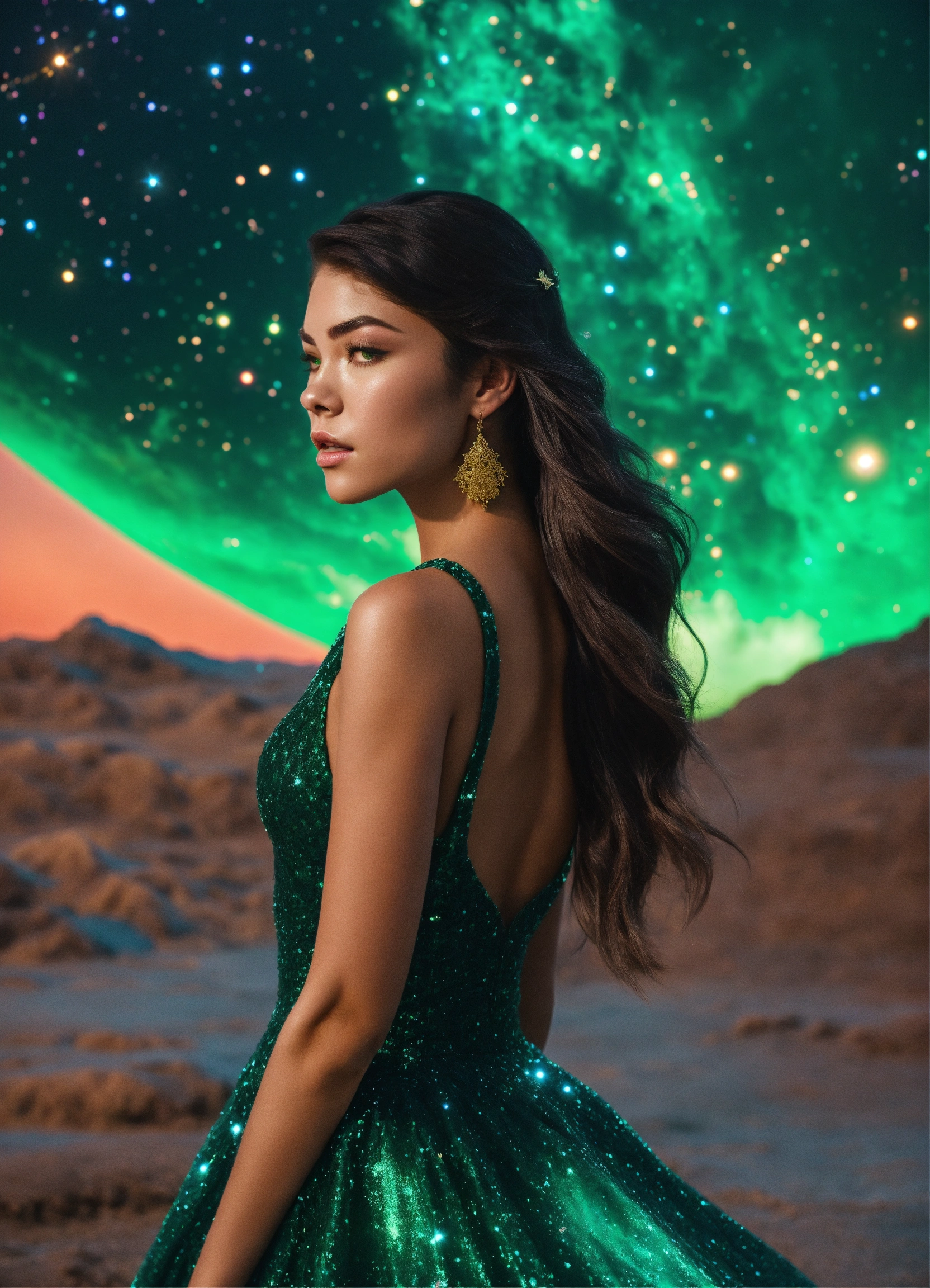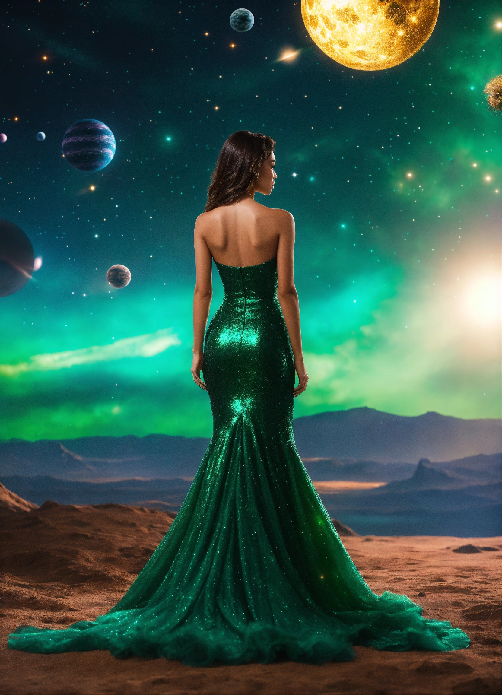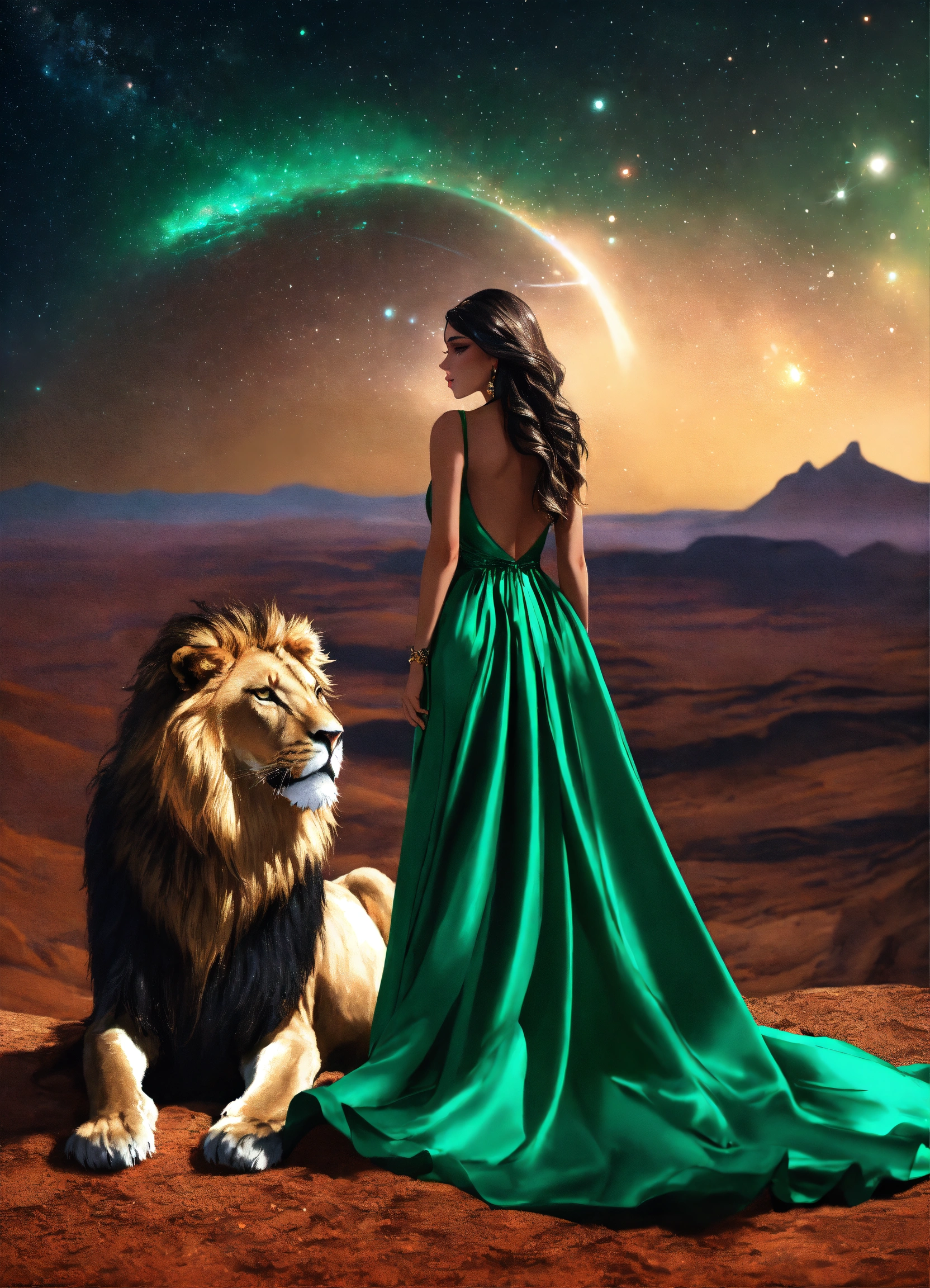 Madison beer in a emerald sparkling cocktail dress, black, on an isolated planet, back turned. stars raining down, a majestic lion with golden mane watching her. galaxy filled with planets, realistic. full body. 4k real photoshoot.