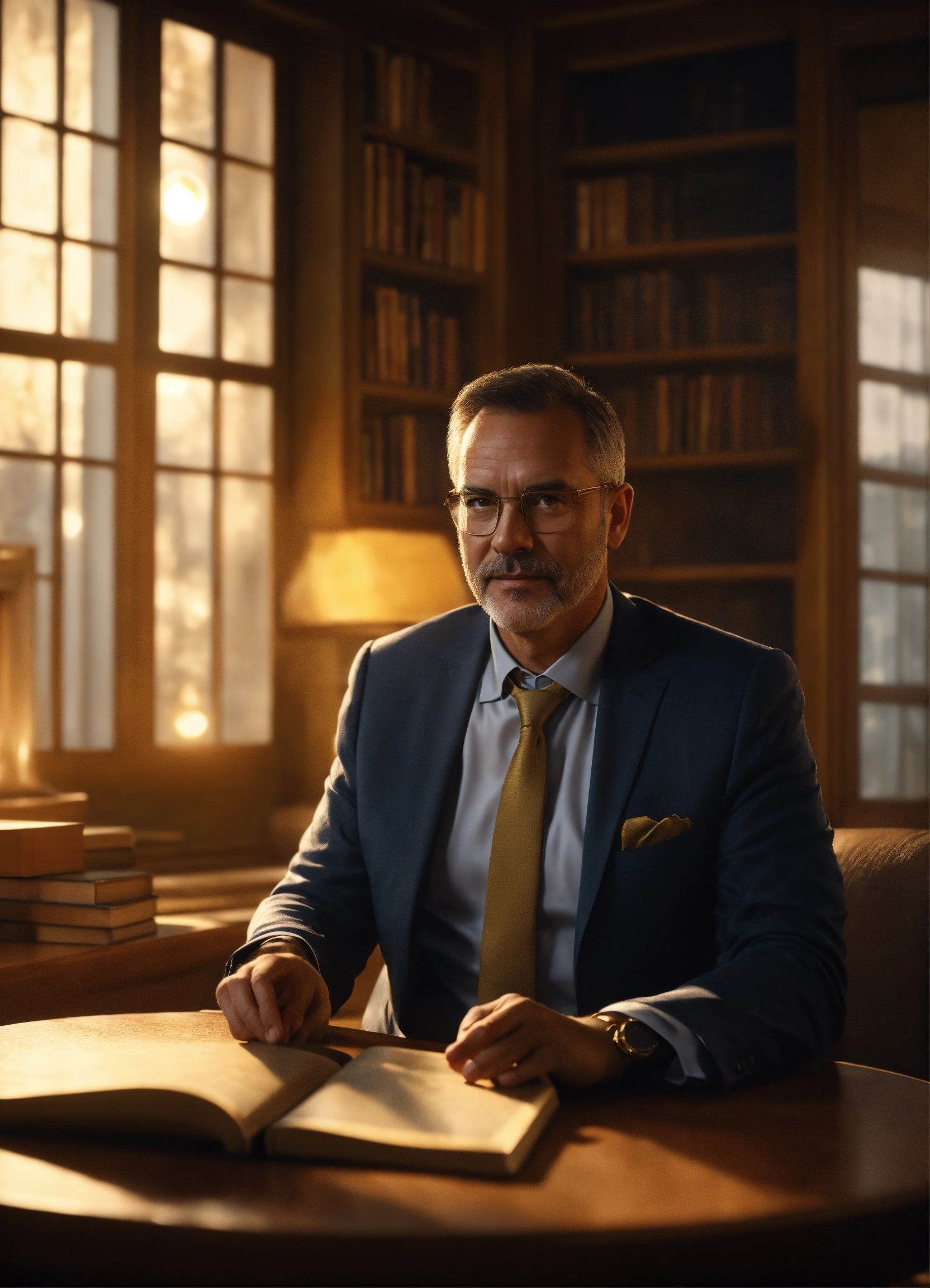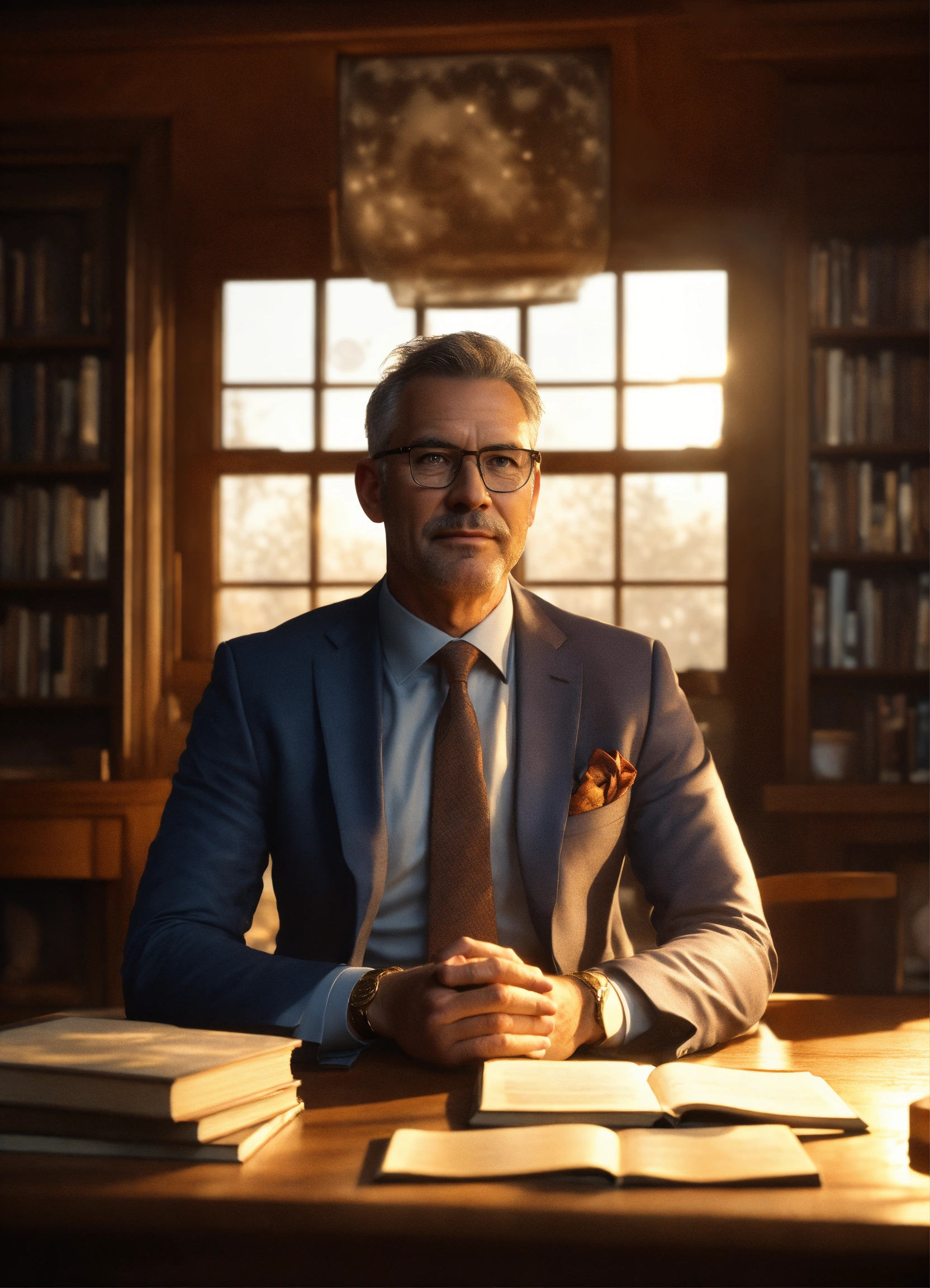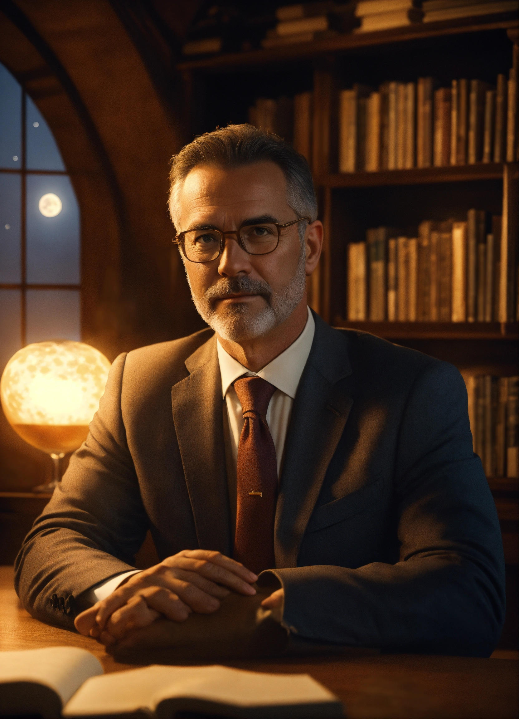 A handsome, reassuring-looking 50-year-old businessman, wearing glasses and looking straight at the camera. sitting on a table with books. he is in a cosy room with a fireplace behind him and a large glass window behind which is a beautiful moon. golden, comic style, 4k, uhd, octane render.
