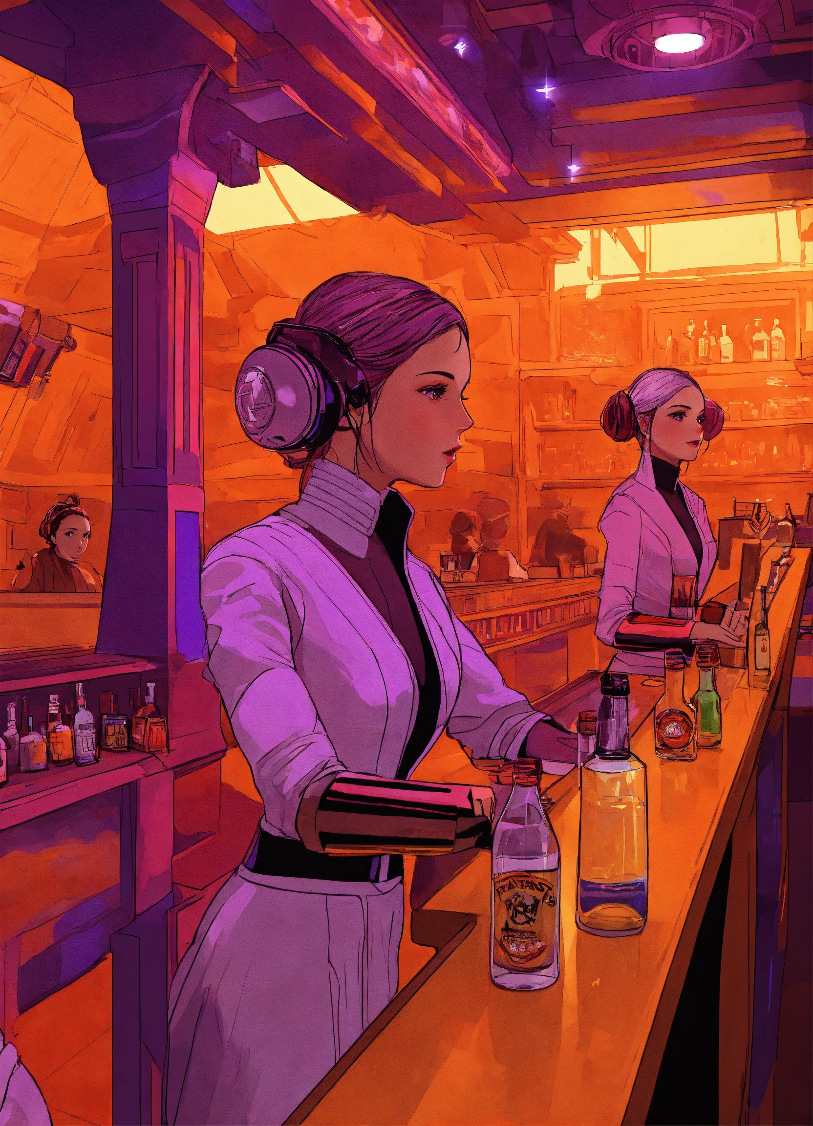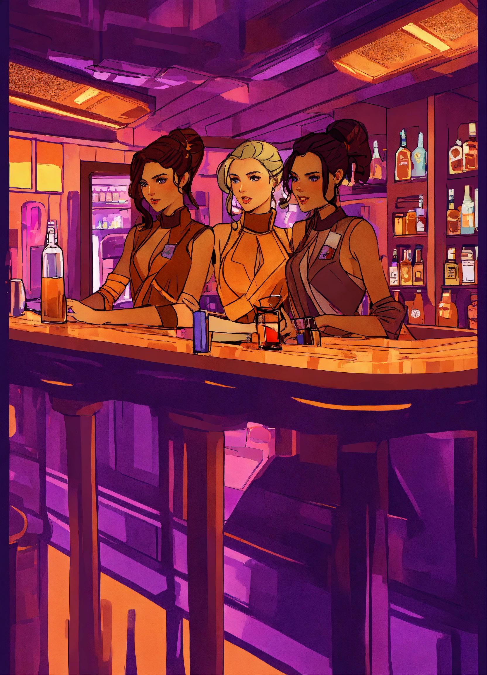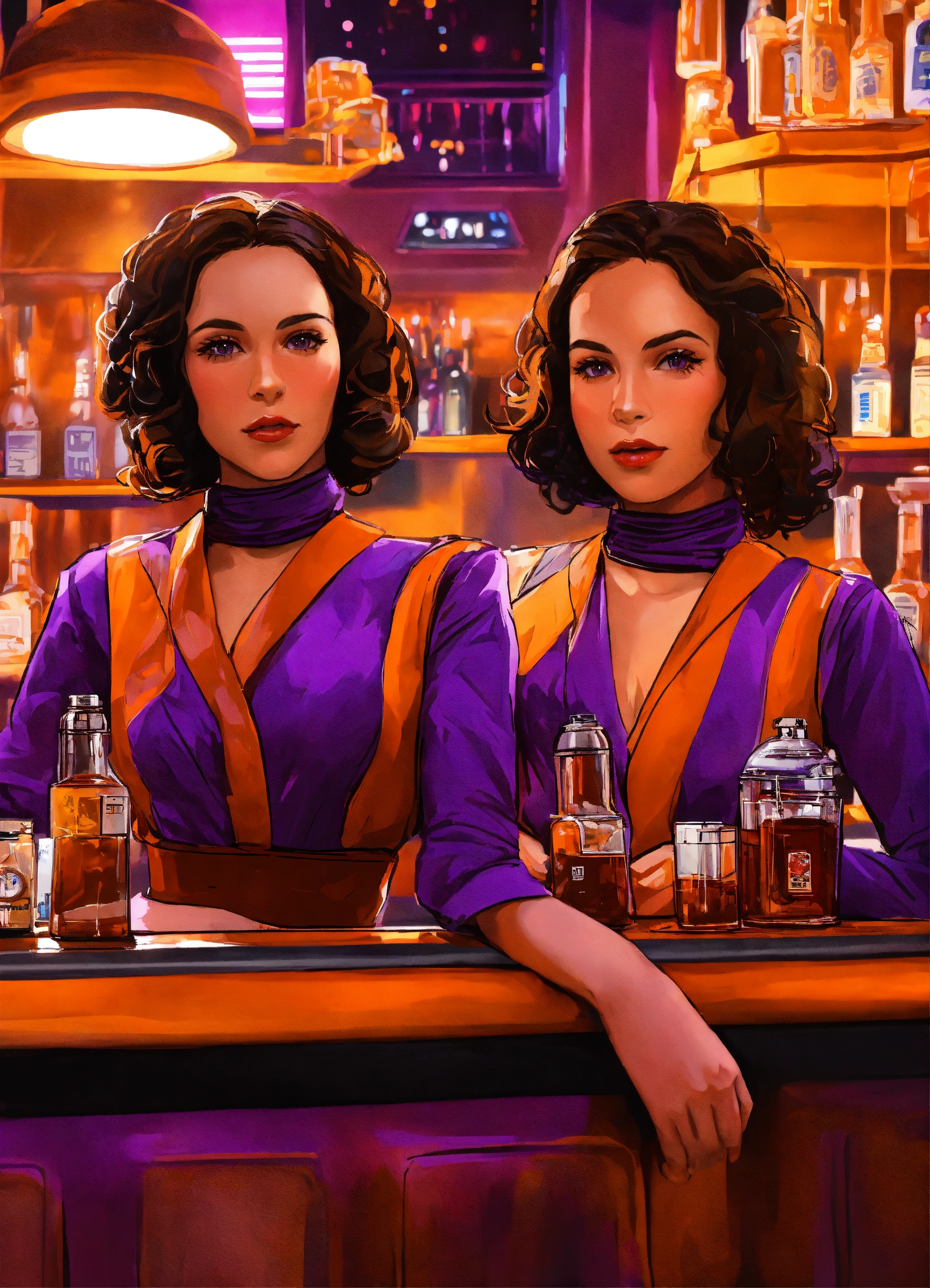 Digital art of female twins behind the bar at a star wars purple and orange cantina