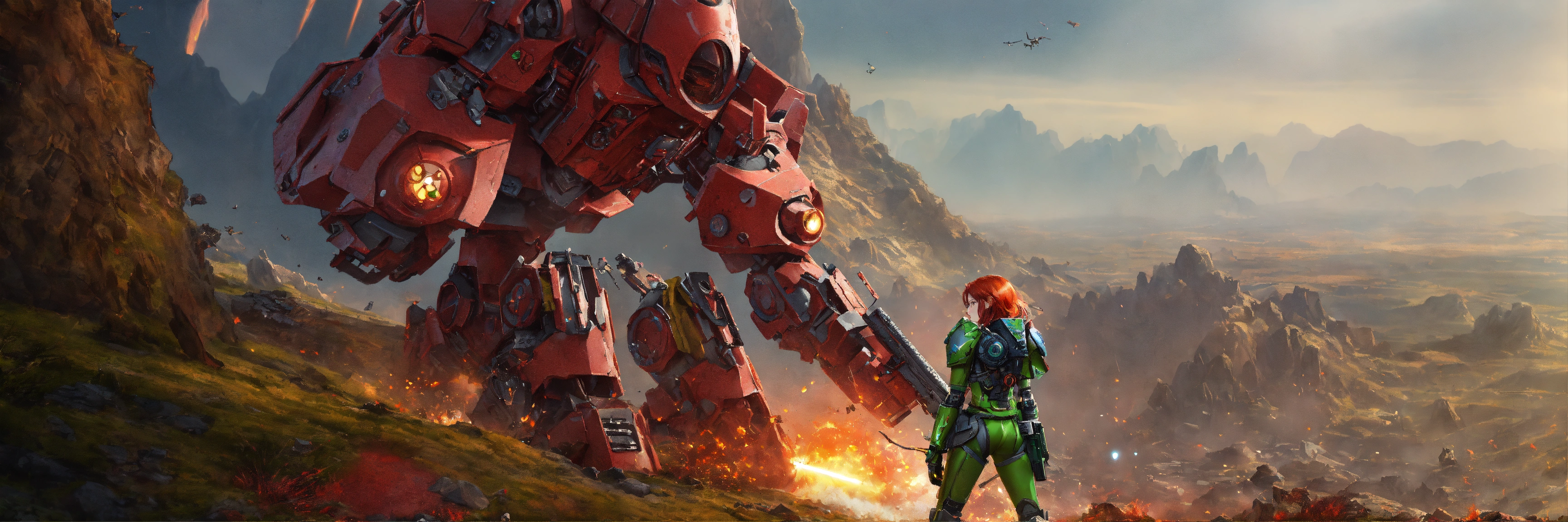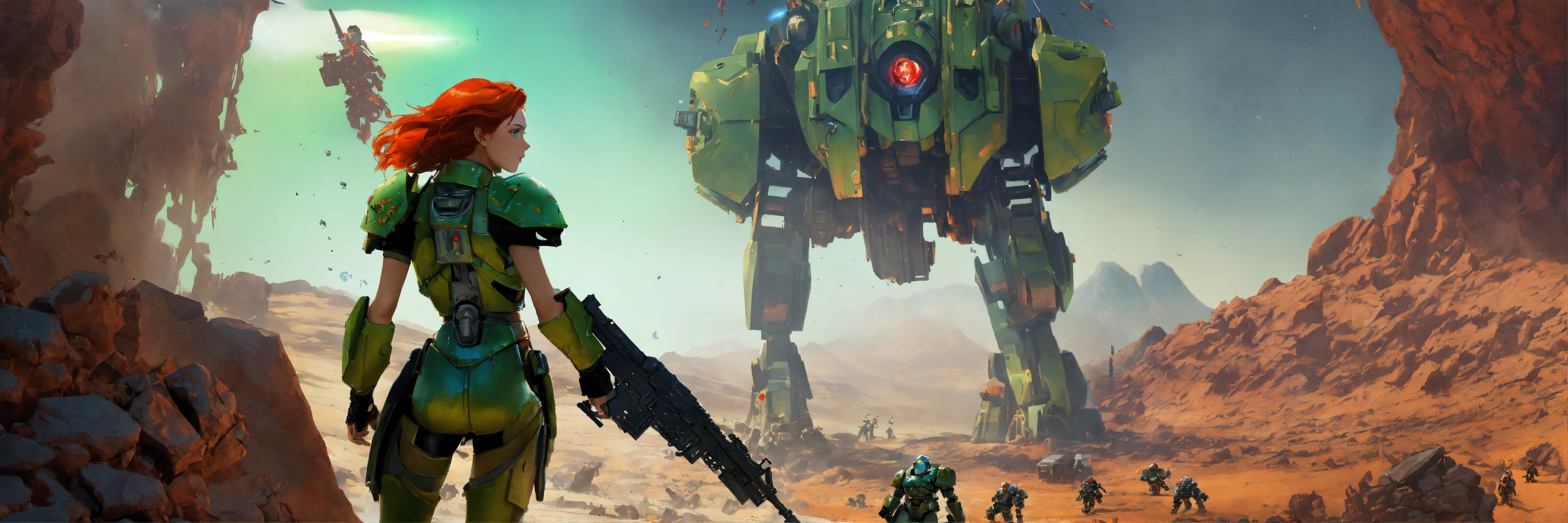 Full body view of woman with red hair and bright green eyes, in full warhammer 40k combat armor on an alien worlds battle zone, covered in broken and blown-up robots, she is fighting her way to a faraway interdimensional portal on the horizon built into the side of a mountain. ultra realism. perfect hands.