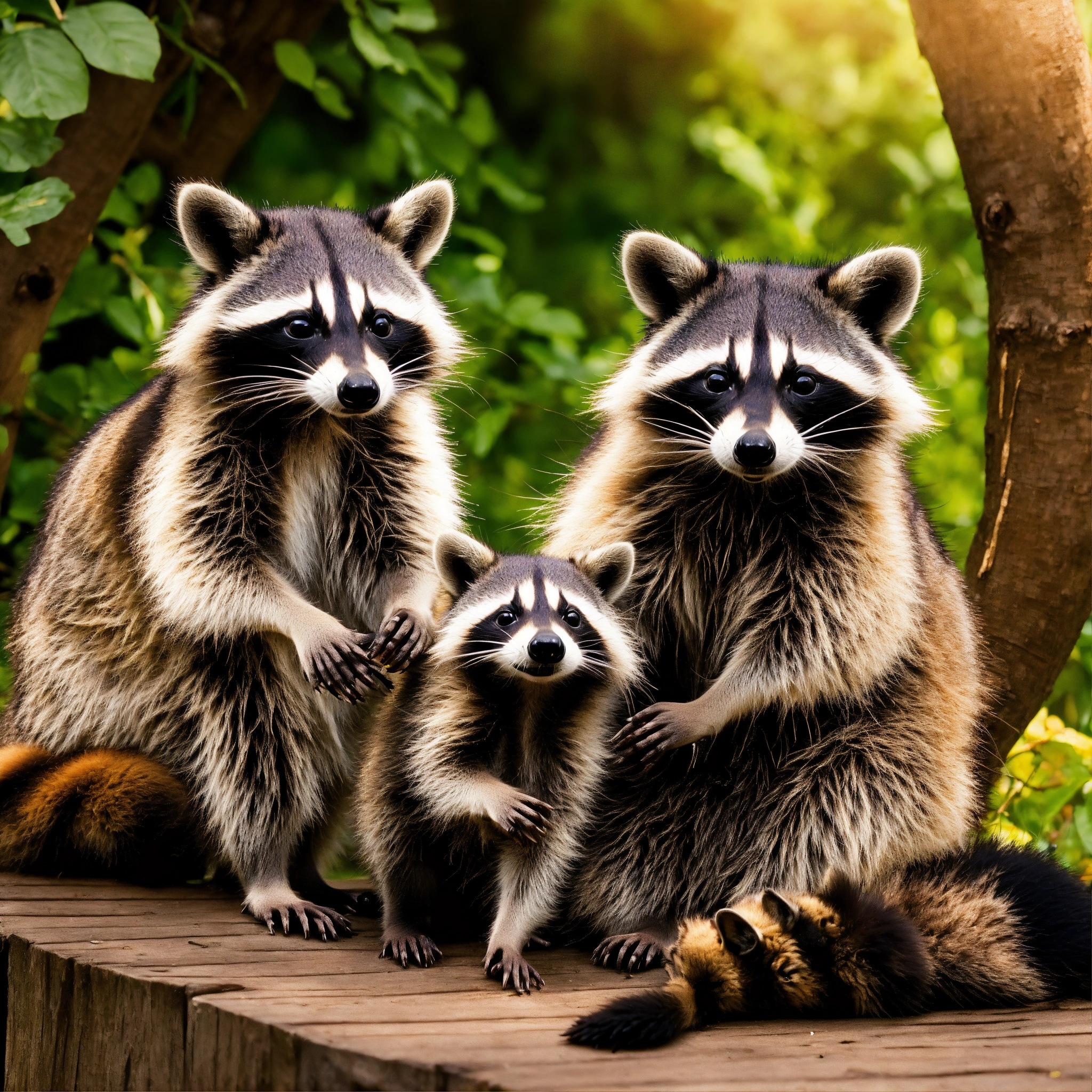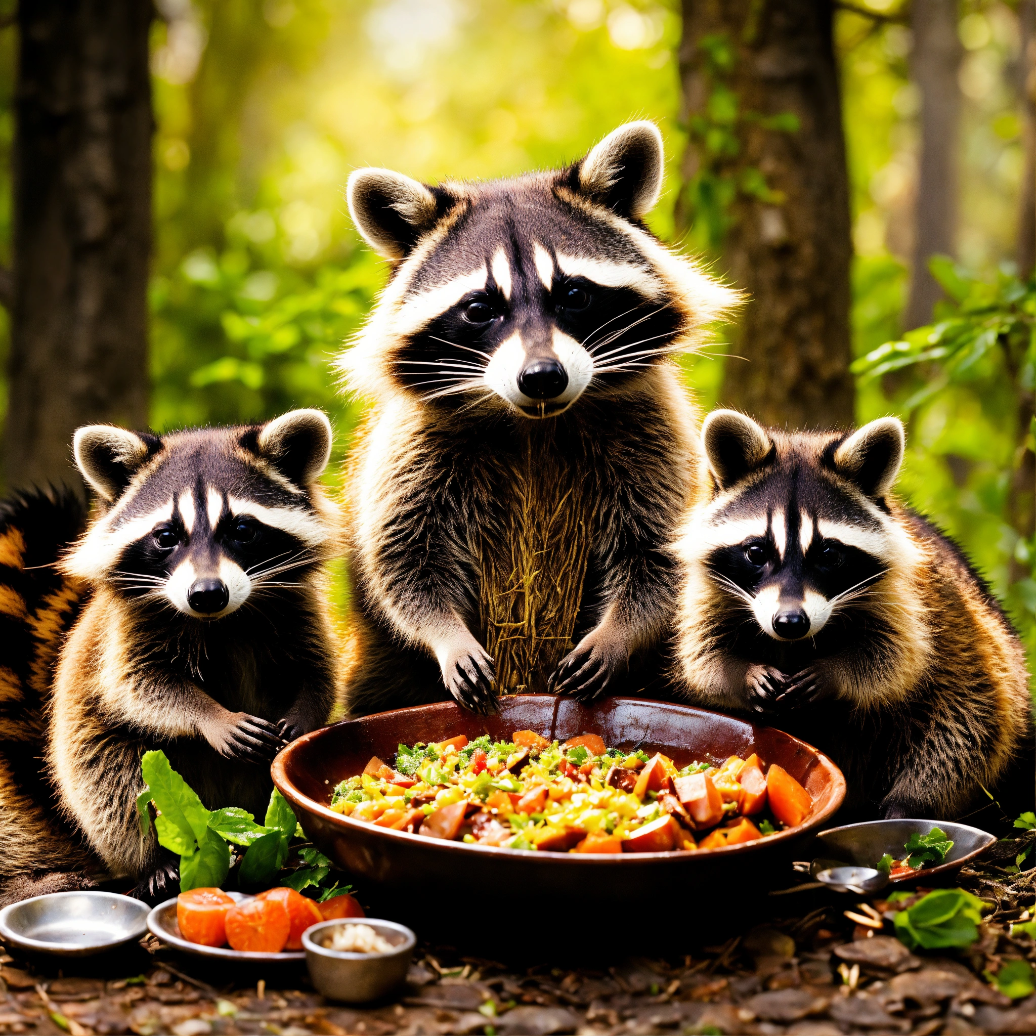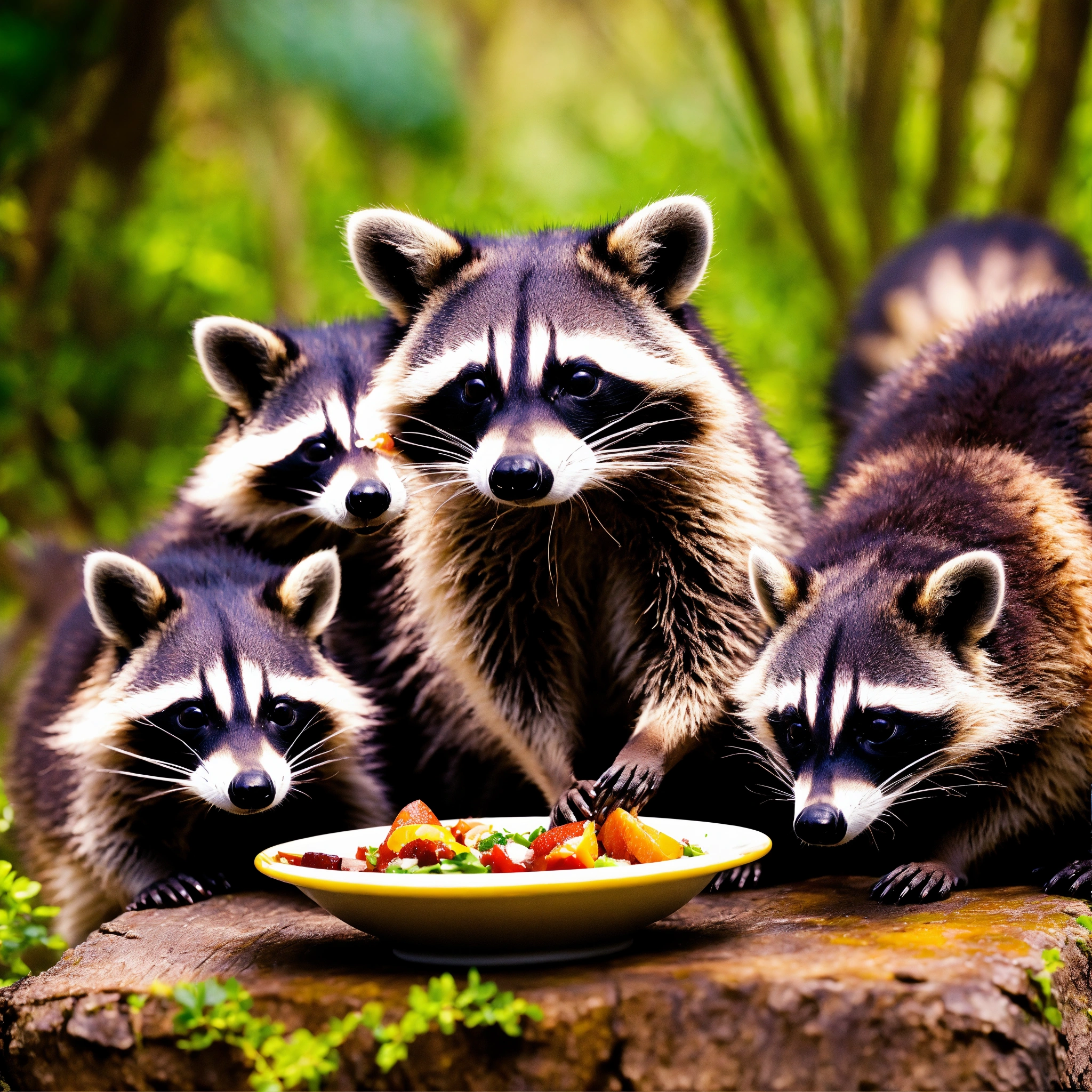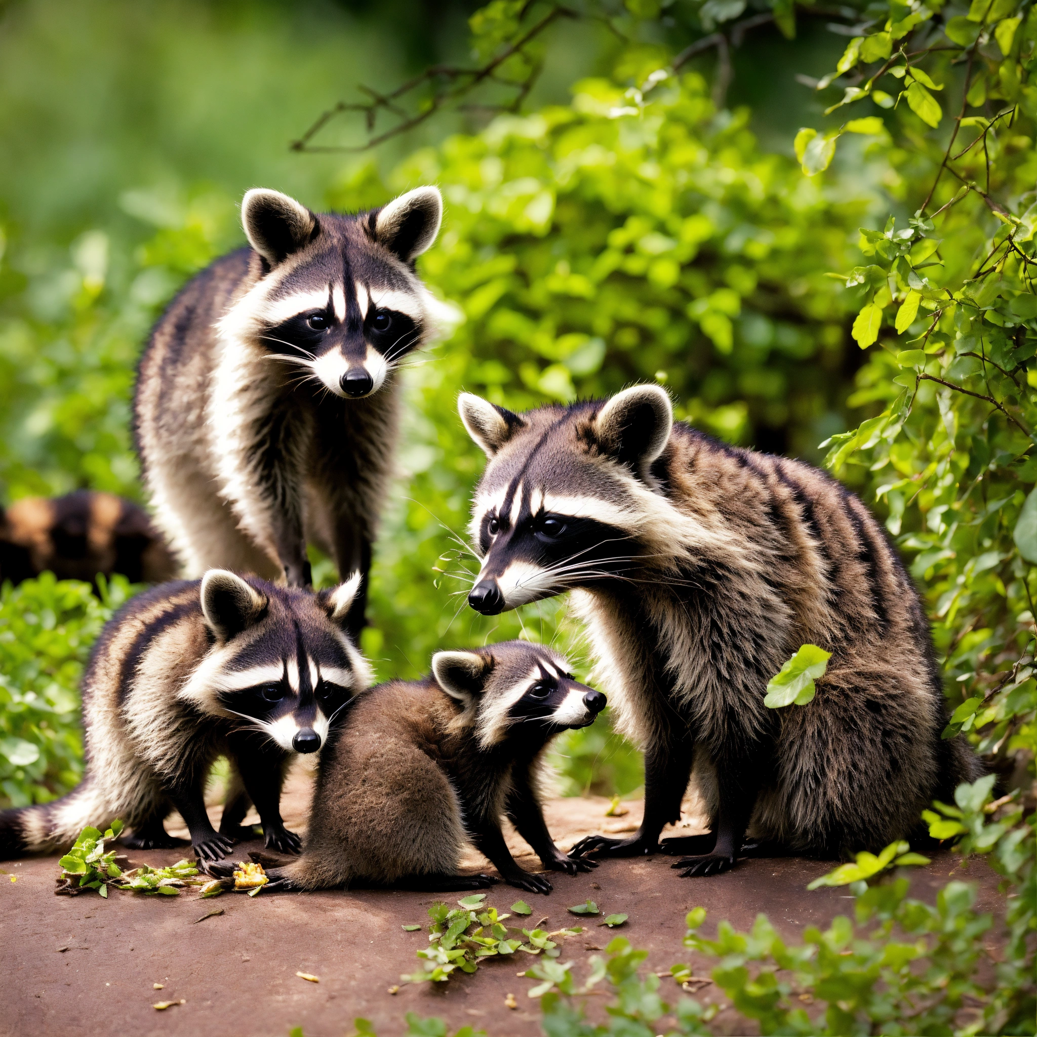 A raccoon family having a nice meal
