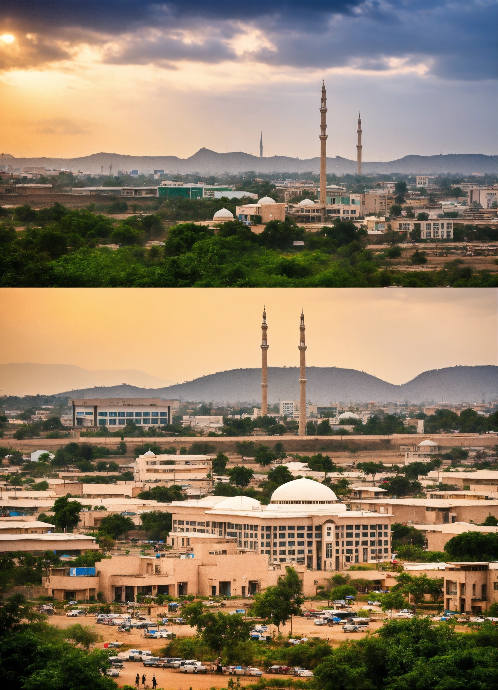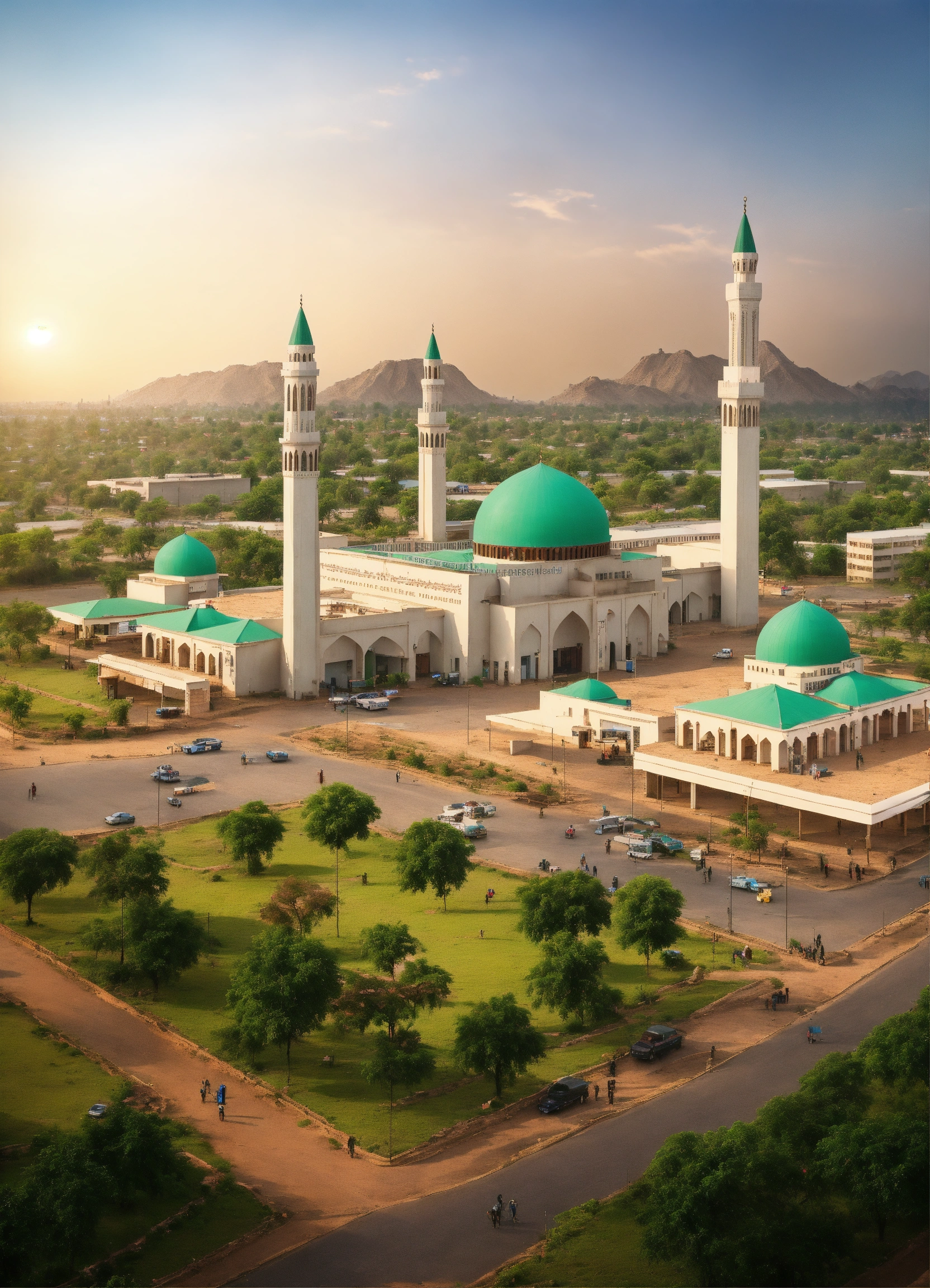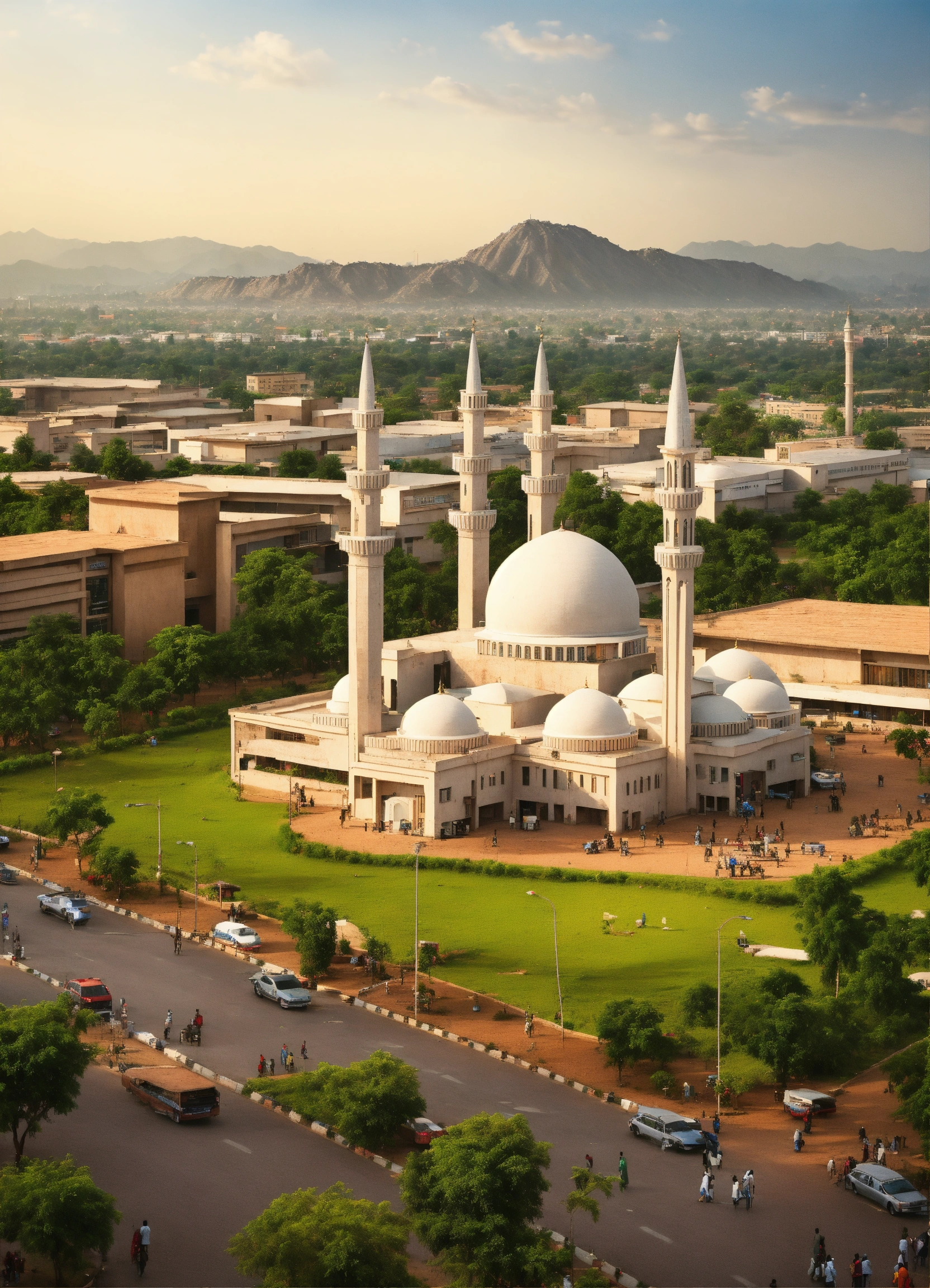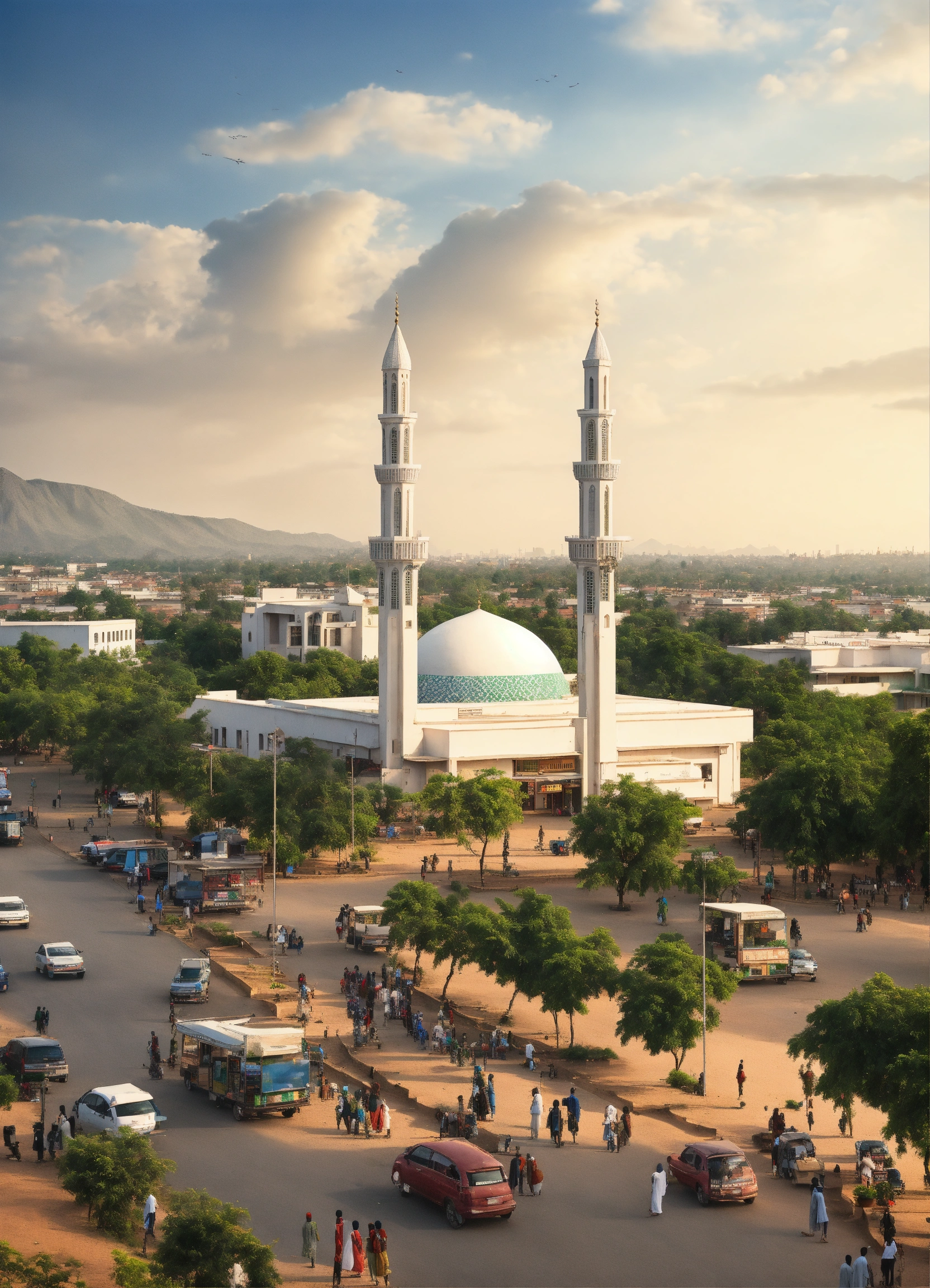 Abuja cityscape, include abuja national mosque at distance view, nigeria atmosphere, photo realistic, extremely detail building and people, daily life, city neighborhood, include abuja style cafe and stores, cinematic, lots of people, 8k photo, maximal