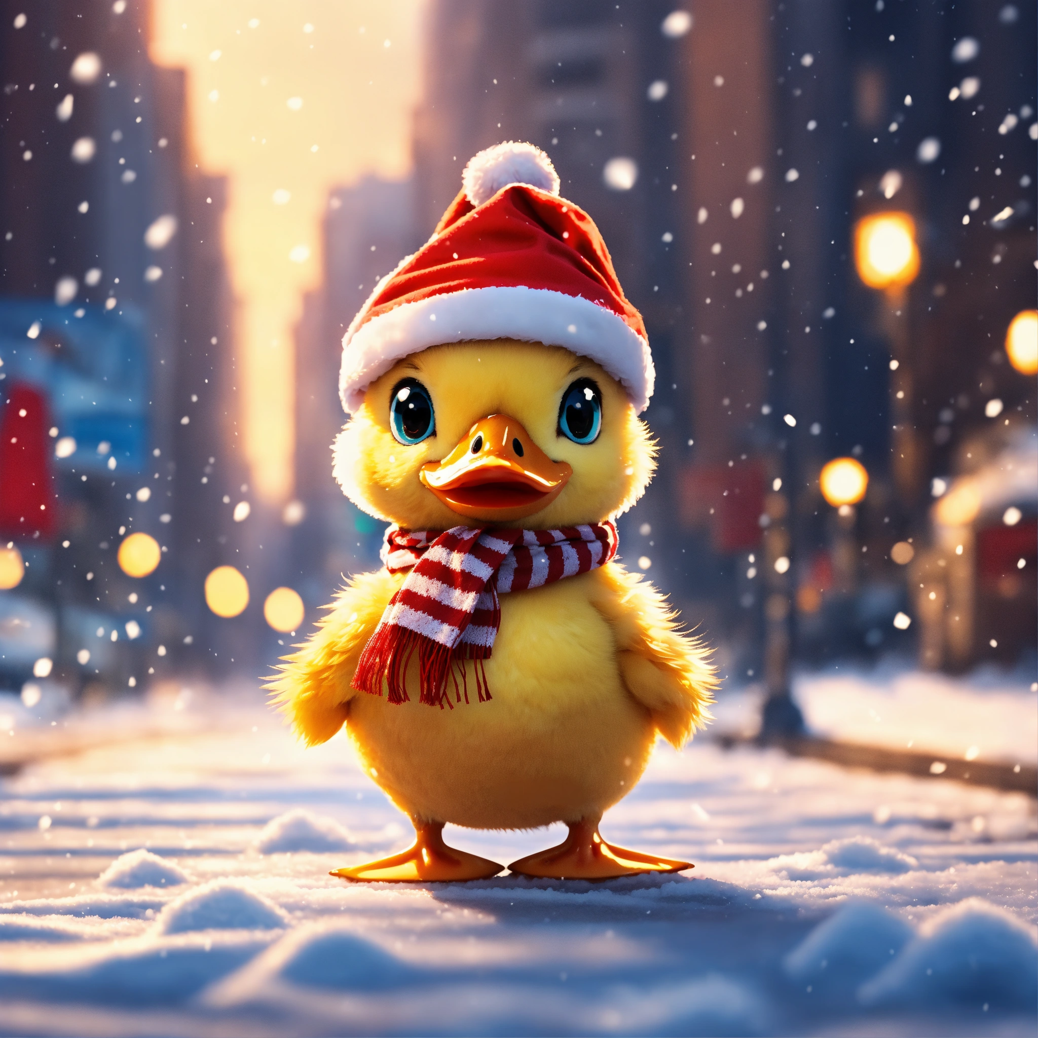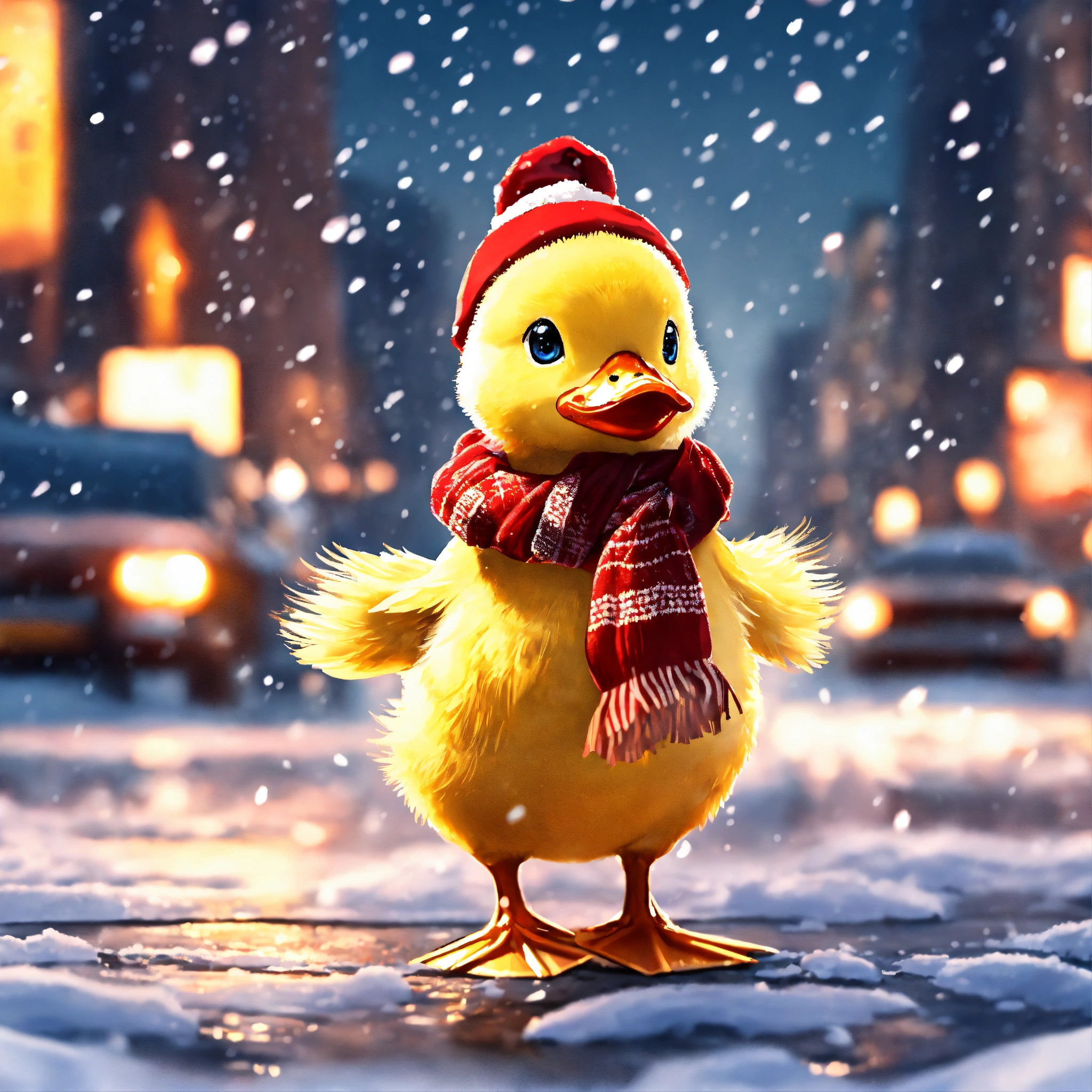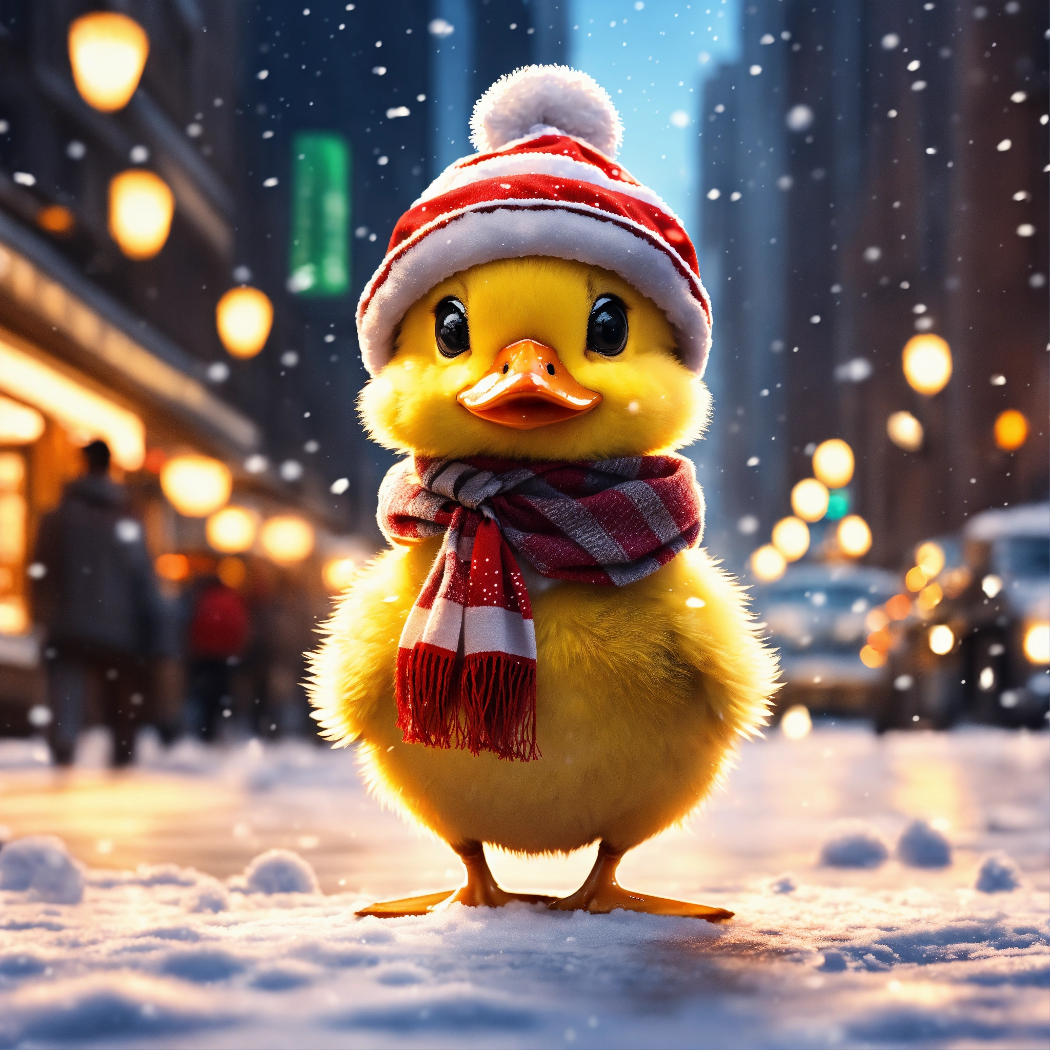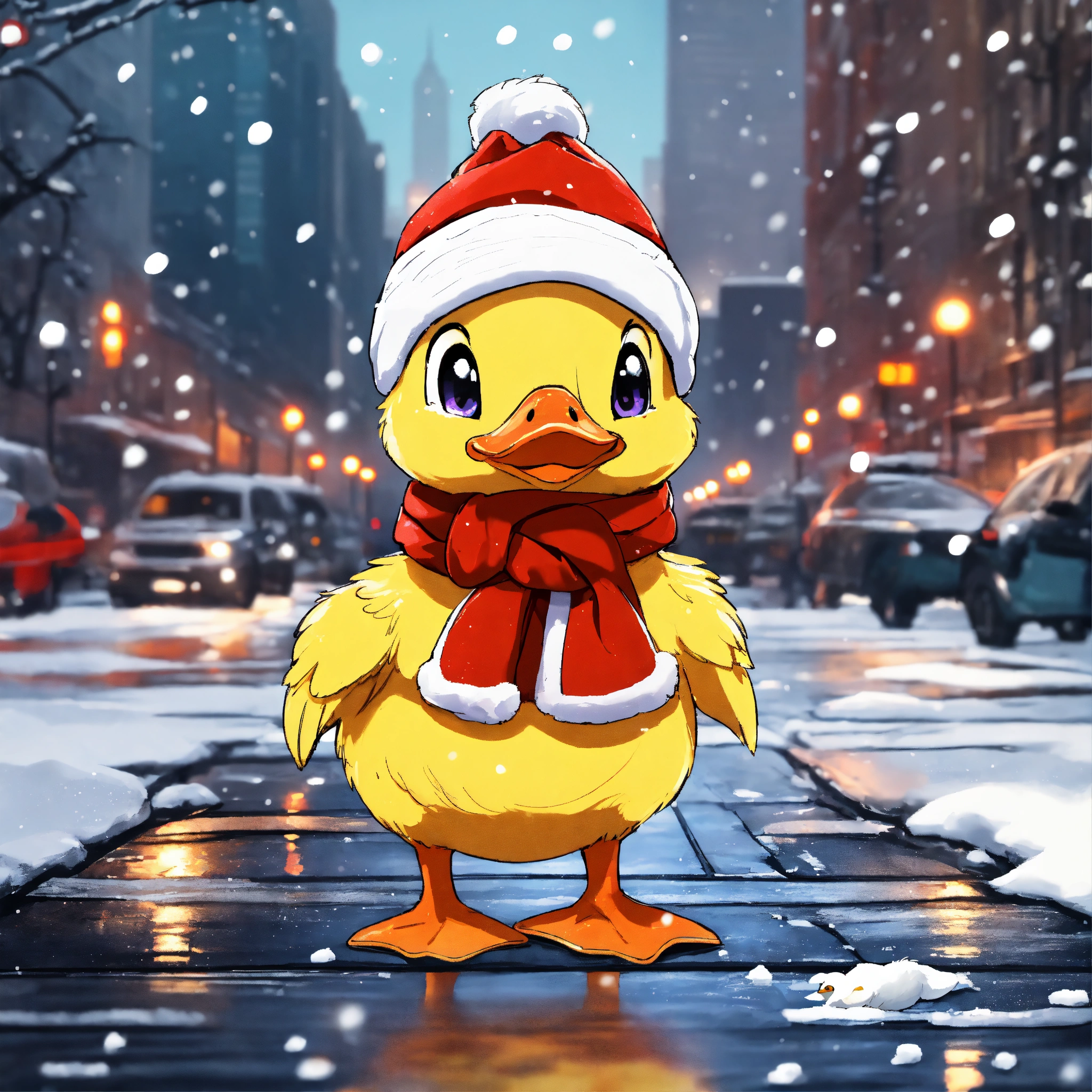 Little adorable baby duckling with a small beak and wearing a scarf and a santa hat on its head, standing in the middle of new york city while its snowing, 8k, hd, anime art style, cartoon style