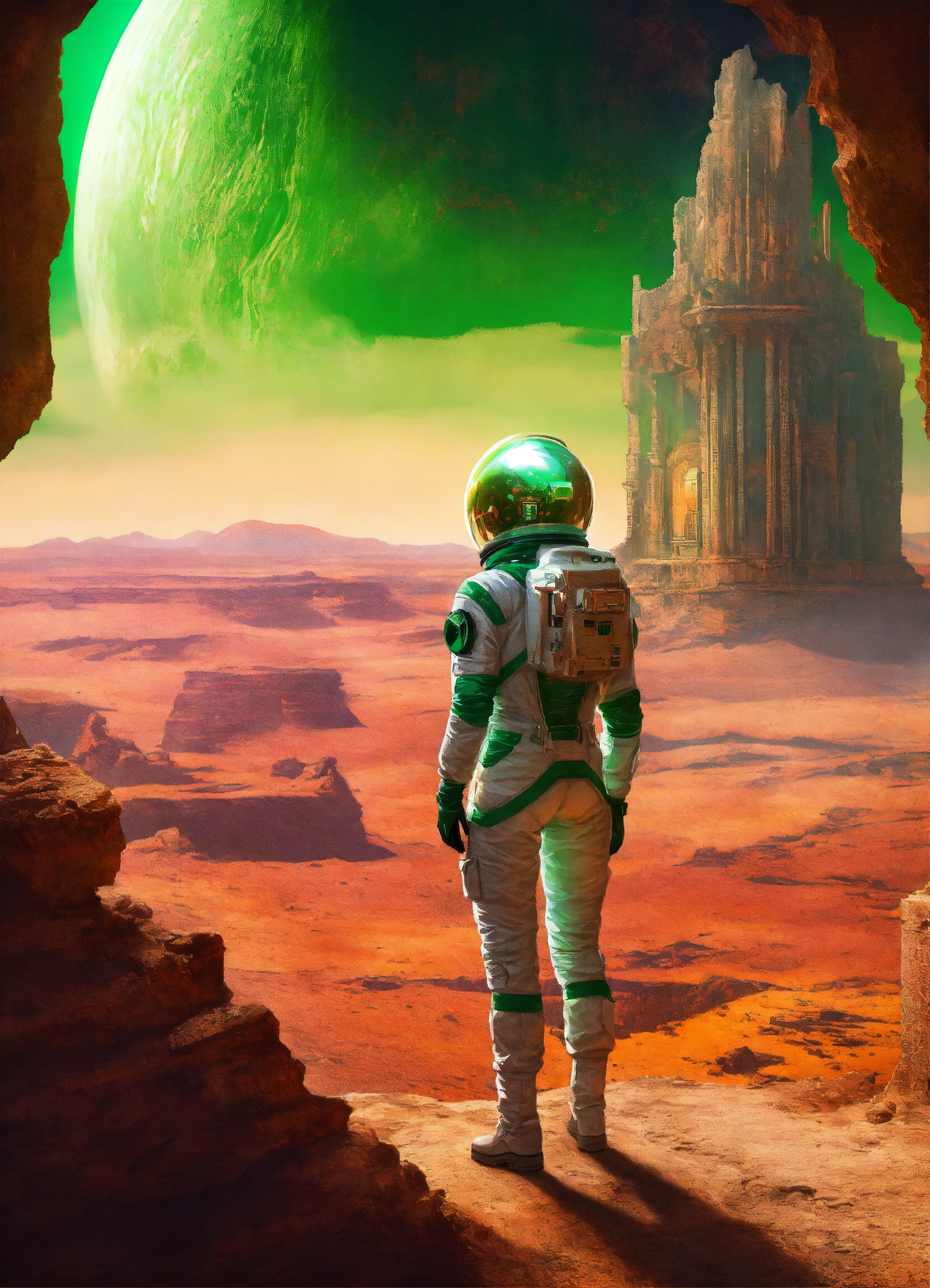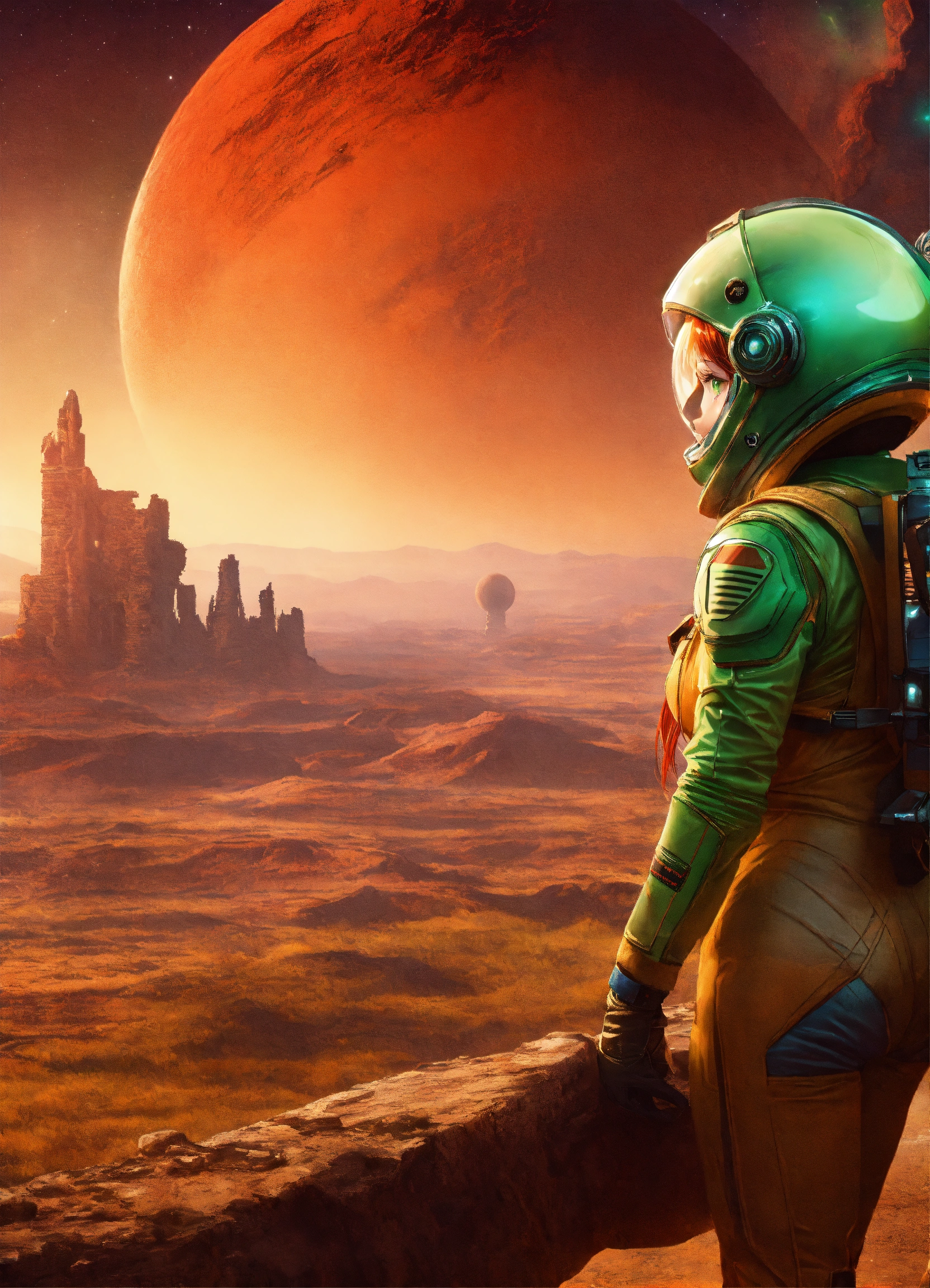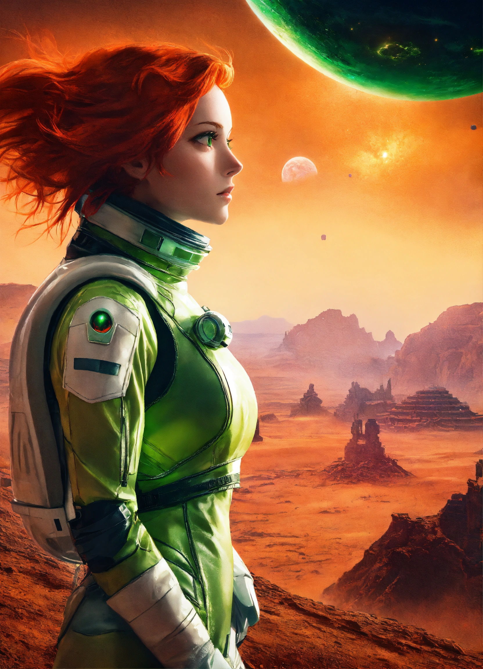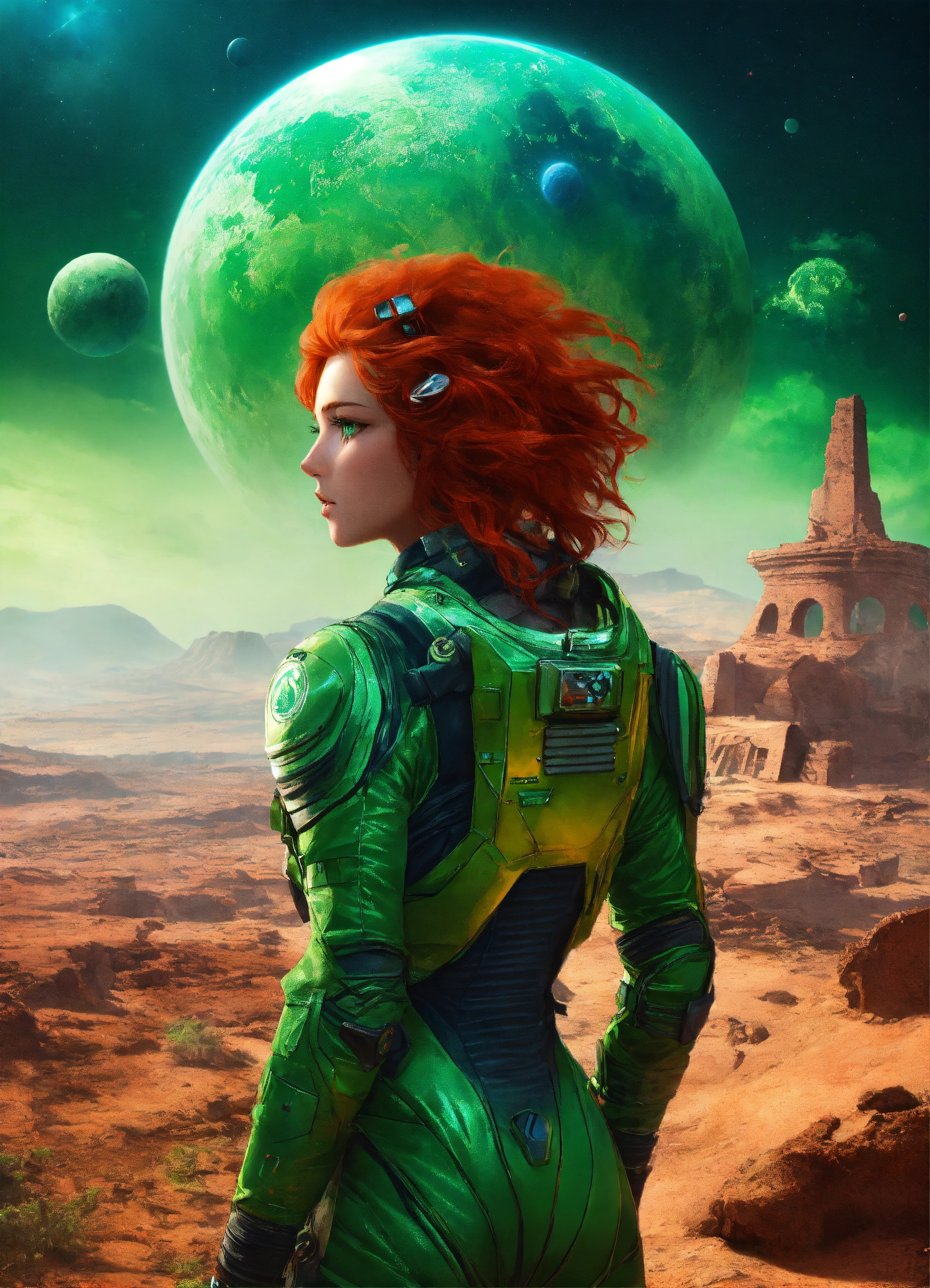 Red haired green eyes woman in a space suit looking over a alien landscape towards an ancient ruin