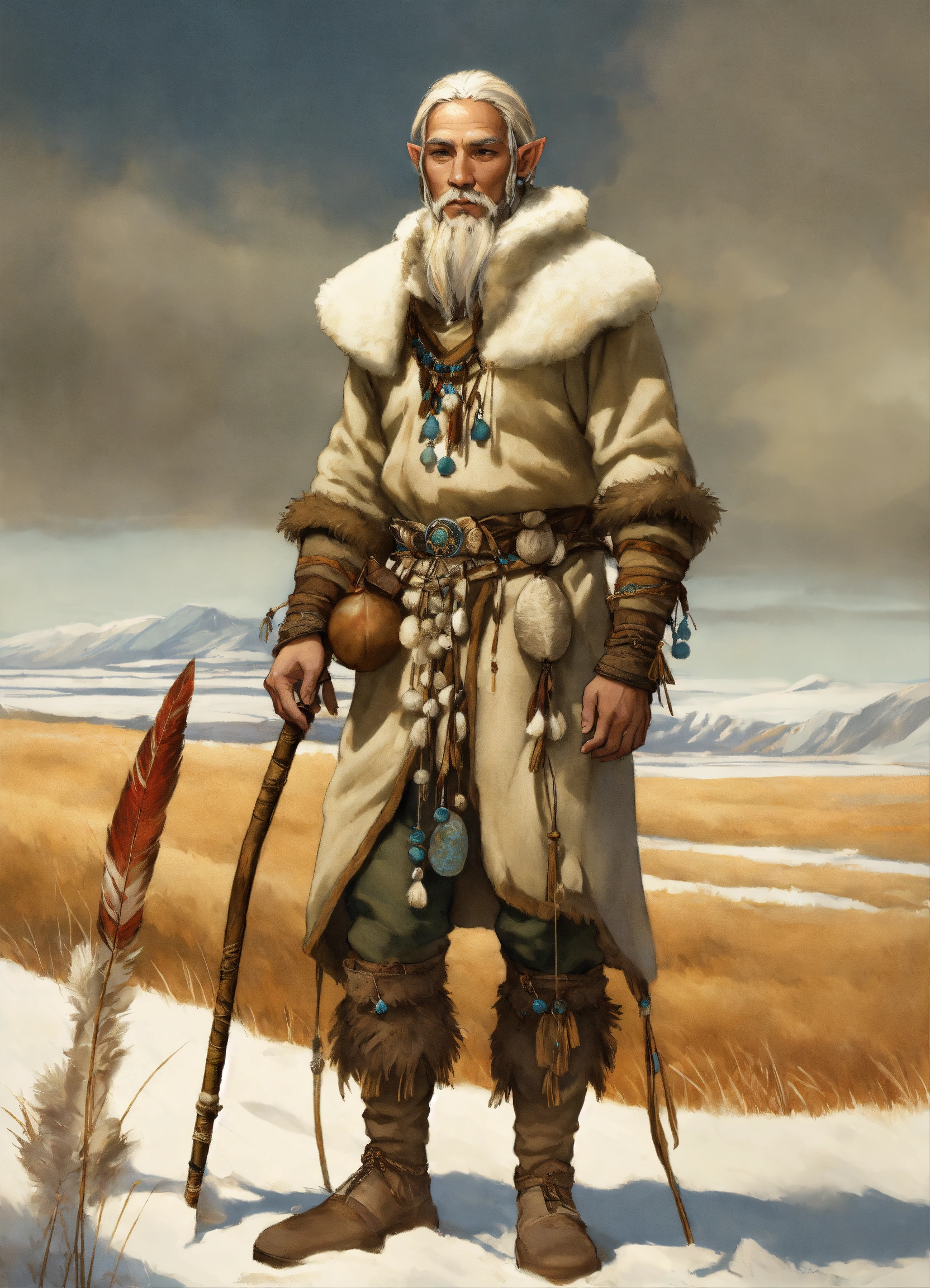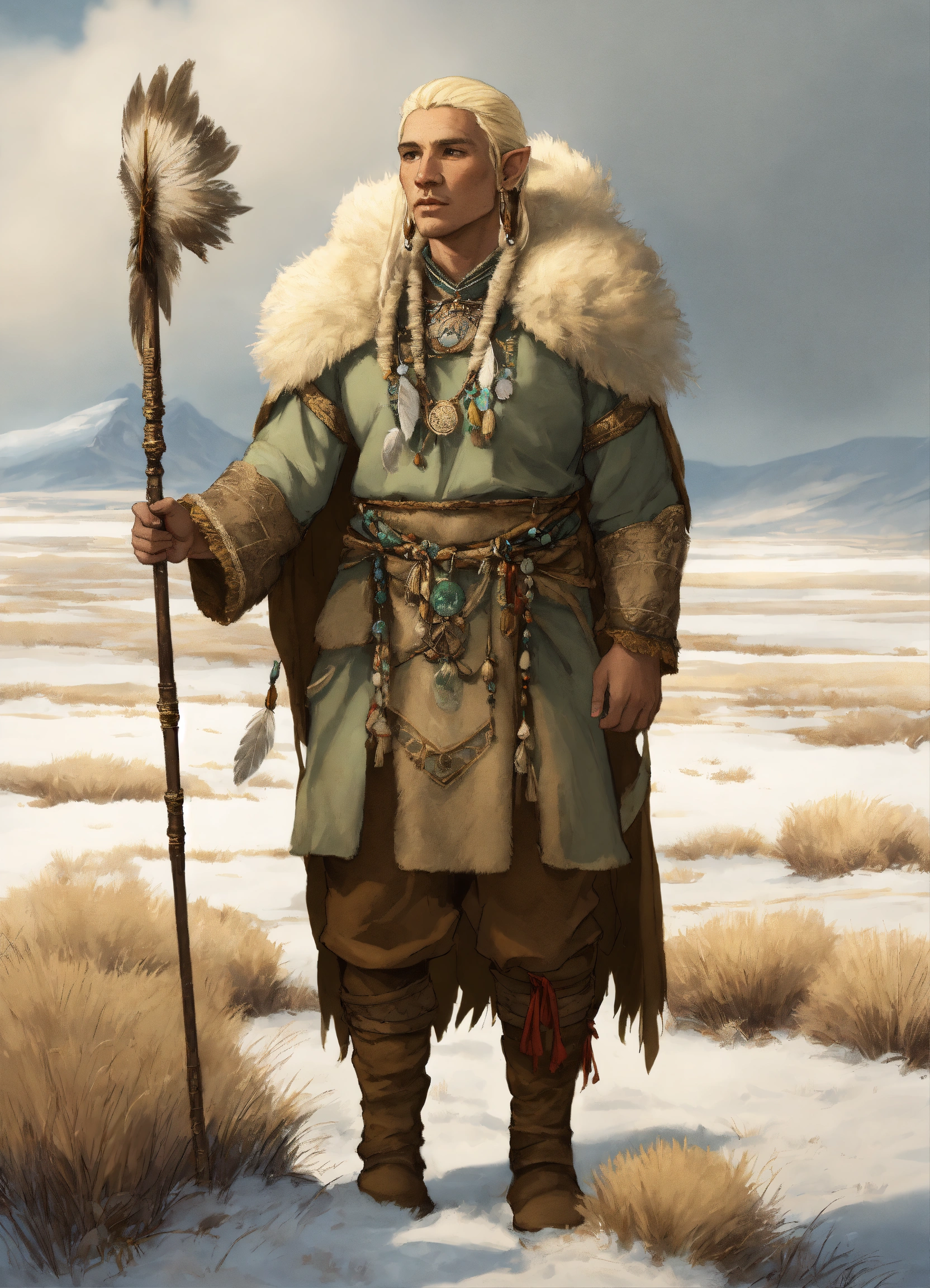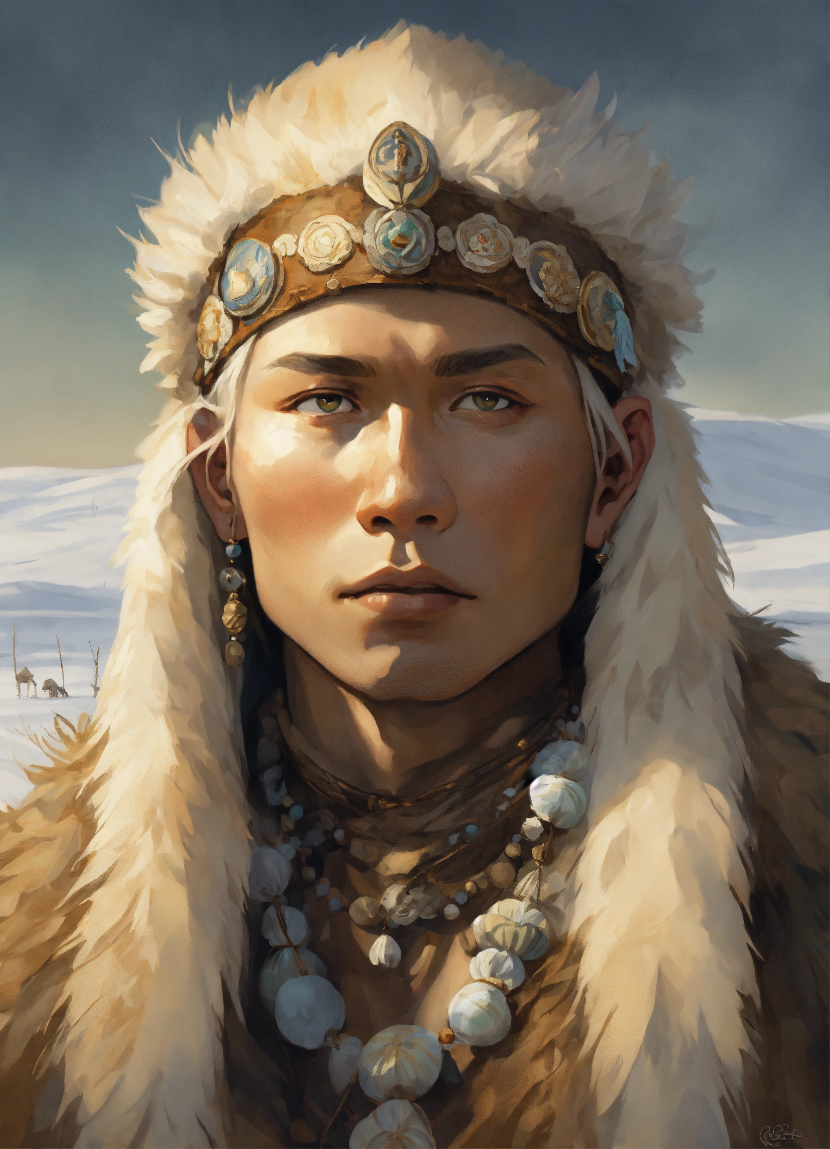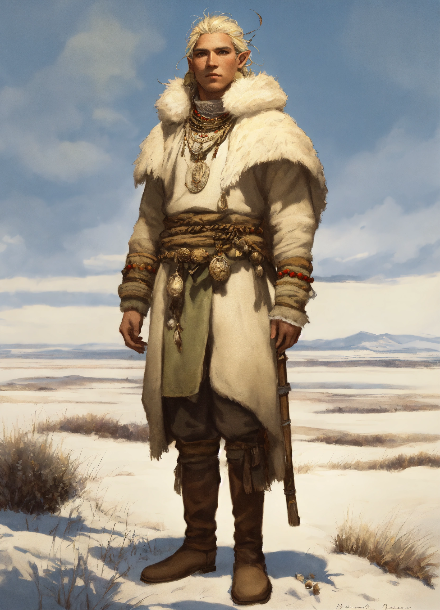 Full body illustration of an elf inuit man, native american phenotype with blonde hair and albino skin, wearing stone age warm clothing made from natural fabrics like linen, cotton, or furs, adorned with feathers, beads and shells, standing on the steppe tundra landscape, gloomy and depressing ambient, artwork by greg rutkowski, alphonse mucha, detailed face, detailed skin, highest detail quality