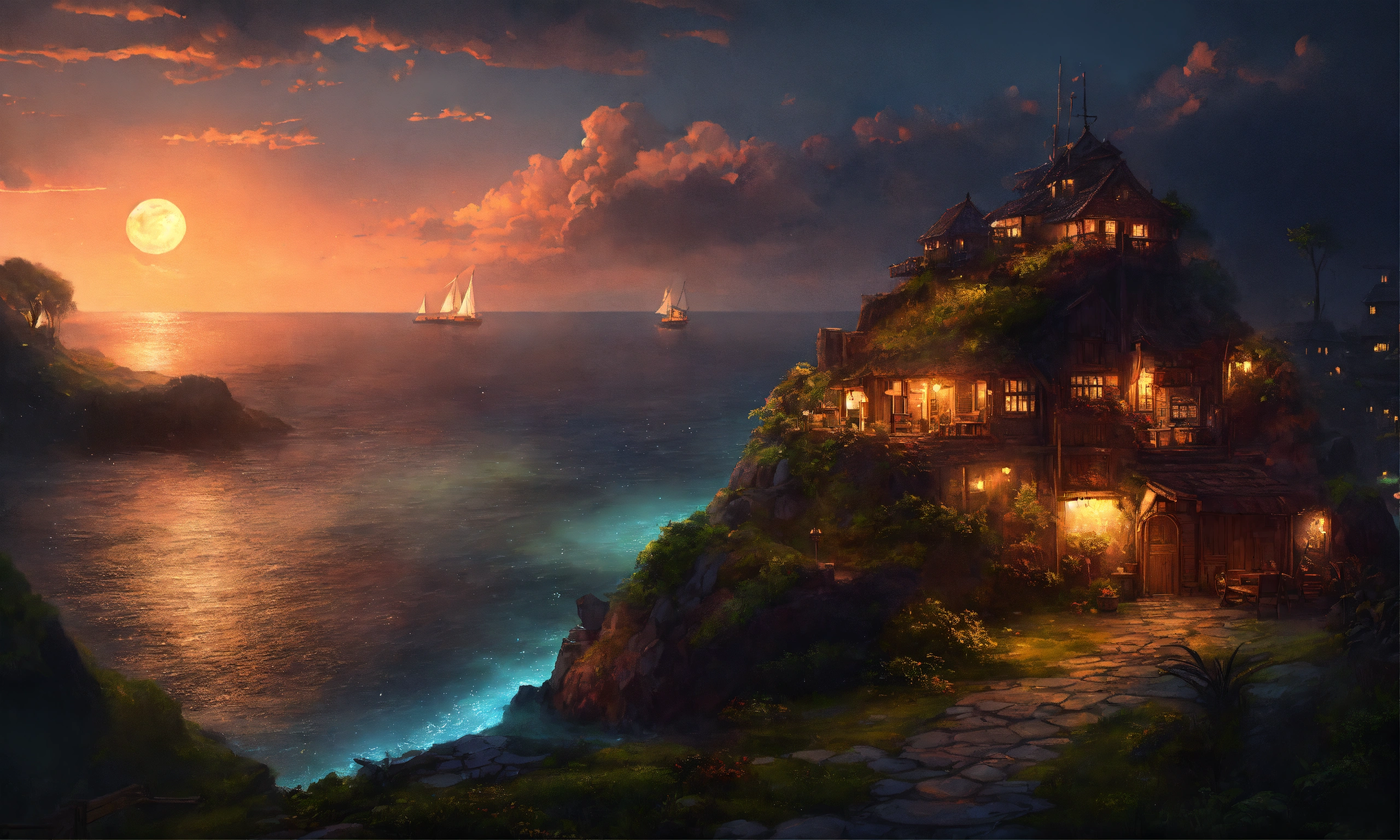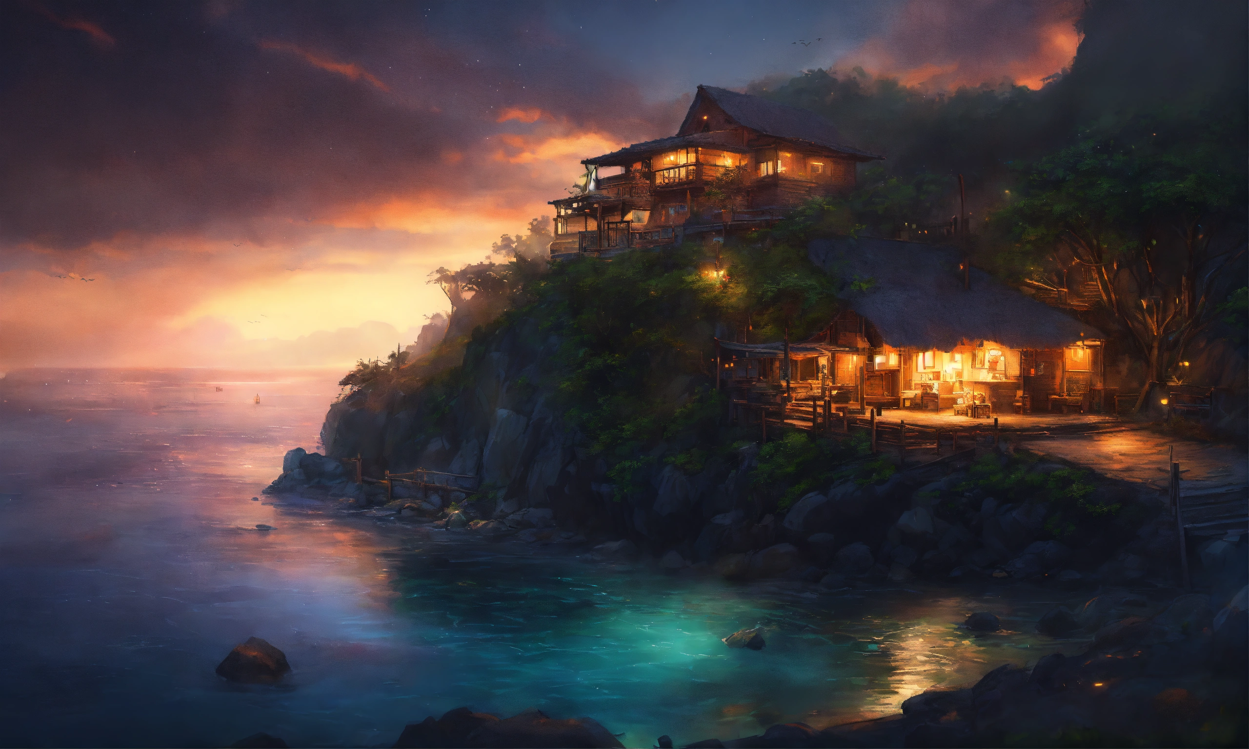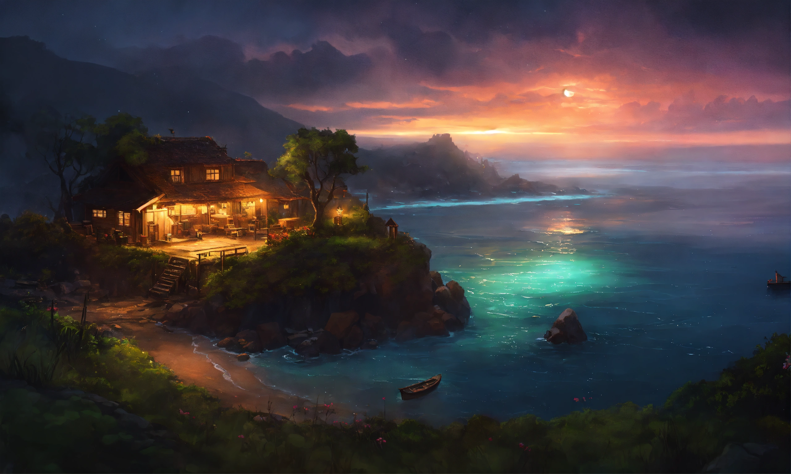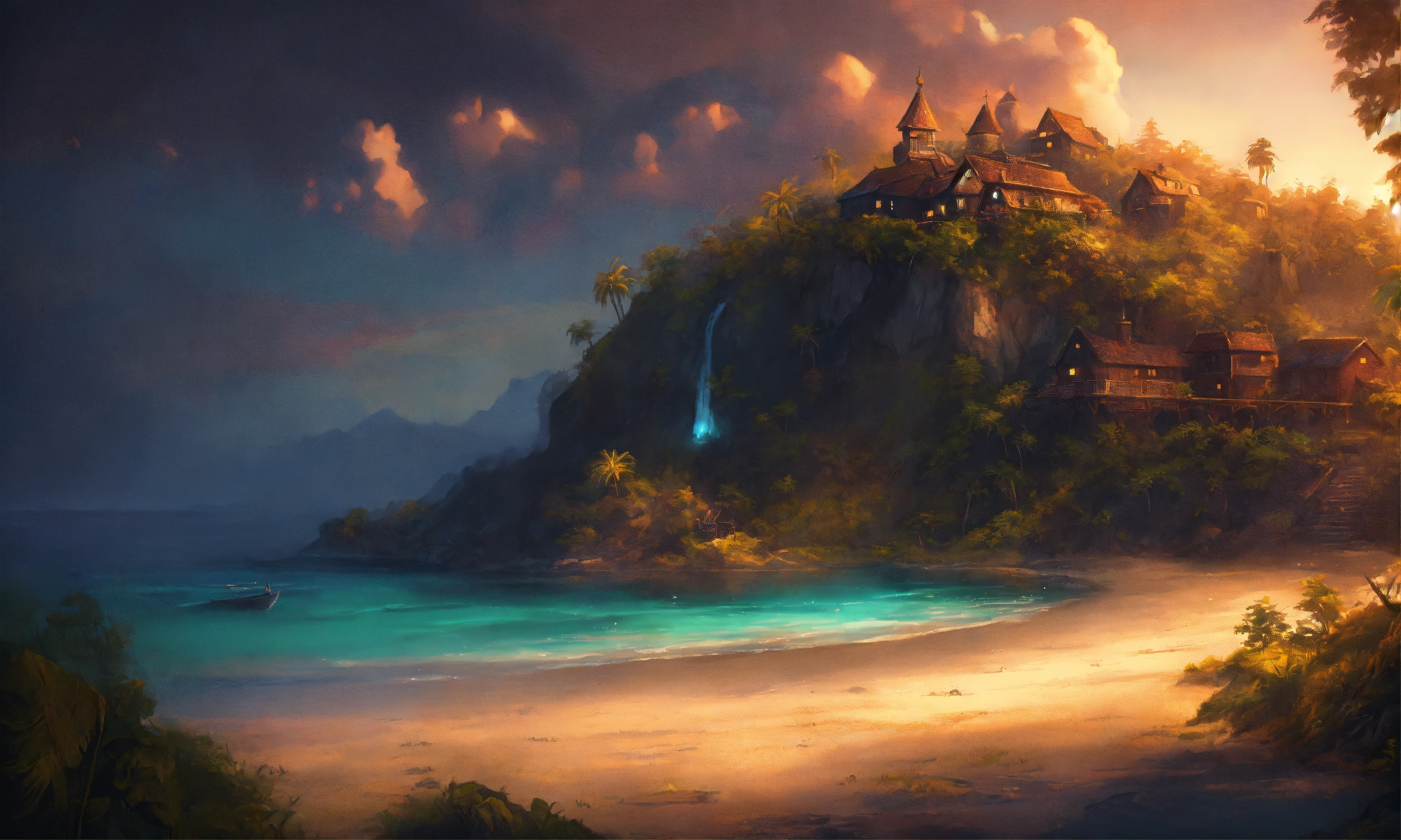Epic beautiful shot of a ultra old dreamy island of sleep on one side of the picture, sleepy evening atmosphere, dark background, ultra cozy, luminous, digital painting, little photorealistic, sharp focus, ultra cozy and inviting, wish to be there. very detailed, arty, should rank high on youtube for a dream trip.