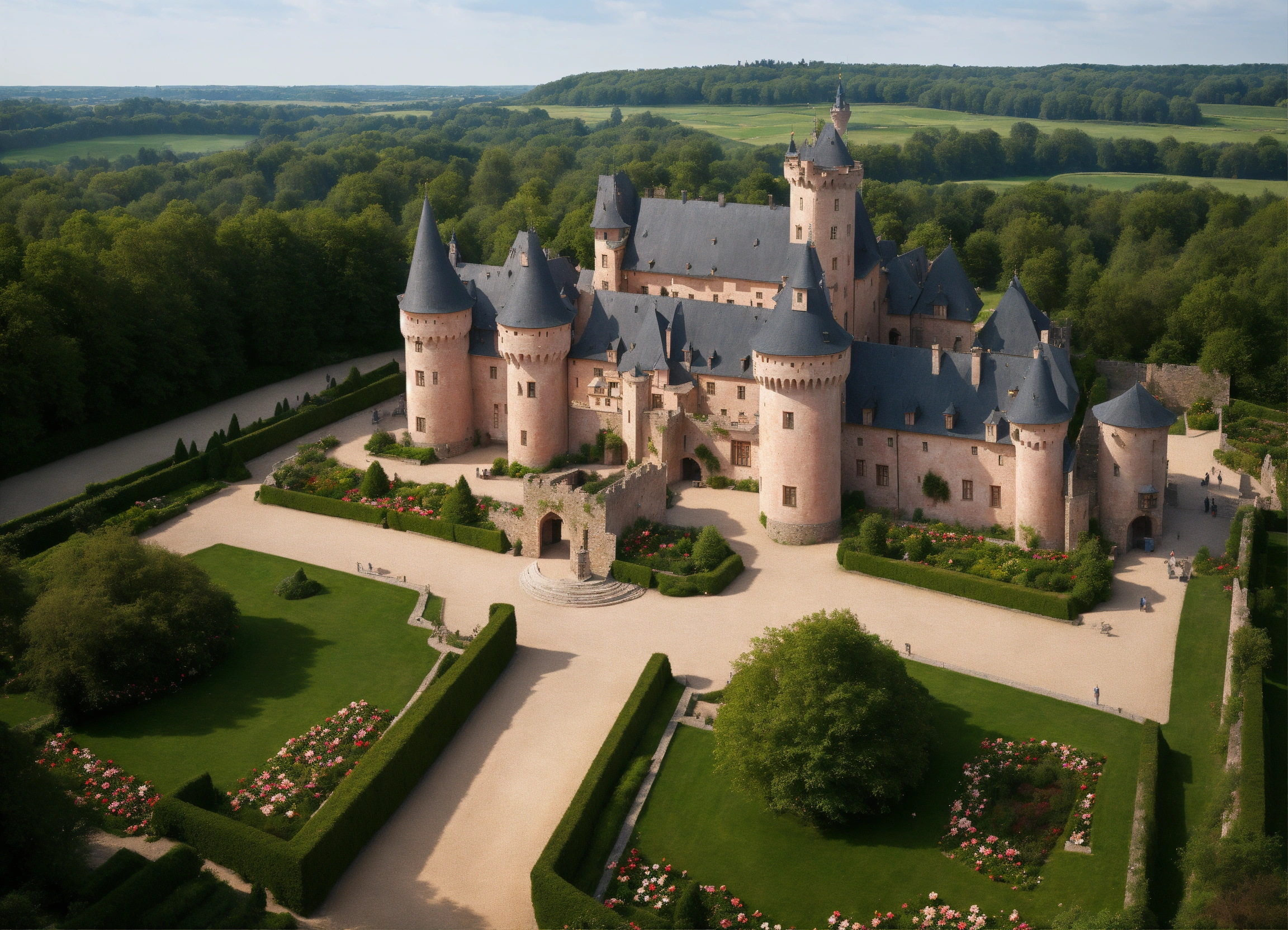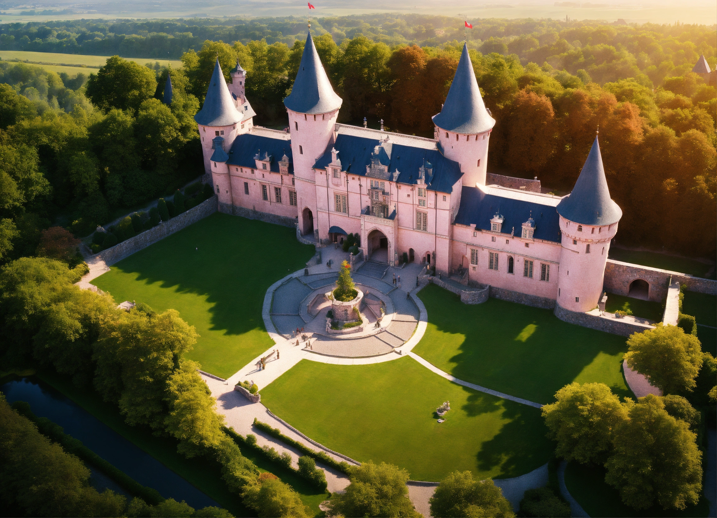 Ultra realistic, photorealistic, bird's eye view of a small medieval castle on a rock, garden terraces with pond, rose bowers, magnificent rose garden and arcades, magnificent fountain, massive crenellated stone wall with a central wall gate and watchtowers surrounds the castle area, with a large inner courtyard and several servants quarters and stables, rose pavillon, pleasure grotto, large forecourt, a wide boulevard leads to the entrance of the castle, extensive rose fields on hilly landscapes in the area around the castle, ultra detailled, focus on castle, sharp focus, sharp, ambient lighting, ksiąz castle in poland