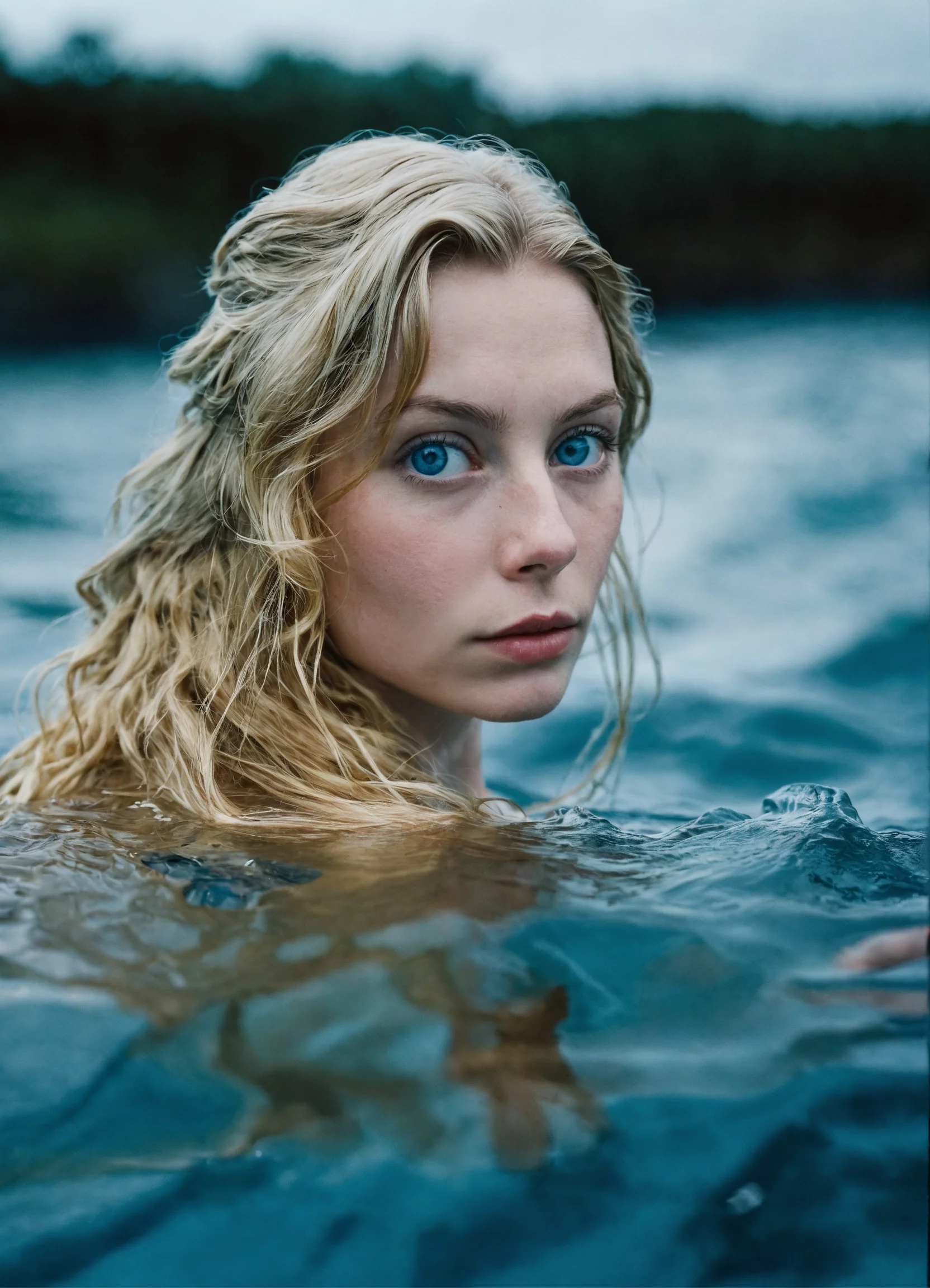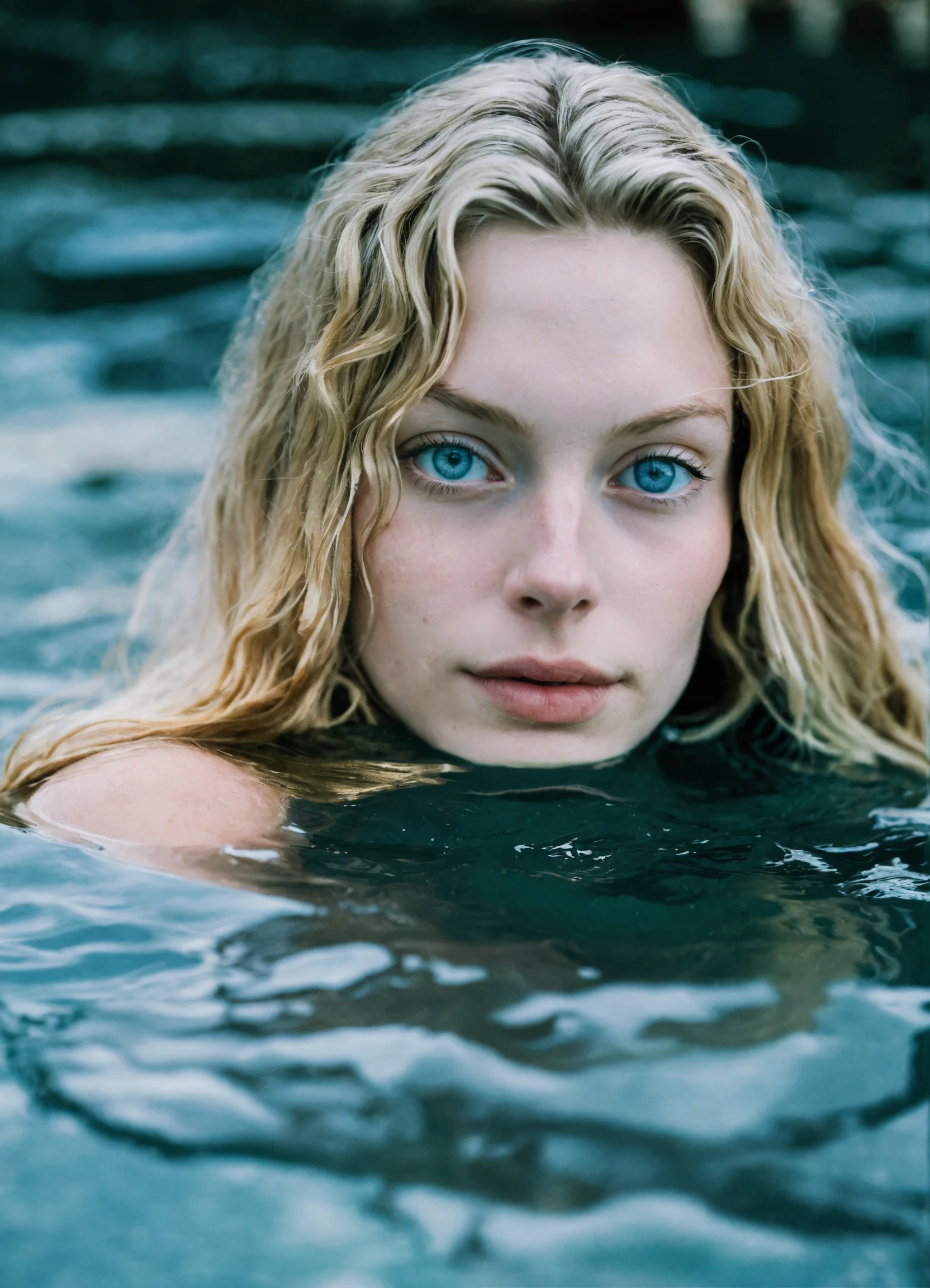 Leica photo of elsa, an extremely wealthy 28-year-old swedish doctor with pale skin, big blue eyes, and long, luscious blonde hair, in the water, looking at the camera
