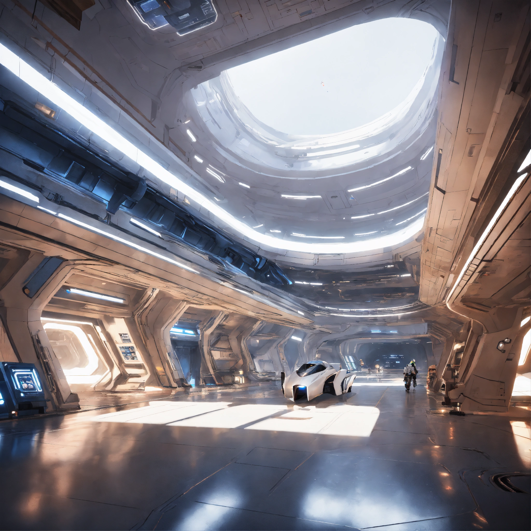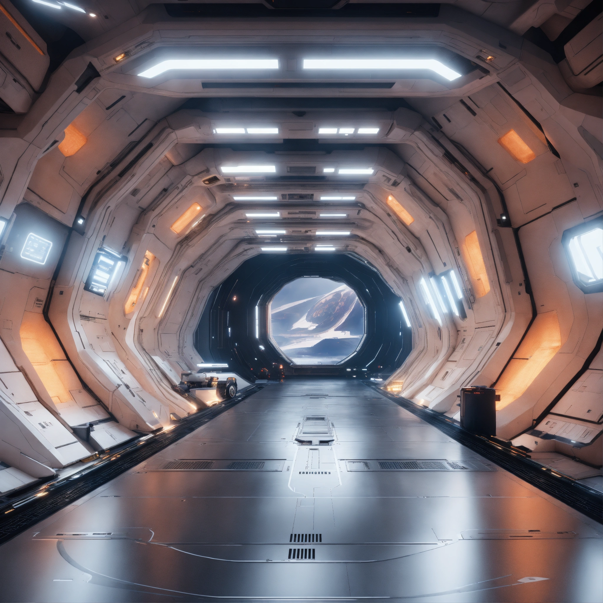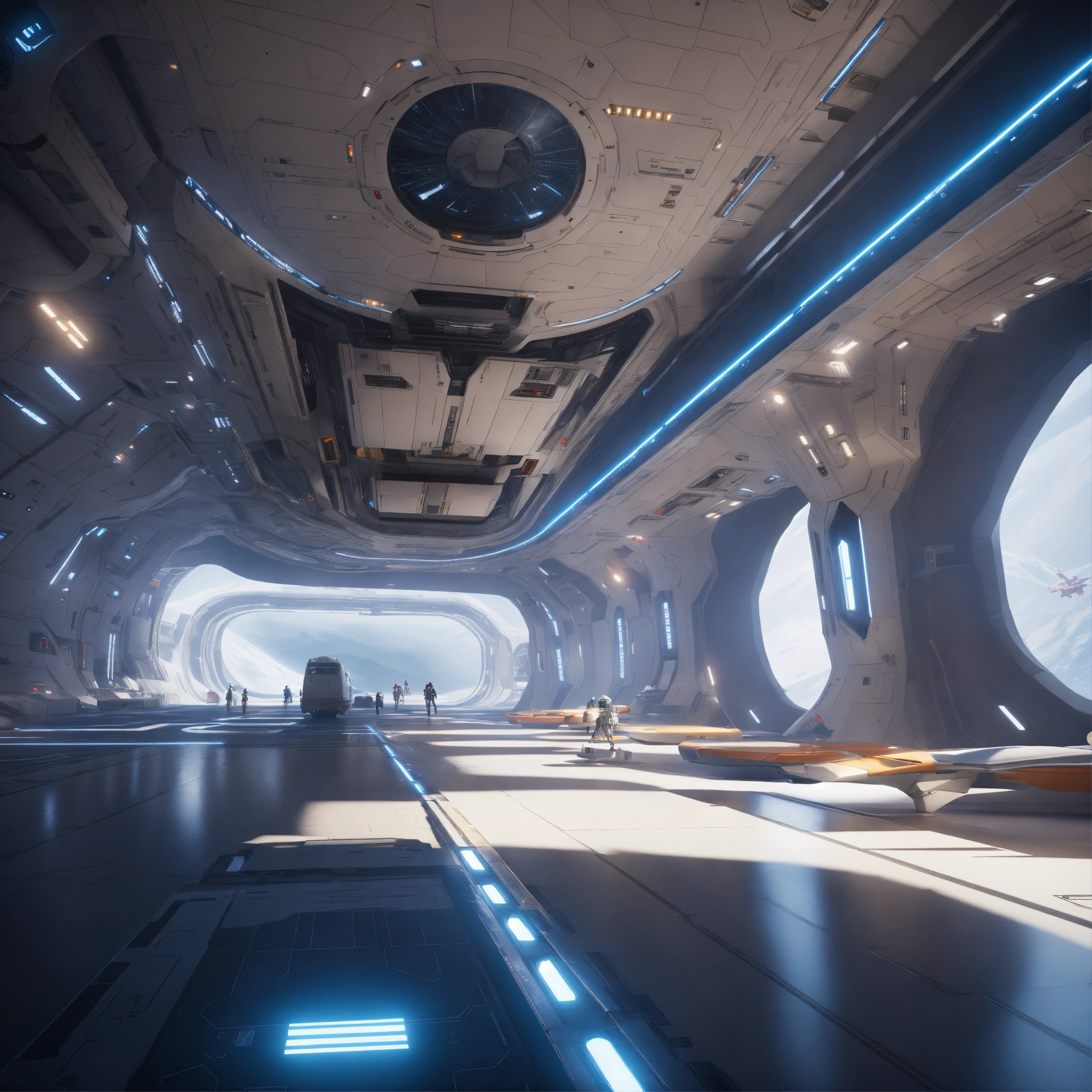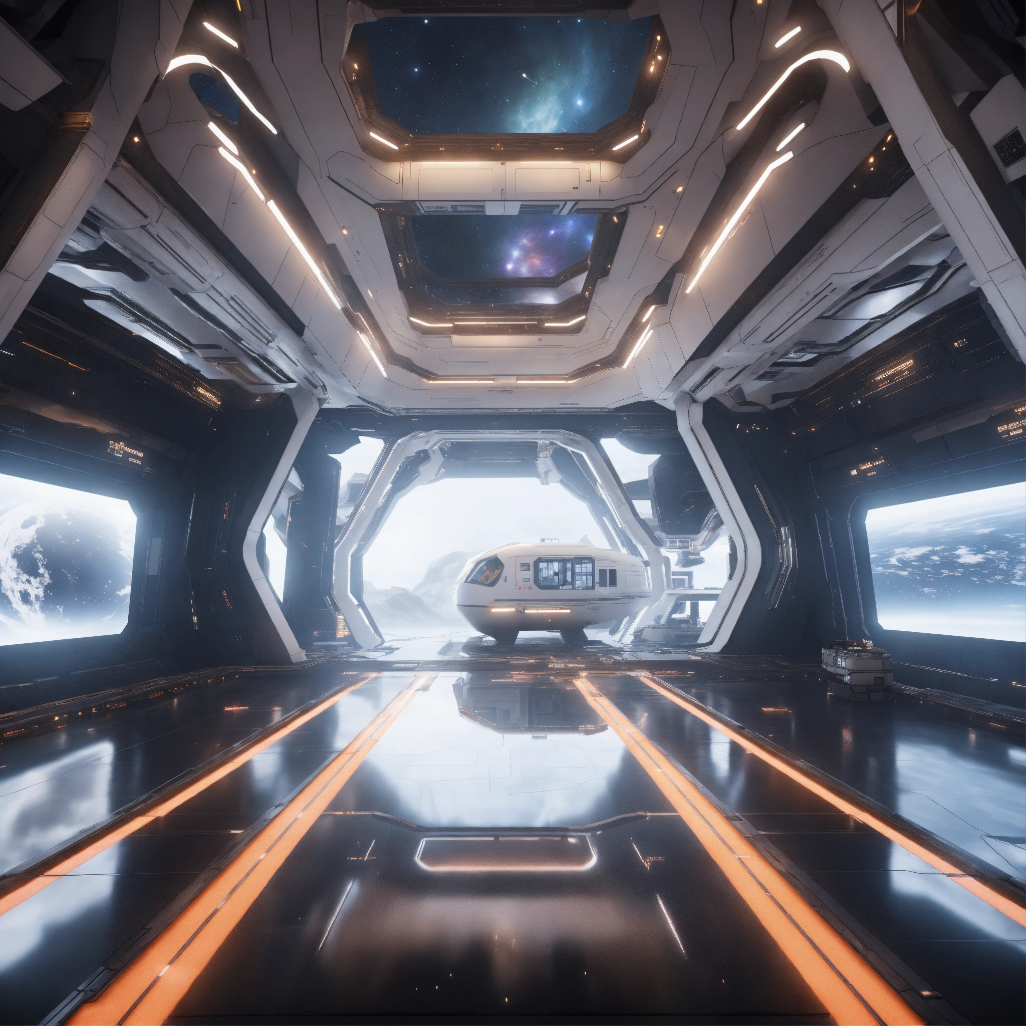 Entering the docking bay of a huge white spaceport in deep space, zaha hadid, futuristic, sci-fi, 8k, unreal engine, pixar