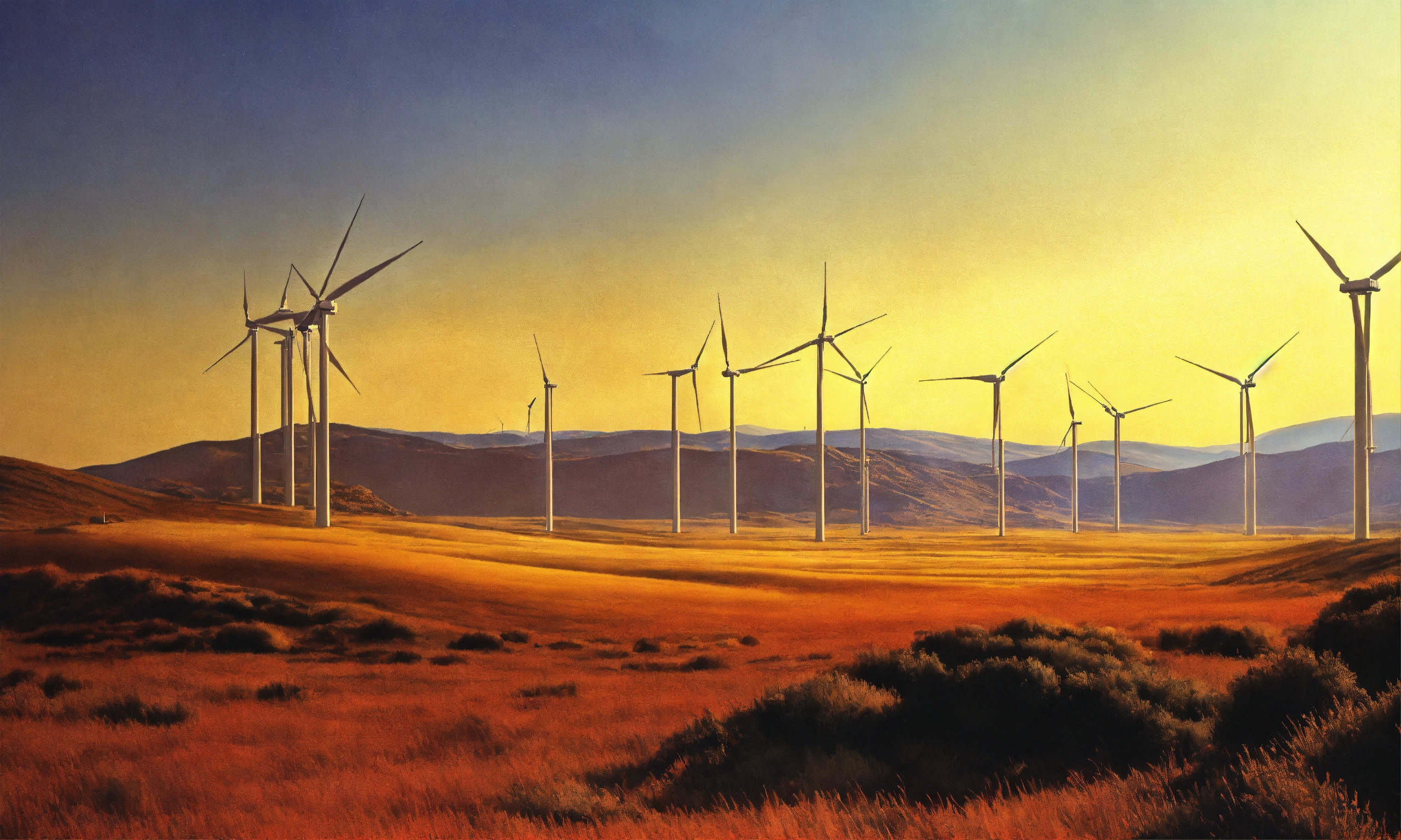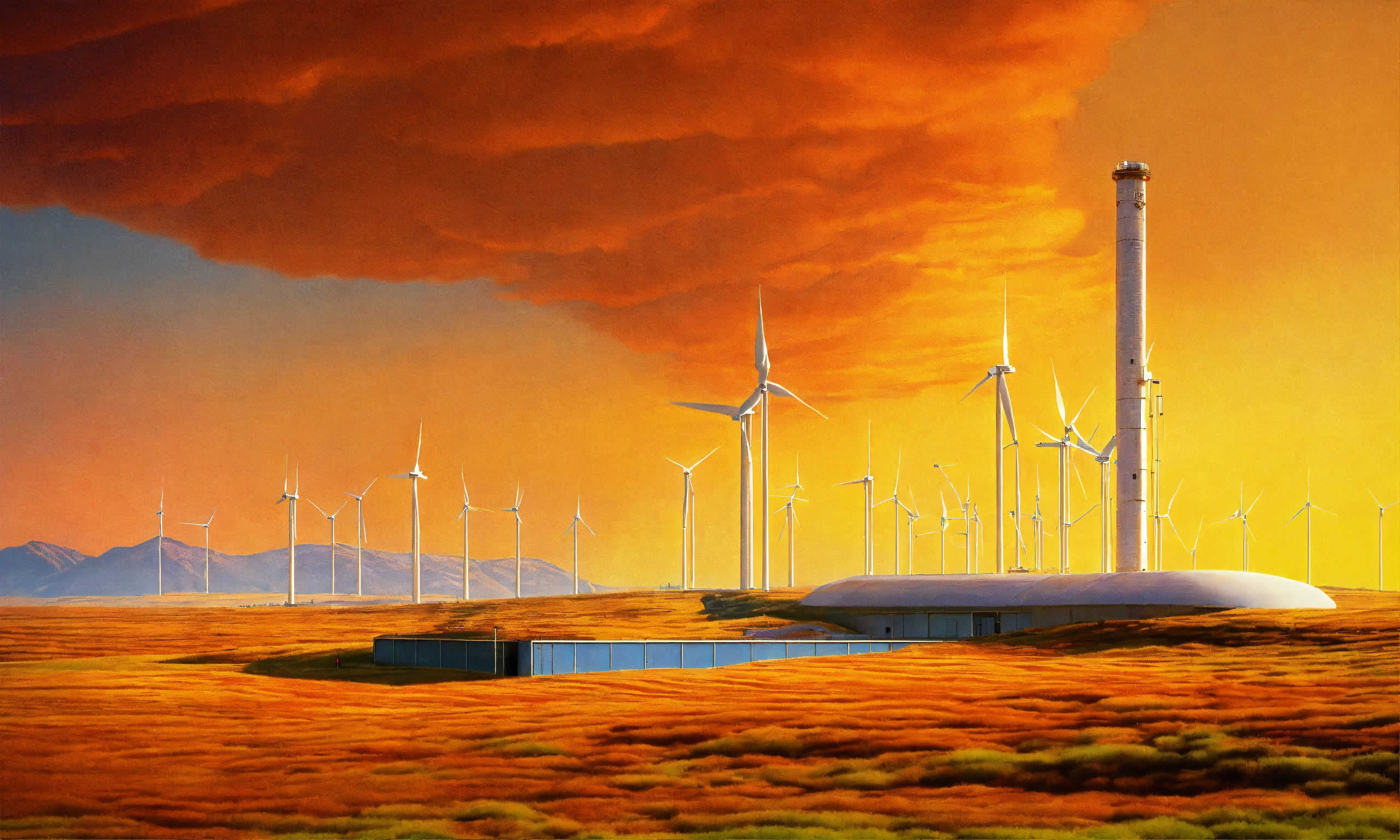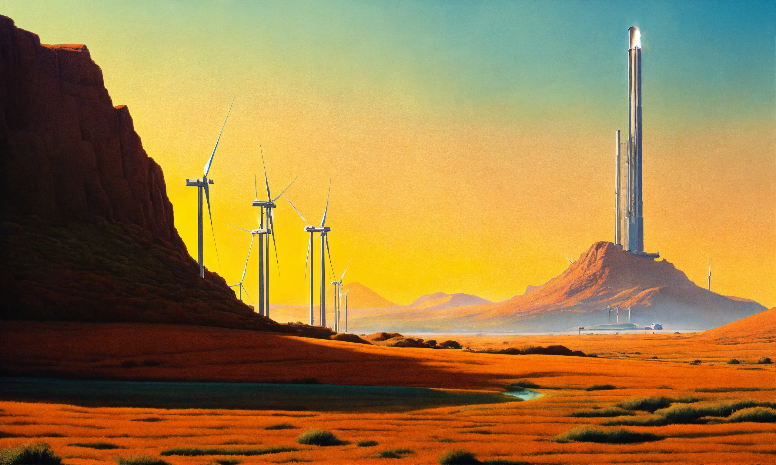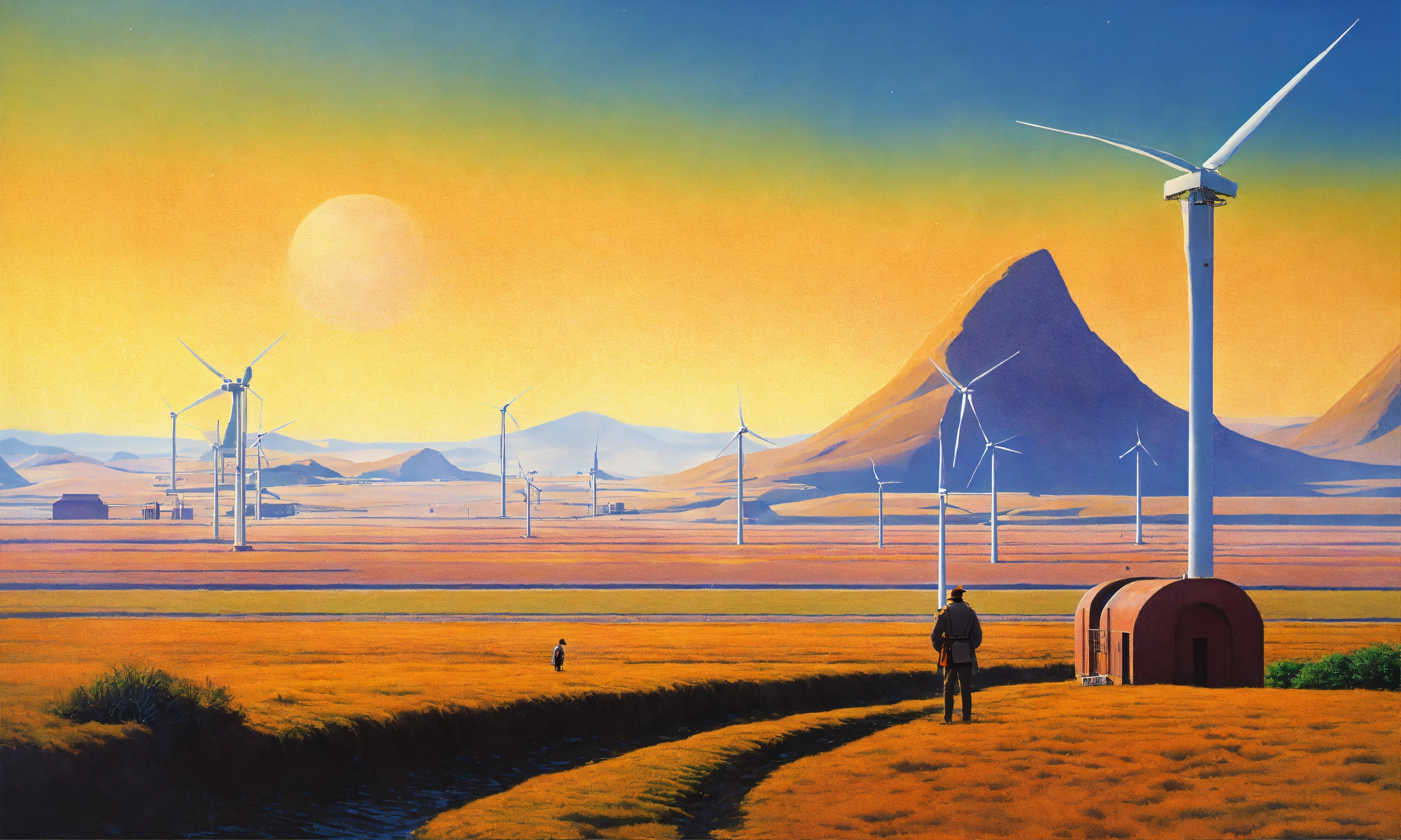 Clean energy scene, positive mood. surrealistic landscape. colorful, minimal. hiper realistic ralph mcquarrie. 35mm. award winning photography.