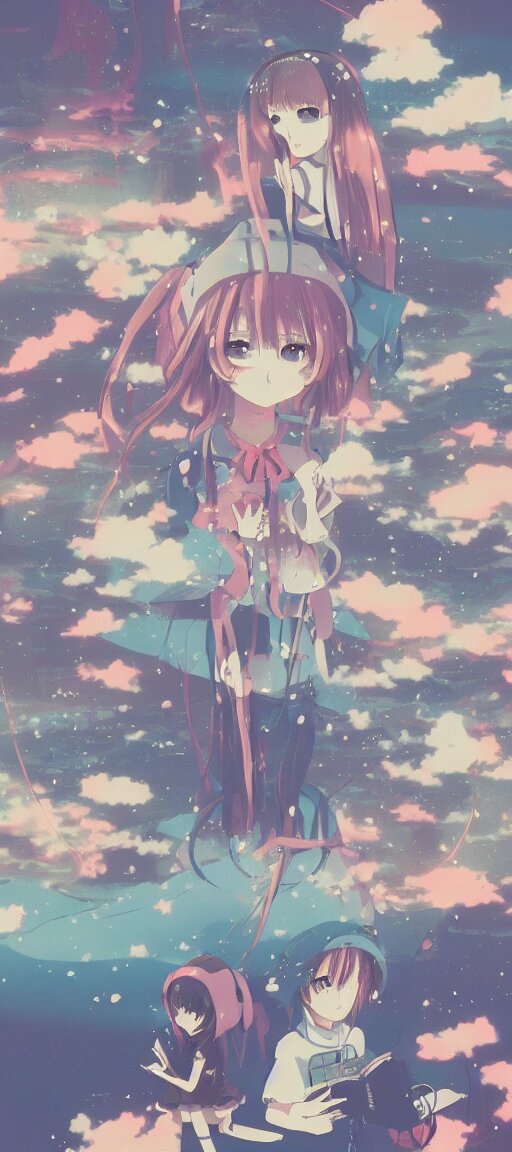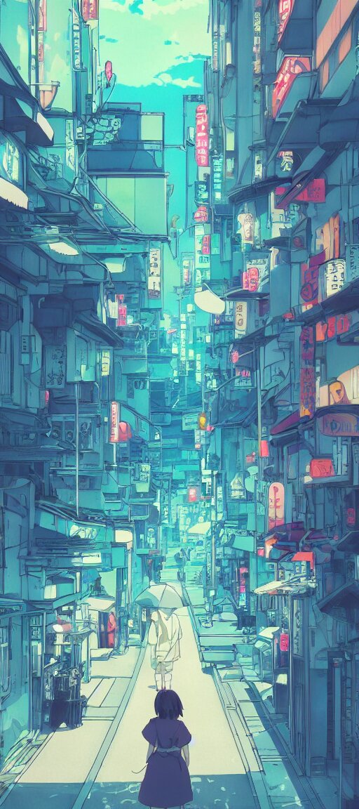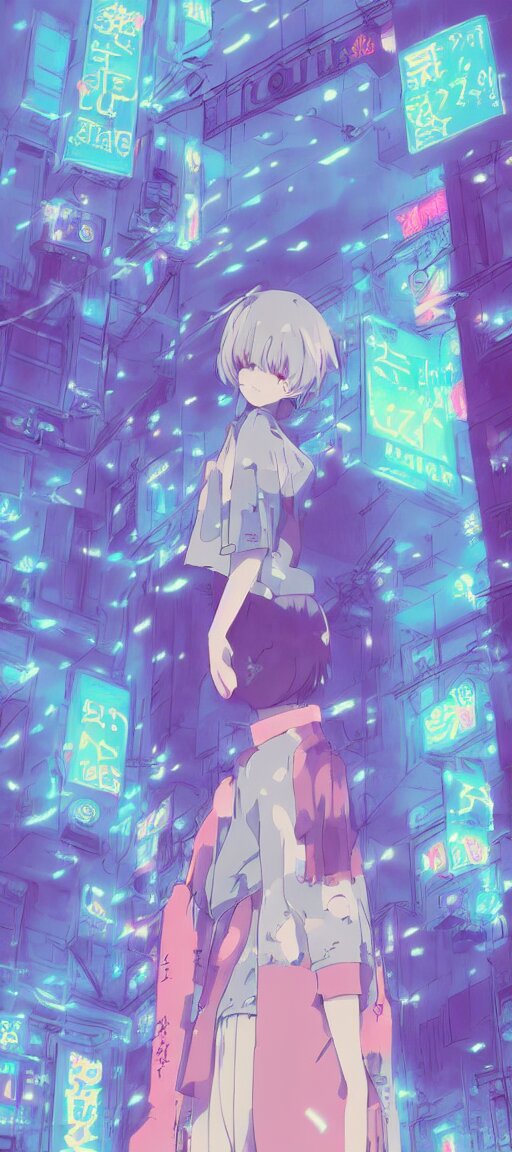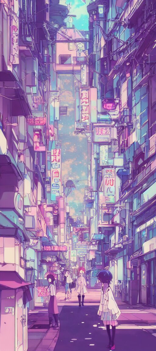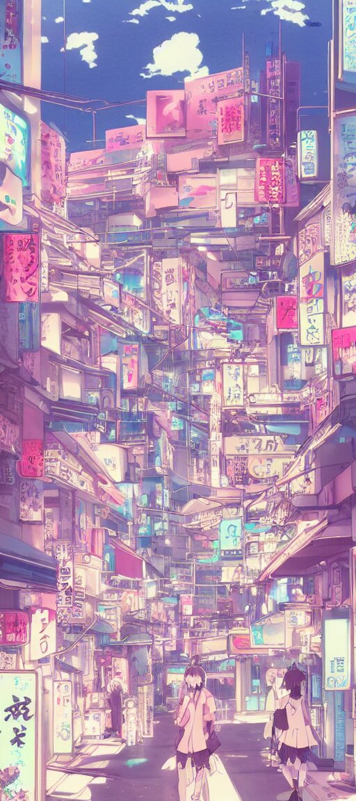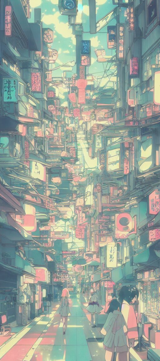 Beautiful anime! style vaporware tokyo japan, kawaii anime manga style, illustration, aesthetic, muted color disposition, minimal, neon pastel, hayao miyazaki