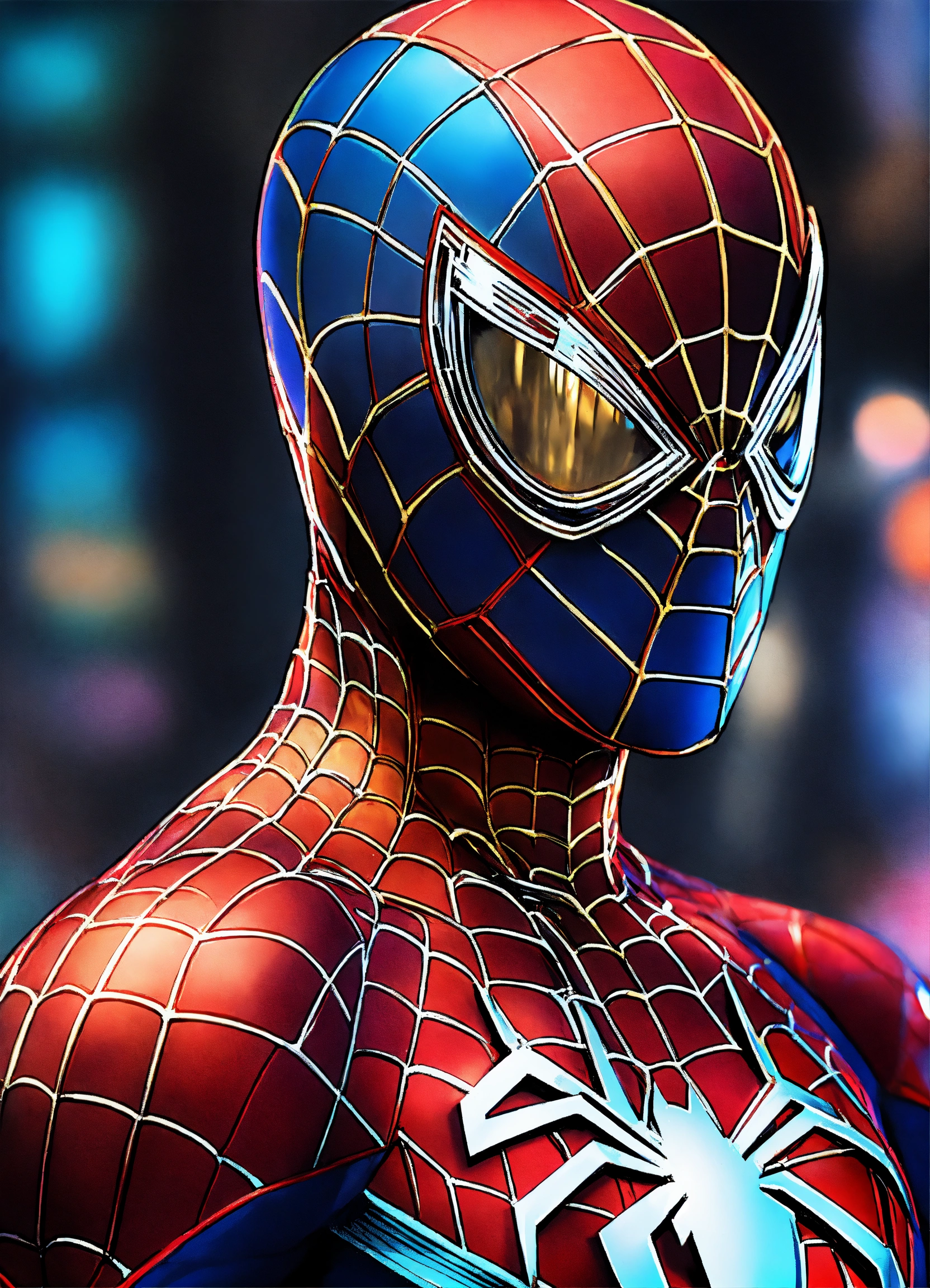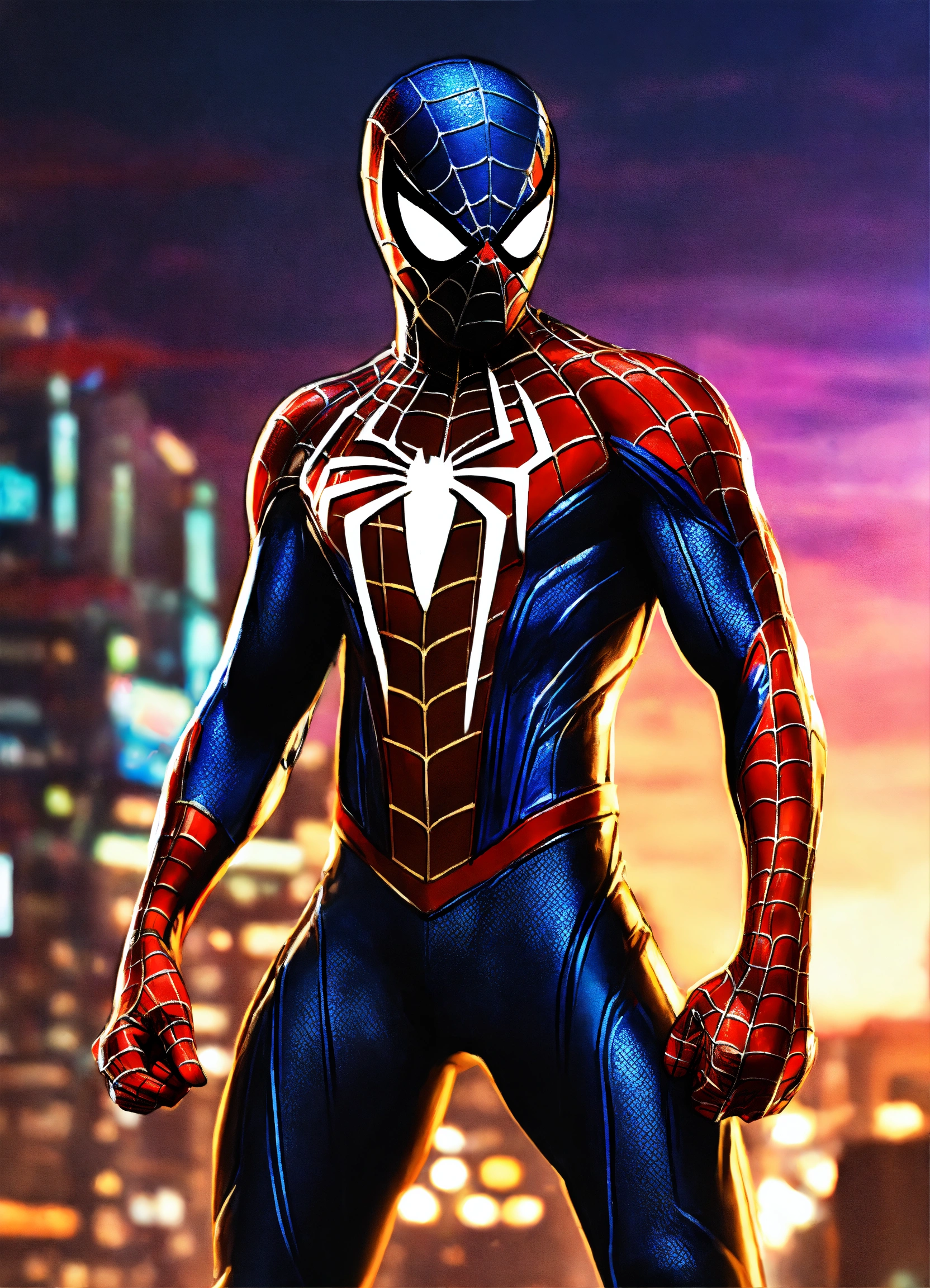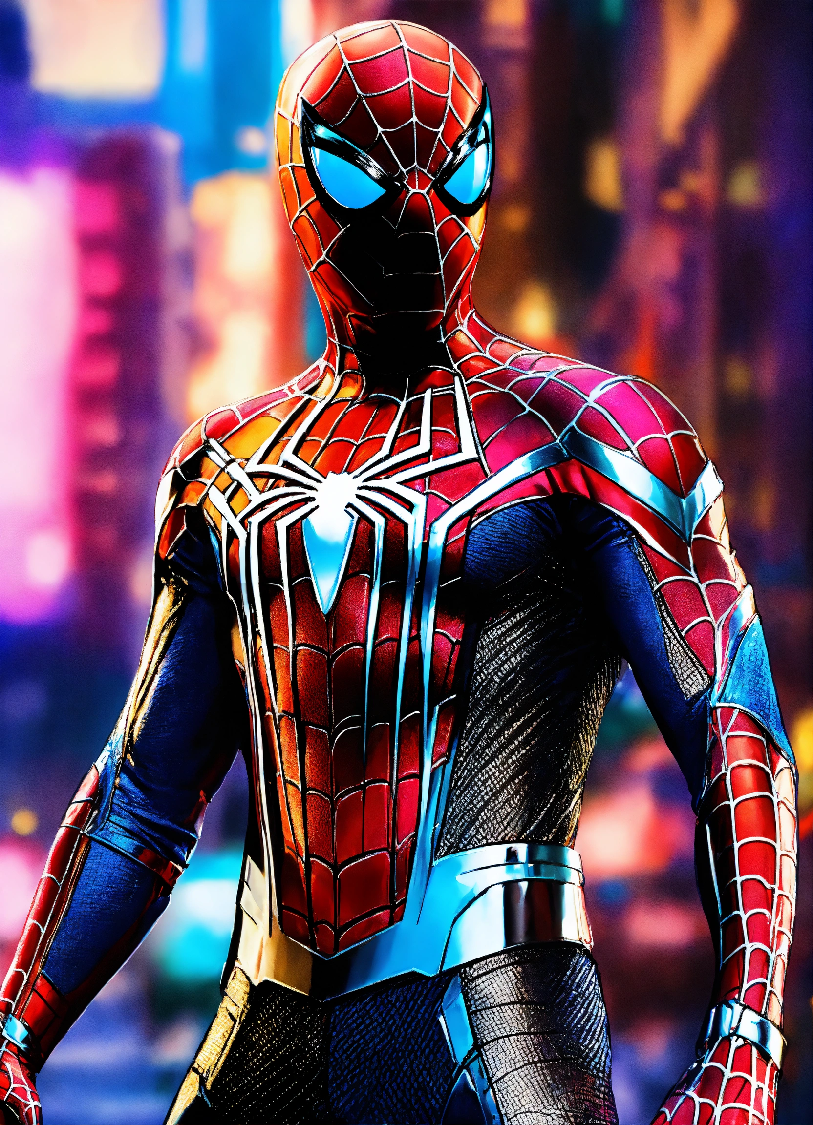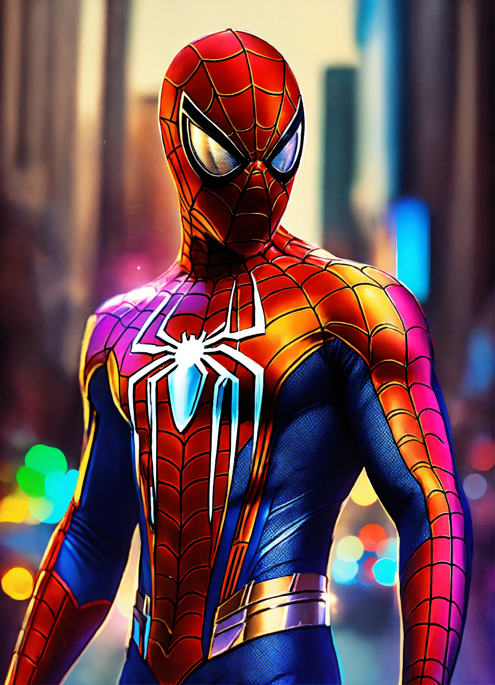 Spiderman con elegante traje futurista colores metálicos y brillantes posando para pelear