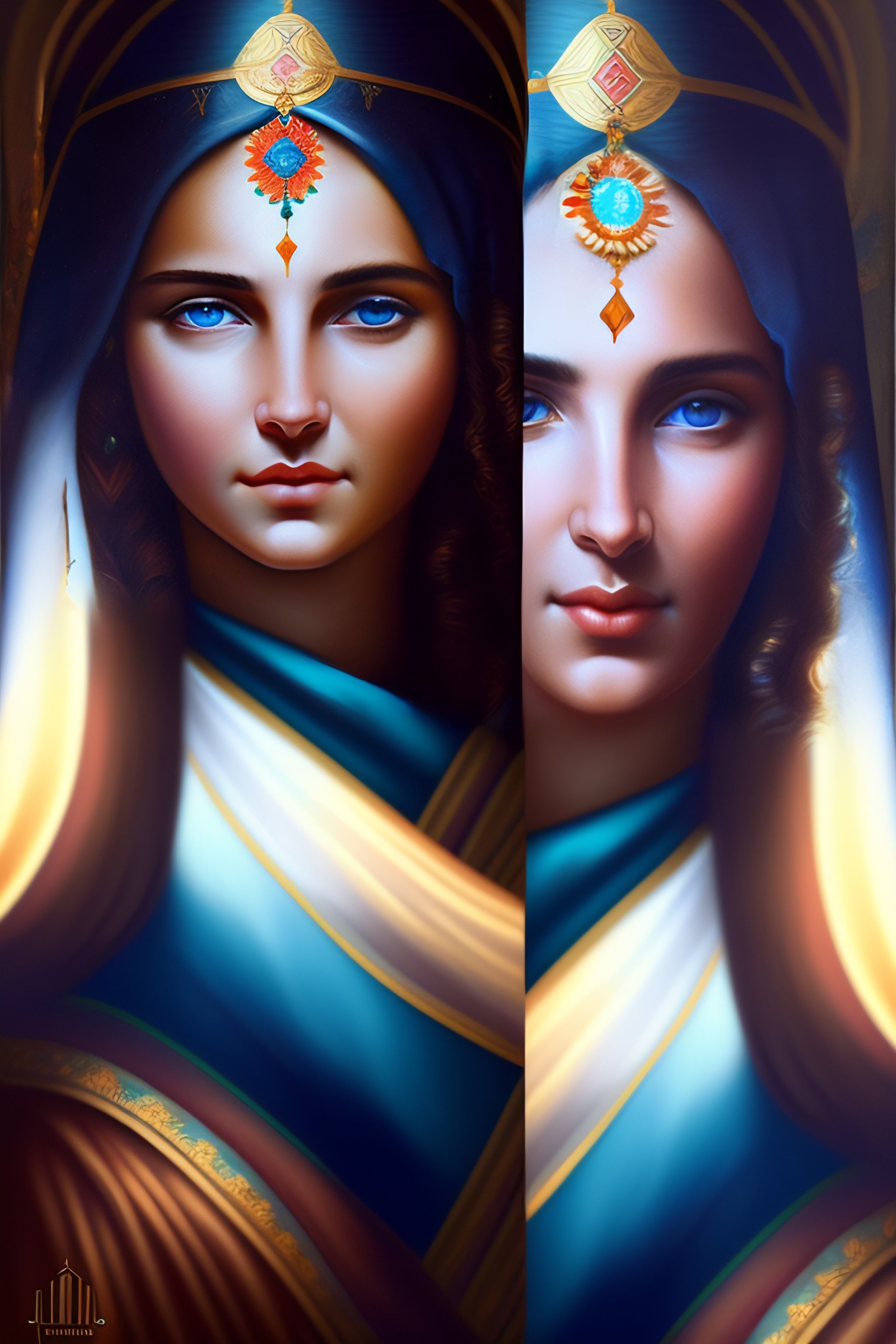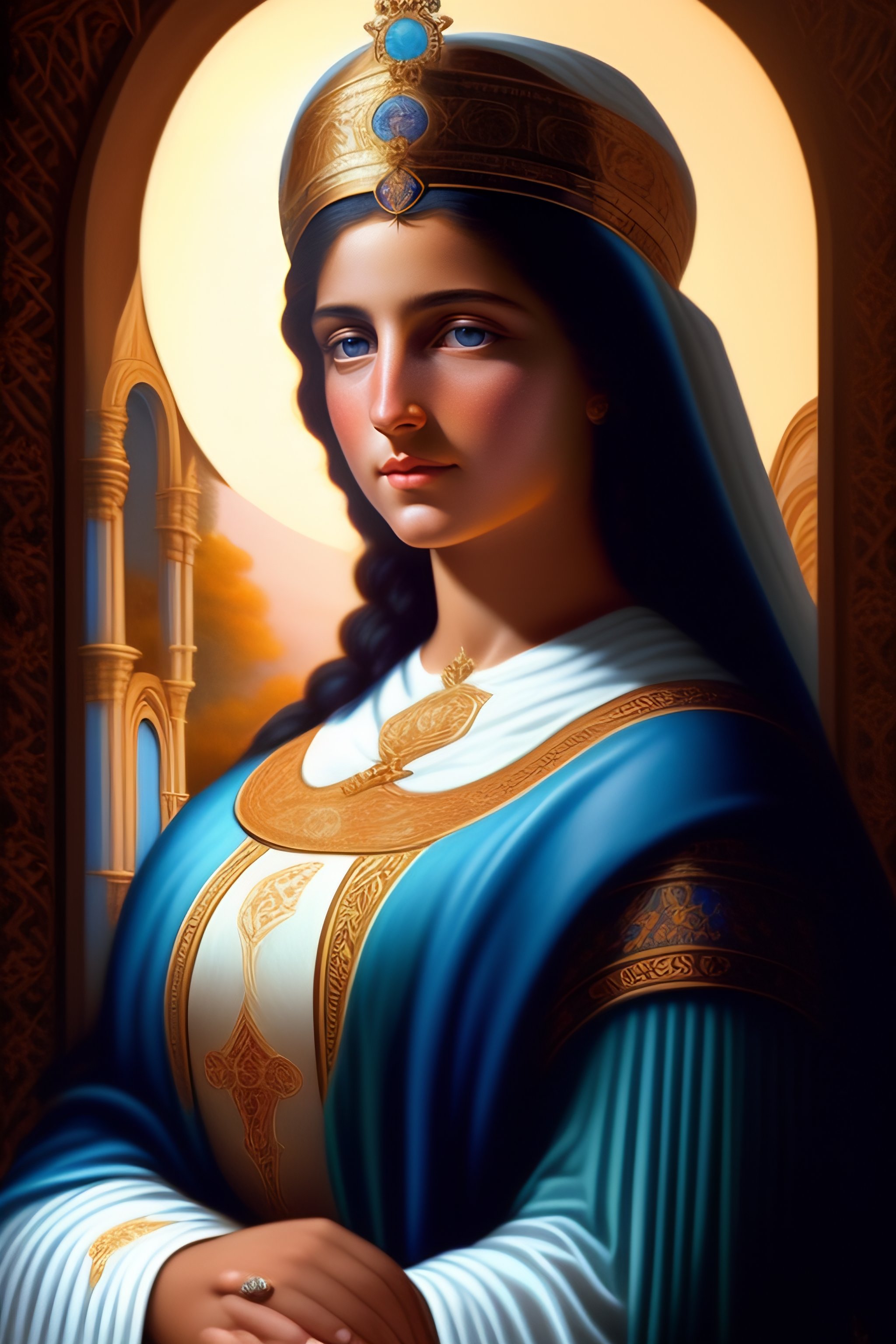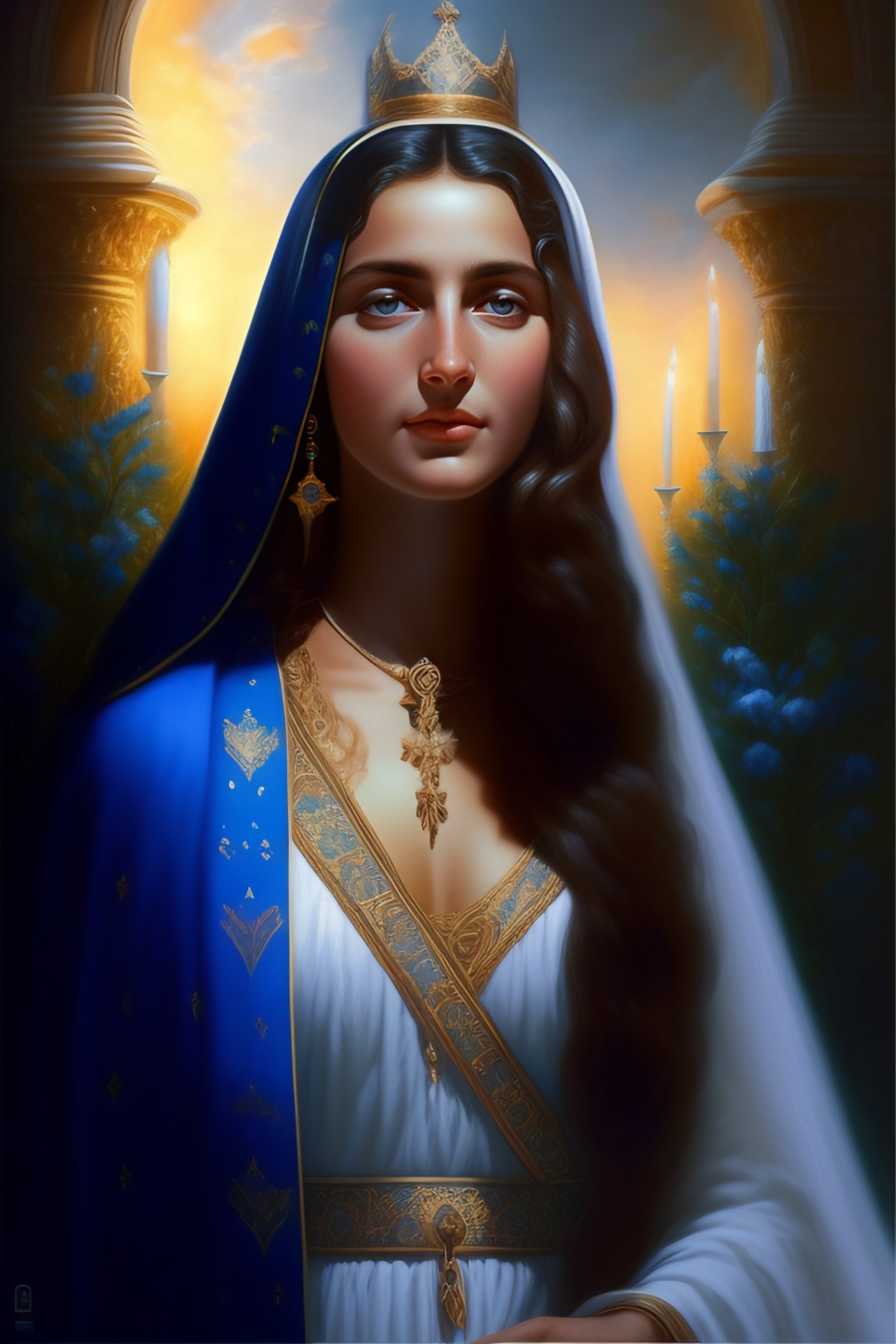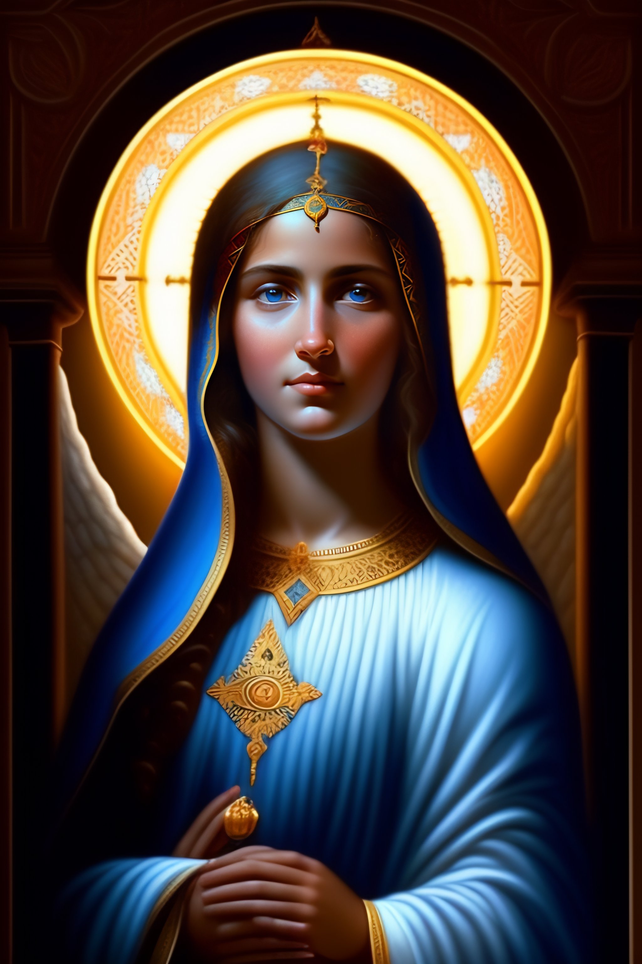 "la virgen maría es una figura importante en la iconografía cristiana y es considerada la madre de jesús. en la imagen, se la representa como una mujer joven y hermosa, con un rostro suave y luminoso que refleja la bondad y la compasión que habitan en su corazón. sus ojos son grandes y azules, y su mirada es dulce y serena. su cabello es largo y ondulado, de color marrón oscuro, y cae en cascada sobre sus hombros como un río de ébano. está vestida con un traje largo y ajustado de color blanco, símbolo de pureza y santidad, y lleva un manto azul oscuro sobre sus hombros, como un abrazo protector. en sus manos sostiene un libro abierto, simbolizando su sabiduría y conocimiento, y a su alrededor hay una aura de luz dorada que la envuelve, indicando su divinidad y santidad. la virgen maría es una imagen de ternura y amor, y es venerada por muchas personas alrededor del mundo como una madre amorosa y protector."